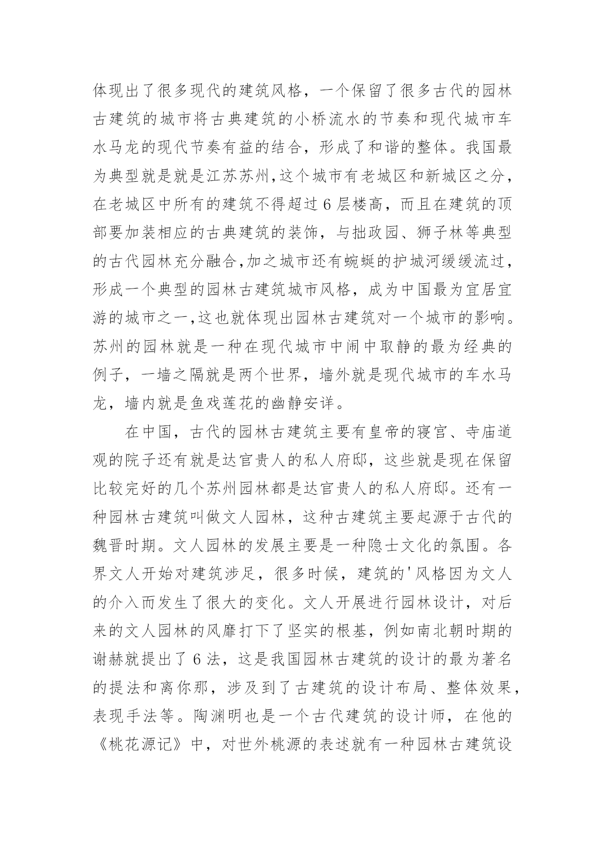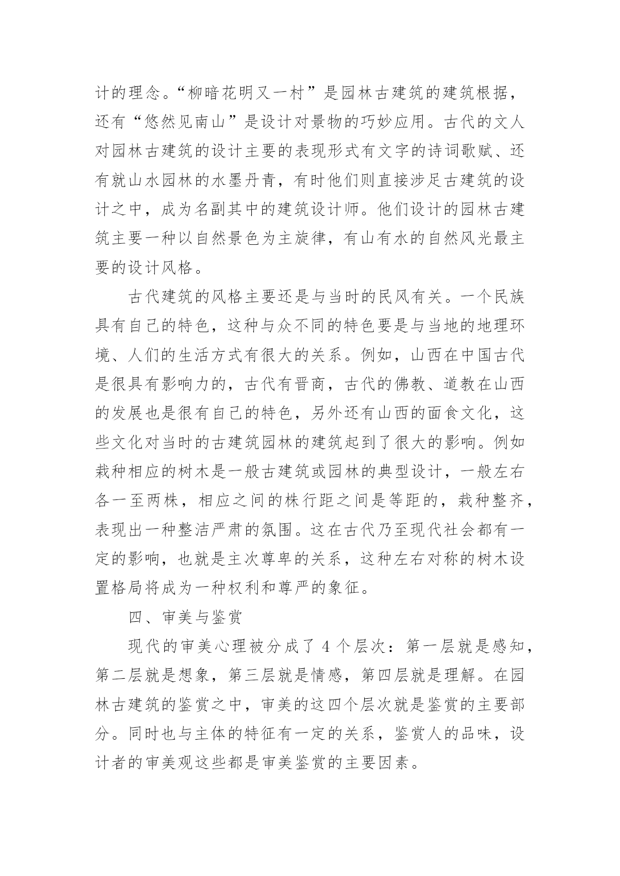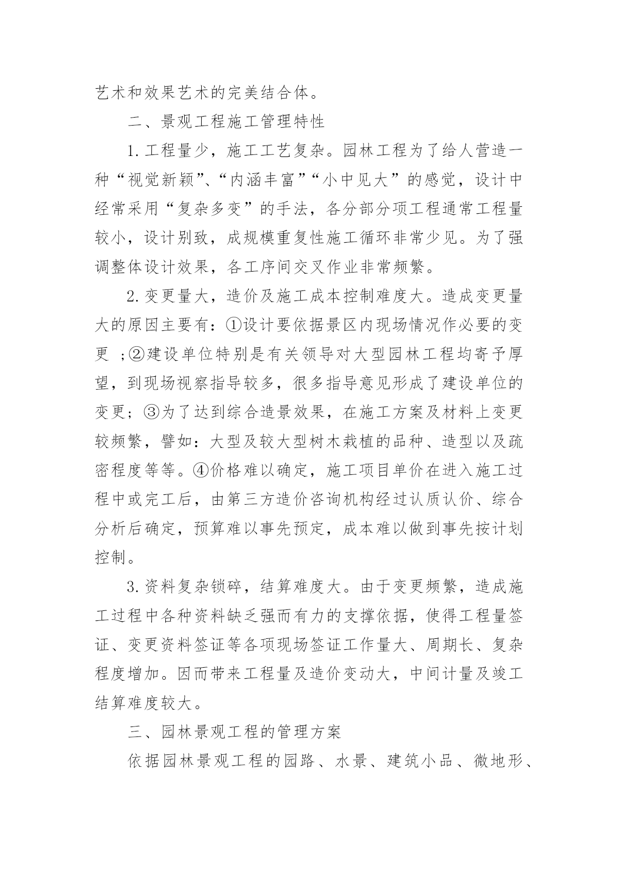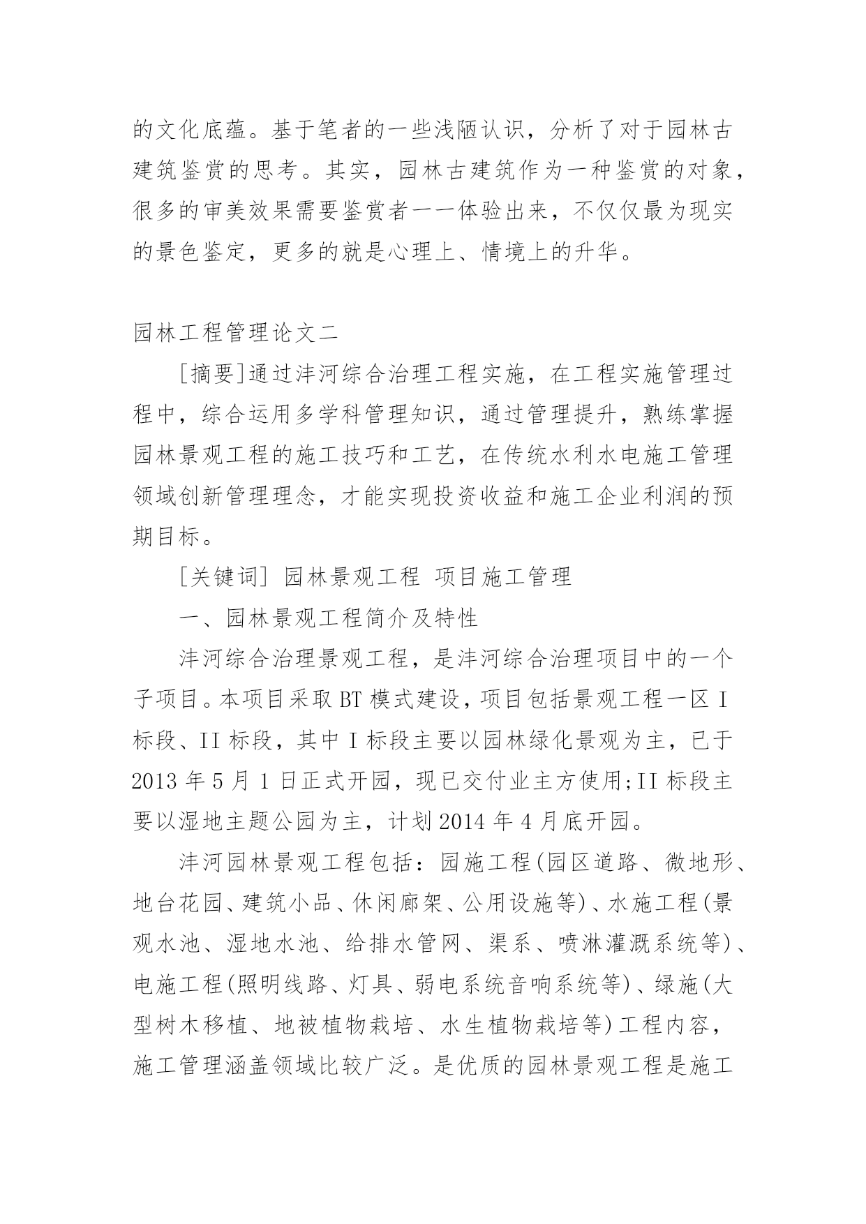 园林工程管理论文园林工程不断地在发展,而相关工程的管理又应该怎么进行呢?以下是小编为大家精心整理的园林工程管理论文,欢迎大家阅读。园林工程管理论文一【摘要】园林古建筑作为中国文化主要的载体之一,具有很强的美学鉴赏价值。我国五千年的文明发展史,给园林古建注入了很多文化底蕴,这种文化底蕴与当时的民风民俗、文化背景、地理条件,自然情况有着很大的联系,这也就决定了全世界拥有不同形式的、不同文化底蕴的园林古建筑,文章从中外的园林古建筑的鉴赏对比开展分析,讨论了我国园林古建筑的主要的设计风格,同时从美学的角度分析了园林古建筑的艺术鉴赏。【关键词】园林;古建筑;风格;审美一、引言我国有着5000年的历史,具有很多美学效果的园林古建筑,他们成为了中国在世界舞台上的名片,很多外国人慕名而来,专门就是为了见识一下中国的园林古建筑,例如江苏苏州的拙政园就是中国园林古建筑的典型代表。园林古建筑中很多的美学需要经过相应的对比,拉开距离,移情等方式才能有效鉴赏出来,下面就从园林古建筑的中外对比情况谈起。二、中外对比人类文化发展的长河中,各个地区的建筑风格发生了不断的演变。经过长期的发展,很多地区的建筑出现了自己与众不同的风格。下面就分别对比一下,中外园林古建筑之间的建筑风格的各自特点。在中国古代,木材的来源很多,很多的中国古代建筑都是以木结构为主,由于长时期对木结构建筑的研究,很多中国古代工匠对木结构的建筑研究很深,有着自己独特的建筑风格,中国的古建筑都属于一些单体的建筑,借鉴的阴阳八卦的理论,崇尚中轴对称的建筑理念,方圆整洁以多个单体建筑组合成一些建筑群,其中的建筑装修也是各具特色,最为典型的代表就是北京的故宫,还是苏州的拙政园、狮子林等。这些古代园林建筑有时一些皇帝的寝宫或是达官贵人的“私人别墅”,成为单独的一派,属于东方风格的建筑。古埃及处在半沙漠地带,没有很多树木建筑,因此其的建筑以石制建筑为主,最为典型的就是狮身人面像,还有金字塔等建筑。主要用于法老的墓葬和神殿等,具有自己独特的建筑风格。古希腊的建筑主要也是石质材料为主,有艾奥里亚,最为典型的就是雅典卫城,古罗马的古建筑主要以砂石和泥土等混合物为主,建筑的结构主要以拱形结构为主,万神庙是古罗马最为典型的建筑,充分体现出古罗马的建筑风格。三、设计风格园林古建筑又是现代城市的林园,很多城市的现代建筑是以钢筋混凝土或是玻璃幕墙等现代材料为主要构建元素,体现出了很多现代的建筑风格,一个保留了很多古代的园林古建筑的城市将古典建筑的小桥流水的节奏和现代城市车水马龙的现代节奏有益的结合,形成了和谐的整体。我国最为典型就是就是江苏苏州,这个城市有老城区和新城区之分,在老城区中所有的建筑不得超过6层楼高,而且在建筑的顶部要加装相应的古典建筑的装饰,与拙政园、狮子林等典型的古代园林充分融合,加之城市还有蜿蜒的护城河缓缓流过,形成一个典型的园林古建筑城市风格,成为中国最为宜居宜游的城市之一,这也就体现出园林古建筑对一个城市的影响。苏州的园林就是一种在现代城市中闹中取静的最为经典的例子,一墙之隔就是两个世界,墙外就是现代城市的车水马龙,墙内就是鱼戏莲花的幽静安详。在中国,古代的园林古建筑主要有皇帝的寝宫、寺庙道观的院子还有就是达官贵人的私人府邸,这些就是现在保留比较完好的几个苏州园林都是达官贵人的私人府邸。还有一种园林古建筑叫做文人园林,这种古建筑主要起源于古代的魏晋时期。文人园林的发展主要是一种隐士文化的氛围。各界文人开始对建筑涉足,很多时候,建筑的'风格因为文人的介入而发生了很大的变化。文人开展进行园林设计,对后来的文人园林的风靡打下了坚实的根基,例如南北朝时期的谢赫就提出了6法,这是我国园林古建筑的设计的最为著名的提法和离你那,涉及到了古建筑的设计布局、整体效果,表现手法等。陶渊明也是一个古代建筑的设计师,在他的《桃花源记》中,对世外桃源的表述就有一种园林古建筑设计的理念。“柳暗花明又一村”是园林古建筑的建筑根据,还有“悠然见南山”是设计对景物的巧妙应用。古代的文人对园林古建筑的设计主要的表现形式有文字的诗词歌赋、还有就山水园林的水墨丹青,有时他们则直接涉足古建筑的设计之中,成为名副其中的建筑设计师。他们设计的园林古建筑主要一种以自然景色为主旋律,有山有水的自然风光最主要的设计风格。古代建筑的风格主要还是与当时的民风有关。一个民族具有自己的特色,这种与众不同的特色要是与当地的地理环境、人们的生活方式有很大的关系。例如,山西在中国古代是很具有影响力的,古代有晋商,古代的佛教、道教在山西的发展也是很有自己的特色,另外还有山西的面食文化,这些文化对当时的古建筑园林的建筑起到了很大的影响。例如栽种相应的树木是一般古建筑或园林的典型设计,一般左右各一至两株,相应之间的株行距之间是等距的,栽种整齐,表现出一种整洁严肃的