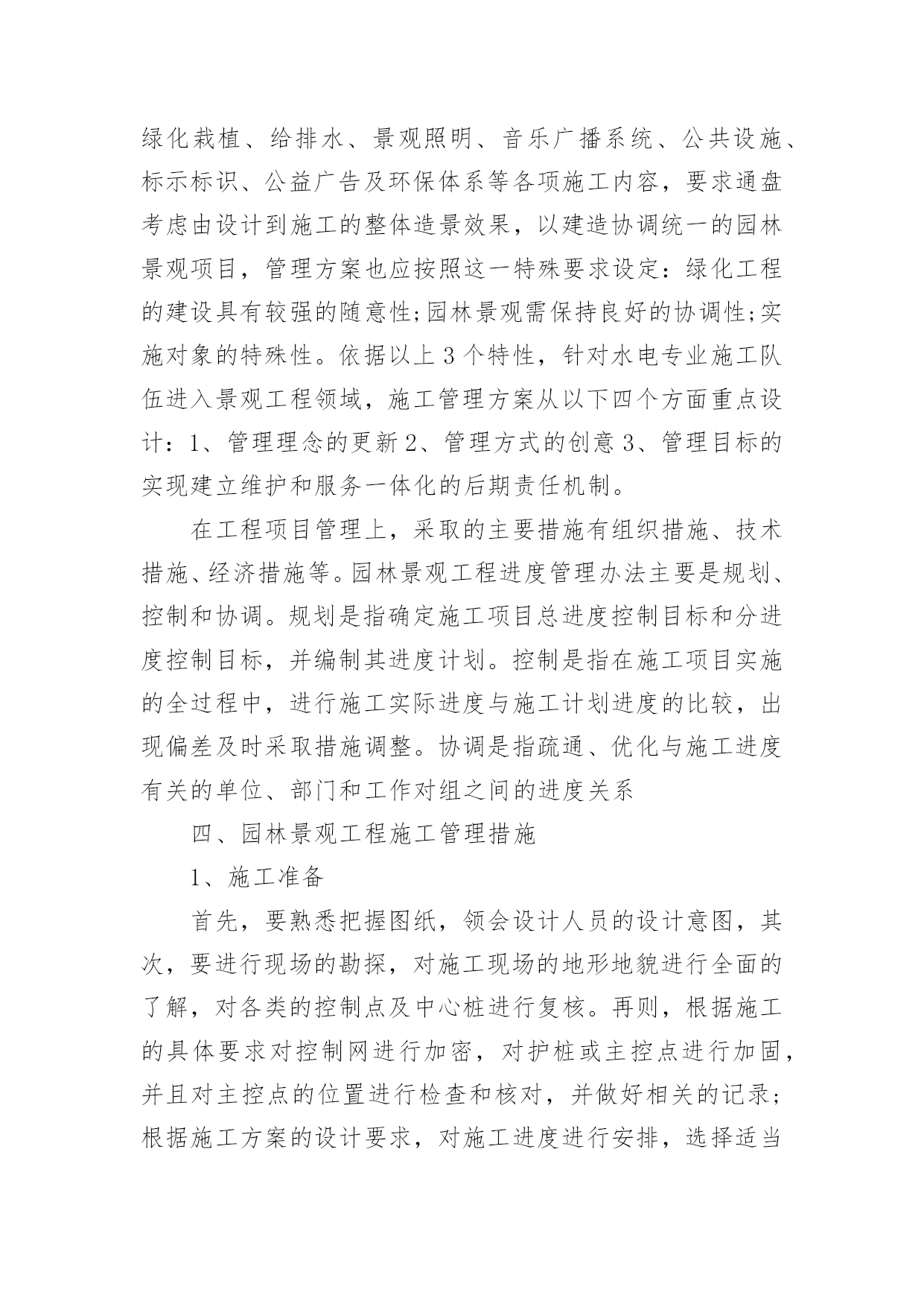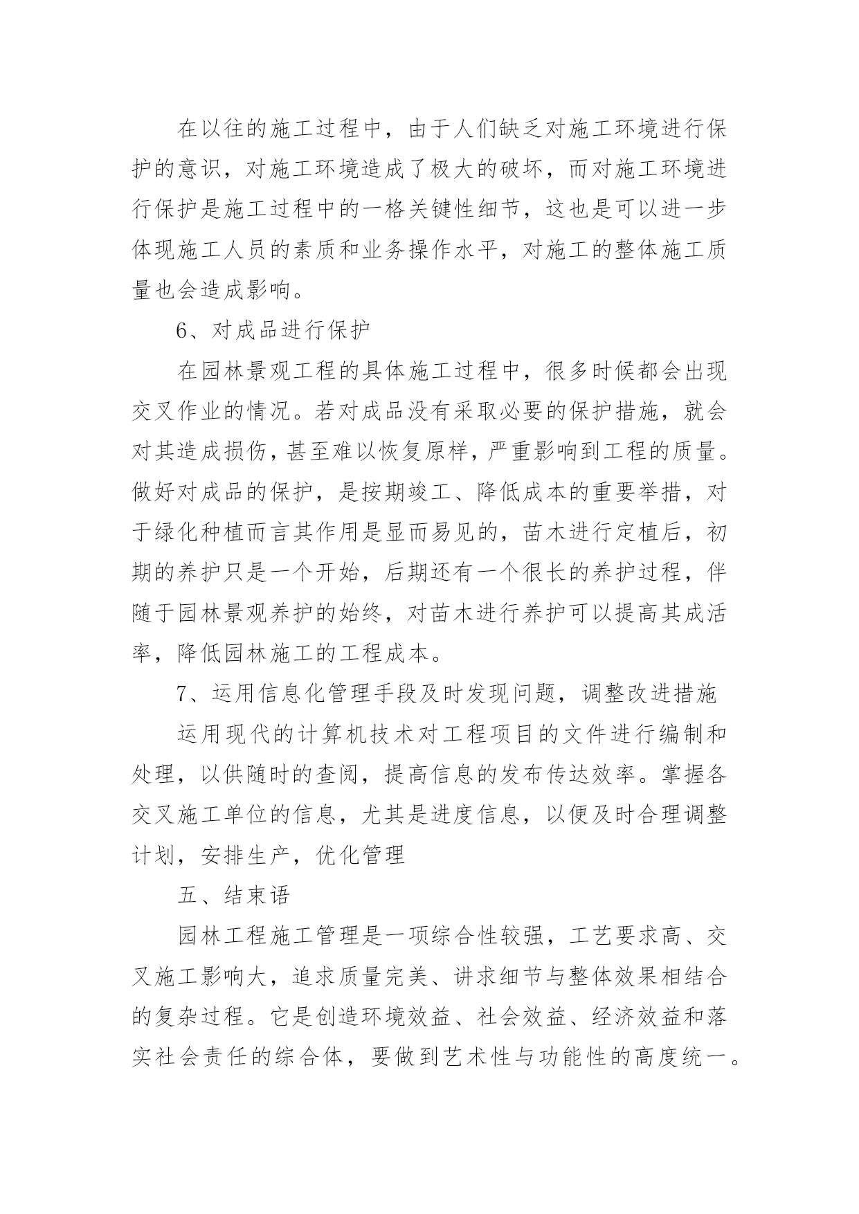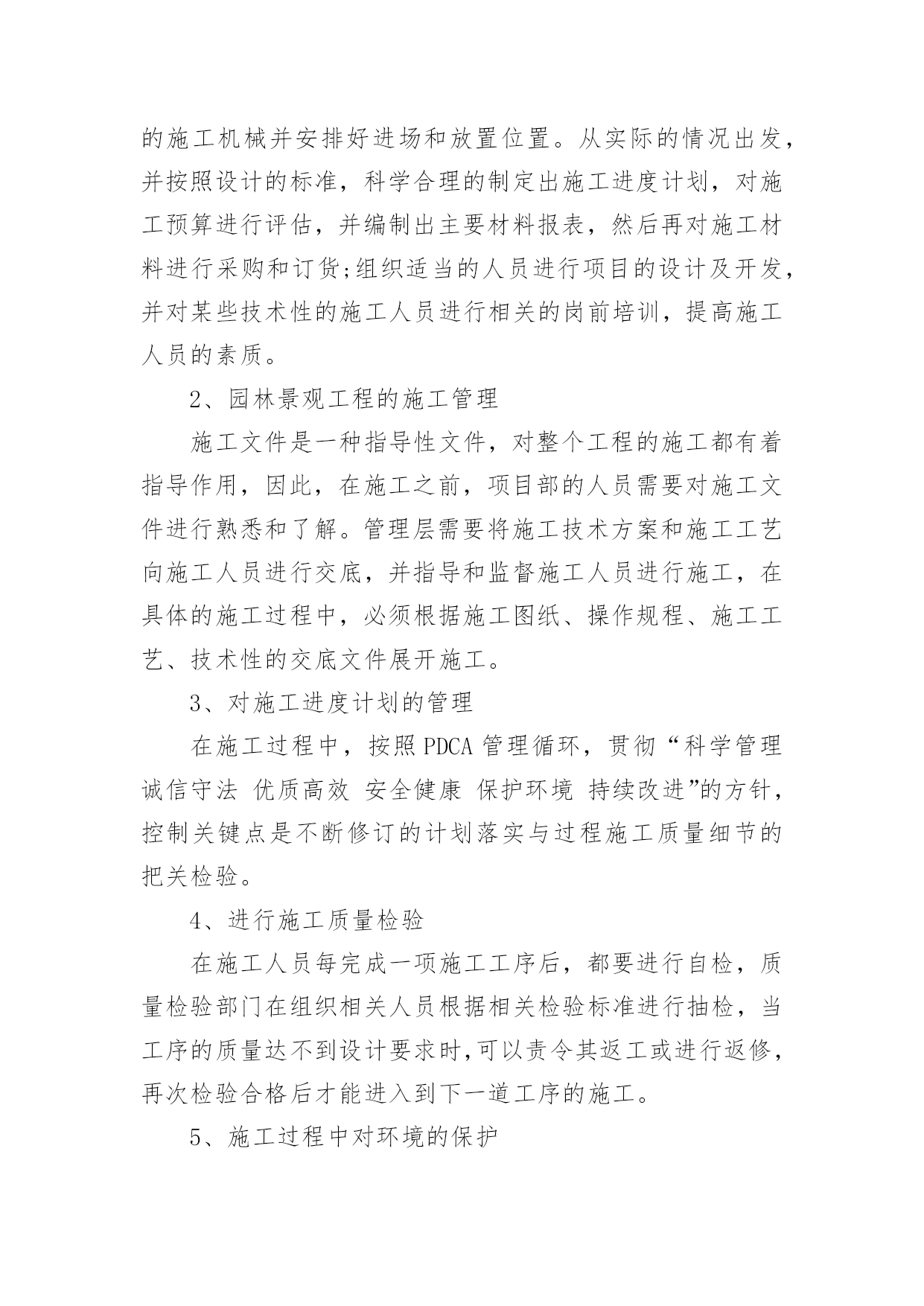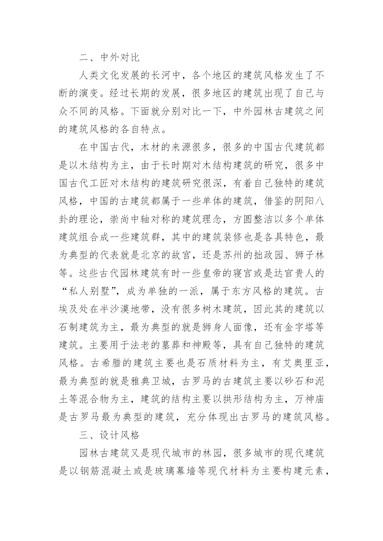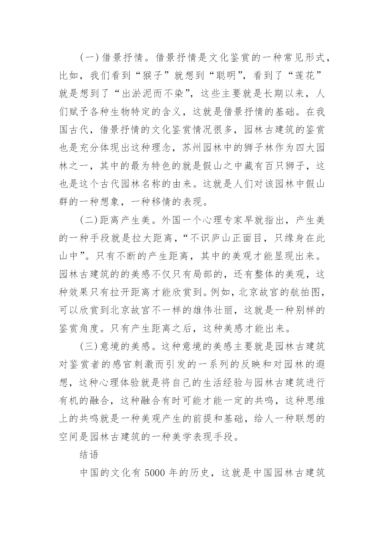 园林工程管理论文园林工程不断地在发展,而相关工程的管理又应该怎么进行呢?以下是小编为大家精心整理的园林工程管理论文,欢迎大家阅读。园林工程管理论文一【摘要】园林古建筑作为中国文化主要的载体之一,具有很强的美学鉴赏价值。我国五千年的文明发展史,给园林古建注入了很多文化底蕴,这种文化底蕴与当时的民风民俗、文化背景、地理条件,自然情况有着很大的联系,这也就决定了全世界拥有不同形式的、不同文化底蕴的园林古建筑,文章从中外的园林古建筑的鉴赏对比开展分析,讨论了我国园林古建筑的主要的设计风格,同时从美学的角度分析了园林古建筑的艺术鉴赏。【关键词】园林;古建筑;风格;审美一、引言我国有着5000年的历史,具有很多美学效果的园林古建筑,他们成为了中国在世界舞台上的名片,很多外国人慕名而来,专门就是为了见识一下中国的园林古建筑,例如江苏苏州的拙政园就是中国园林古建筑的典型代表。园林古建筑中很多的美学需要经过相应的对比,拉开距离,移情等方式才能有效鉴赏出来,下面就从园林古建筑的中外对比情况谈起。二、中外对比人类文化发展的长河中,各个地区的建筑风格发生了不断的演变。经过长期的发展,很多地区的建筑出现了自己与众不同的风格。下面就分别对比一下,中外园林古建筑之间的建筑风格的各自特点。在中国古代,木材的来源很多,很多的中国古代建筑都是以木结构为主,由于长时期对木结构建筑的研究,很多中国古代工匠对木结构的建筑研究很深,有着自己独特的建筑风格,中国的古建筑都属于一些单体的建筑,借鉴的阴阳八卦的理论,崇尚中轴对称的建筑理念,方圆整洁以多个单体建筑组合成一些建筑群,其中的建筑装修也是各具特色,最为典型的代表就是北京的故宫,还是苏州的拙政园、狮子林等。这些古代园林建筑有时一些皇帝的寝宫或是达官贵人的“私人别墅”,成为单独的一派,属于东方风格的建筑。古埃及处在半沙漠地带,没有很多树木建筑,因此其的建筑以石制建筑为主,最为典型的就是狮身人面像,还有金字塔等建筑。主要用于法老的墓葬和神殿等,具有自己独特的建筑风格。古希腊的建筑主要也是石质材料为主,有艾奥里亚,最为典型的就是雅典卫城,古罗马的古建筑主要以砂石和泥土等混合物为主,建筑的结构主要以拱形结构为主,万神庙是古罗马最为典型的建筑,充分体现出古罗马的建筑风格。三、设计风格园林古建筑又是现代城市的林园,很多城市的现代建筑是以钢筋混凝土或是玻璃幕墙等现代材料为主要构建元素,体现出了很多现代的建筑风格,一个保留了很多古代的园林古建筑的城市将古典建筑的小桥流水的节奏和现代城市车水马龙的现代节奏有益的结合,形成了和谐的整体。我国最为典型就是就是江苏苏州,这个城市有老城区和新城区之分,在老城区中所有的建筑不得超过6层楼高,而且在建筑的顶部要加装相应的古典建筑的装饰,与拙政园、狮子林等典型的古代园林充分融合,加之城市还有蜿蜒的护城河缓缓流过,形成一个典型的园林古建筑城市风格,成为中国最为宜居宜游的城市之一,这也就体现出园林古建筑对一个城市的影响。苏州的园林就是一种在现代城市中闹中取静的最为经典的例子,一墙之隔就是两个世界,墙外就是现代城市的车水马龙,墙内就是鱼戏莲花的幽静安详。在中国,古代的园林古建筑主要有皇帝的寝宫、寺庙道观的院子还有就是达官贵人的私人府邸,这些就是现在保留比较完好的几个苏州园林都是达官贵人的私人府邸。还有一种园林古建筑叫做文人园林,这种古建筑主要起源于古代的魏晋时期。文人园林的发展主要是一种隐士文化的氛围。各界文人开始对建筑涉足,很多时候,建筑的'风格因为文人的介入而发生了很大的变化。文人开展进行园林设计,对后来的文人园林的风靡打下了坚实的根基,例如南北朝时期的谢赫就提出了6法,这是我国园林古建筑的设计的最为著名的提法和离你那,涉及到了古建筑的设计布局、整体效果,表现手法等。陶渊明也是一个古代建筑的设计师,在他的《桃花源记》中,对世外桃源的表述就有一种园林古建筑设计的理念。“柳暗花明又一村”是园林古建筑的建筑根据,还有“悠然见南山”是设计对景物的巧妙应用。古代的文人对园林古建筑的设计主要的表现形式有文字的诗词歌赋、还有就山水园林的水墨丹青,有时他们则直接涉足古建筑的设计之中,成为名副其中的建筑设计师。他们设计的园林古建筑主要一种以自然景色为主旋律,有山有水的自然风光最主要的设计风格。古代建筑的风格主要还是与当时的民风有关。一个民族具有自己的特色,这种与众不同的特色要是与当地的地理环境、人们的生活方式有很大的关系。例如,山西在中国古代是很具有影响力的,古代有晋商,古代的佛教、道教在山西的发展也是很有自己的特色,另外还有山西的面食文化,这些文化对当时的古建筑园林的建筑起到了很大的影响。例如栽种相应的树木是一般古建筑或园林的典型设计,一般左右各一至两株,相应之间的株行距之间是等距的,栽种整齐,表现出一种整洁严肃的