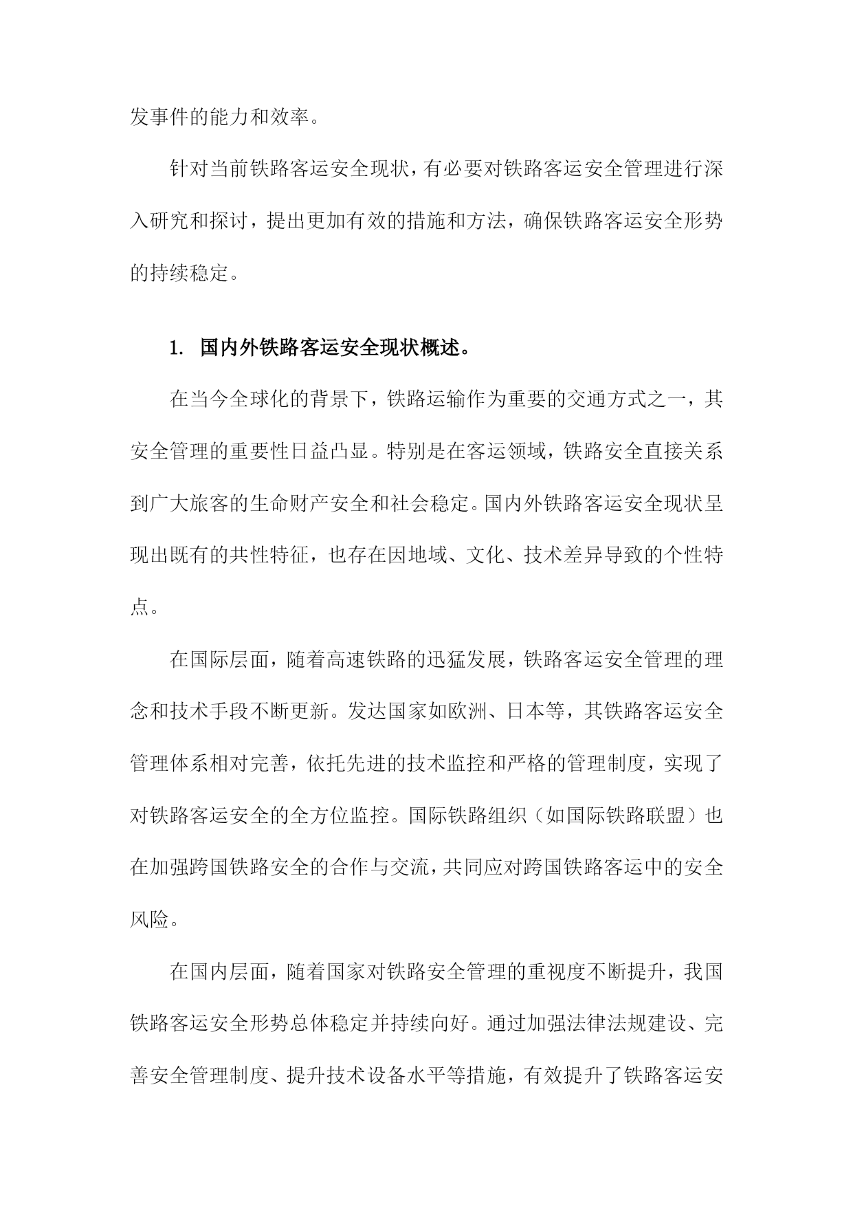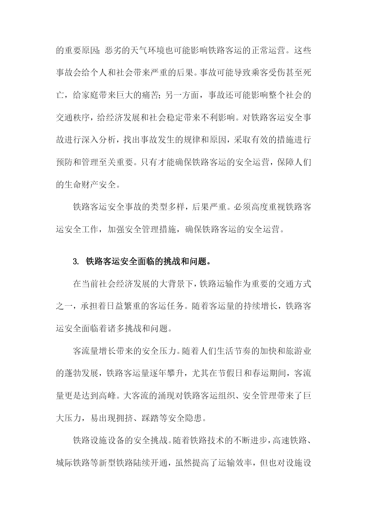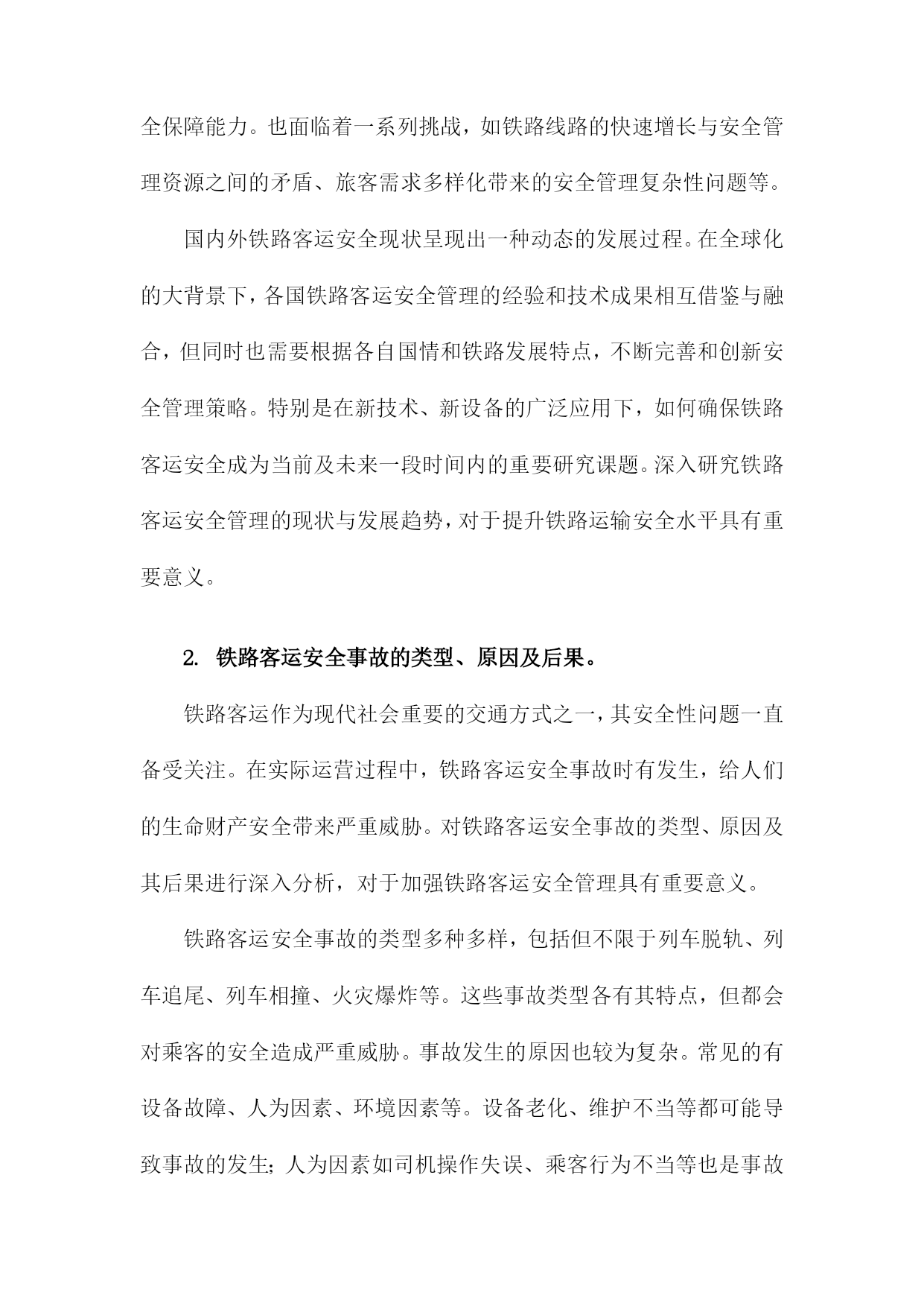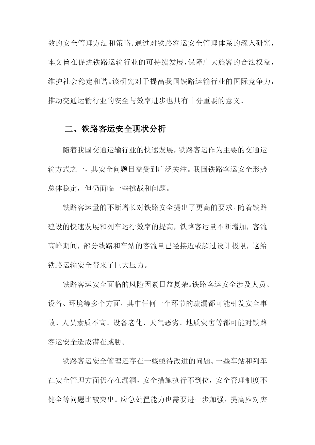 铁路客运安全管理论文一、简述随着交通运输行业的快速发展,铁路客运作为主要的交通方式之一,其安全管理问题日益受到广泛关注。铁路客运安全管理的重要性不言而喻,它不仅关系到广大旅客的生命财产安全,也关系到社会的和谐稳定。本文旨在探讨铁路客运安全管理的现状、问题及原因,并提出相应的改进措施和建议,以进一步提高铁路客运安全管理水平。文章首先概述了当前铁路客运安全管理的背景、研究意义以及国内外相关研究现状,为后续的研究分析提供了基础。本文还介绍了铁路客运安全管理的相关概念、基本原则和现状分析,为后续深入探讨铁路客运安全管理问题提供了理论支撑。通过对当前铁路客运安全管理的全面了解,可以更好地提出加强和改进铁路客运安全管理的对策,从而确保铁路客运安全、高效、有序进行。1.铁路运输在现代交通体系中的地位和作用。在现代社会,随着经济的飞速发展和城市化进程的加快,交通运输作为社会发展的重要支撑,其地位和作用愈发凸显。而在这一体系中,铁路运输以其高效、安全、环保的特点占据了举足轻重的地位。铁路运输是国民经济的大动脉,是连接城乡、沟通各地的重要纽带。它承担着大量的客运和货运任务,为人们的出行和物资的流通提供了可靠的保障。特别是在长途客运方面,铁路以其速度快、安全性高、运输能力大的优势,成为广大旅客出行的首选。铁路运输在现代交通体系中发挥着重要的作用。随着高速铁路、城际铁路等现代化铁路设施的建设和发展,铁路运输在提升运输效率、降低运输成本、优化交通结构等方面发挥了显著的作用。铁路运输对于促进区域均衡发展、实现共同富裕也具有重要意义。通过铁路网络的完善和优化,可以带动沿线地区的经济发展,实现资源的优化配置。铁路运输在现代交通体系中占据着重要的地位,发挥着不可替代的作用。加强铁路客运安全管理,提升铁路运输服务质量,对于满足人们的出行需求,促进社会的和谐稳定发展具有重要意义。2.铁路客运安全的重要性及其对社会、经济、生活的影响。铁路客运安全是铁路运输行业的核心要素,其重要性不言而喻。铁路客运安全直接关系到广大旅客的生命财产安全,是保障人民群众安全出行的基础。铁路客运安全不仅对社会稳定起着重要作用,同时也是国家公共安全的重要组成部分。对社会而言,铁路客运安全是维护社会和谐与稳定的基石。安全畅通的铁路运输能够保障人们的出行需求,促进人员流动,加强社会联系,为社会经济发展提供强有力的支撑。对经济而言,铁路客运安全是经济发展的重要保障。铁路运输的可靠性和安全性直接影响到物流、贸易以及产业供应链的稳定。铁路客运的安全运行能够带动相关产业的发展,促进经济活动的顺畅进行,为国家的经济发展提供持续的动力。对生活而言,铁路客运安全直接影响着人们的日常生活质量。随着人们生活水平的提高,出行需求日益增长,安全舒适的铁路旅行成为广大旅客的期望。铁路客运安全管理的提升,不仅提高了旅客的出行体验,也为人们的日常生活带来了便利。铁路客运安全的重要性不容忽视,其对社会、经济、生活的影响是深远的。加强铁路客运安全管理,提升服务质量,对于促进国家的发展、维护社会稳定、满足人们的日常出行需求具有重要的现实意义。3.论文研究的目的、意义和创新点。随着交通运输行业的飞速发展,铁路客运作为国家重要基础设施的作用日益凸显。保障铁路客运安全不仅是铁路运输的生命线,也是国家公共安全和人民生命财产安全的重要组成部分。本文的研究目的在于通过深入分析铁路客运安全管理的现状、问题和挑战,寻找加强和改进铁路客运安全管理的有效途径和措施,提升铁路客运安全水平,确保旅客出行的安全。铁路客运安全管理研究的意义在于为铁路运输行业提供科学、有效的安全管理方法和策略。通过对铁路客运安全管理体系的深入研究,本文旨在促进铁路运输行业的可持续发展,保障广大旅客的合法权益,维护社会稳定和谐。该研究对于提高我国铁路运输行业的国际竞争力,推动交通运输行业的安全与效率进步也具有十分重要的意义。二、铁路客运安全现状分析随着我国交通运输行业的快速发展,铁路客运作为主要的交通运输方式之一,其安全问题日益受到广泛关注。我国铁路客运安全形势总体稳定,但仍面临一些挑战和问题。铁路客运量的不断增长对铁路安全提出了更高的要求。随着铁路建设的快速发展和列车运行效率的提高,铁路客运量不断增加,客流高峰期间,部分线路和车站的客流量已经接近或超过设计极限,这给铁路运输安全带来了巨大压力。铁路客运安全面临的风险因素日益复杂。铁路客运安全涉及人员、设备、环境等多个方面,其中任何一个环节的疏漏都可能引发安全事故。人员素质不高、设备老化、天气恶劣、地质灾害等都可能对铁路客运安全造成潜在威胁。铁路客运安全管理还存在一些亟待改进的问题。一些车站和列车在安全管理方面仍存在漏洞,安全措施执行不到位,安全管理制度不健全等问题比较突出。应急处置能