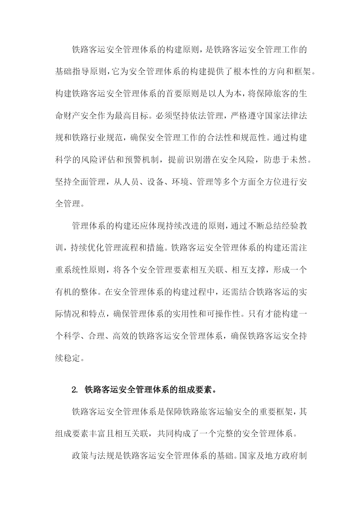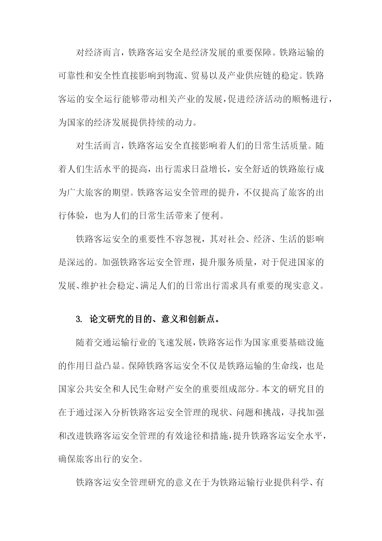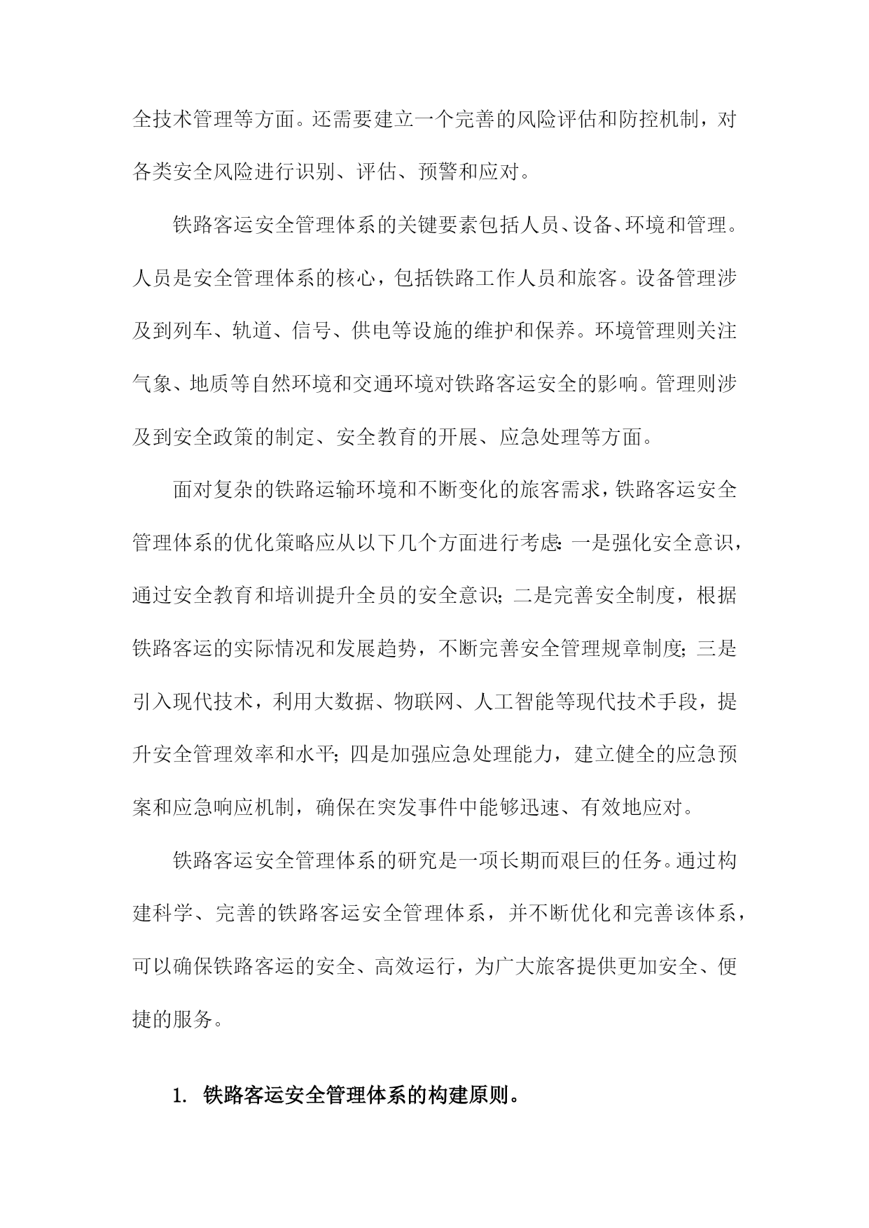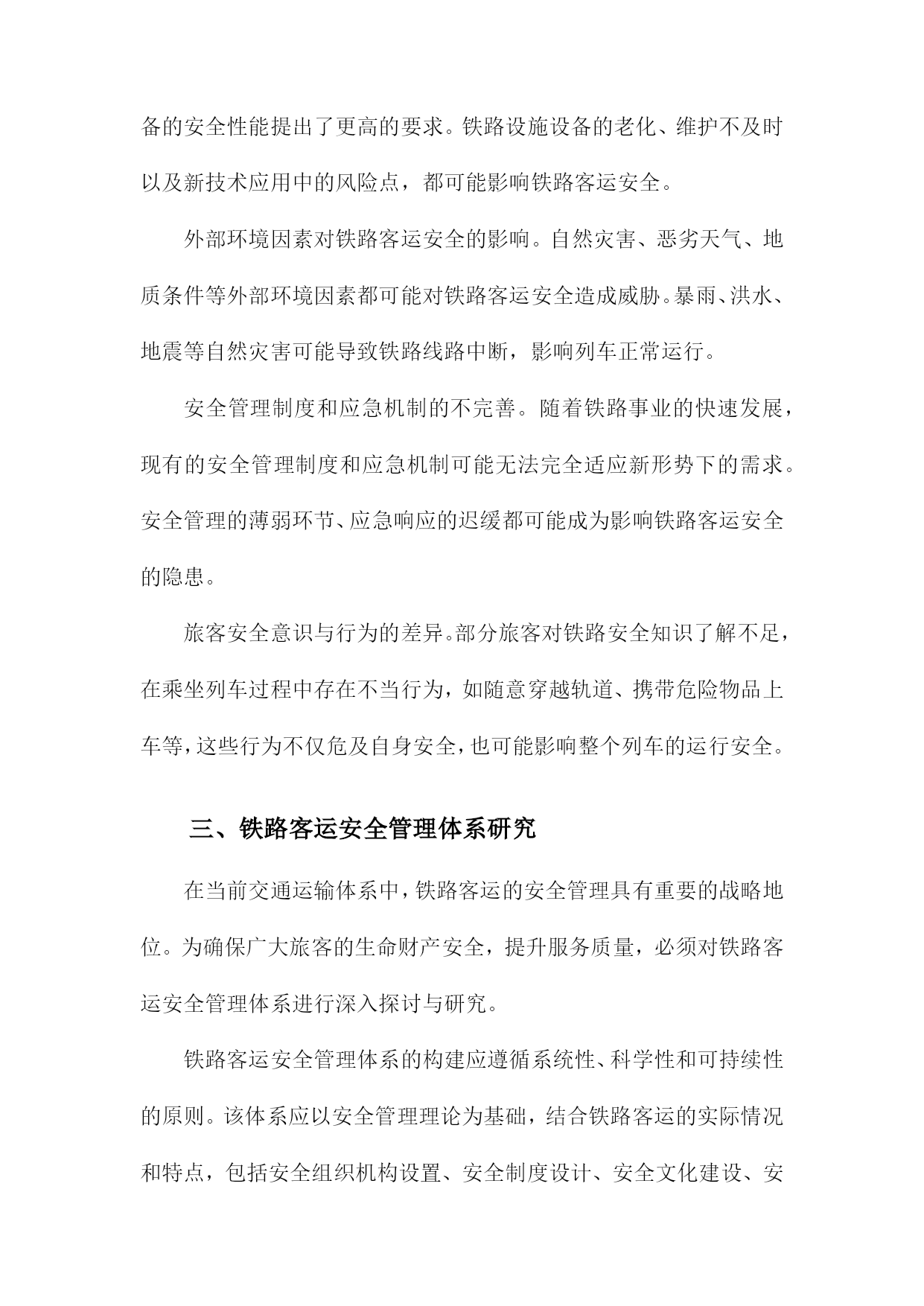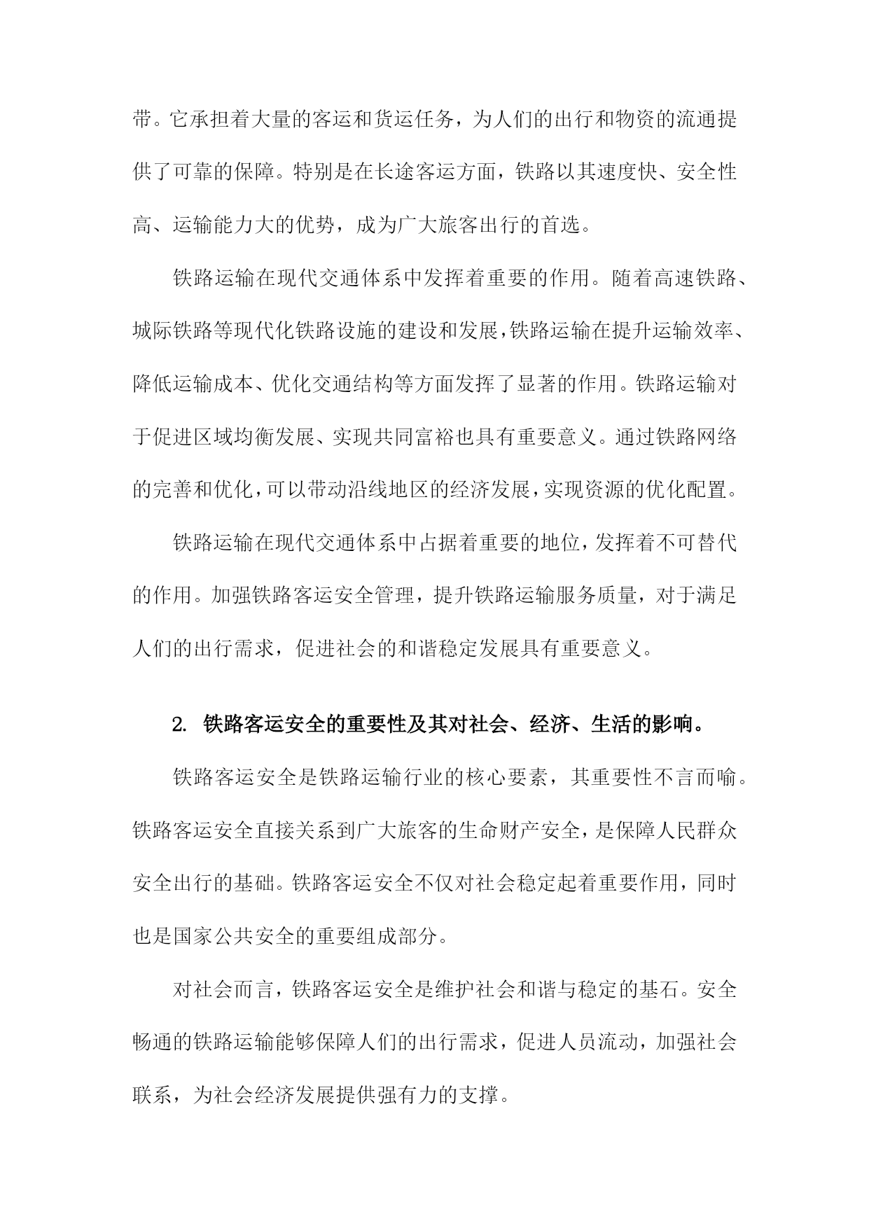 铁路客运安全管理论文一、简述随着交通运输行业的快速发展,铁路客运作为主要的交通方式之一,其安全管理问题日益受到广泛关注。铁路客运安全管理的重要性不言而喻,它不仅关系到广大旅客的生命财产安全,也关系到社会的和谐稳定。本文旨在探讨铁路客运安全管理的现状、问题及原因,并提出相应的改进措施和建议,以进一步提高铁路客运安全管理水平。文章首先概述了当前铁路客运安全管理的背景、研究意义以及国内外相关研究现状,为后续的研究分析提供了基础。本文还介绍了铁路客运安全管理的相关概念、基本原则和现状分析,为后续深入探讨铁路客运安全管理问题提供了理论支撑。通过对当前铁路客运安全管理的全面了解,可以更好地提出加强和改进铁路客运安全管理的对策,从而确保铁路客运安全、高效、有序进行。1.铁路运输在现代交通体系中的地位和作用。在现代社会,随着经济的飞速发展和城市化进程的加快,交通运输作为社会发展的重要支撑,其地位和作用愈发凸显。而在这一体系中,铁路运输以其高效、安全、环保的特点占据了举足轻重的地位。铁路运输是国民经济的大动脉,是连接城乡、沟通各地的重要纽带。它承担着大量的客运和货运任务,为人们的出行和物资的流通提供了可靠的保障。特别是在长途客运方面,铁路以其速度快、安全性高、运输能力大的优势,成为广大旅客出行的首选。铁路运输在现代交通体系中发挥着重要的作用。随着高速铁路、城际铁路等现代化铁路设施的建设和发展,铁路运输在提升运输效率、降低运输成本、优化交通结构等方面发挥了显著的作用。铁路运输对于促进区域均衡发展、实现共同富裕也具有重要意义。通过铁路网络的完善和优化,可以带动沿线地区的经济发展,实现资源的优化配置。铁路运输在现代交通体系中占据着重要的地位,发挥着不可替代的作用。加强铁路客运安全管理,提升铁路运输服务质量,对于满足人们的出行需求,促进社会的和谐稳定发展具有重要意义。2.铁路客运安全的重要性及其对社会、经济、生活的影响。铁路客运安全是铁路运输行业的核心要素,其重要性不言而喻。铁路客运安全直接关系到广大旅客的生命财产安全,是保障人民群众安全出行的基础。铁路客运安全不仅对社会稳定起着重要作用,同时也是国家公共安全的重要组成部分。对社会而言,铁路客运安全是维护社会和谐与稳定的基石。安全畅通的铁路运输能够保障人们的出行需求,促进人员流动,加强社会联系,为社会经济发展提供强有力的支撑。对经济而言,铁路客运安全是经济发展的重要保障。铁路运输的可靠性和安全性直接影响到物流、贸易以及产业供应链的稳定。铁路客运的安全运行能够带动相关产业的发展,促进经济活动的顺畅进行,为国家的经济发展提供持续的动力。对生活而言,铁路客运安全直接影响着人们的日常生活质量。随着人们生活水平的提高,出行需求日益增长,安全舒适的铁路旅行成为广大旅客的期望。铁路客运安全管理的提升,不仅提高了旅客的出行体验,也为人们的日常生活带来了便利。铁路客运安全的重要性不容忽视,其对社会、经济、生活的影响是深远的。加强铁路客运安全管理,提升服务质量,对于促进国家的发展、维护社会稳定、满足人们的日常出行需求具有重要的现实意义。3.论文研究的目的、意义和创新点。随着交通运输行业的飞速发展,铁路客运作为国家重要基础设施的作用日益凸显。保障铁路客运安全不仅是铁路运输的生命线,也是国家公共安全和人民生命财产安全的重要组成部分。本文的研究目的在于通过深入分析铁路客运安全管理的现状、问题和挑战,寻找加强和改进铁路客运安全管理的有效途径和措施,提升铁路客运安全水平,确保旅客出行的安全。铁路客运安全管理研究的意义在于为铁路运输行业提供科学、有效的安全管理方法和策略。通过对铁路客运安全管理体系的深入研究,本文旨在促进铁路运输行业的可持续发展,保障广大旅客的合法权益,维护社会稳定和谐。该研究对于提高我国铁路运输行业的国际竞争力,推动交通运输行业的安全与效率进步也具有十分重要的意义。二、铁路客运安全现状分析随着我国交通运输行业的快速发展,铁路客运作为主要的交通运输方式之一,其安全问题日益受到广泛关注。我国铁路客运安全形势总体稳定,但仍面临一些挑战和问题。铁路客运量的不断增长对铁路安全提出了更高的要求。随着铁路建设的快速发展和列车运行效率的提高,铁路客运量不断增加,客流高峰期间,部分线路和车站的客流量已经接近或超过设计极限,这给铁路运输安全带来了巨大压力。铁路客运安全面临的风险因素日益复杂。铁路客运安全涉及人员、设备、环境等多个方面,其中任何一个环节的疏漏都可能引发安全事故。人员素质不高、设备老化、天气恶劣、地质灾害等都可能对铁路客运安全造成潜在威胁。铁路客运安全管理还存在一些亟待改进的问题。一些车站和列车在安全管理方面仍存在漏洞,安全措施执行不到位,安全管理制度不健全等问题比较突出。应急处置能