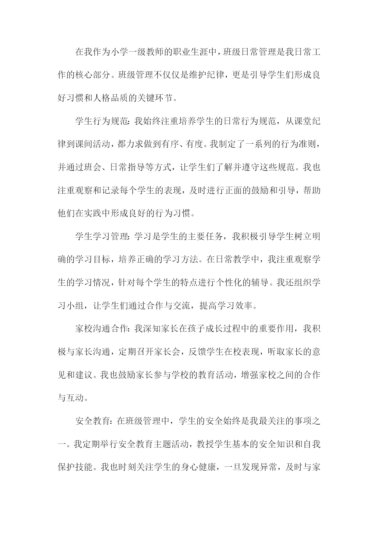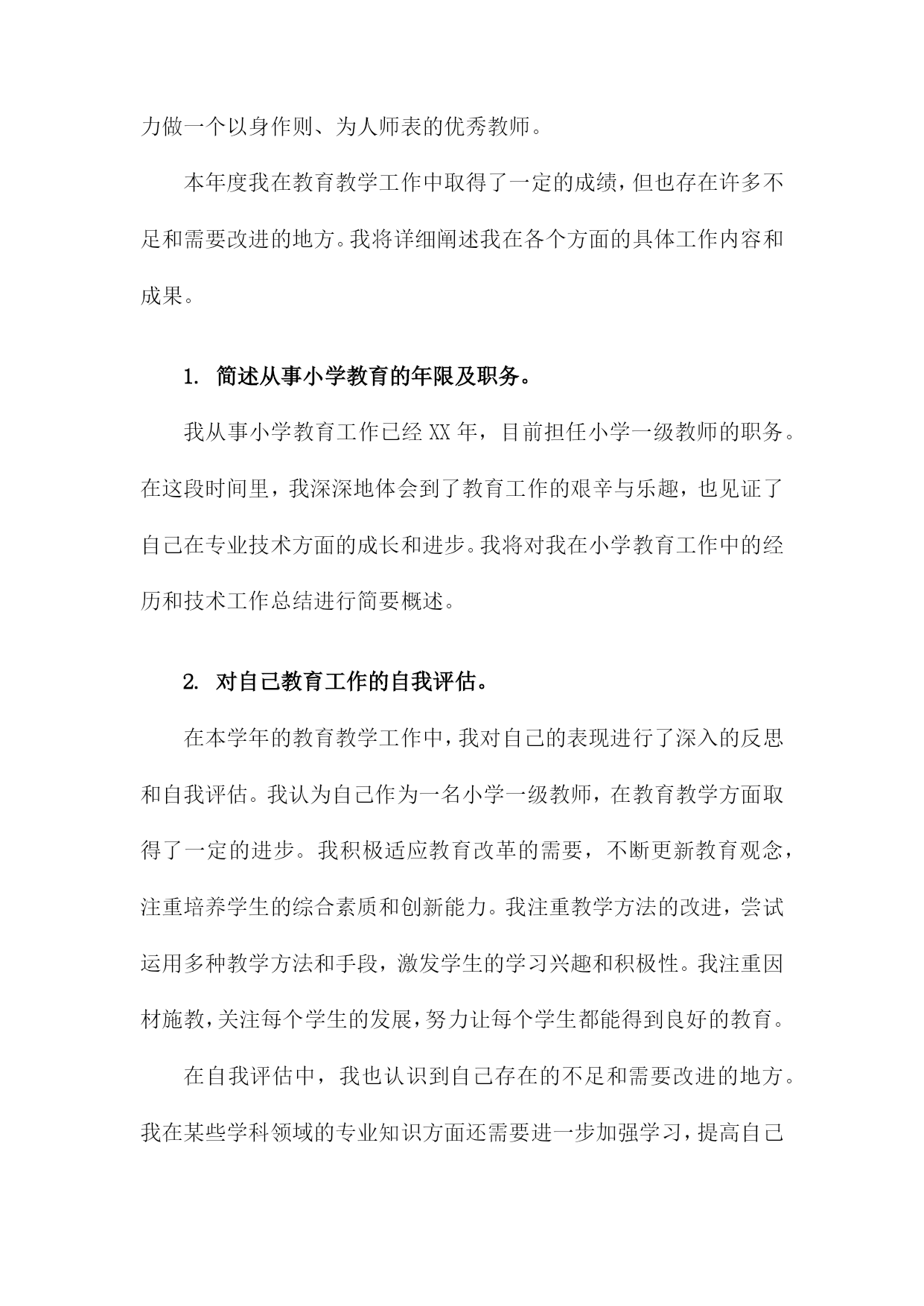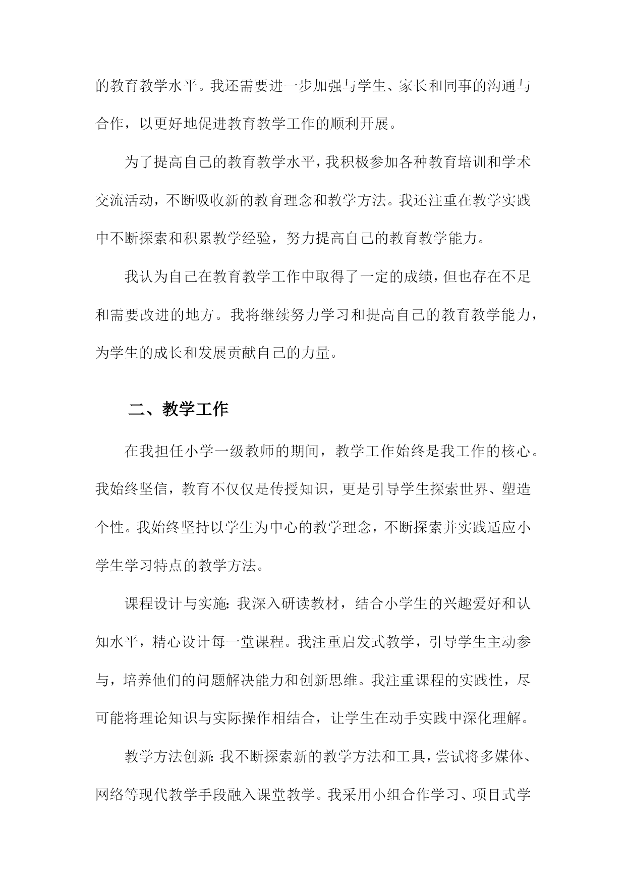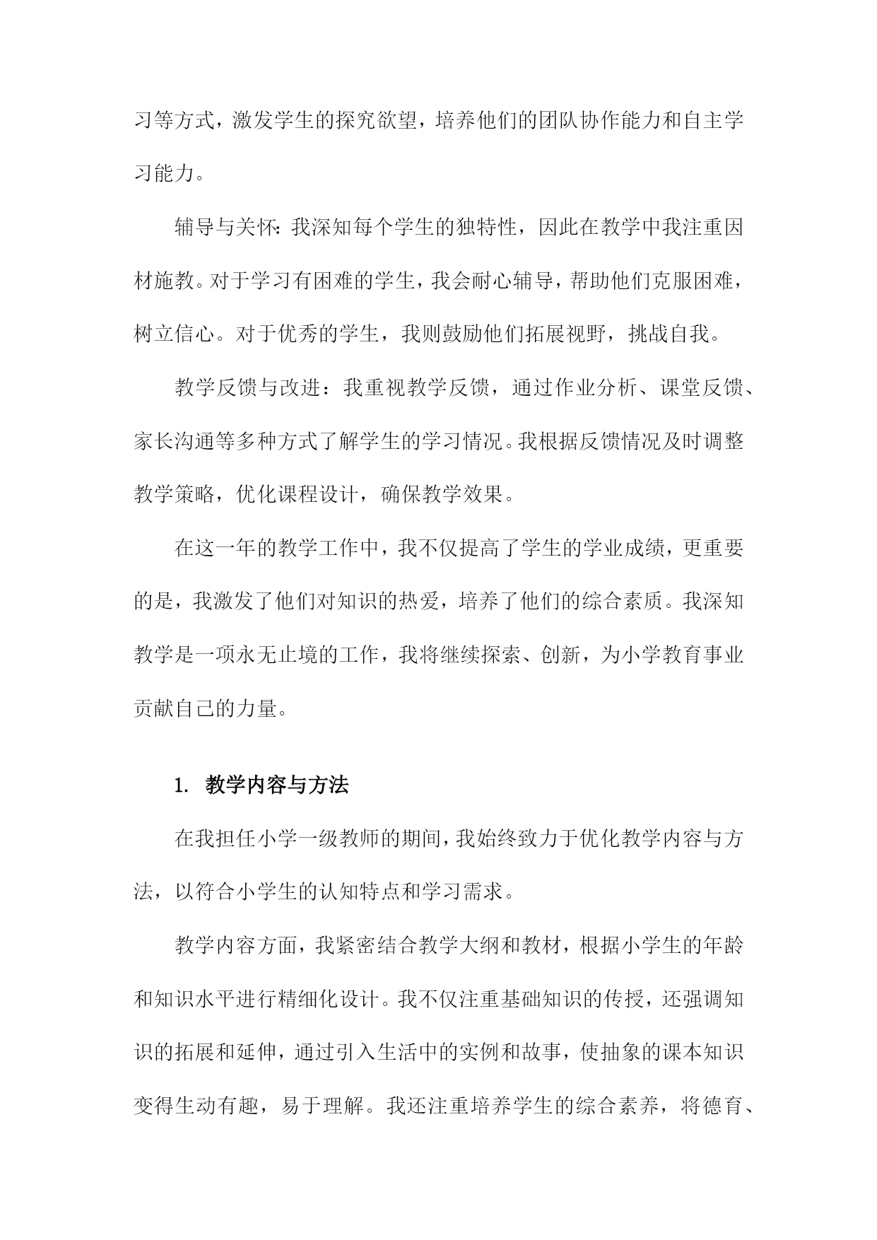 小学一级教师专业技术工作总结一、内容概述在教学工作实施方面,我严格按照教学大纲要求,结合班级实际情况,制定并实施了一系列教学计划和方案。通过不断尝试和创新教学方法,如小组合作学习、情境导入等,旨在激发学生的学习兴趣和积极性。我注重培养学生的自主学习能力和创新思维,使他们能够在学习中不断进步。在课程开发与改进方面,我积极参与学校组织的教研活动,与同事们共同探讨课程优化方案。针对小学生的年龄特点和兴趣爱好,我尝试将游戏元素融入课堂,使课程内容更加生动有趣。我还关注学生的个性化需求,努力开发拓展课程,为学生提供更多的学习选择。在课外活动参与方面,我积极组织并参与了多项课外活动,如运动会、文艺汇演等。这些活动不仅丰富了学生的课余生活,还提高了他们的团队协作能力和综合素质。我还指导学生参加各类学科竞赛和创意比赛,取得了不错的成绩。在教师职业素养提升方面,我积极参加各类培训和学习活动,不断提高自己的教育教学水平和专业素养。我还与同事们分享教学经验和心得,共同提高教育教学水平。我也注重自身师德师风的修养,努力做一个以身作则、为人师表的优秀教师。本年度我在教育教学工作中取得了一定的成绩,但也存在许多不足和需要改进的地方。我将详细阐述我在各个方面的具体工作内容和成果。1.简述从事小学教育的年限及职务。我从事小学教育工作已经XX年,目前担任小学一级教师的职务。在这段时间里,我深深地体会到了教育工作的艰辛与乐趣,也见证了自己在专业技术方面的成长和进步。我将对我在小学教育工作中的经历和技术工作总结进行简要概述。2.对自己教育工作的自我评估。在本学年的教育教学工作中,我对自己的表现进行了深入的反思和自我评估。我认为自己作为一名小学一级教师,在教育教学方面取得了一定的进步。我积极适应教育改革的需要,不断更新教育观念,注重培养学生的综合素质和创新能力。我注重教学方法的改进,尝试运用多种教学方法和手段,激发学生的学习兴趣和积极性。我注重因材施教,关注每个学生的发展,努力让每个学生都能得到良好的教育。在自我评估中,我也认识到自己存在的不足和需要改进的地方。我在某些学科领域的专业知识方面还需要进一步加强学习,提高自己的教育教学水平。我还需要进一步加强与学生、家长和同事的沟通与合作,以更好地促进教育教学工作的顺利开展。为了提高自己的教育教学水平,我积极参加各种教育培训和学术交流活动,不断吸收新的教育理念和教学方法。我还注重在教学实践中不断探索和积累教学经验,努力提高自己的教育教学能力。我认为自己在教育教学工作中取得了一定的成绩,但也存在不足和需要改进的地方。我将继续努力学习和提高自己的教育教学能力,为学生的成长和发展贡献自己的力量。二、教学工作在我担任小学一级教师的期间,教学工作始终是我工作的核心。我始终坚信,教育不仅仅是传授知识,更是引导学生探索世界、塑造个性。我始终坚持以学生为中心的教学理念,不断探索并实践适应小学生学习特点的教学方法。课程设计与实施:我深入研读教材,结合小学生的兴趣爱好和认知水平,精心设计每一堂课程。我注重启发式教学,引导学生主动参与,培养他们的问题解决能力和创新思维。我注重课程的实践性,尽可能将理论知识与实际操作相结合,让学生在动手实践中深化理解。教学方法创新:我不断探索新的教学方法和工具,尝试将多媒体、网络等现代教学手段融入课堂教学。我采用小组合作学习、项目式学习等方式,激发学生的探究欲望,培养他们的团队协作能力和自主学习能力。辅导与关怀:我深知每个学生的独特性,因此在教学中我注重因材施教。对于学习有困难的学生,我会耐心辅导,帮助他们克服困难,树立信心。对于优秀的学生,我则鼓励他们拓展视野,挑战自我。教学反馈与改进:我重视教学反馈,通过作业分析、课堂反馈、家长沟通等多种方式了解学生的学习情况。我根据反馈情况及时调整教学策略,优化课程设计,确保教学效果。在这一年的教学工作中,我不仅提高了学生的学业成绩,更重要的是,我激发了他们对知识的热爱,培养了他们的综合素质。我深知教学是一项永无止境的工作,我将继续探索、创新,为小学教育事业贡献自己的力量。1.教学内容与方法在我担任小学一级教师的期间,我始终致力于优化教学内容与方法,以符合小学生的认知特点和学习需求。教学内容方面,我紧密结合教学大纲和教材,根据小学生的年龄和知识水平进行精细化设计。我不仅注重基础知识的传授,还强调知识的拓展和延伸,通过引入生活中的实例和故事,使抽象的课本知识变得生动有趣,易于理解。我还注重培养学生的综合素养,将德育、体育、美育等元素融入教学中,让学生在掌握知识的形成良好的价值观和社会责任感。在教学方法上,我采取多元化的教学策略,力求在传统教学方法的基础上进行创新。我重视学生的主体参与,通过情境创设、角色扮演、小组讨论等多样化教