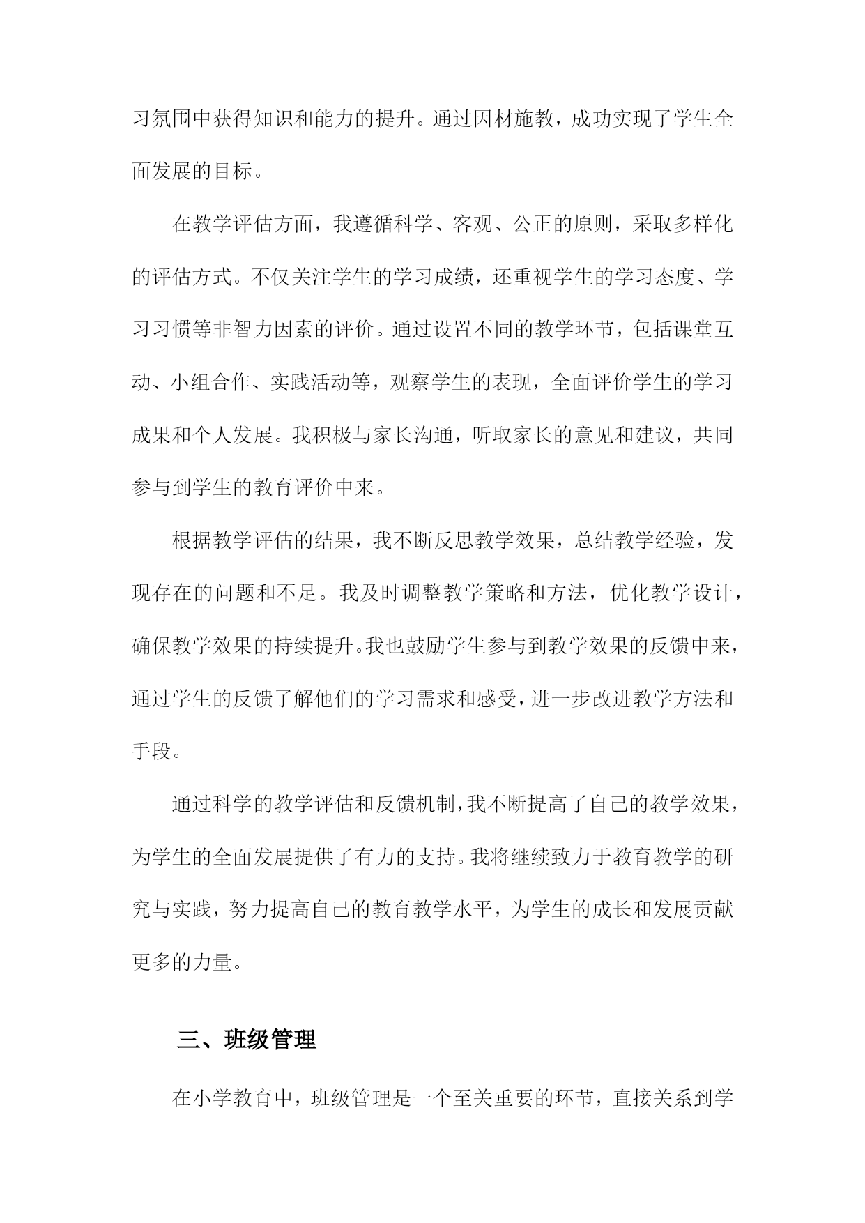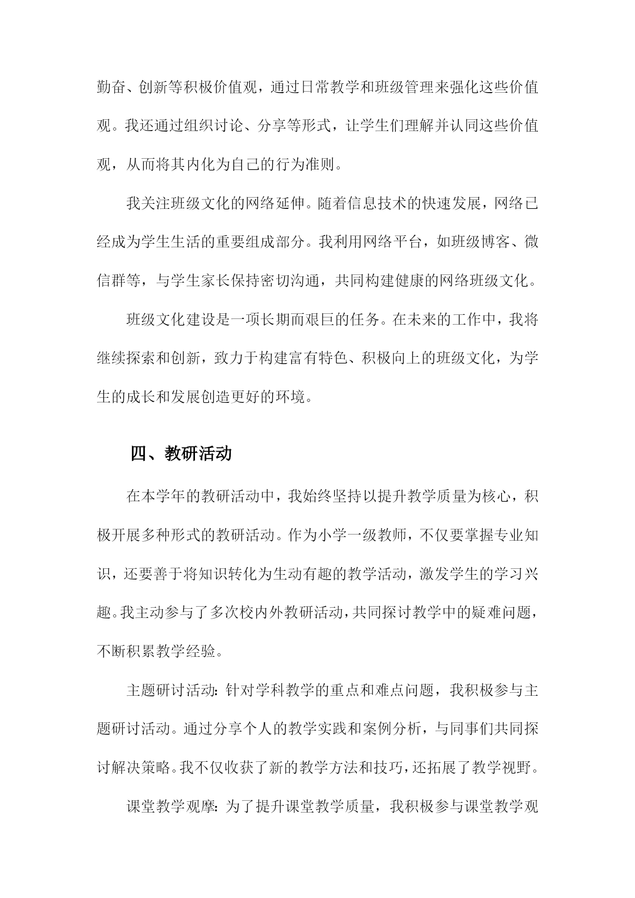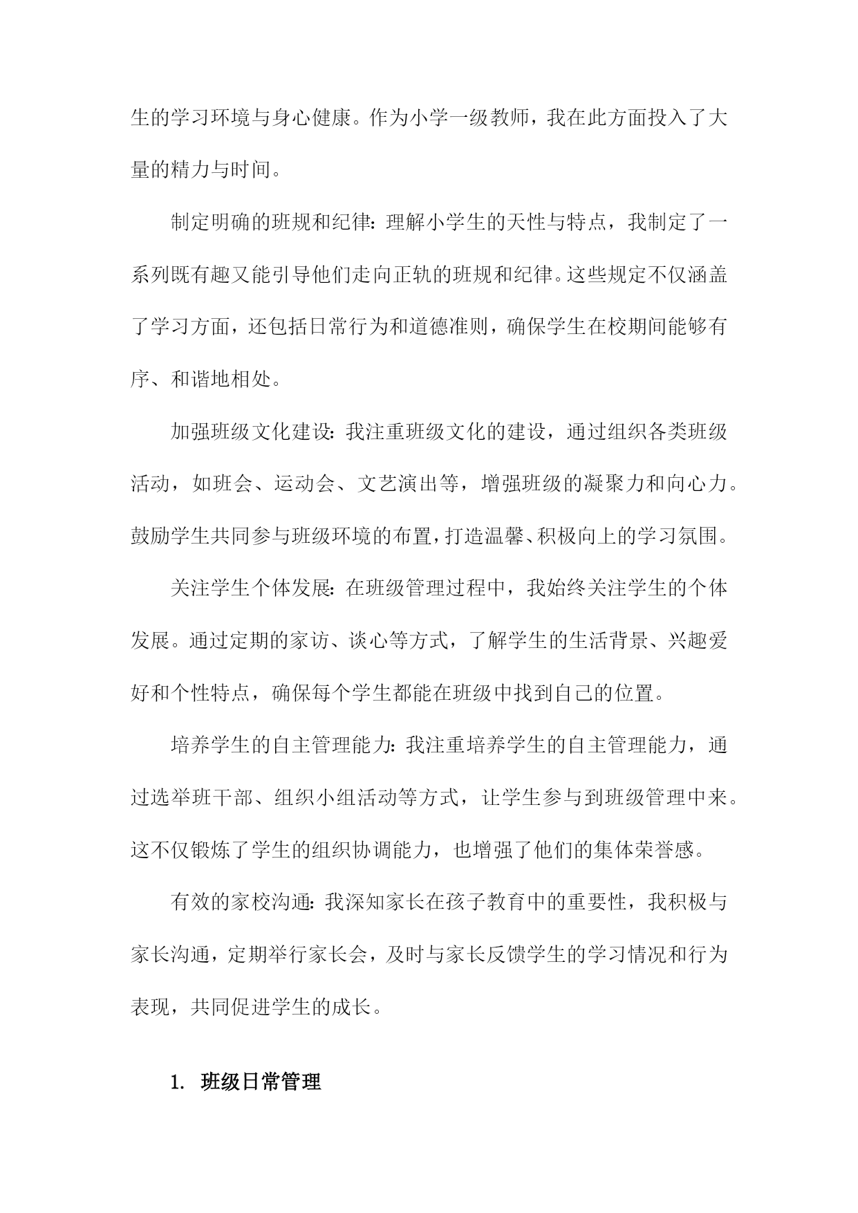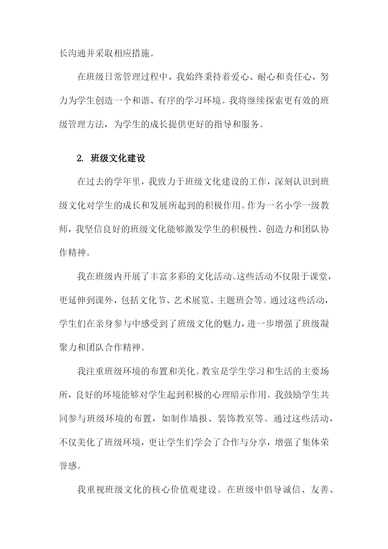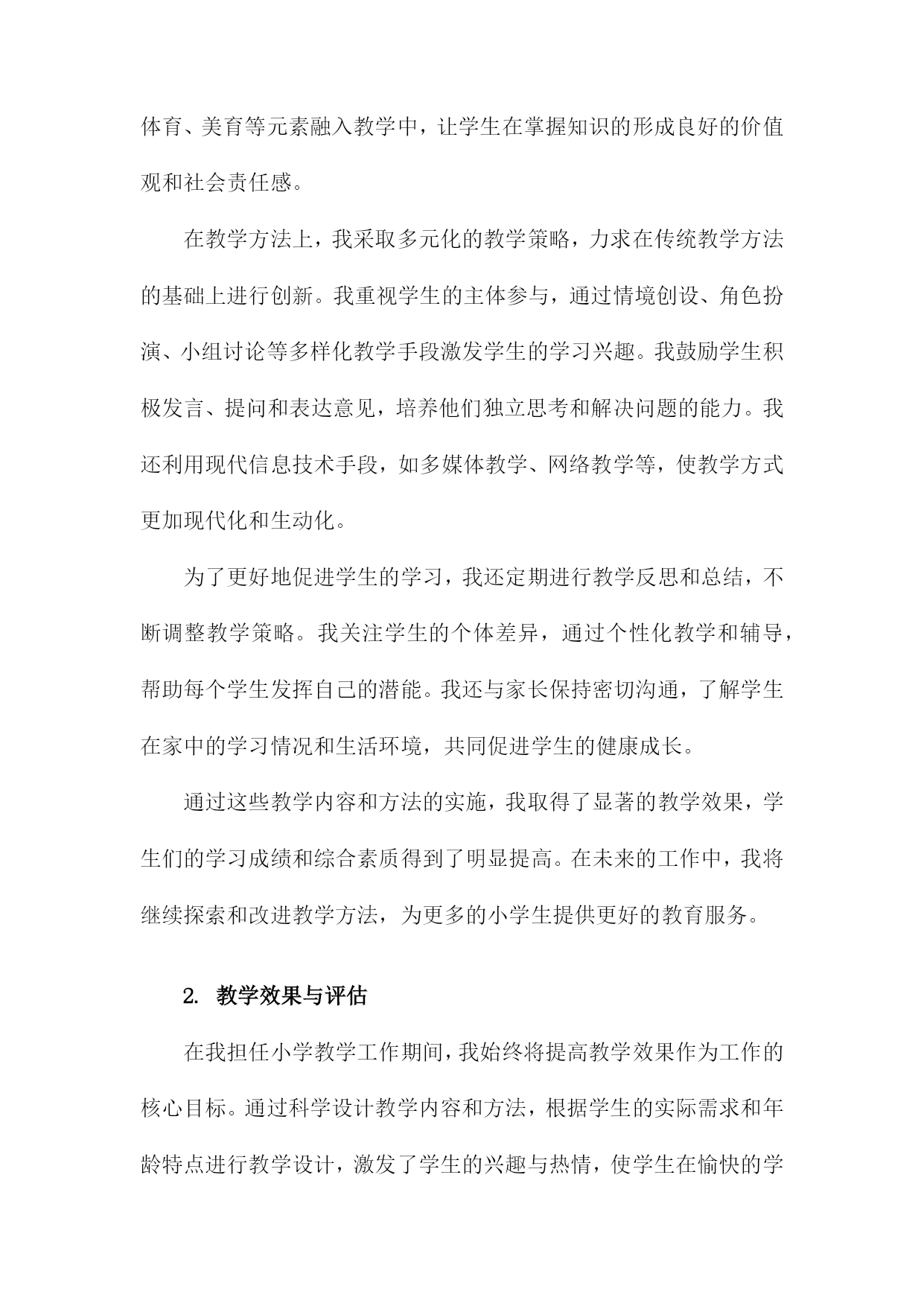 小学一级教师专业技术工作总结一、内容概述在教学工作实施方面,我严格按照教学大纲要求,结合班级实际情况,制定并实施了一系列教学计划和方案。通过不断尝试和创新教学方法,如小组合作学习、情境导入等,旨在激发学生的学习兴趣和积极性。我注重培养学生的自主学习能力和创新思维,使他们能够在学习中不断进步。在课程开发与改进方面,我积极参与学校组织的教研活动,与同事们共同探讨课程优化方案。针对小学生的年龄特点和兴趣爱好,我尝试将游戏元素融入课堂,使课程内容更加生动有趣。我还关注学生的个性化需求,努力开发拓展课程,为学生提供更多的学习选择。在课外活动参与方面,我积极组织并参与了多项课外活动,如运动会、文艺汇演等。这些活动不仅丰富了学生的课余生活,还提高了他们的团队协作能力和综合素质。我还指导学生参加各类学科竞赛和创意比赛,取得了不错的成绩。在教师职业素养提升方面,我积极参加各类培训和学习活动,不断提高自己的教育教学水平和专业素养。我还与同事们分享教学经验和心得,共同提高教育教学水平。我也注重自身师德师风的修养,努力做一个以身作则、为人师表的优秀教师。本年度我在教育教学工作中取得了一定的成绩,但也存在许多不足和需要改进的地方。我将详细阐述我在各个方面的具体工作内容和成果。1.简述从事小学教育的年限及职务。我从事小学教育工作已经XX年,目前担任小学一级教师的职务。在这段时间里,我深深地体会到了教育工作的艰辛与乐趣,也见证了自己在专业技术方面的成长和进步。我将对我在小学教育工作中的经历和技术工作总结进行简要概述。2.对自己教育工作的自我评估。在本学年的教育教学工作中,我对自己的表现进行了深入的反思和自我评估。我认为自己作为一名小学一级教师,在教育教学方面取得了一定的进步。我积极适应教育改革的需要,不断更新教育观念,注重培养学生的综合素质和创新能力。我注重教学方法的改进,尝试运用多种教学方法和手段,激发学生的学习兴趣和积极性。我注重因材施教,关注每个学生的发展,努力让每个学生都能得到良好的教育。在自我评估中,我也认识到自己存在的不足和需要改进的地方。我在某些学科领域的专业知识方面还需要进一步加强学习,提高自己的教育教学水平。我还需要进一步加强与学生、家长和同事的沟通与合作,以更好地促进教育教学工作的顺利开展。为了提高自己的教育教学水平,我积极参加各种教育培训和学术交流活动,不断吸收新的教育理念和教学方法。我还注重在教学实践中不断探索和积累教学经验,努力提高自己的教育教学能力。我认为自己在教育教学工作中取得了一定的成绩,但也存在不足和需要改进的地方。我将继续努力学习和提高自己的教育教学能力,为学生的成长和发展贡献自己的力量。二、教学工作在我担任小学一级教师的期间,教学工作始终是我工作的核心。我始终坚信,教育不仅仅是传授知识,更是引导学生探索世界、塑造个性。我始终坚持以学生为中心的教学理念,不断探索并实践适应小学生学习特点的教学方法。课程设计与实施:我深入研读教材,结合小学生的兴趣爱好和认知水平,精心设计每一堂课程。我注重启发式教学,引导学生主动参与,培养他们的问题解决能力和创新思维。我注重课程的实践性,尽可能将理论知识与实际操作相结合,让学生在动手实践中深化理解。教学方法创新:我不断探索新的教学方法和工具,尝试将多媒体、网络等现代教学手段融入课堂教学。我采用小组合作学习、项目式学习等方式,激发学生的探究欲望,培养他们的团队协作能力和自主学习能力。辅导与关怀:我深知每个学生的独特性,因此在教学中我注重因材施教。对于学习有困难的学生,我会耐心辅导,帮助他们克服困难,树立信心。对于优秀的学生,我则鼓励他们拓展视野,挑战自我。教学反馈与改进:我重视教学反馈,通过作业分析、课堂反馈、家长沟通等多种方式了解学生的学习情况。我根据反馈情况及时调整教学策略,优化课程设计,确保教学效果。在这一年的教学工作中,我不仅提高了学生的学业成绩,更重要的是,我激发了他们对知识的热爱,培养了他们的综合素质。我深知教学是一项永无止境的工作,我将继续探索、创新,为小学教育事业贡献自己的力量。1.教学内容与方法在我担任小学一级教师的期间,我始终致力于优化教学内容与方法,以符合小学生的认知特点和学习需求。教学内容方面,我紧密结合教学大纲和教材,根据小学生的年龄和知识水平进行精细化设计。我不仅注重基础知识的传授,还强调知识的拓展和延伸,通过引入生活中的实例和故事,使抽象的课本知识变得生动有趣,易于理解。我还注重培养学生的综合素养,将德育、体育、美育等元素融入教学中,让学生在掌握知识的形成良好的价值观和社会责任感。在教学方法上,我采取多元化的教学策略,力求在传统教学方法的基础上进行创新。我重视学生的主体参与,通过情境创设、角色扮演、小组讨论等多样化教