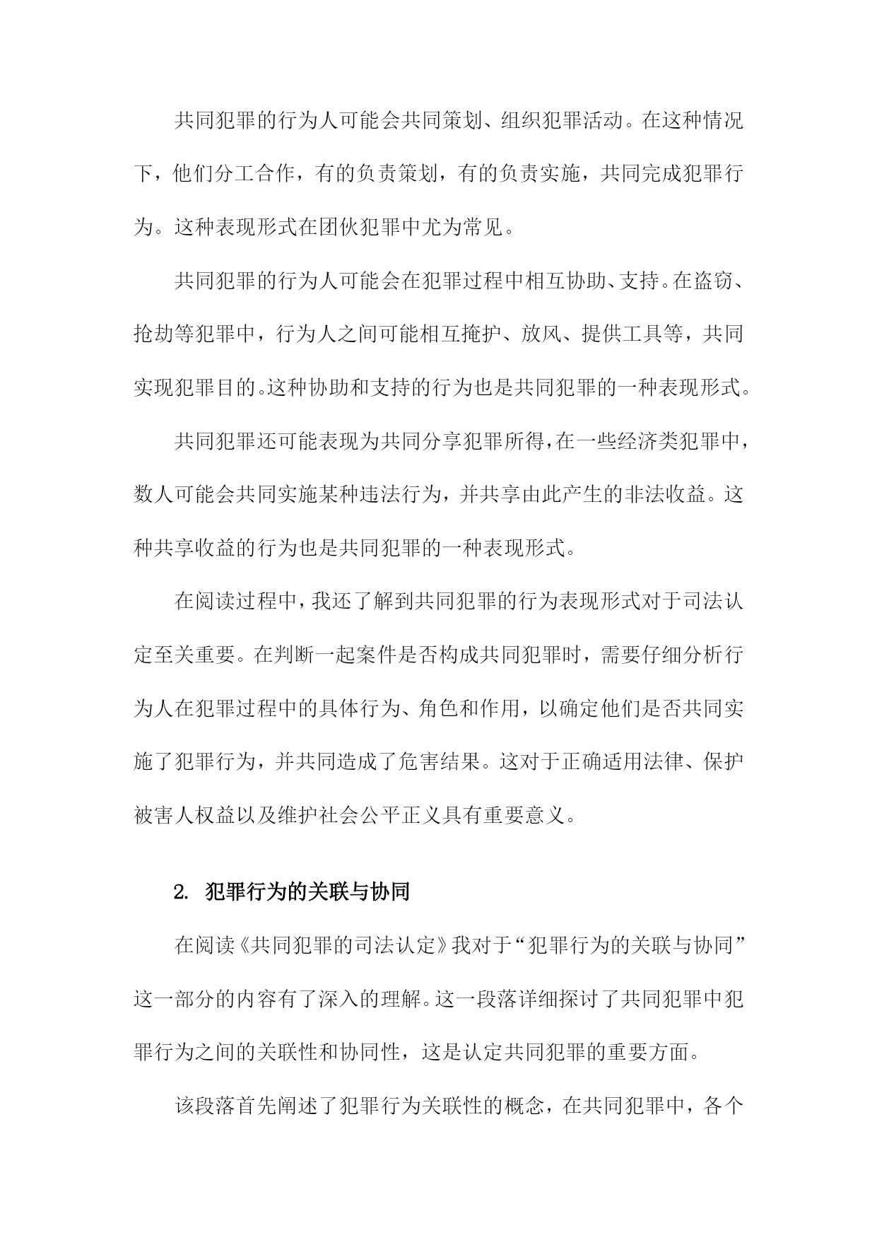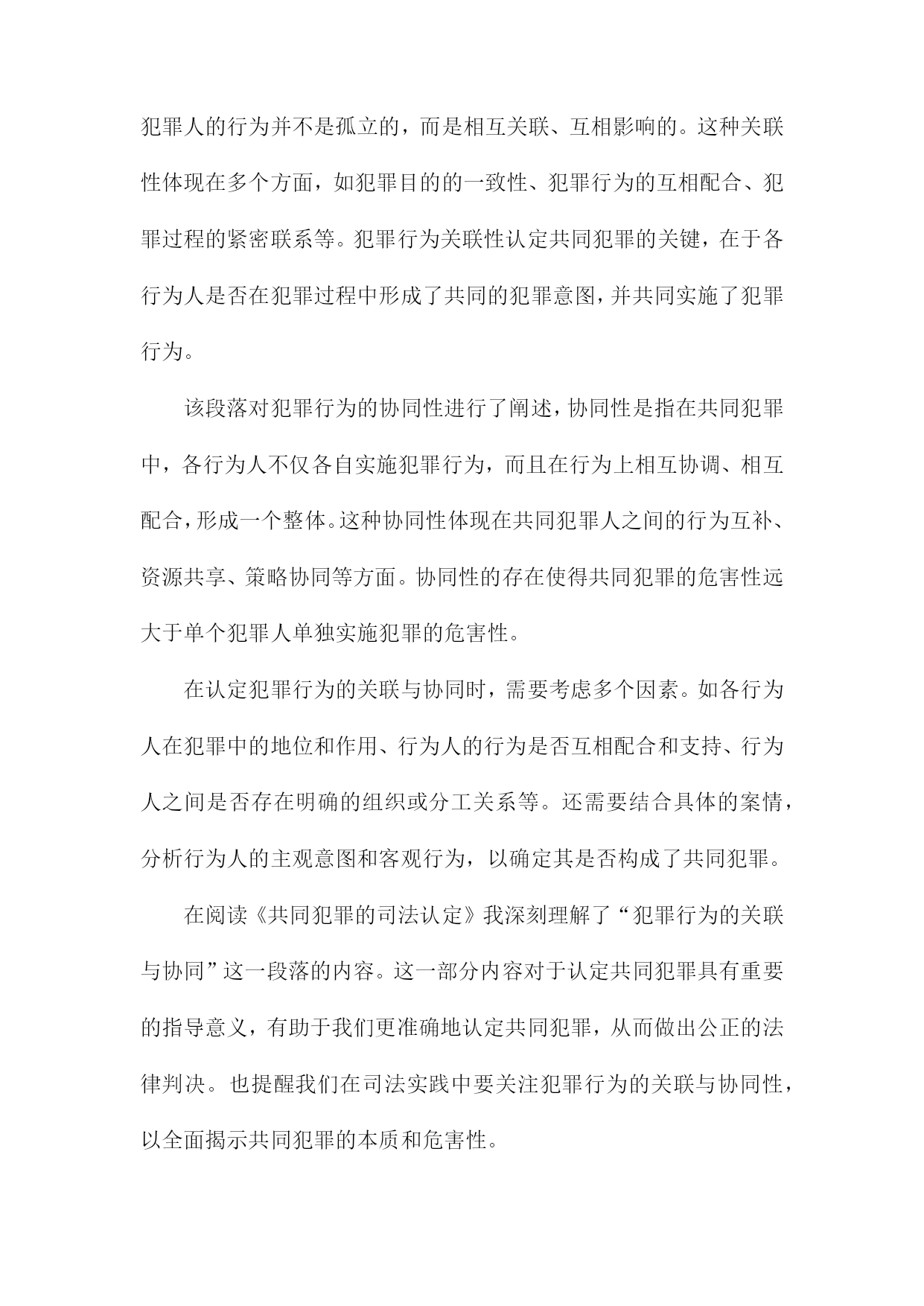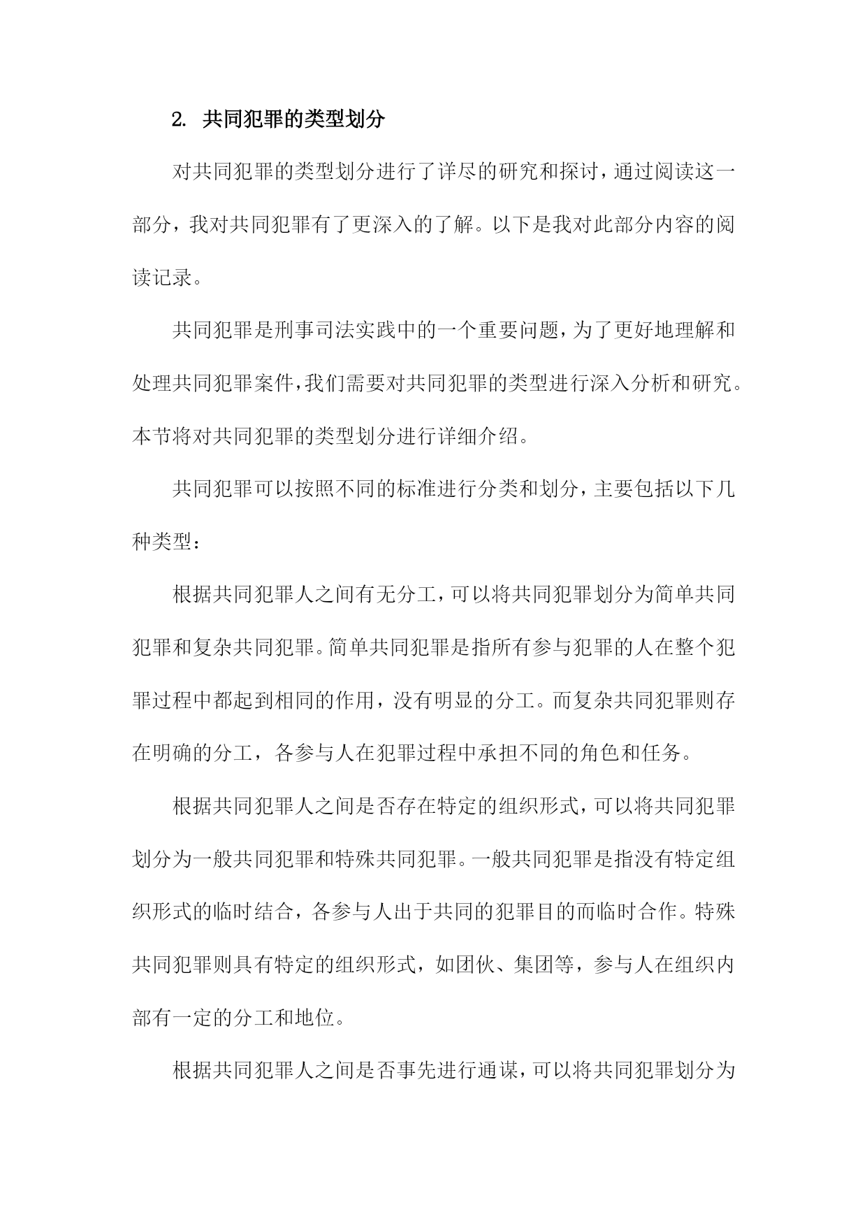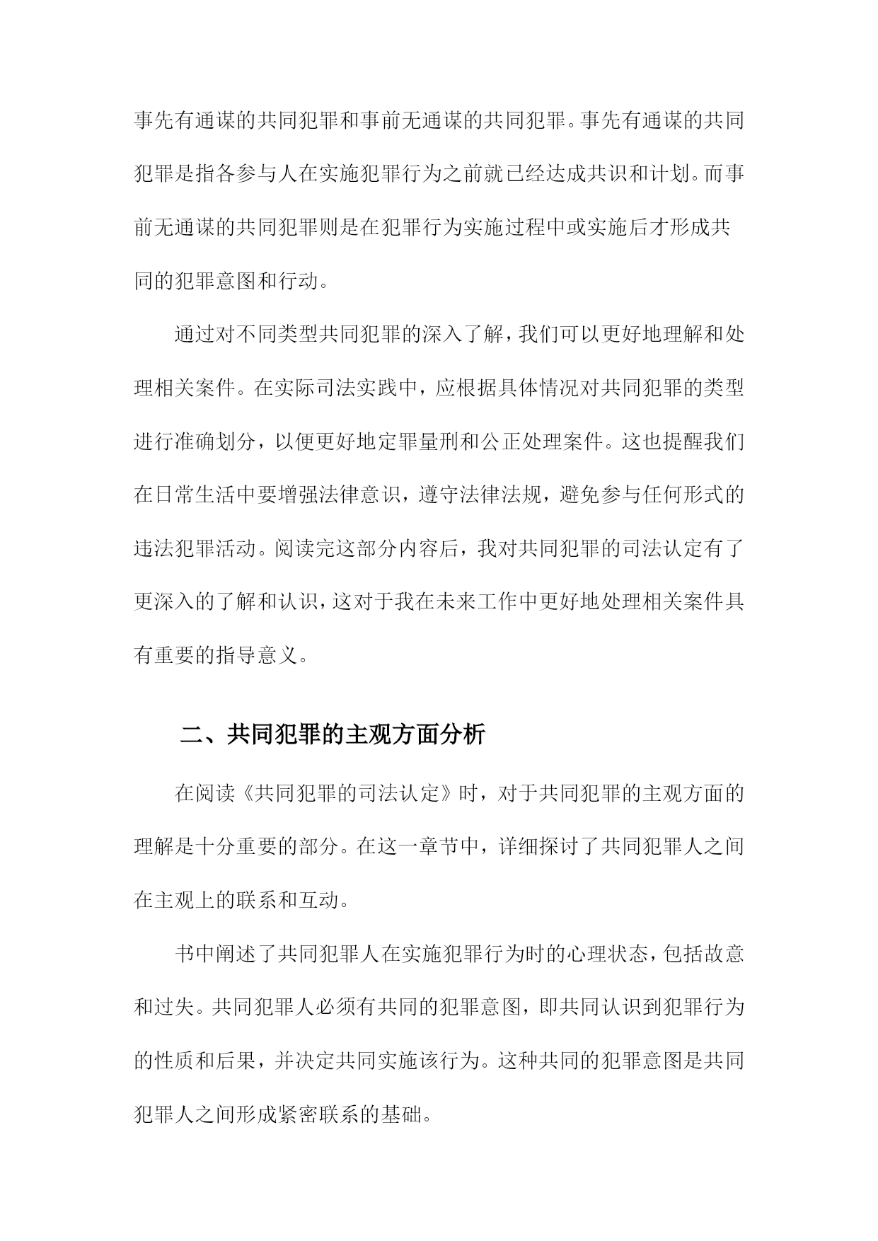 《共同犯罪的司法认定》阅读记录一、共同犯罪概念及其类型简而言之,是指数人共同实施犯罪行为,依法承担相应刑事责任的情况。这一概念基于行为的共同性和责任的共同承担性,在司法实践中,正确认定共同犯罪对于确保公正、公平的司法处理至关重要。共同犯罪的类型可以从不同的角度进行分类,按参与者的角色划分,共同犯罪可分为正犯、教唆犯和帮助犯。正犯是直接实施犯罪行为的人;教唆犯则是通过劝说、怂恿他人实施犯罪的人;帮助犯则为实施犯罪提供辅助行为,如提供工具、信息或物质支持。从共同犯罪人的相互关系来看,可分为共同正犯和特殊共同犯罪。共同正犯是指数人共同实施犯罪行为,彼此之间没有分工,均起积极作用;特殊共同犯罪中,参与者之间存在明确的分工,如组织、领导、实施等不同角色。按照犯罪行为的性质和内容,共同犯罪还可以分为一般共同犯罪和特殊形式的共同犯罪。一般共同犯罪是指数人共同实施同种犯罪行为;特殊形式的共同犯罪则涉及更为复杂的情境,如集团犯罪、团伙犯罪等,这些类型的共同犯罪往往涉及更严重的罪行和更广泛的刑事责任。在认定共同犯罪时,需要充分考虑各参与者的行为、动机、目的以及他们在犯罪中所起的作用。司法实践中,要根据具体的案情,结合相关法律法规,对每个参与者进行准确的法律定位和责任界定,确保公正处理每一起共同犯罪案件。1.共同犯罪概念解析共同犯罪是一种犯罪形态,涉及到多个行为人共同参与犯罪活动的情况。对于这一概念的理解,首先必须把握其核心要素,即多个行为人共同参与了某种犯罪行为,并形成了共同的犯罪意图或目标。共同犯罪不仅包括明显的共同策划、共同实施的犯罪行为,还包括一些看似独立但实质上相互联系、共同构成犯罪行为的个体行为。在阅读《共同犯罪的司法认定》时,这一部分对于共同犯罪概念的解析至关重要,为后续深入探讨共同犯罪的司法认定提供了坚实的理论基础。在这一段落中,我们得以理解到共同犯罪并非是单一行为的简单累加,而是各个行为人在共同犯罪中所起的作用和影响形成了共同的犯罪事实。在阅读过程中,我们会详细了解到共同犯罪的不同类型、不同行为人在犯罪中的作用大小及其认定标准等核心内容。也会探讨共同犯罪在司法实践中的认定难点和争议点,为后续理解和分析具体案例提供了理论基础。2.共同犯罪的类型划分对共同犯罪的类型划分进行了详尽的研究和探讨,通过阅读这一部分,我对共同犯罪有了更深入的了解。以下是我对此部分内容的阅读记录。共同犯罪是刑事司法实践中的一个重要问题,为了更好地理解和处理共同犯罪案件,我们需要对共同犯罪的类型进行深入分析和研究。本节将对共同犯罪的类型划分进行详细介绍。共同犯罪可以按照不同的标准进行分类和划分,主要包括以下几种类型:根据共同犯罪人之间有无分工,可以将共同犯罪划分为简单共同犯罪和复杂共同犯罪。简单共同犯罪是指所有参与犯罪的人在整个犯罪过程中都起到相同的作用,没有明显的分工。而复杂共同犯罪则存在明确的分工,各参与人在犯罪过程中承担不同的角色和任务。根据共同犯罪人之间是否存在特定的组织形式,可以将共同犯罪划分为一般共同犯罪和特殊共同犯罪。一般共同犯罪是指没有特定组织形式的临时结合,各参与人出于共同的犯罪目的而临时合作。特殊共同犯罪则具有特定的组织形式,如团伙、集团等,参与人在组织内部有一定的分工和地位。根据共同犯罪人之间是否事先进行通谋,可以将共同犯罪划分为事先有通谋的共同犯罪和事前无通谋的共同犯罪。事先有通谋的共同犯罪是指各参与人在实施犯罪行为之前就已经达成共识和计划。而事前无通谋的共同犯罪则是在犯罪行为实施过程中或实施后才形成共同的犯罪意图和行动。通过对不同类型共同犯罪的深入了解,我们可以更好地理解和处理相关案件。在实际司法实践中,应根据具体情况对共同犯罪的类型进行准确划分,以便更好地定罪量刑和公正处理案件。这也提醒我们在日常生活中要增强法律意识,遵守法律法规,避免参与任何形式的违法犯罪活动。阅读完这部分内容后,我对共同犯罪的司法认定有了更深入的了解和认识,这对于我在未来工作中更好地处理相关案件具有重要的指导意义。二、共同犯罪的主观方面分析在阅读《共同犯罪的司法认定》时,对于共同犯罪的主观方面的理解是十分重要的部分。在这一章节中,详细探讨了共同犯罪人之间在主观上的联系和互动。书中阐述了共同犯罪人在实施犯罪行为时的心理状态,包括故意和过失。共同犯罪人必须有共同的犯罪意图,即共同认识到犯罪行为的性质和后果,并决定共同实施该行为。这种共同的犯罪意图是共同犯罪人之间形成紧密联系的基础。书中对共同犯罪人的故意形态进行了深入的分析,共同犯罪人的故意形态可以是直接的或间接的,可以是概括的或特定的。不同的故意形态会影响共同犯罪人在犯罪行为中所起的作用和责任认定。书中还讨论了共同犯罪人在犯罪行为中的主观责任和刑事责任的区分。共同犯罪人的主观