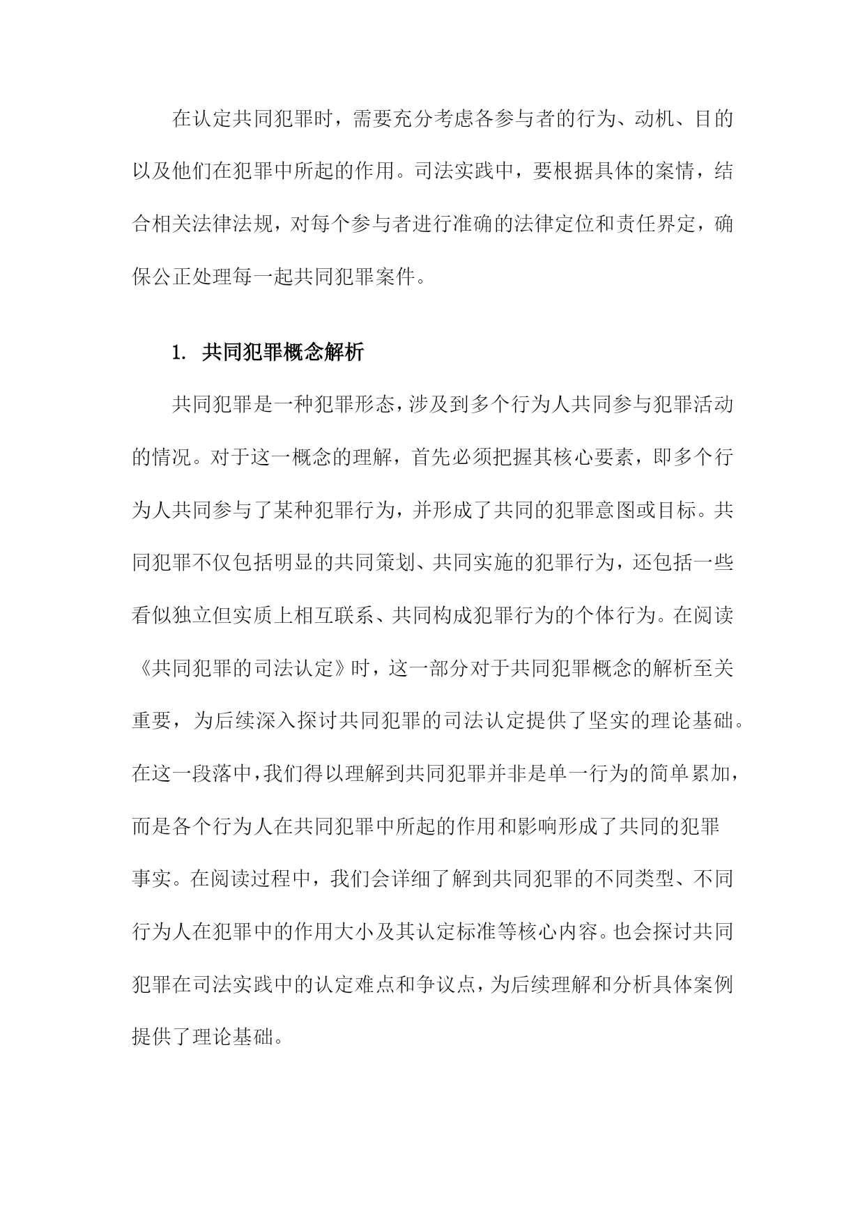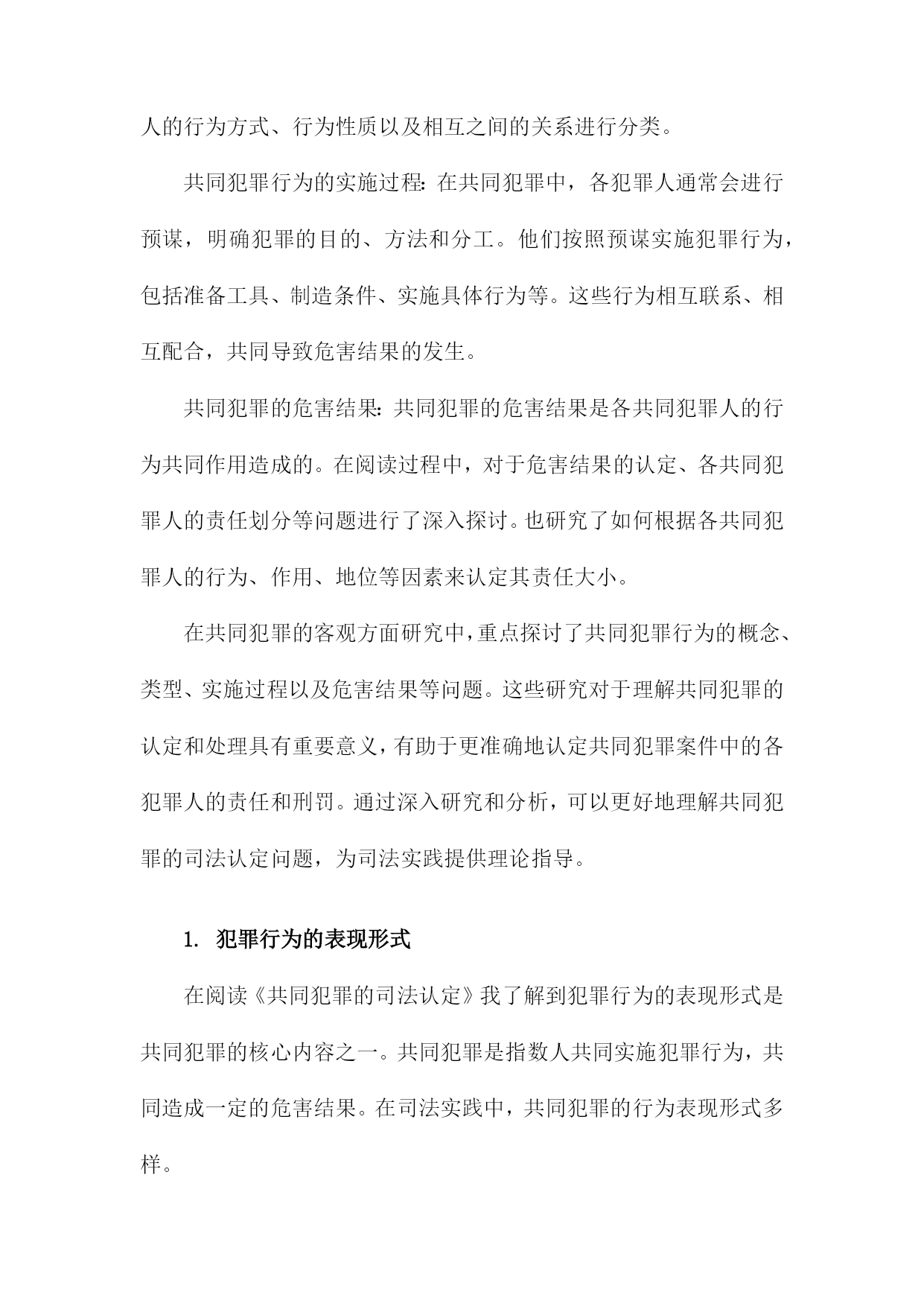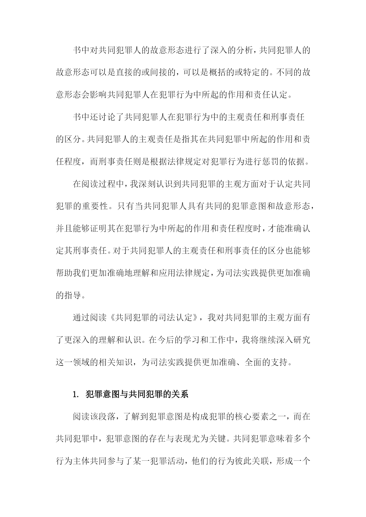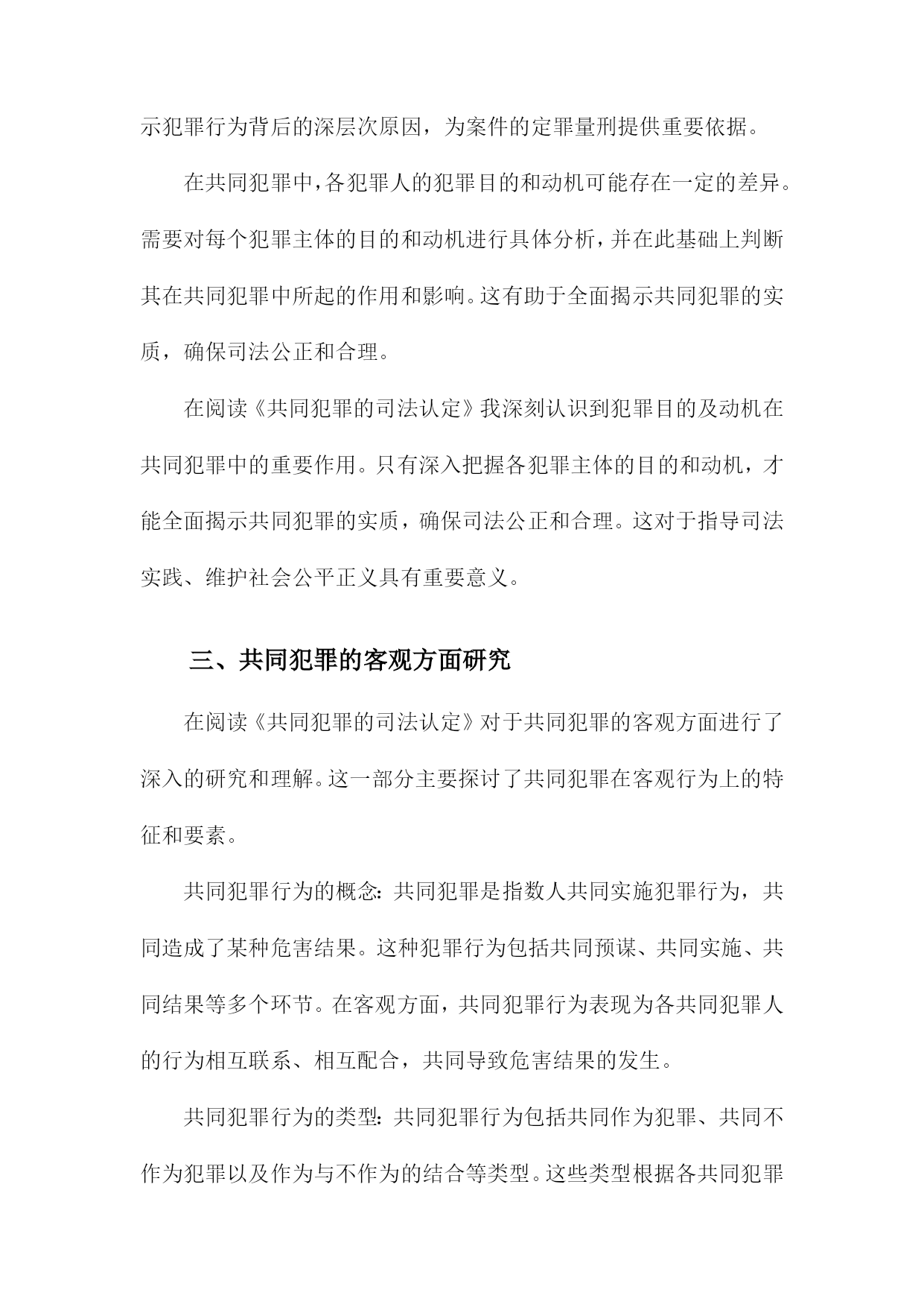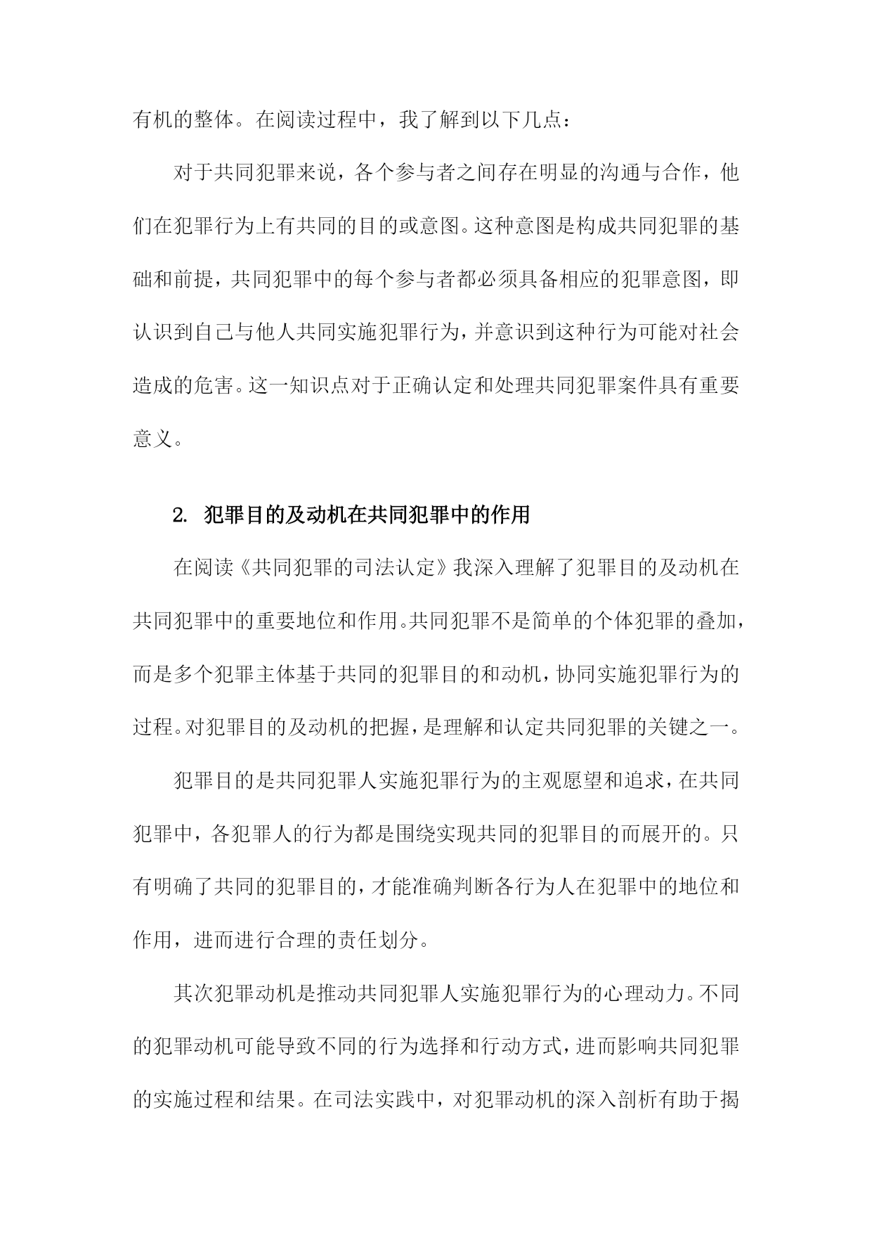《共同犯罪的司法认定》阅读记录一、共同犯罪概念及其类型简而言之,是指数人共同实施犯罪行为,依法承担相应刑事责任的情况。这一概念基于行为的共同性和责任的共同承担性,在司法实践中,正确认定共同犯罪对于确保公正、公平的司法处理至关重要。共同犯罪的类型可以从不同的角度进行分类,按参与者的角色划分,共同犯罪可分为正犯、教唆犯和帮助犯。正犯是直接实施犯罪行为的人;教唆犯则是通过劝说、怂恿他人实施犯罪的人;帮助犯则为实施犯罪提供辅助行为,如提供工具、信息或物质支持。从共同犯罪人的相互关系来看,可分为共同正犯和特殊共同犯罪。共同正犯是指数人共同实施犯罪行为,彼此之间没有分工,均起积极作用;特殊共同犯罪中,参与者之间存在明确的分工,如组织、领导、实施等不同角色。按照犯罪行为的性质和内容,共同犯罪还可以分为一般共同犯罪和特殊形式的共同犯罪。一般共同犯罪是指数人共同实施同种犯罪行为;特殊形式的共同犯罪则涉及更为复杂的情境,如集团犯罪、团伙犯罪等,这些类型的共同犯罪往往涉及更严重的罪行和更广泛的刑事责任。在认定共同犯罪时,需要充分考虑各参与者的行为、动机、目的以及他们在犯罪中所起的作用。司法实践中,要根据具体的案情,结合相关法律法规,对每个参与者进行准确的法律定位和责任界定,确保公正处理每一起共同犯罪案件。1.共同犯罪概念解析共同犯罪是一种犯罪形态,涉及到多个行为人共同参与犯罪活动的情况。对于这一概念的理解,首先必须把握其核心要素,即多个行为人共同参与了某种犯罪行为,并形成了共同的犯罪意图或目标。共同犯罪不仅包括明显的共同策划、共同实施的犯罪行为,还包括一些看似独立但实质上相互联系、共同构成犯罪行为的个体行为。在阅读《共同犯罪的司法认定》时,这一部分对于共同犯罪概念的解析至关重要,为后续深入探讨共同犯罪的司法认定提供了坚实的理论基础。在这一段落中,我们得以理解到共同犯罪并非是单一行为的简单累加,而是各个行为人在共同犯罪中所起的作用和影响形成了共同的犯罪事实。在阅读过程中,我们会详细了解到共同犯罪的不同类型、不同行为人在犯罪中的作用大小及其认定标准等核心内容。也会探讨共同犯罪在司法实践中的认定难点和争议点,为后续理解和分析具体案例提供了理论基础。2.共同犯罪的类型划分对共同犯罪的类型划分进行了详尽的研究和探讨,通过阅读这一部分,我对共同犯罪有了更深入的了解。以下是我对此部分内容的阅读记录。共同犯罪是刑事司法实践中的一个重要问题,为了更好地理解和处理共同犯罪案件,我们需要对共同犯罪的类型进行深入分析和研究。本节将对共同犯罪的类型划分进行详细介绍。共同犯罪可以按照不同的标准进行分类和划分,主要包括以下几种类型:根据共同犯罪人之间有无分工,可以将共同犯罪划分为简单共同犯罪和复杂共同犯罪。简单共同犯罪是指所有参与犯罪的人在整个犯罪过程中都起到相同的作用,没有明显的分工。而复杂共同犯罪则存在明确的分工,各参与人在犯罪过程中承担不同的角色和任务。根据共同犯罪人之间是否存在特定的组织形式,可以将共同犯罪划分为一般共同犯罪和特殊共同犯罪。一般共同犯罪是指没有特定组织形式的临时结合,各参与人出于共同的犯罪目的而临时合作。特殊共同犯罪则具有特定的组织形式,如团伙、集团等,参与人在组织内部有一定的分工和地位。根据共同犯罪人之间是否事先进行通谋,可以将共同犯罪划分为事先有通谋的共同犯罪和事前无通谋的共同犯罪。事先有通谋的共同犯罪是指各参与人在实施犯罪行为之前就已经达成共识和计划。而事前无通谋的共同犯罪则是在犯罪行为实施过程中或实施后才形成共同的犯罪意图和行动。通过对不同类型共同犯罪的深入了解,我们可以更好地理解和处理相关案件。在实际司法实践中,应根据具体情况对共同犯罪的类型进行准确划分,以便更好地定罪量刑和公正处理案件。这也提醒我们在日常生活中要增强法律意识,遵守法律法规,避免参与任何形式的违法犯罪活动。阅读完这部分内容后,我对共同犯罪的司法认定有了更深入的了解和认识,这对于我在未来工作中更好地处理相关案件具有重要的指导意义。二、共同犯罪的主观方面分析在阅读《共同犯罪的司法认定》时,对于共同犯罪的主观方面的理解是十分重要的部分。在这一章节中,详细探讨了共同犯罪人之间在主观上的联系和互动。书中阐述了共同犯罪人在实施犯罪行为时的心理状态,包括故意和过失。共同犯罪人必须有共同的犯罪意图,即共同认识到犯罪行为的性质和后果,并决定共同实施该行为。这种共同的犯罪意图是共同犯罪人之间形成紧密联系的基础。书中对共同犯罪人的故意形态进行了深入的分析,共同犯罪人的故意形态可以是直接的或间接的,可以是概括的或特定的。不同的故意形态会影响共同犯罪人在犯罪行为中所起的作用和责任认定。书中还讨论了共同犯罪人在犯罪行为中的主观责任和刑事责任的区分。共同犯罪人的主观