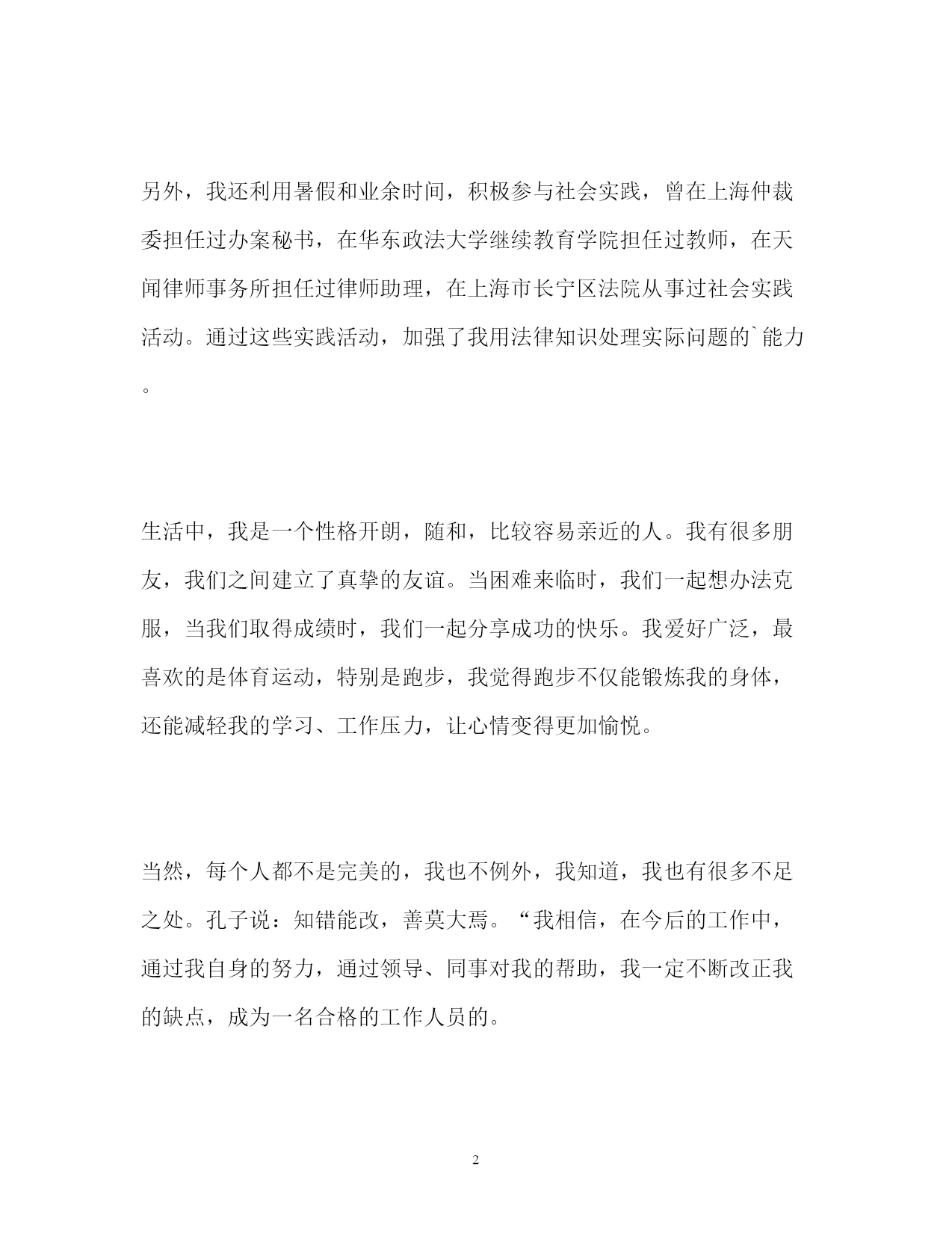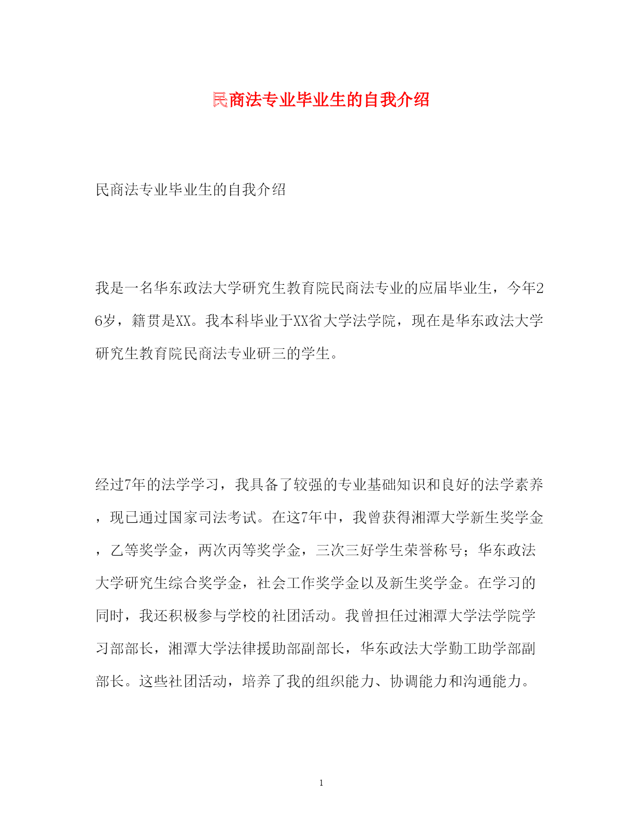 此资料由网络收集而来,如有侵权请告知上传者立即删除。资料共分享,我们负责传递知识。PAGEPAGE2民商法专业毕业生的自我介绍民商法专业毕业生的自我介绍我是一名华东政法大学研究生教育院民商法专业的应届毕业生,今年26岁,籍贯是XX。我本科毕业于XX省大学法学院,现在是华东政法大学研究生教育院民商法专业研三的学生。经过7年的法学学习,我具备了较强的专业基础知识和良好的法学素养,现已通过国家司法考试。在这7年中,我曾获得湘潭大学新生奖学金,乙等奖学金,两次丙等奖学金,三次三好学生荣誉称号;华东政法大学研究生综合奖学金,社会工作奖学金以及新生奖学金。在学习的同时,我还积极参与学校的社团活动。我曾担任过湘潭大学法学院学习部部长,湘潭大学法律援助部副部长,华东政法大学勤工助学部副部长。这些社团活动,培养了我的组织能力、协调能力和沟通能力。另外,我还利用暑假和业余时间,积极参与社会实践,曾在上海仲裁委担任过办案秘书,在华东政法大学继续教育学院担任过教师,在天闻律师事务所担任过律师助理,在上海市长宁区法院从事过社会实践活动。通过这些实践活动,加强了我用法律知识处理实际问题的`能力。生活中,我是一个性格开朗,随和,比较容易亲近的人。我有很多朋友,我们之间建立了真挚的友谊。当困难来临时,我们一起想办法克服,当我们取得成绩时,我们一起分享成功的快乐。我爱好广泛,最喜欢的是体育运动,特别是跑步,我觉得跑步不仅能锻炼我的身体,还能减轻我的学习、工作压力,让心情变得更加愉悦。当然,每个人都不是完美的,我也不例外,我知道,我也有很多不足之处。孔子说:知错能改,善莫大焉。“我相信,在今后的工作中,通过我自身的努力,通过领导、同事对我的帮助,我一定不断改正我的缺点,成为一名合格的工作人员的。