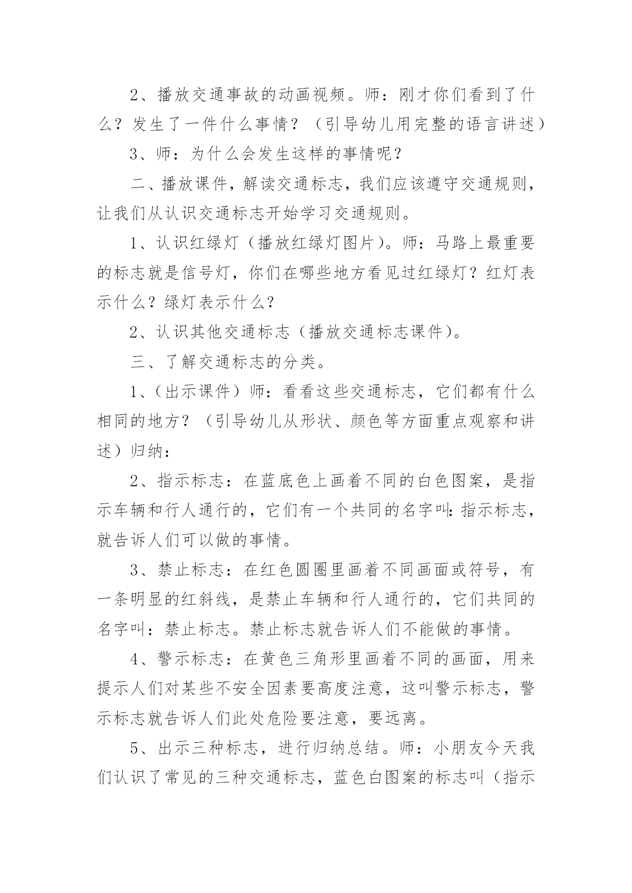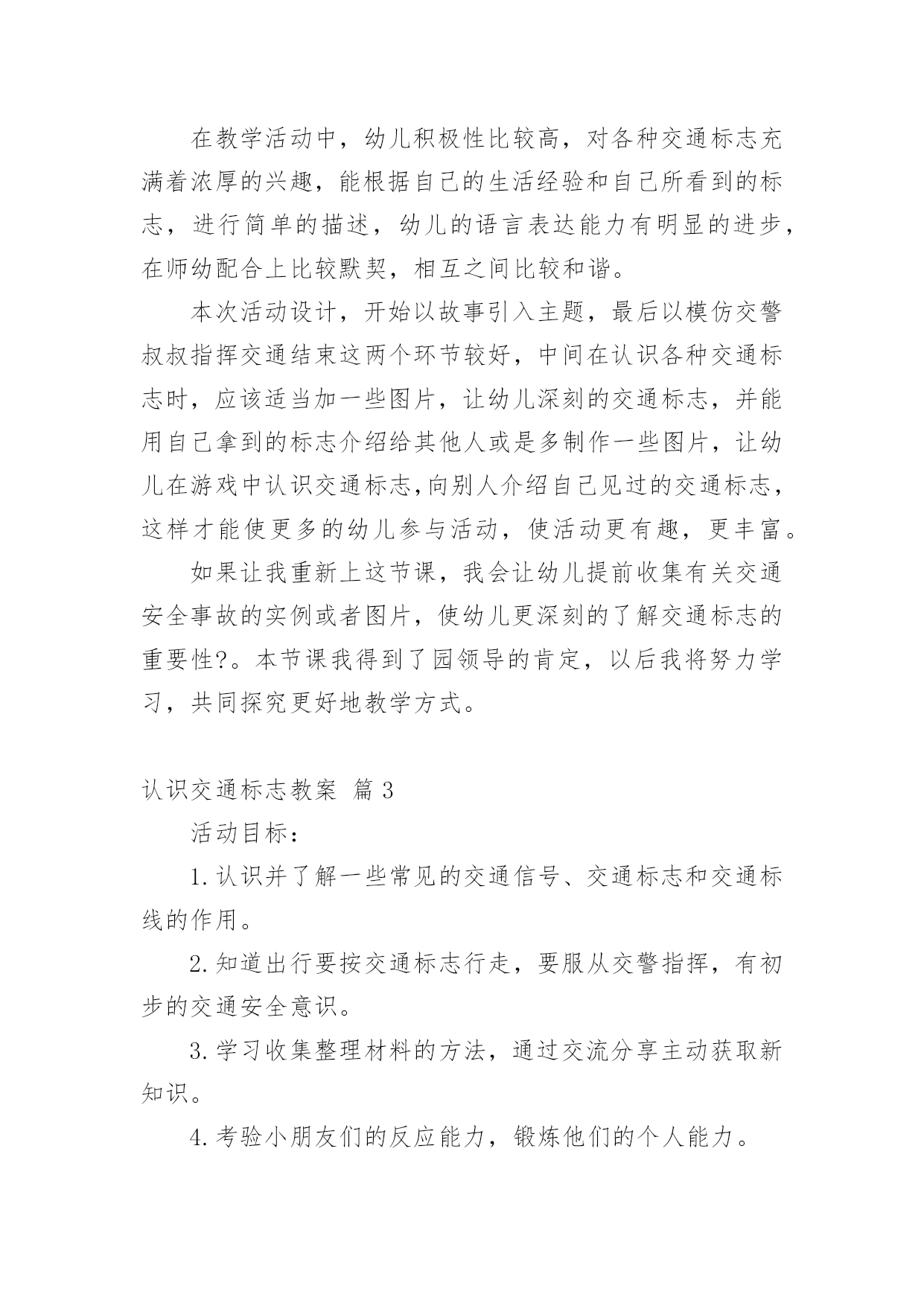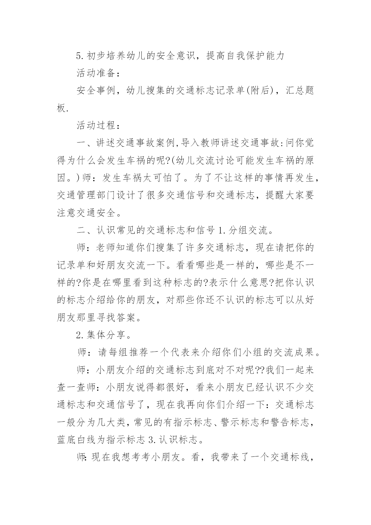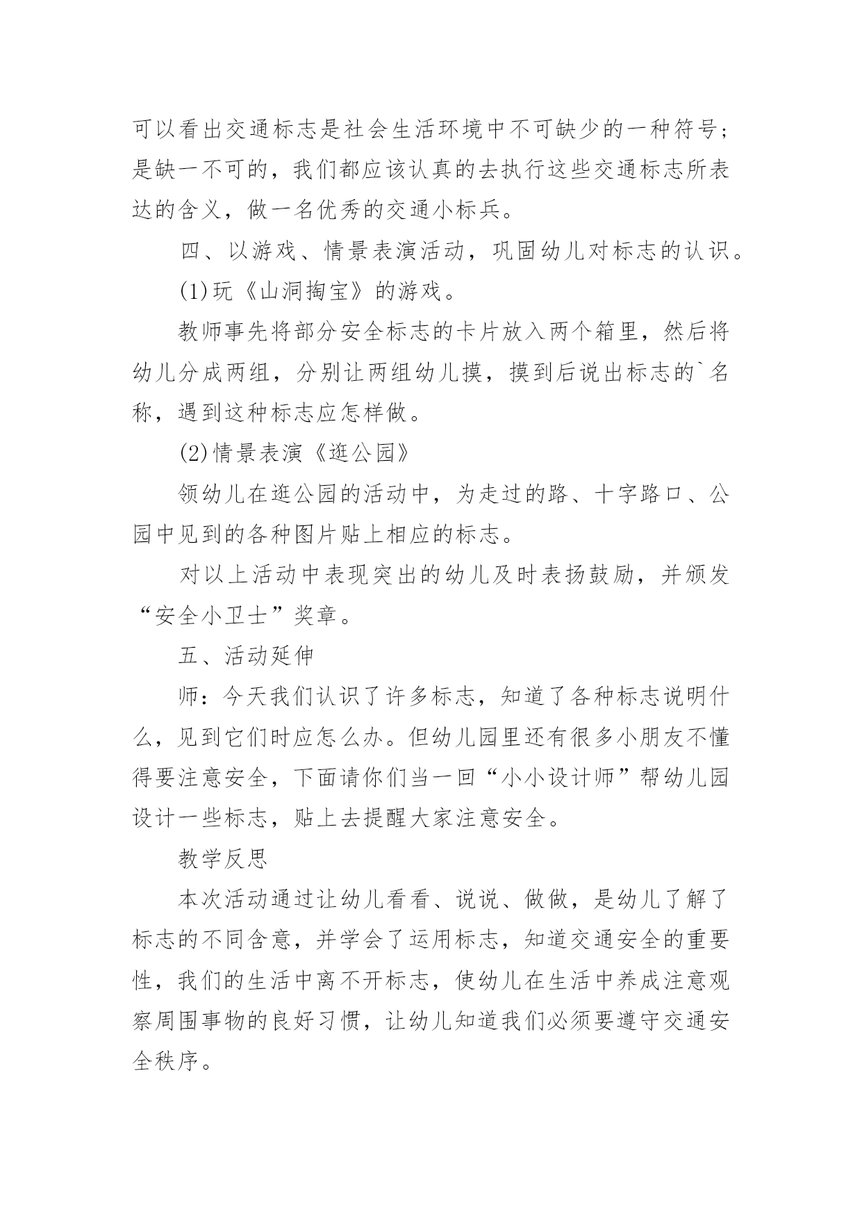 认识交通标志教案认识交通标志教案汇编7篇作为一名人民教师,时常需要编写教案,编写教案有利于我们弄通教材内容,进而选择科学、恰当的教学方法。那么什么样的教案才是好的呢?以下是小编为大家收集的认识交通标志教案8篇,欢迎阅读,希望大家能够喜欢。认识交通标志教案篇1设计背景与幼儿一起看电视,发现一个“交通基地游戏活动”,这个活动有很多交通活动标志,孩子们非常感兴趣,争着说:我见过这个标志;我知道这个是什么标志……根据幼儿的兴趣,我就按教材要求,设计了这个活动。活动目标1、引导幼儿认识更多的交通标志,并了解其意义。2、培养幼儿的观察能力,知道交通标志的特征。3、培养幼儿敏锐的观察能力。4、探索、发现生活中的多样性及特征。5、加强幼儿的安全意识。重点难点培养幼儿的观察能力,知道交通标志的特征及作用。活动准备让幼儿在家搜集各种交通安全标志;教师根据交通标志的分类准备三种颜色的背景。活动过程1、请幼儿自己分类张贴展示搜集的安全标志。2、请幼儿们介绍标志,并说说:“为什么放在不同的地方?”3、请小朋友观察:交通标志有哪些特征?4、请小朋友认识每种交通标志的不用作用。5、相互分享:我们还搜集了哪些标志?6、延伸活动:通过知道标志有提醒人的作用,鼓励幼儿在生活中尝试应用各种标记。教学反思幼儿自己搜集资料,这种学习形式已被大家熟识并常常应用在教学当中,但我们更多的.是关注到他们收集来的材料,而没有引导孩子们关注搜集材料的方法,其实这些方法和途径才是对孩子们今后的自我学习有着非常大的帮助。这一次活动,我在孩子们的讨论中引导他们提升并整理了这些经验,相信对于他们的发展是非常有益的。认识交通标志教案篇2活动目标1、认识常见的交通标志,知道标志是社会生活环境中不可缺少的一种符号。2、了解标志的作用和特征。3、培养幼儿的规则意识,激发幼儿对交通标志的兴趣。4、激发幼儿的想象创造标志,培养幼儿的创造能力。5、使幼儿学会按标志行动。教学重点、难点重点:教幼儿认识部分安全标志,掌握其含义,培养自我保护意识和能力。难点:引导孩子在日常生活中遵守交通规则,较好的处理突发事件,注意安全。活动准备1、教学活动课件,安全图片。2、事先创设好逛公园环节的场景(如马路、十字路口和各种图片)。3、万宝箱两个、幼儿用的小标志若干,幼儿设计标志用的纸笔等材料。4、小老鼠布偶一个。活动过程(活动过程的表述不必详细到将教师、学生的所有对话、活动逐字记录,但是应该把活动的主要环节很清楚地再现,即开始环节、基本环节、结束环节、延伸环节。注:重点表述基本环节)一、故事导入:师:小朋友,今天早上有个小动物委托我们帮他一个忙。到底是谁呢?它又遇到了什么困难呢?我们快一起来看看吧!(师出示布偶表演情景戏)师:前几天小老鼠舒克新买了一辆小汽车,这不今天早上它就开着它的小车来我们威海游玩,但是一进城,它发现我们的马路上到处有着很多它不认识的标志,这些标志它从来没有看见过,也不知道是什么意思,所以它不敢开车进城,只好来请教我们小朋友了!二、认识交通标志(播放课件,引起幼儿兴趣)师:瞧!小老鼠舒克把这些交通标志都给画了下来,我们快一起来看看它们都代表着什么意思吧!课件出示各种交通标志的图片,请幼儿自由发表自己的意见,试着说出这些分别是什么标志,分别代表着什么意思)师:刚才小朋友都说出这些标志的意义,那到底说的对不对呢?曾老师来告诉你吧!(师详细讲解每个交通标志的名称及意义)游戏——我指你说:(教师可指出标志图片,让幼儿说出标志名称及含义,以让幼儿巩固复习)三、交通标志作用大师:现在我们都知道了很多交通工具的意义,那小朋友你们想象一下,如果我们生活中没有了这些交通标志,那会变成什么样子呢?(幼儿自由想象回答)师小结:交通标志在我们的生活中起着重要的作用,如果没有了交通标志,那马路上的车就会随意乱行,没有规则,互不谦让,很容易引起车祸;如果没有交通标志人们就不知道什么是停车场,那车辆就会随意停放,这对我们的行走和生活都会造成很大的影响;如果没有了交通工具,上班的时候马路就会混乱,这样会影响人们的工作的等等,所以我们可以看出交通标志是社会生活环境中不可缺少的一种符号;是缺一不可的,我们都应该认真的去执行这些交通标志所表达的含义,做一名优秀的交通小标兵。四、以游戏、情景表演活动,巩固幼儿对标志的认识。(1)玩《山洞掏宝》的游戏。教师事先将部分安全标志的卡片放入两个箱里,然后将幼儿分成两组,分别让两组幼儿摸,摸到后说出标志的`名称,遇到这种标志应怎样做。(2)情景表演《逛公园》领幼儿在逛公园的活动中,为走过的路、十字路口、公园中见到的各种图片贴上相应的标志。对以上活动中表现突出的幼儿及时表扬鼓励,并颁发“安全小卫士”奖章。五、活动延伸师:今天我们认识了许多标志,知道了各种标志说明什么,见到它们时应怎么办。但幼儿园里