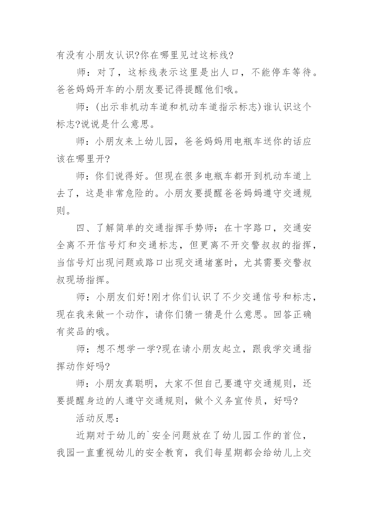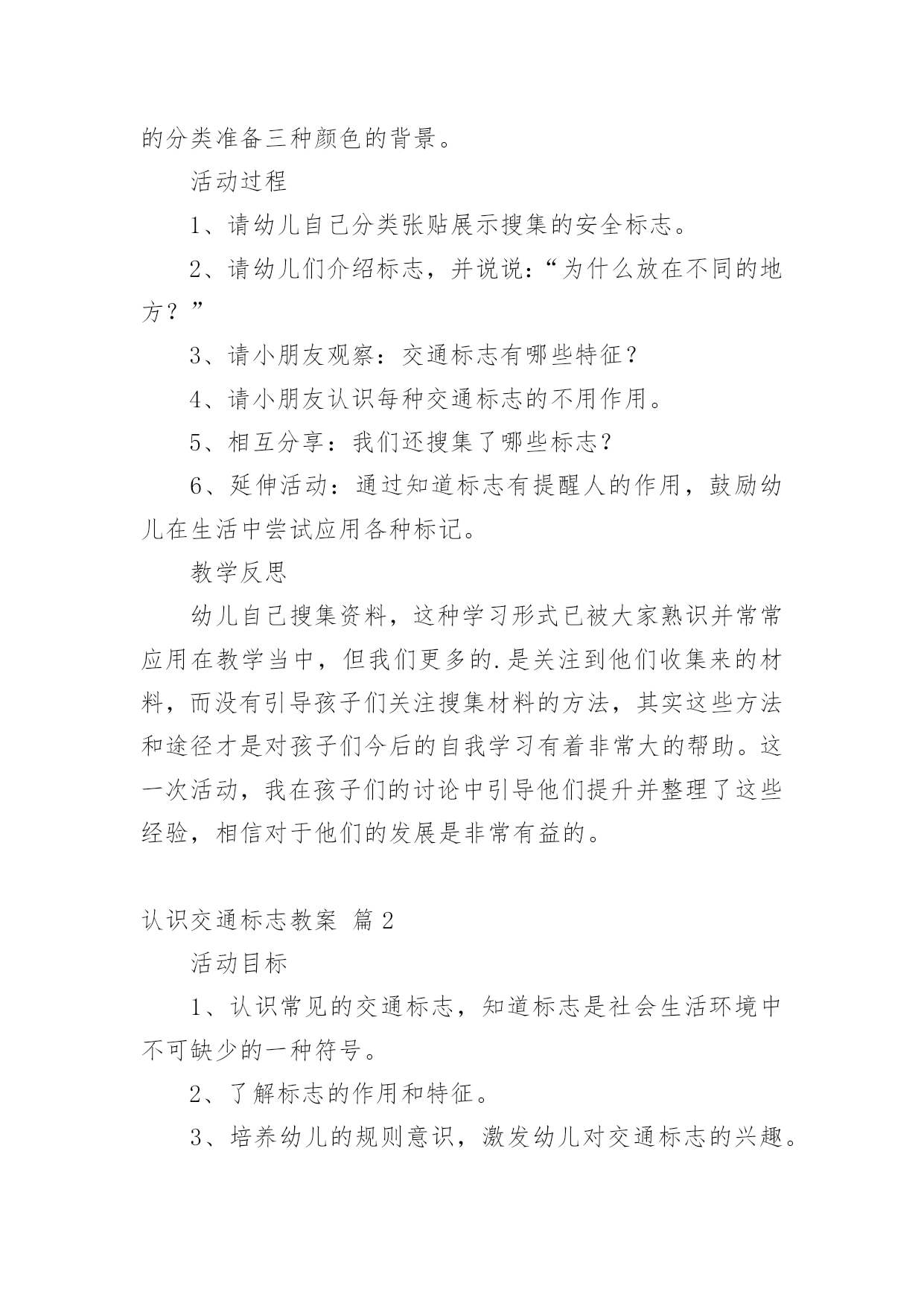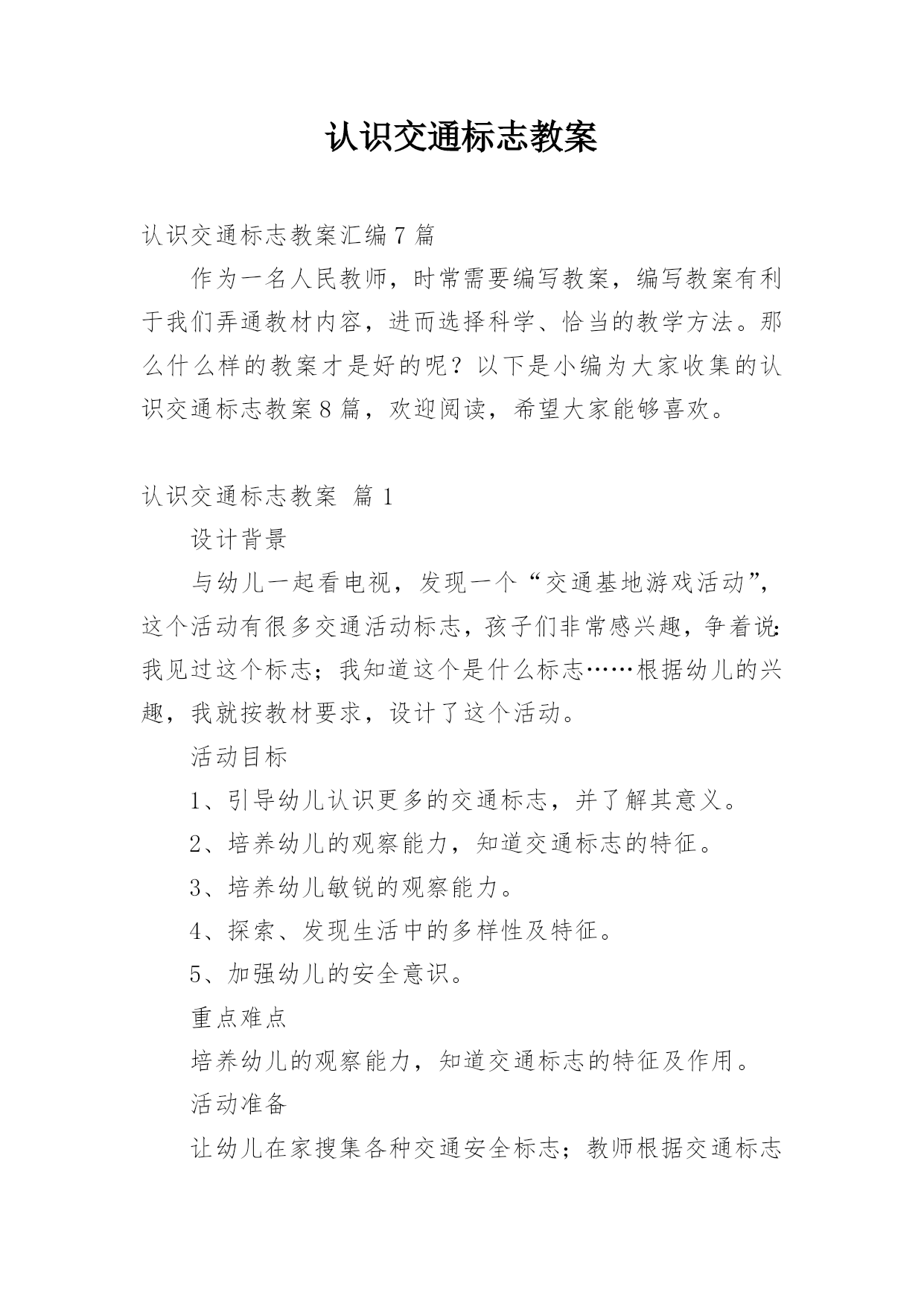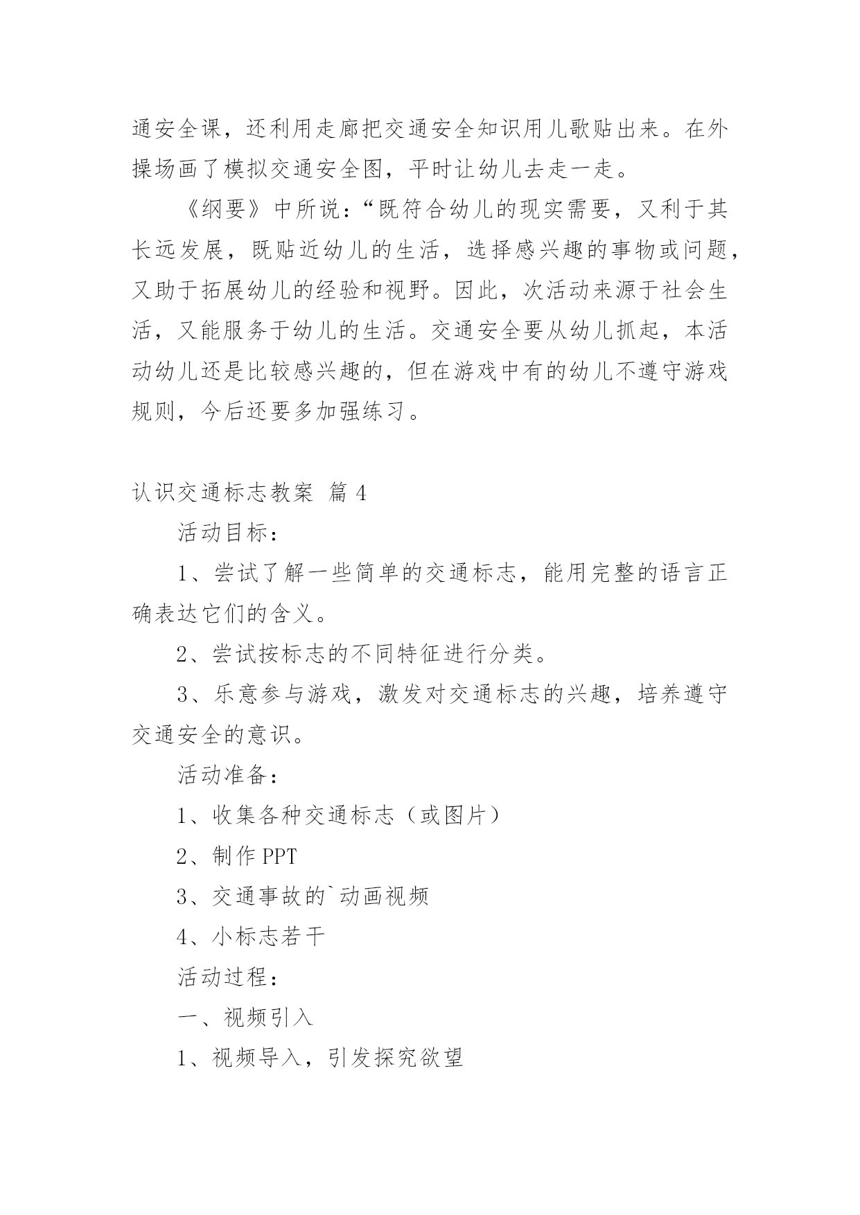 认识交通标志教案认识交通标志教案汇编7篇作为一名人民教师,时常需要编写教案,编写教案有利于我们弄通教材内容,进而选择科学、恰当的教学方法。那么什么样的教案才是好的呢?以下是小编为大家收集的认识交通标志教案8篇,欢迎阅读,希望大家能够喜欢。认识交通标志教案篇1设计背景与幼儿一起看电视,发现一个“交通基地游戏活动”,这个活动有很多交通活动标志,孩子们非常感兴趣,争着说:我见过这个标志;我知道这个是什么标志……根据幼儿的兴趣,我就按教材要求,设计了这个活动。活动目标1、引导幼儿认识更多的交通标志,并了解其意义。2、培养幼儿的观察能力,知道交通标志的特征。3、培养幼儿敏锐的观察能力。4、探索、发现生活中的多样性及特征。5、加强幼儿的安全意识。重点难点培养幼儿的观察能力,知道交通标志的特征及作用。活动准备让幼儿在家搜集各种交通安全标志;教师根据交通标志的分类准备三种颜色的背景。活动过程1、请幼儿自己分类张贴展示搜集的安全标志。2、请幼儿们介绍标志,并说说:“为什么放在不同的地方?”3、请小朋友观察:交通标志有哪些特征?4、请小朋友认识每种交通标志的不用作用。5、相互分享:我们还搜集了哪些标志?6、延伸活动:通过知道标志有提醒人的作用,鼓励幼儿在生活中尝试应用各种标记。教学反思幼儿自己搜集资料,这种学习形式已被大家熟识并常常应用在教学当中,但我们更多的.是关注到他们收集来的材料,而没有引导孩子们关注搜集材料的方法,其实这些方法和途径才是对孩子们今后的自我学习有着非常大的帮助。这一次活动,我在孩子们的讨论中引导他们提升并整理了这些经验,相信对于他们的发展是非常有益的。认识交通标志教案篇2活动目标1、认识常见的交通标志,知道标志是社会生活环境中不可缺少的一种符号。2、了解标志的作用和特征。3、培养幼儿的规则意识,激发幼儿对交通标志的兴趣。4、激发幼儿的想象创造标志,培养幼儿的创造能力。5、使幼儿学会按标志行动。教学重点、难点重点:教幼儿认识部分安全标志,掌握其含义,培养自我保护意识和能力。难点:引导孩子在日常生活中遵守交通规则,较好的处理突发事件,注意安全。活动准备1、教学活动课件,安全图片。2、事先创设好逛公园环节的场景(如马路、十字路口和各种图片)。3、万宝箱两个、幼儿用的小标志若干,幼儿设计标志用的纸笔等材料。4、小老鼠布偶一个。活动过程(活动过程的表述不必详细到将教师、学生的所有对话、活动逐字记录,但是应该把活动的主要环节很清楚地再现,即开始环节、基本环节、结束环节、延伸环节。注:重点表述基本环节)一、故事导入:师:小朋友,今天早上有个小动物委托我们帮他一个忙。到底是谁呢?它又遇到了什么困难呢?我们快一起来看看吧!(师出示布偶表演情景戏)师:前几天小老鼠舒克新买了一辆小汽车,这不今天早上它就开着它的小车来我们威海游玩,但是一进城,它发现我们的马路上到处有着很多它不认识的标志,这些标志它从来没有看见过,也不知道是什么意思,所以它不敢开车进城,只好来请教我们小朋友了!二、认识交通标志(播放课件,引起幼儿兴趣)师:瞧!小老鼠舒克把这些交通标志都给画了下来,我们快一起来看看它们都代表着什么意思吧!课件出示各种交通标志的图片,请幼儿自由发表自己的意见,试着说出这些分别是什么标志,分别代表着什么意思)师:刚才小朋友都说出这些标志的意义,那到底说的对不对呢?曾老师来告诉你吧!(师详细讲解每个交通标志的名称及意义)游戏——我指你说:(教师可指出标志图片,让幼儿说出标志名称及含义,以让幼儿巩固复习)三、交通标志作用大师:现在我们都知道了很多交通工具的意义,那小朋友你们想象一下,如果我们生活中没有了这些交通标志,那会变成什么样子呢?(幼儿自由想象回答)师小结:交通标志在我们的生活中起着重要的作用,如果没有了交通标志,那马路上的车就会随意乱行,没有规则,互不谦让,很容易引起车祸;如果没有交通标志人们就不知道什么是停车场,那车辆就会随意停放,这对我们的行走和生活都会造成很大的影响;如果没有了交通工具,上班的时候马路就会混乱,这样会影响人们的工作的等等,所以我们可以看出交通标志是社会生活环境中不可缺少的一种符号;是缺一不可的,我们都应该认真的去执行这些交通标志所表达的含义,做一名优秀的交通小标兵。四、以游戏、情景表演活动,巩固幼儿对标志的认识。(1)玩《山洞掏宝》的游戏。教师事先将部分安全标志的卡片放入两个箱里,然后将幼儿分成两组,分别让两组幼儿摸,摸到后说出标志的`名称,遇到这种标志应怎样做。(2)情景表演《逛公园》领幼儿在逛公园的活动中,为走过的路、十字路口、公园中见到的各种图片贴上相应的标志。对以上活动中表现突出的幼儿及时表扬鼓励,并颁发“安全小卫士”奖章。五、活动延伸师:今天我们认识了许多标志,知道了各种标志说明什么,见到它们时应怎么办。但幼儿园里