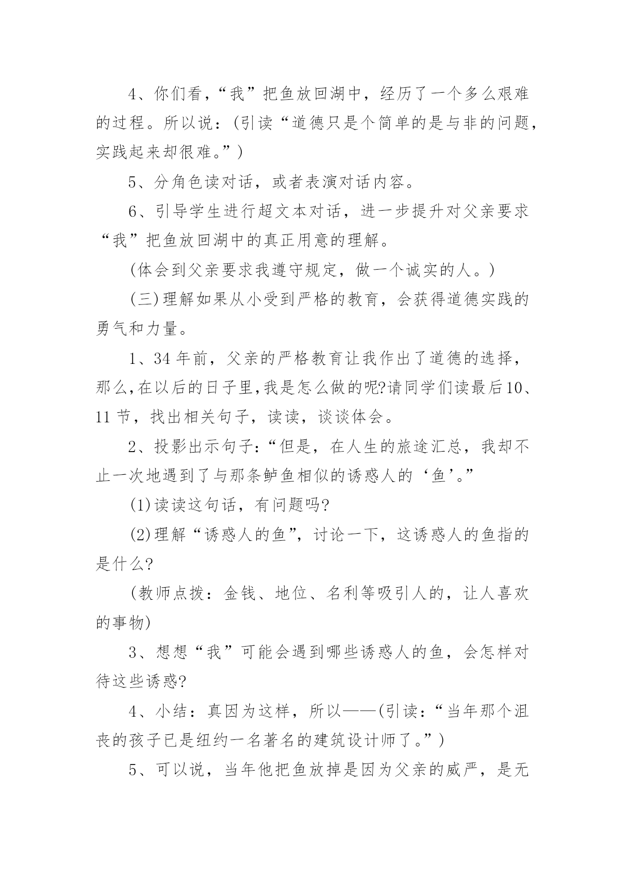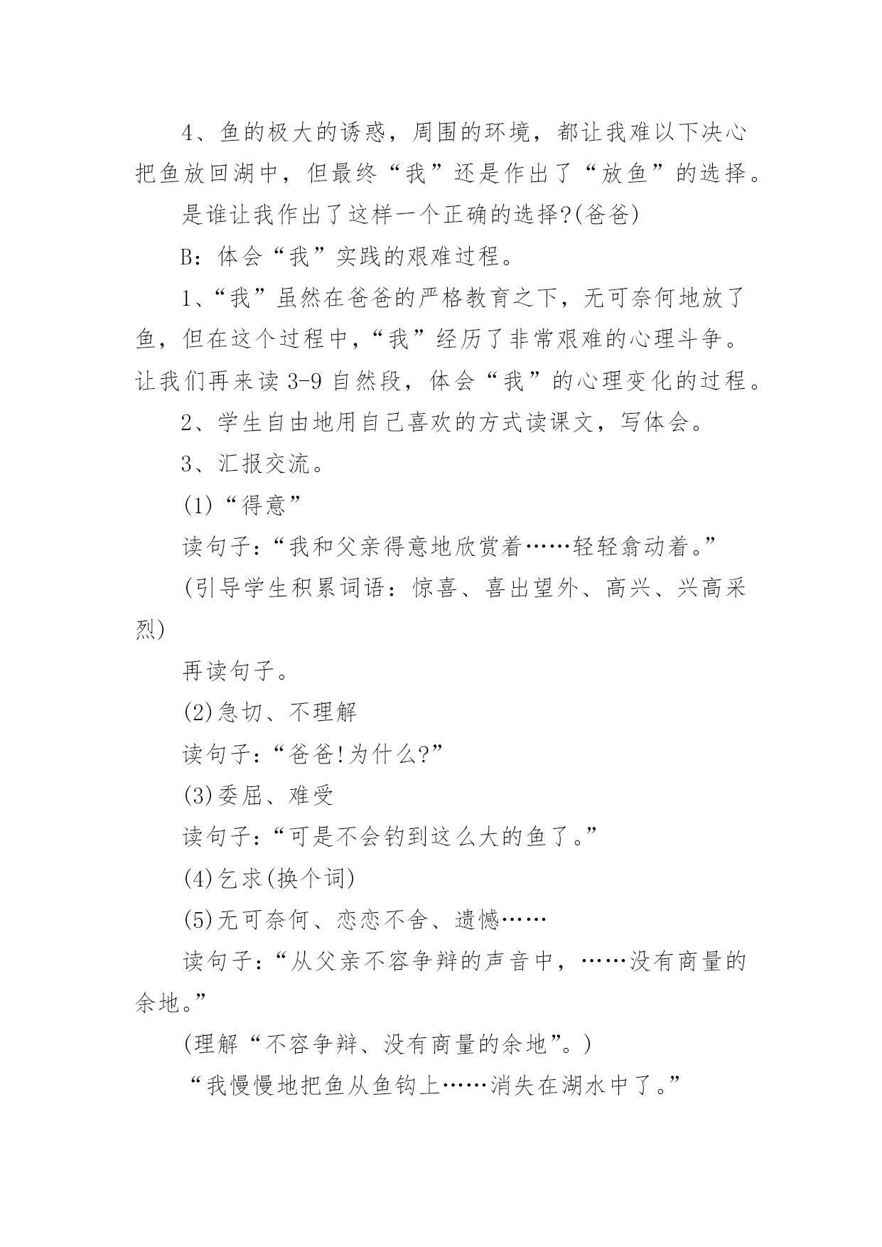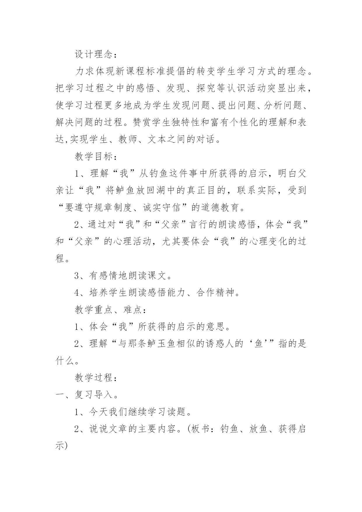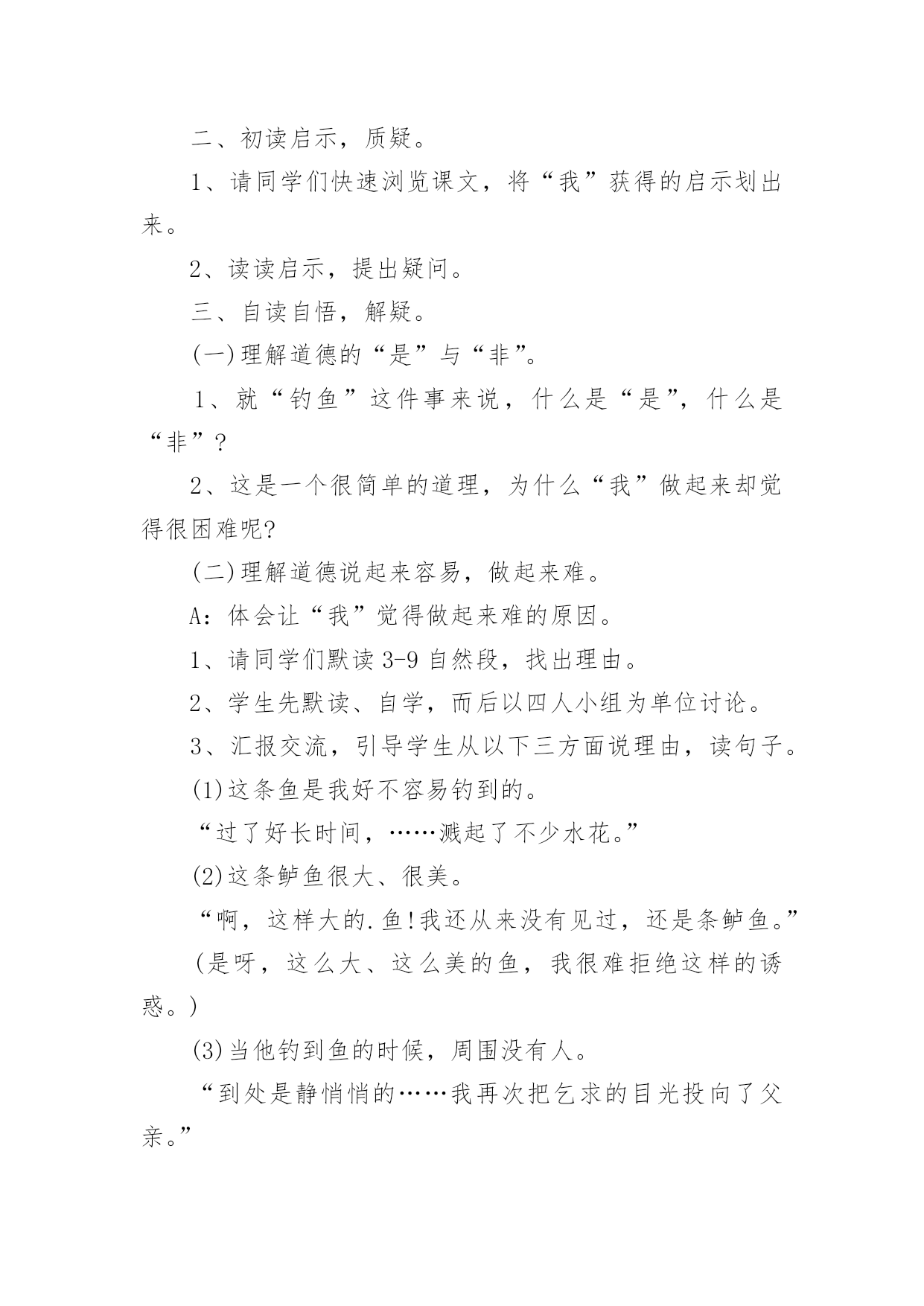 《钓鱼的启示》的教学设计在教学工作者开展教学活动前,就难以避免地要准备教学设计,借助教学设计可以让教学工作更加有效地进行。教学设计应该怎么写才好呢?以下是小编为大家收集的《钓鱼的启示》的教学设计,欢迎大家借鉴与参考,希望对大家有所帮助。《钓鱼的启示》的教学设计1教材分析:这篇课文回忆了34年前,鲈鱼捕捞开放日的前一个傍晚,“我”和父亲去钓鱼,“我”把鲈鱼放回湖里,使“我”从中获得终身启示的事,说明从小受到严格的教育,就会获得道德实践的勇气和力量。课文是按事情发展的顺序记叙的;从钓鱼到放鱼,最后写34年后的启示。最后一部分既是教学的重点,也是难点。大量细致入微的心理活动描写,是本文在表达上的一个特点。而理解课文的重、难点,就要从人物的心理活动及变化着手。学情分析:钓鱼获得的启示,是学生理解的难点。围绕启示,教师要鼓励学生提出问题、引导学生探究问题、解决问题。诱惑人的“鱼“指的是什么,是学生学习的又一难点。由于学生的年龄、经历的局限,领会起来很难。教师可以适当点拨,引导学生讨论、联系实际来理解。设计理念:力求体现新课程标准提倡的转变学生学习方式的理念。把学习过程之中的感悟、发现、探究等认识活动突显出来,使学习过程更多地成为学生发现问题、提出问题、分析问题、解决问题的过程。赞赏学生独特性和富有个性化的理解和表达,实现学生、教师、文本之间的对话。教学目标:1、理解“我”从钓鱼这件事中所获得的启示,明白父亲让“我”将鲈鱼放回湖中的真正目的,联系实际,受到“要遵守规章制度、诚实守信”的道德教育。2、通过对“我”和“父亲”言行的朗读感悟,体会“我”和“父亲”的心理活动,尤其要体会“我”的心理变化的过程。3、有感情地朗读课文。4、培养学生朗读感悟能力、合作精神。教学重点、难点:1、体会“我”所获得的启示的意思。2、理解“与那条鲈玉鱼相似的诱惑人的‘鱼’”指的是什么。教学过程:一、复习导入。1、今天我们继续学习读题。2、说说文章的主要内容。(板书:钓鱼、放鱼、获得启示)二、初读启示,质疑。1、请同学们快速浏览课文,将“我”获得的启示划出来。2、读读启示,提出疑问。三、自读自悟,解疑。(一)理解道德的“是”与“非”。1、就“钓鱼”这件事来说,什么是“是”,什么是“非”?2、这是一个很简单的道理,为什么“我”做起来却觉得很困难呢?(二)理解道德说起来容易,做起来难。A:体会让“我”觉得做起来难的原因。1、请同学们默读3-9自然段,找出理由。2、学生先默读、自学,而后以四人小组为单位讨论。3、汇报交流,引导学生从以下三方面说理由,读句子。(1)这条鱼是我好不容易钓到的。“过了好长时间,……溅起了不少水花。”(2)这条鲈鱼很大、很美。“啊,这样大的.鱼!我还从来没有见过,还是条鲈鱼。”(是呀,这么大、这么美的鱼,我很难拒绝这样的诱惑。)(3)当他钓到鱼的时候,周围没有人。“到处是静悄悄的……我再次把乞求的目光投向了父亲。”4、鱼的极大的诱惑,周围的环境,都让我难以下决心把鱼放回湖中,但最终“我”还是作出了“放鱼”的选择。是谁让我作出了这样一个正确的选择?(爸爸)B:体会“我”实践的艰难过程。1、“我”虽然在爸爸的严格教育之下,无可奈何地放了鱼,但在这个过程中,“我”经历了非常艰难的心理斗争。让我们再来读3-9自然段,体会“我”的心理变化的过程。2、学生自由地用自己喜欢的方式读课文,写体会。3、汇报交流。(1)“得意”读句子:“我和父亲得意地欣赏着……轻轻翕动着。”(引导学生积累词语:惊喜、喜出望外、高兴、兴高采烈)再读句子。(2)急切、不理解读句子:“爸爸!为什么?”(3)委屈、难受读句子:“可是不会钓到这么大的鱼了。”(4)乞求(换个词)(5)无可奈何、恋恋不舍、遗憾……读句子:“从父亲不容争辩的声音中,……没有商量的余地。”(理解“不容争辩、没有商量的余地”。)“我慢慢地把鱼从鱼钩上……消失在湖水中了。”4、你们看,“我”把鱼放回湖中,经历了一个多么艰难的过程。所以说:(引读“道德只是个简单的是与非的问题,实践起来却很难。”)5、分角色读对话,或者表演对话内容。6、引导学生进行超文本对话,进一步提升对父亲要求“我”把鱼放回湖中的真正用意的理解。(体会到父亲要求我遵守规定,做一个诚实的人。)(三)理解如果从小受到严格的教育,会获得道德实践的勇气和力量。1、34年前,父亲的严格教育让我作出了道德的选择,那么,在以后的日子里,我是怎么做的呢?请同学们读最后10、11节,找出相关句子,读读,谈谈体会。2、投影出示句子:“但是,在人生的旅途汇总,我却不止一次地遇到了与那条鲈鱼相似的诱惑人的‘鱼’。”(1)读读这句话,有问题吗?(2)理解“诱惑人的鱼”,讨论一下,这诱惑人的鱼指的是什么?(教师点拨:金钱、地位、名利等吸引人的,让人喜欢的事物)3、想想“我”