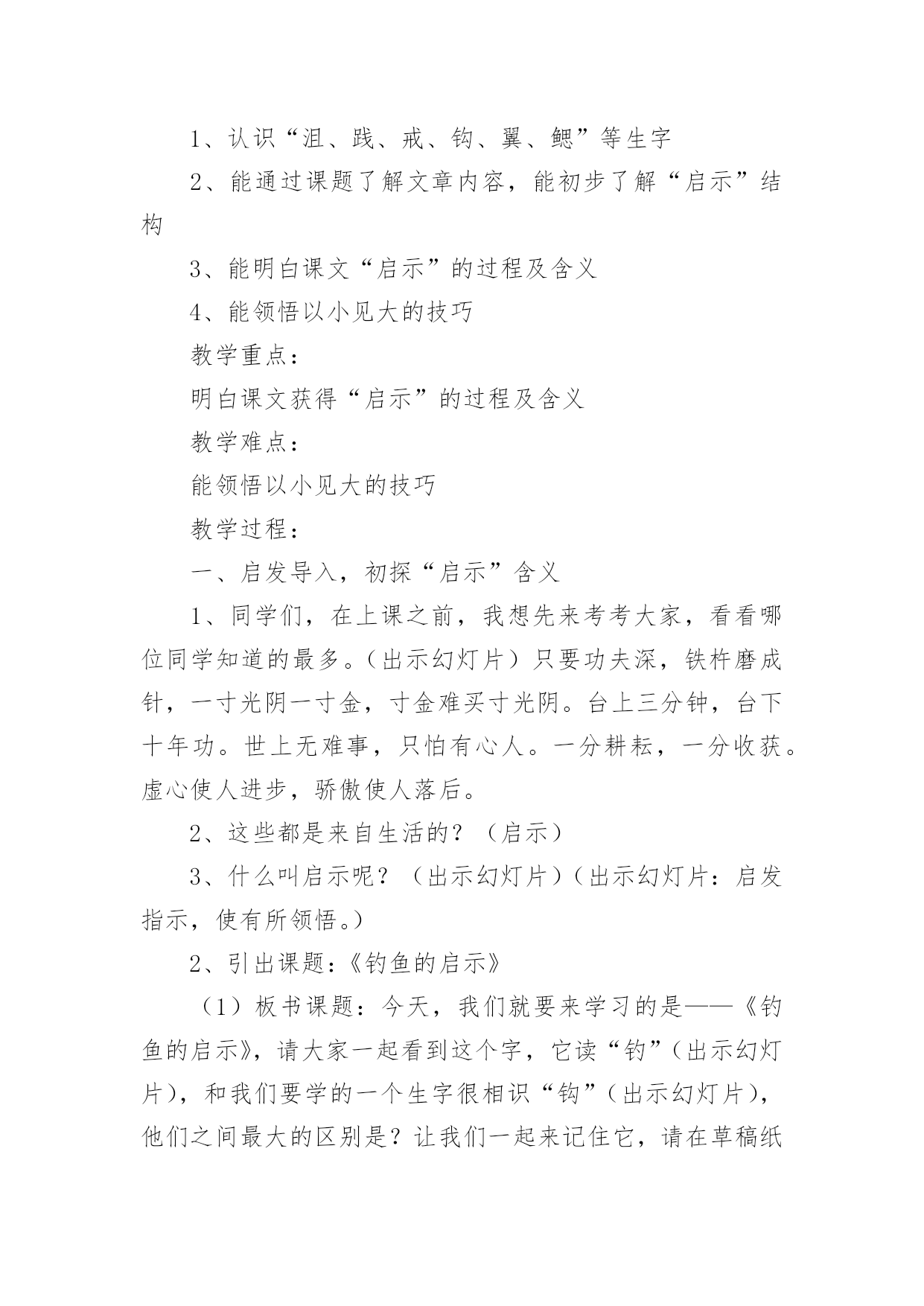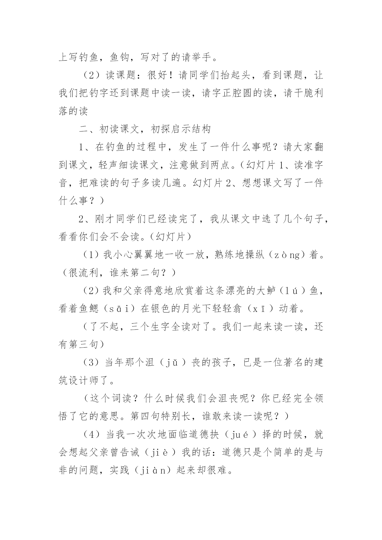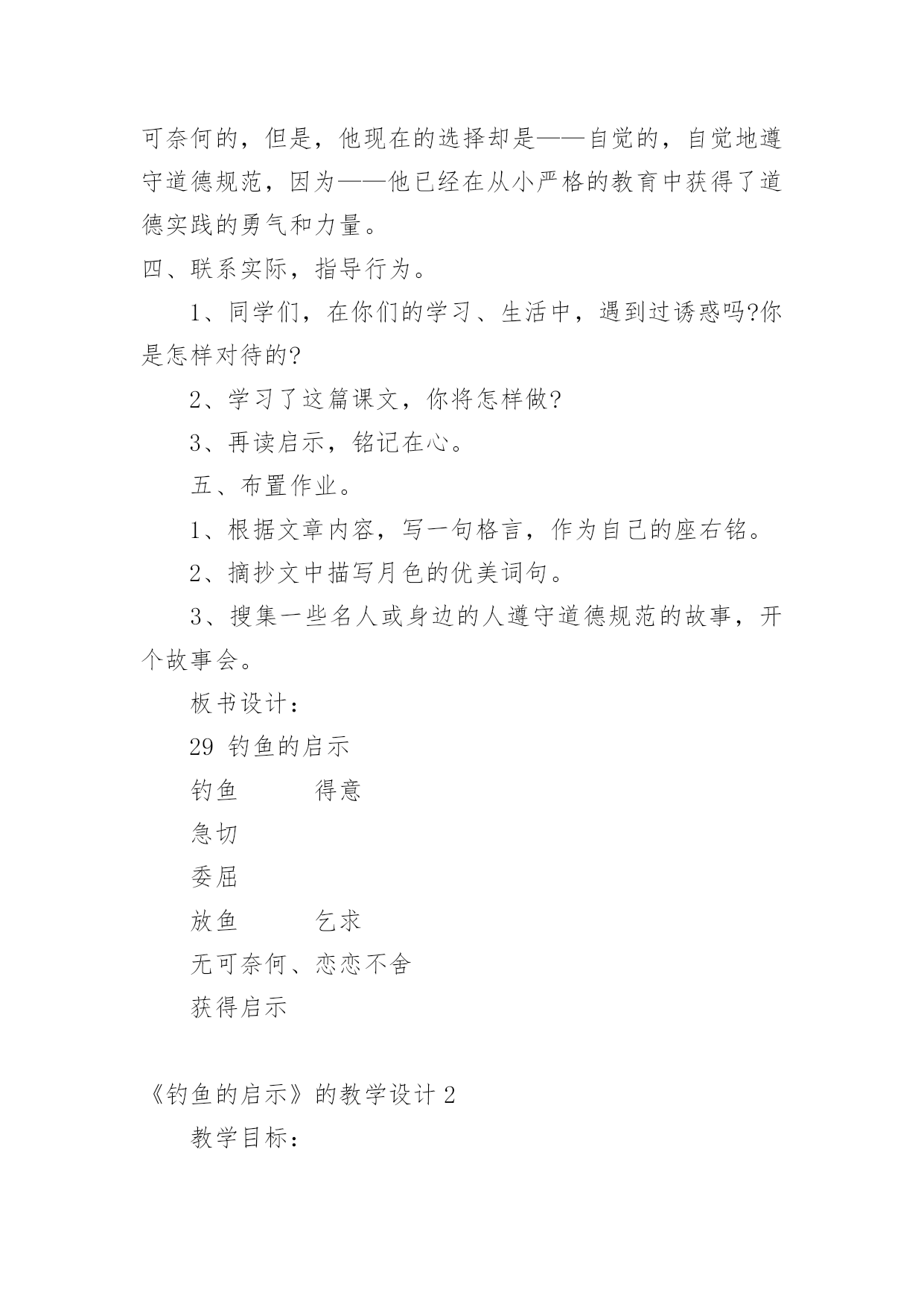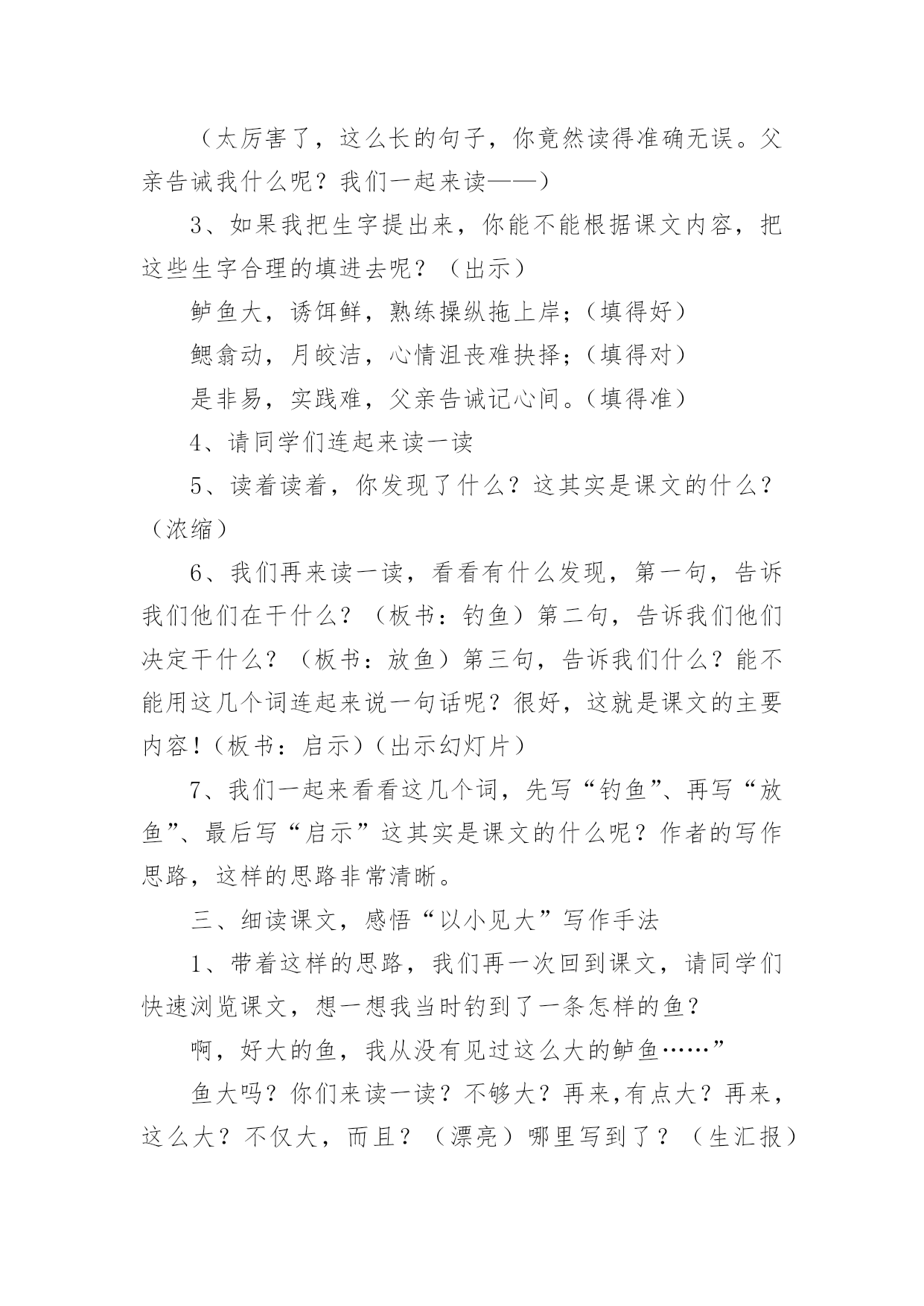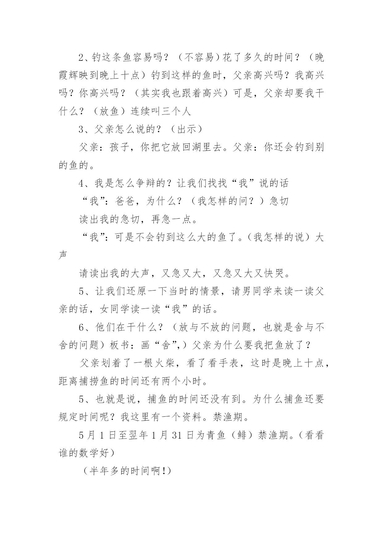 《钓鱼的启示》的教学设计在教学工作者开展教学活动前,就难以避免地要准备教学设计,借助教学设计可以让教学工作更加有效地进行。教学设计应该怎么写才好呢?以下是小编为大家收集的《钓鱼的启示》的教学设计,欢迎大家借鉴与参考,希望对大家有所帮助。《钓鱼的启示》的教学设计1教材分析:这篇课文回忆了34年前,鲈鱼捕捞开放日的前一个傍晚,“我”和父亲去钓鱼,“我”把鲈鱼放回湖里,使“我”从中获得终身启示的事,说明从小受到严格的教育,就会获得道德实践的勇气和力量。课文是按事情发展的顺序记叙的;从钓鱼到放鱼,最后写34年后的启示。最后一部分既是教学的重点,也是难点。大量细致入微的心理活动描写,是本文在表达上的一个特点。而理解课文的重、难点,就要从人物的心理活动及变化着手。学情分析:钓鱼获得的启示,是学生理解的难点。围绕启示,教师要鼓励学生提出问题、引导学生探究问题、解决问题。诱惑人的“鱼“指的是什么,是学生学习的又一难点。由于学生的年龄、经历的局限,领会起来很难。教师可以适当点拨,引导学生讨论、联系实际来理解。设计理念:力求体现新课程标准提倡的转变学生学习方式的理念。把学习过程之中的感悟、发现、探究等认识活动突显出来,使学习过程更多地成为学生发现问题、提出问题、分析问题、解决问题的过程。赞赏学生独特性和富有个性化的理解和表达,实现学生、教师、文本之间的对话。教学目标:1、理解“我”从钓鱼这件事中所获得的启示,明白父亲让“我”将鲈鱼放回湖中的真正目的,联系实际,受到“要遵守规章制度、诚实守信”的道德教育。2、通过对“我”和“父亲”言行的朗读感悟,体会“我”和“父亲”的心理活动,尤其要体会“我”的心理变化的过程。3、有感情地朗读课文。4、培养学生朗读感悟能力、合作精神。教学重点、难点:1、体会“我”所获得的启示的意思。2、理解“与那条鲈玉鱼相似的诱惑人的‘鱼’”指的是什么。教学过程:一、复习导入。1、今天我们继续学习读题。2、说说文章的主要内容。(板书:钓鱼、放鱼、获得启示)二、初读启示,质疑。1、请同学们快速浏览课文,将“我”获得的启示划出来。2、读读启示,提出疑问。三、自读自悟,解疑。(一)理解道德的“是”与“非”。1、就“钓鱼”这件事来说,什么是“是”,什么是“非”?2、这是一个很简单的道理,为什么“我”做起来却觉得很困难呢?(二)理解道德说起来容易,做起来难。A:体会让“我”觉得做起来难的原因。1、请同学们默读3-9自然段,找出理由。2、学生先默读、自学,而后以四人小组为单位讨论。3、汇报交流,引导学生从以下三方面说理由,读句子。(1)这条鱼是我好不容易钓到的。“过了好长时间,……溅起了不少水花。”(2)这条鲈鱼很大、很美。“啊,这样大的.鱼!我还从来没有见过,还是条鲈鱼。”(是呀,这么大、这么美的鱼,我很难拒绝这样的诱惑。)(3)当他钓到鱼的时候,周围没有人。“到处是静悄悄的……我再次把乞求的目光投向了父亲。”4、鱼的极大的诱惑,周围的环境,都让我难以下决心把鱼放回湖中,但最终“我”还是作出了“放鱼”的选择。是谁让我作出了这样一个正确的选择?(爸爸)B:体会“我”实践的艰难过程。1、“我”虽然在爸爸的严格教育之下,无可奈何地放了鱼,但在这个过程中,“我”经历了非常艰难的心理斗争。让我们再来读3-9自然段,体会“我”的心理变化的过程。2、学生自由地用自己喜欢的方式读课文,写体会。3、汇报交流。(1)“得意”读句子:“我和父亲得意地欣赏着……轻轻翕动着。”(引导学生积累词语:惊喜、喜出望外、高兴、兴高采烈)再读句子。(2)急切、不理解读句子:“爸爸!为什么?”(3)委屈、难受读句子:“可是不会钓到这么大的鱼了。”(4)乞求(换个词)(5)无可奈何、恋恋不舍、遗憾……读句子:“从父亲不容争辩的声音中,……没有商量的余地。”(理解“不容争辩、没有商量的余地”。)“我慢慢地把鱼从鱼钩上……消失在湖水中了。”4、你们看,“我”把鱼放回湖中,经历了一个多么艰难的过程。所以说:(引读“道德只是个简单的是与非的问题,实践起来却很难。”)5、分角色读对话,或者表演对话内容。6、引导学生进行超文本对话,进一步提升对父亲要求“我”把鱼放回湖中的真正用意的理解。(体会到父亲要求我遵守规定,做一个诚实的人。)(三)理解如果从小受到严格的教育,会获得道德实践的勇气和力量。1、34年前,父亲的严格教育让我作出了道德的选择,那么,在以后的日子里,我是怎么做的呢?请同学们读最后10、11节,找出相关句子,读读,谈谈体会。2、投影出示句子:“但是,在人生的旅途汇总,我却不止一次地遇到了与那条鲈鱼相似的诱惑人的‘鱼’。”(1)读读这句话,有问题吗?(2)理解“诱惑人的鱼”,讨论一下,这诱惑人的鱼指的是什么?(教师点拨:金钱、地位、名利等吸引人的,让人喜欢的事物)3、想想“我”