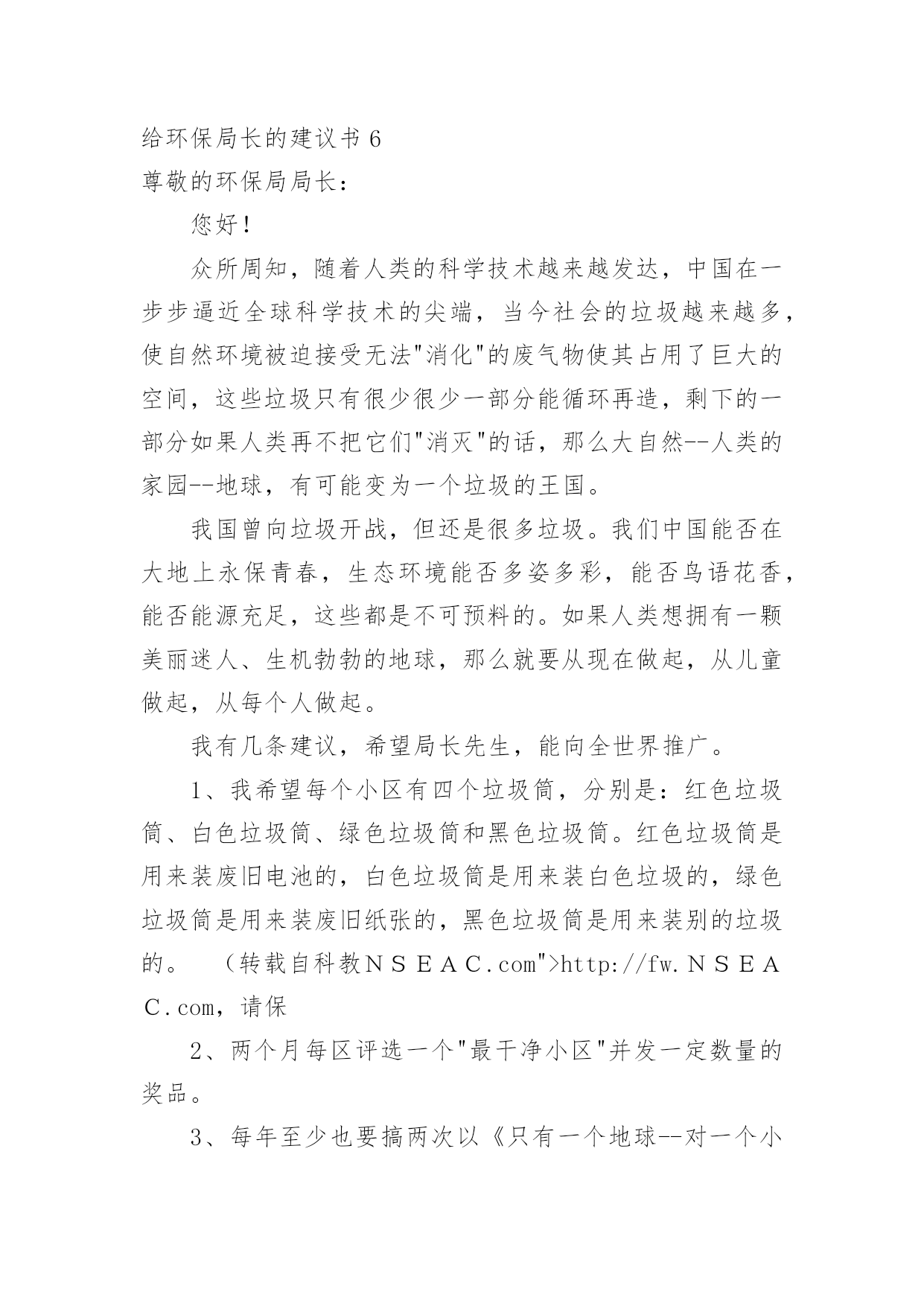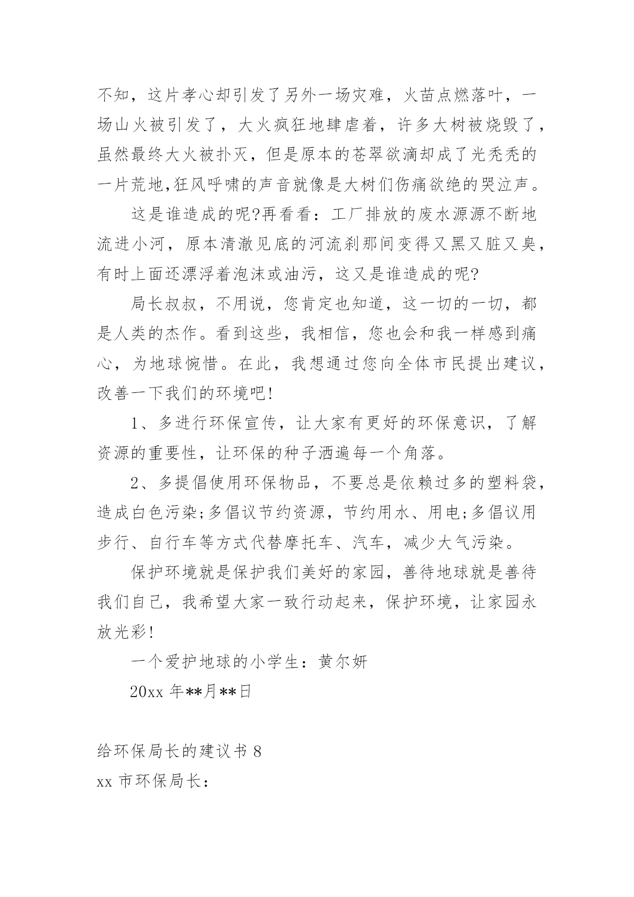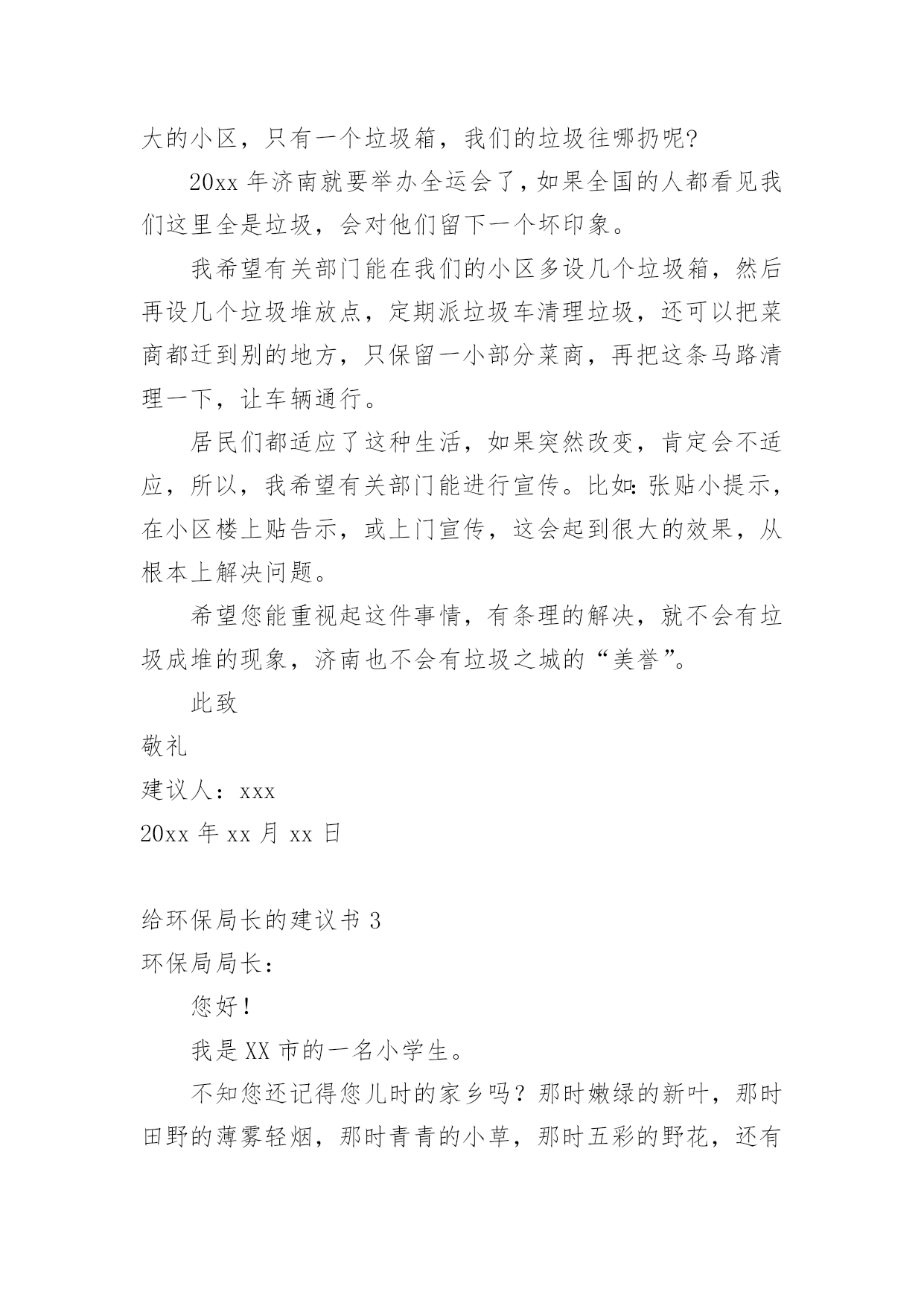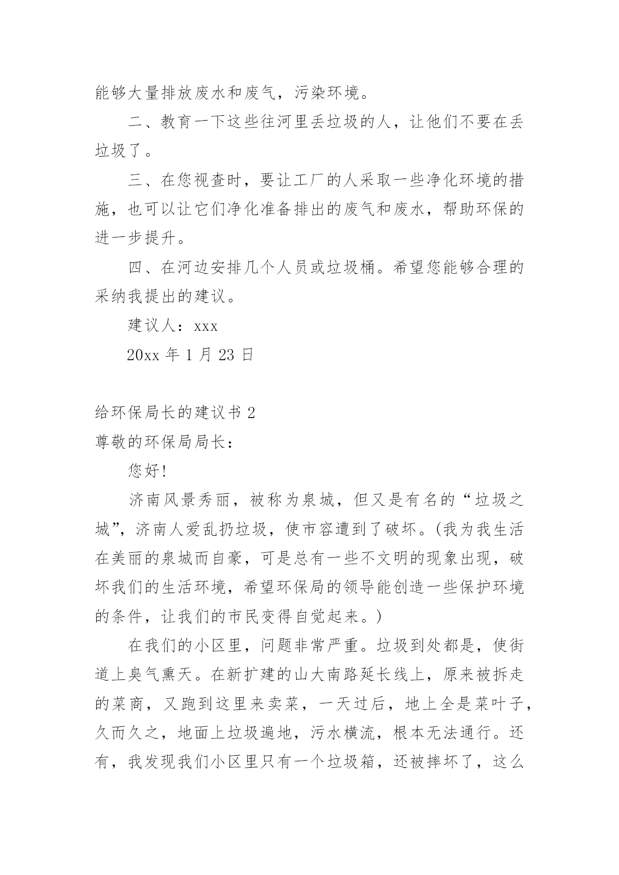 给环保局长的建议书在当今社会生活中,我们可以使用建议书的机会越来越多,建议书是面对有关部门或上级领导提建议时使用的一种书面材料,具有较强的文本性特点。还是对建议书一筹莫展吗?下面是小编精心整理的给环保局长的建议书,欢迎阅读,希望大家能够喜欢。给环保局长的建议书1尊敬的环保局长:您好!在我们这个城市中,有不少污染环境的现象。这个美丽的荆门,被可恶的垃圾一点点地玷污着。人们只要来到苏板桥菜市场都会捂着鼻子过去,许多人都已经把它称作最恶心的菜市场,只要从那里走过,就要停止呼吸,否则,稍一吸气,就会被桥上的臭味熏得直皱眉头。为什么会这么臭?原来,那里的烂菜叶成堆,还有鱼和肉的腥味,再加上它附近盖了几座工厂,工厂里一生产新的东西就要排放废气,这样一来,苏板桥菜市场就遭殃了,工厂一排废气,它这里就被弄得臭气熏天。几十米外都能闻到这种熏人的臭气,弄得旁边的居民不得不关上正在通风的窗户。还有我们的护城河竹皮河被严重污染,旁边的工厂不加节制的排放污水,再加上周边的居民随意的往河里丢垃圾。使河里到处都有垃圾。针对以上几问题,我想对您提出一下:一、请您严查这些工厂。至少每个月查一次,使它们不能够大量排放废水和废气,污染环境。二、教育一下这些往河里丢垃圾的人,让他们不要在丢垃圾了。三、在您视查时,要让工厂的人采取一些净化环境的措施,也可以让它们净化准备排出的废气和废水,帮助环保的进一步提升。四、在河边安排几个人员或垃圾桶。希望您能够合理的采纳我提出的建议。建议人:xxx20xx年1月23日给环保局长的建议书2尊敬的环保局局长:您好!济南风景秀丽,被称为泉城,但又是有名的“垃圾之城”,济南人爱乱扔垃圾,使市容遭到了破坏。(我为我生活在美丽的泉城而自豪,可是总有一些不文明的现象出现,破坏我们的生活环境,希望环保局的领导能创造一些保护环境的条件,让我们的市民变得自觉起来。)在我们的小区里,问题非常严重。垃圾到处都是,使街道上臭气熏天。在新扩建的山大南路延长线上,原来被拆走的菜商,又跑到这里来卖菜,一天过后,地上全是菜叶子,久而久之,地面上垃圾遍地,污水横流,根本无法通行。还有,我发现我们小区里只有一个垃圾箱,还被摔坏了,这么大的小区,只有一个垃圾箱,我们的垃圾往哪扔呢?20xx年济南就要举办全运会了,如果全国的人都看见我们这里全是垃圾,会对他们留下一个坏印象。我希望有关部门能在我们的小区多设几个垃圾箱,然后再设几个垃圾堆放点,定期派垃圾车清理垃圾,还可以把菜商都迁到别的地方,只保留一小部分菜商,再把这条马路清理一下,让车辆通行。居民们都适应了这种生活,如果突然改变,肯定会不适应,所以,我希望有关部门能进行宣传。比如:张贴小提示,在小区楼上贴告示,或上门宣传,这会起到很大的效果,从根本上解决问题。希望您能重视起这件事情,有条理的解决,就不会有垃圾成堆的现象,济南也不会有垃圾之城的“美誉”。此致敬礼建议人:xxx20xx年xx月xx日给环保局长的建议书3环保局局长:您好!我是XX市的一名小学生。不知您还记得您儿时的家乡吗?那时嫩绿的新叶,那时田野的薄雾轻烟,那时青青的小草,那时五彩的野花,还有那时清澈的清泉……现在,还有吗?听妈妈说,她儿时的河水清粼粼的,如丝绸般滑过。河面上的小石头和水相交,发出潺潺的流水声。新生的河泥在清澈的水面上,被阳光照射出另一番景象,每一面都是大自然赋予的生机。里面的小鱼、小虾、小蝌蚪……数不胜数。夏天,随时可以捧水喝,想在里边游泳,丝毫不用考虑就可以跃进水中。而我们现在,还行吗?环境污染越来越严重,附近的工厂都将废水排进河里;一个个路人都将手中吃完的零食袋,水果核扔进河里……河中经常看到鱼虾的尸体和垃圾,连活蹦乱跳的小动物一个个都不见了踪影。不要认为这没什么大不了,地球上的水资源也是有限的!环保局局长,为了让我们的地球变得更加美好,为了让小动物有有美好的家园,我提出了以下几点建议:1、阻止附近的工厂将废水排进河中。2、在河边写上禁止丢垃圾的标牌。3、定时去检查水的污染程度,并作出措施。4、从其它河中移过来一些鱼苗饲养。小鱼、小虾、小蝌蚪是河水的朋友,我们污染了环境不仅夺走了它的朋友,同时也伤害了人类自己。为了大家,我们应该一起行动起来,保护河水。建议人xxxxx年5月4日给环保局长的建议书4尊敬的环保局局长:我是莒南县实验中学初一的学生王鲁平。我们莒南县实验中学坐落在山东福瑞酒厂的北面。每天,由于生产商品,山东福瑞酒厂要排放很多废气,我们的教室坐北朝南,窗子正好对着南边的福瑞酒厂,如果南风一吹,那些看不见的废气携带着刺鼻的气味就进了教室,我们就赶紧关窗户。还有,酒厂排放了许多废水,污染了河流,影响了庄稼的灌溉和渔业的发展。为了能使莒南人民身体健康,家乡的农业得到发展,在这里,我向您提几项建议:1、让福瑞酒厂的工作人员把每天排放的