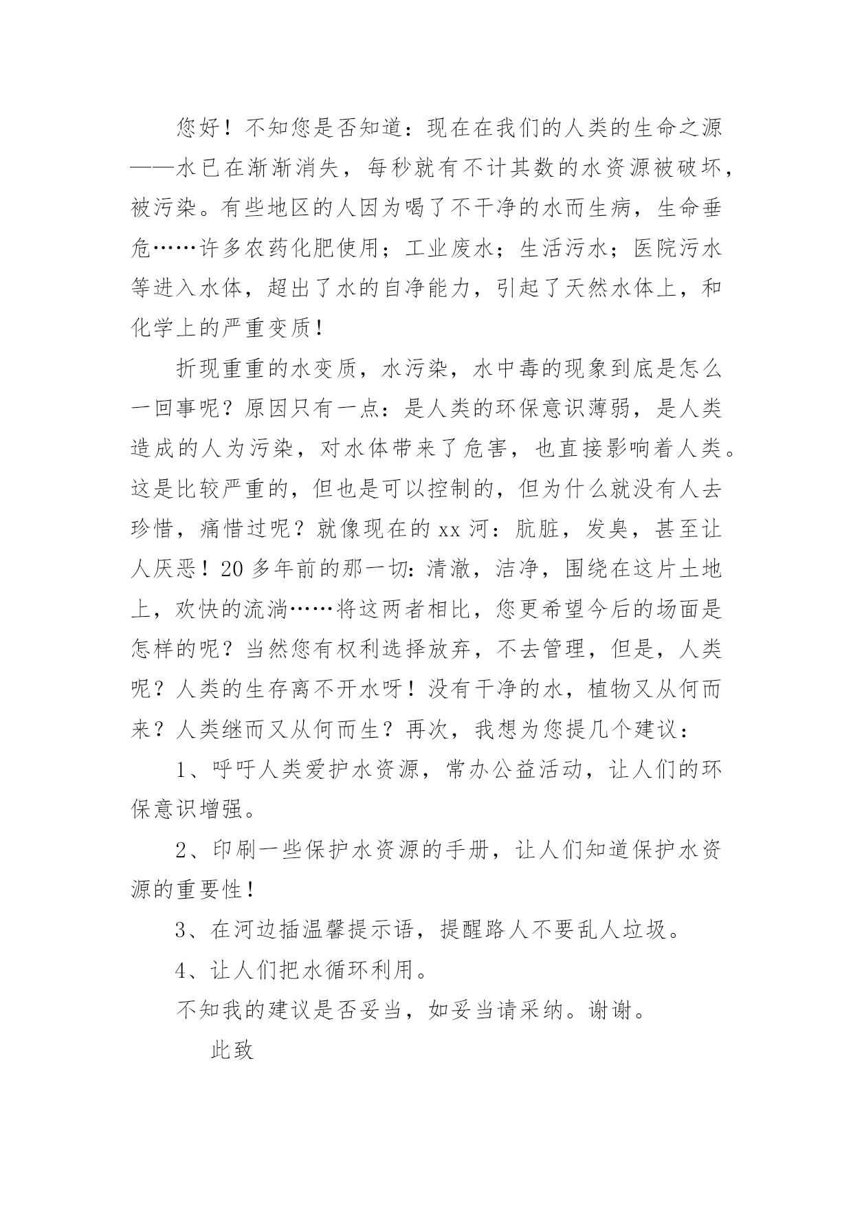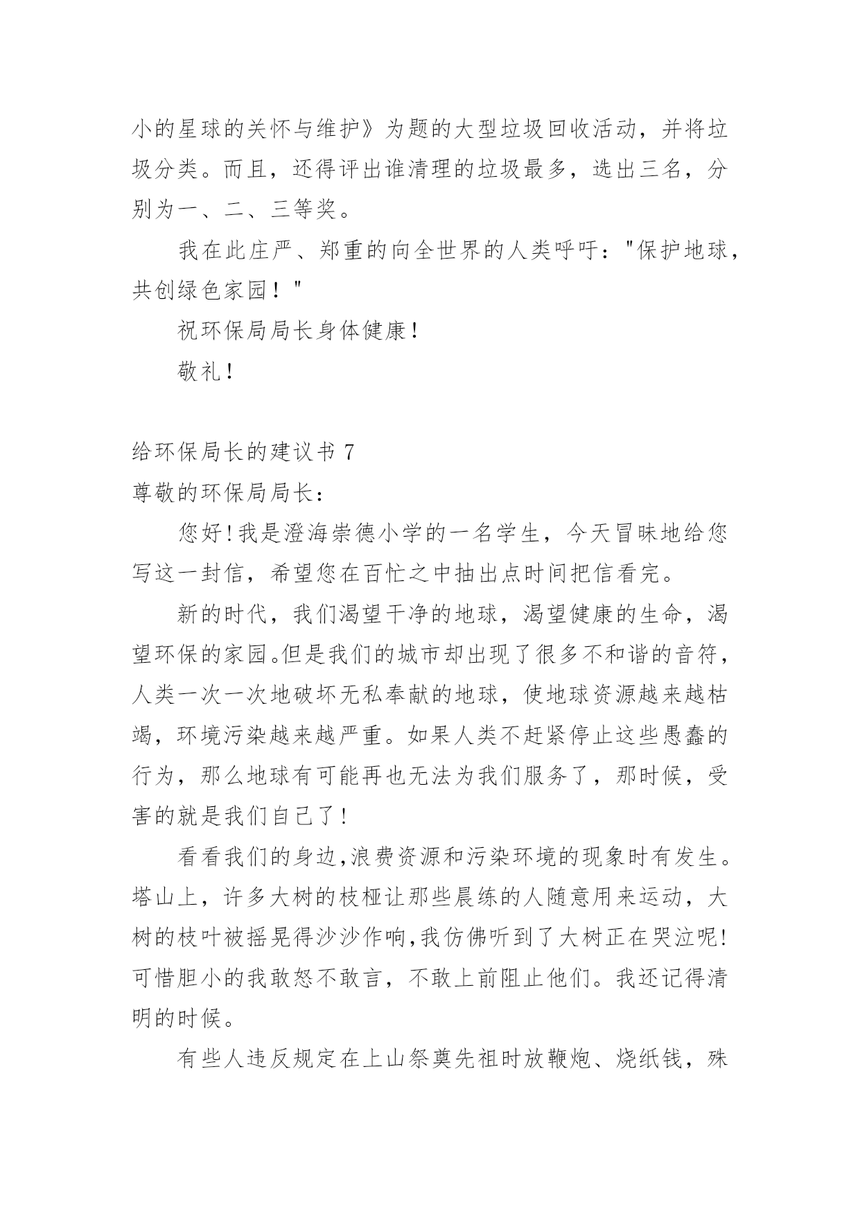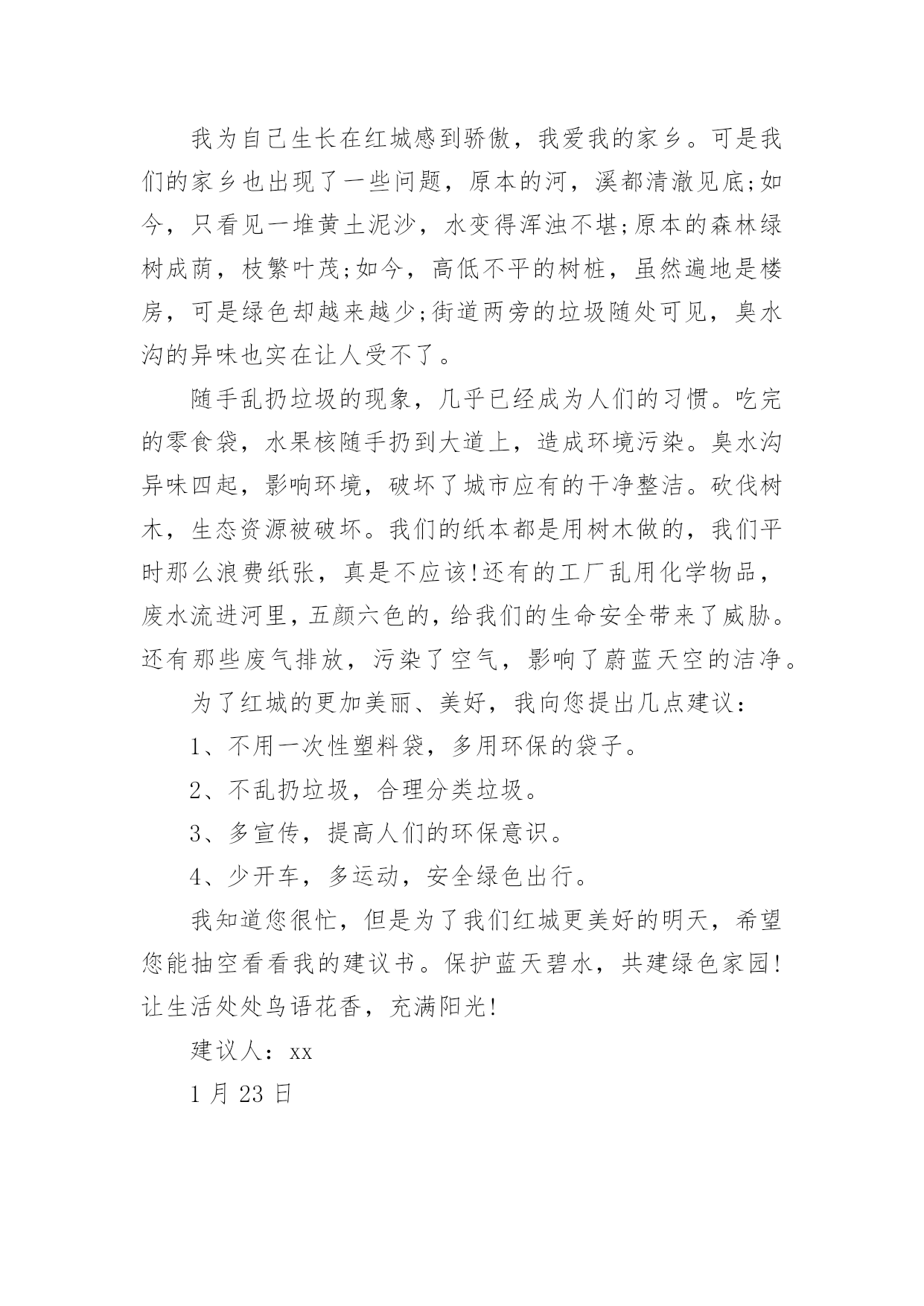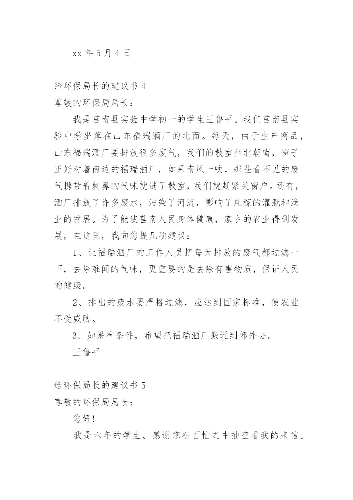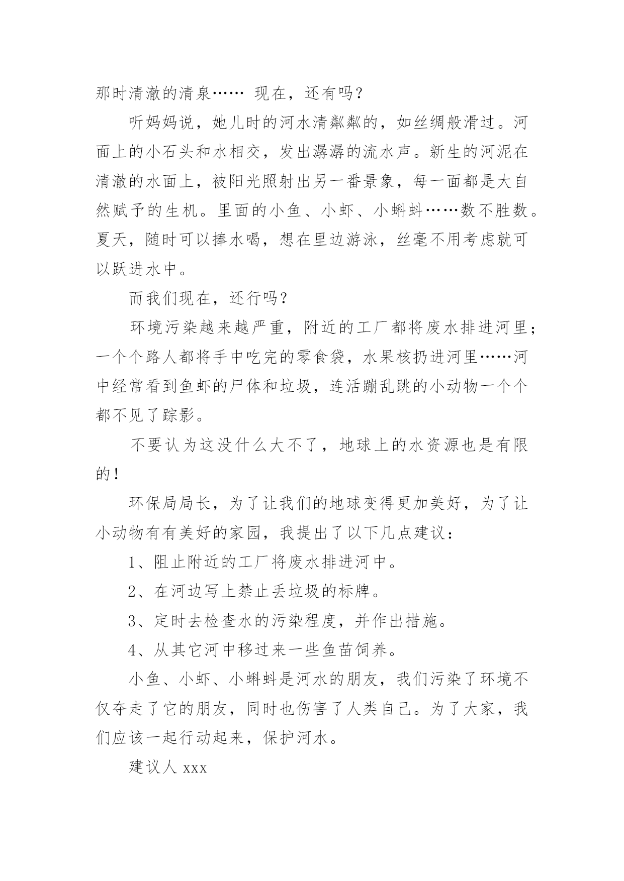 给环保局长的建议书在当今社会生活中,我们可以使用建议书的机会越来越多,建议书是面对有关部门或上级领导提建议时使用的一种书面材料,具有较强的文本性特点。还是对建议书一筹莫展吗?下面是小编精心整理的给环保局长的建议书,欢迎阅读,希望大家能够喜欢。给环保局长的建议书1尊敬的环保局长:您好!在我们这个城市中,有不少污染环境的现象。这个美丽的荆门,被可恶的垃圾一点点地玷污着。人们只要来到苏板桥菜市场都会捂着鼻子过去,许多人都已经把它称作最恶心的菜市场,只要从那里走过,就要停止呼吸,否则,稍一吸气,就会被桥上的臭味熏得直皱眉头。为什么会这么臭?原来,那里的烂菜叶成堆,还有鱼和肉的腥味,再加上它附近盖了几座工厂,工厂里一生产新的东西就要排放废气,这样一来,苏板桥菜市场就遭殃了,工厂一排废气,它这里就被弄得臭气熏天。几十米外都能闻到这种熏人的臭气,弄得旁边的居民不得不关上正在通风的窗户。还有我们的护城河竹皮河被严重污染,旁边的工厂不加节制的排放污水,再加上周边的居民随意的往河里丢垃圾。使河里到处都有垃圾。针对以上几问题,我想对您提出一下:一、请您严查这些工厂。至少每个月查一次,使它们不能够大量排放废水和废气,污染环境。二、教育一下这些往河里丢垃圾的人,让他们不要在丢垃圾了。三、在您视查时,要让工厂的人采取一些净化环境的措施,也可以让它们净化准备排出的废气和废水,帮助环保的进一步提升。四、在河边安排几个人员或垃圾桶。希望您能够合理的采纳我提出的建议。建议人:xxx20xx年1月23日给环保局长的建议书2尊敬的环保局局长:您好!济南风景秀丽,被称为泉城,但又是有名的“垃圾之城”,济南人爱乱扔垃圾,使市容遭到了破坏。(我为我生活在美丽的泉城而自豪,可是总有一些不文明的现象出现,破坏我们的生活环境,希望环保局的领导能创造一些保护环境的条件,让我们的市民变得自觉起来。)在我们的小区里,问题非常严重。垃圾到处都是,使街道上臭气熏天。在新扩建的山大南路延长线上,原来被拆走的菜商,又跑到这里来卖菜,一天过后,地上全是菜叶子,久而久之,地面上垃圾遍地,污水横流,根本无法通行。还有,我发现我们小区里只有一个垃圾箱,还被摔坏了,这么大的小区,只有一个垃圾箱,我们的垃圾往哪扔呢?20xx年济南就要举办全运会了,如果全国的人都看见我们这里全是垃圾,会对他们留下一个坏印象。我希望有关部门能在我们的小区多设几个垃圾箱,然后再设几个垃圾堆放点,定期派垃圾车清理垃圾,还可以把菜商都迁到别的地方,只保留一小部分菜商,再把这条马路清理一下,让车辆通行。居民们都适应了这种生活,如果突然改变,肯定会不适应,所以,我希望有关部门能进行宣传。比如:张贴小提示,在小区楼上贴告示,或上门宣传,这会起到很大的效果,从根本上解决问题。希望您能重视起这件事情,有条理的解决,就不会有垃圾成堆的现象,济南也不会有垃圾之城的“美誉”。此致敬礼建议人:xxx20xx年xx月xx日给环保局长的建议书3环保局局长:您好!我是XX市的一名小学生。不知您还记得您儿时的家乡吗?那时嫩绿的新叶,那时田野的薄雾轻烟,那时青青的小草,那时五彩的野花,还有那时清澈的清泉……现在,还有吗?听妈妈说,她儿时的河水清粼粼的,如丝绸般滑过。河面上的小石头和水相交,发出潺潺的流水声。新生的河泥在清澈的水面上,被阳光照射出另一番景象,每一面都是大自然赋予的生机。里面的小鱼、小虾、小蝌蚪……数不胜数。夏天,随时可以捧水喝,想在里边游泳,丝毫不用考虑就可以跃进水中。而我们现在,还行吗?环境污染越来越严重,附近的工厂都将废水排进河里;一个个路人都将手中吃完的零食袋,水果核扔进河里……河中经常看到鱼虾的尸体和垃圾,连活蹦乱跳的小动物一个个都不见了踪影。不要认为这没什么大不了,地球上的水资源也是有限的!环保局局长,为了让我们的地球变得更加美好,为了让小动物有有美好的家园,我提出了以下几点建议:1、阻止附近的工厂将废水排进河中。2、在河边写上禁止丢垃圾的标牌。3、定时去检查水的污染程度,并作出措施。4、从其它河中移过来一些鱼苗饲养。小鱼、小虾、小蝌蚪是河水的朋友,我们污染了环境不仅夺走了它的朋友,同时也伤害了人类自己。为了大家,我们应该一起行动起来,保护河水。建议人xxxxx年5月4日给环保局长的建议书4尊敬的环保局局长:我是莒南县实验中学初一的学生王鲁平。我们莒南县实验中学坐落在山东福瑞酒厂的北面。每天,由于生产商品,山东福瑞酒厂要排放很多废气,我们的教室坐北朝南,窗子正好对着南边的福瑞酒厂,如果南风一吹,那些看不见的废气携带着刺鼻的气味就进了教室,我们就赶紧关窗户。还有,酒厂排放了许多废水,污染了河流,影响了庄稼的灌溉和渔业的发展。为了能使莒南人民身体健康,家乡的农业得到发展,在这里,我向您提几项建议:1、让福瑞酒厂的工作人员把每天排放的