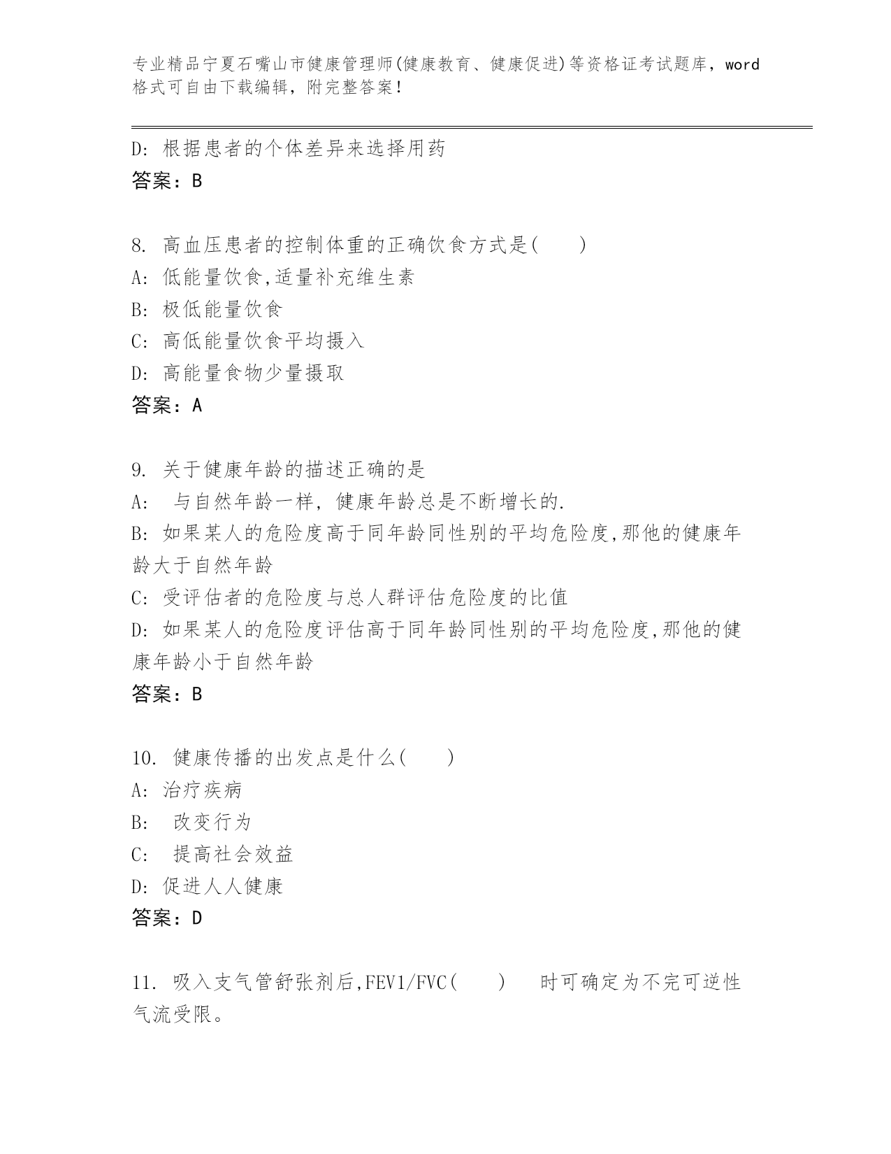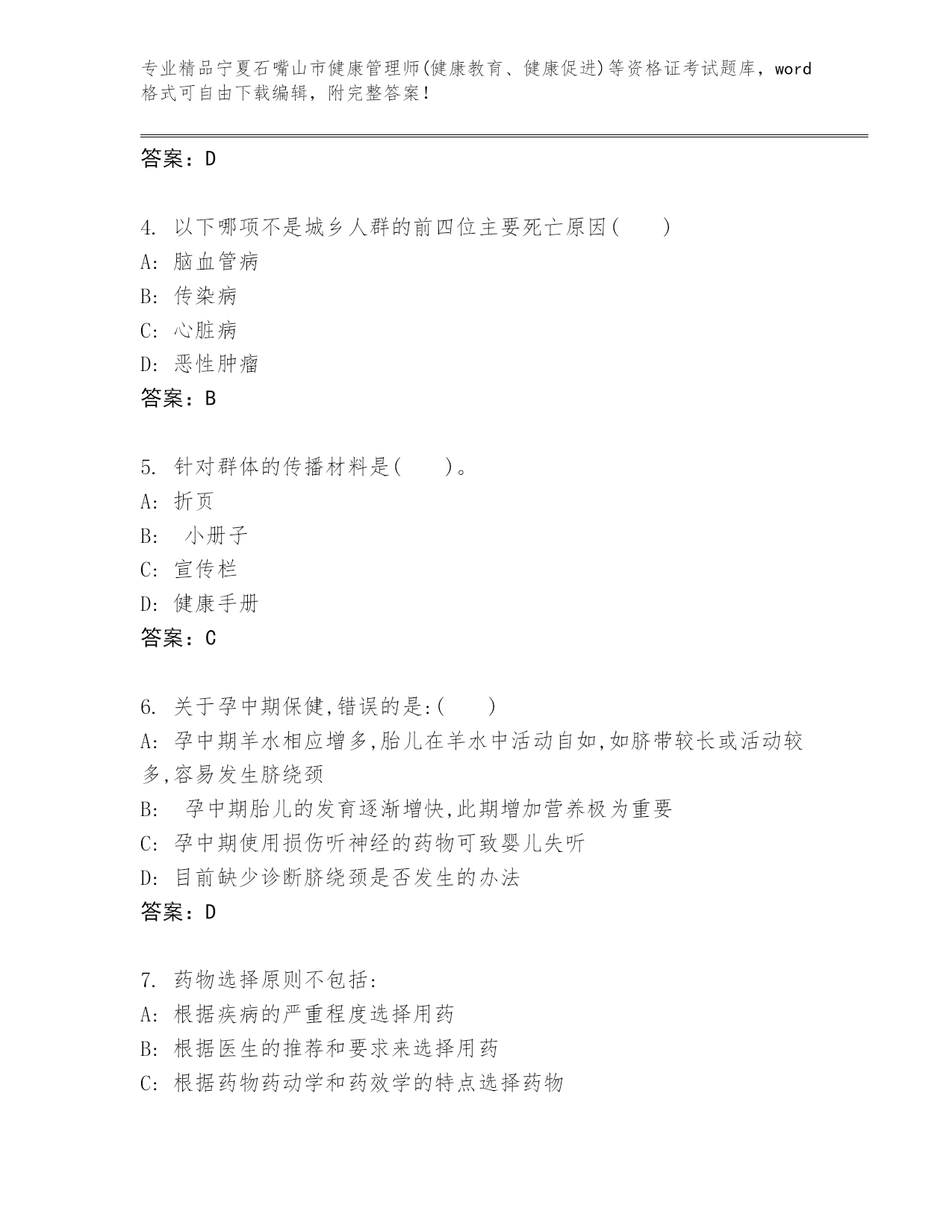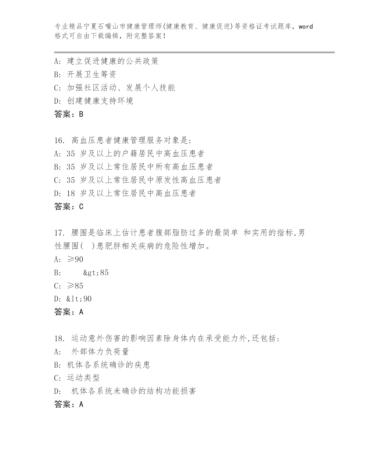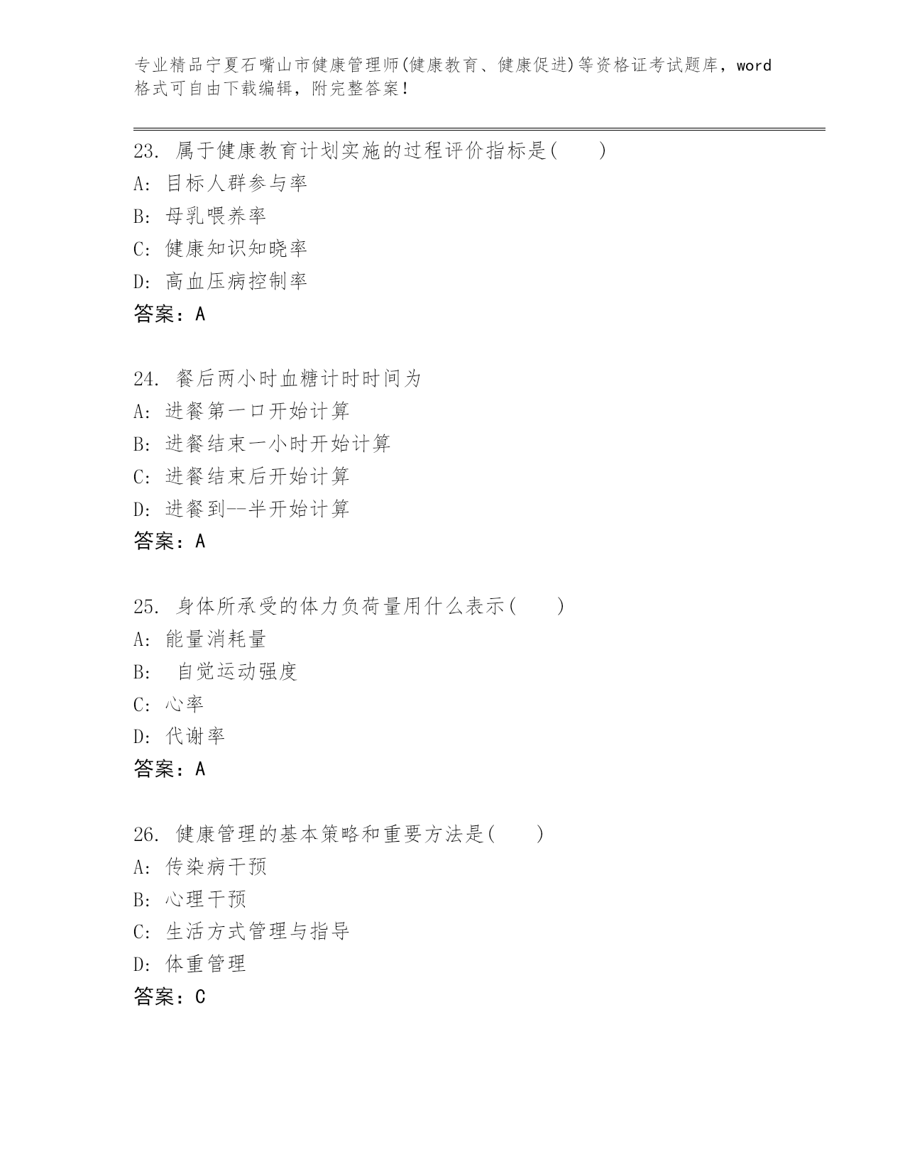 内部培训宁夏石嘴山市健康管理师(健康教育、健康促进)等资格证考试通关秘籍题库精选.docx