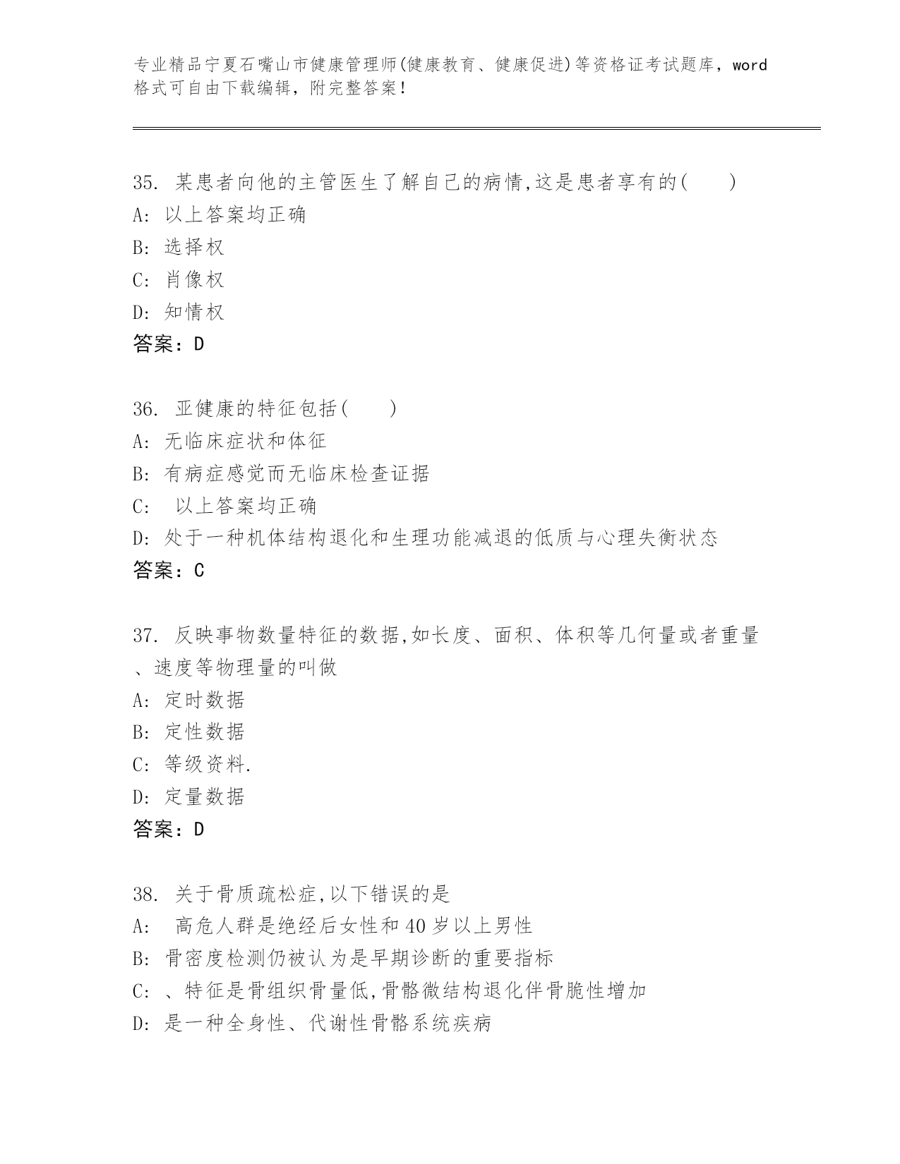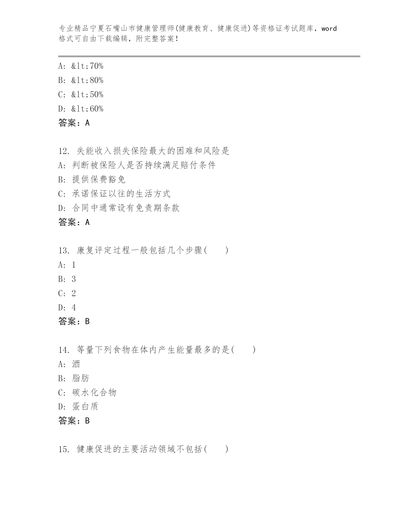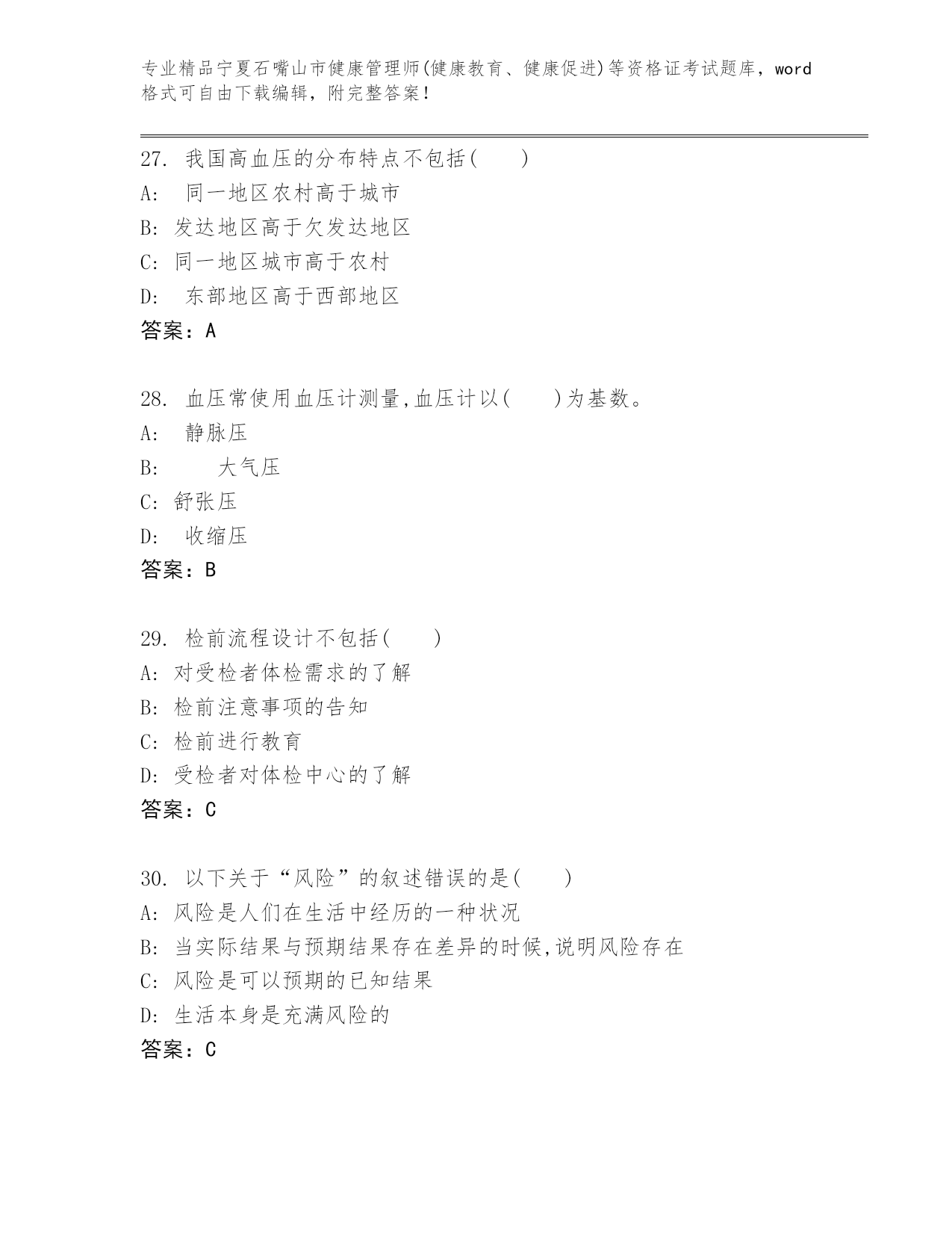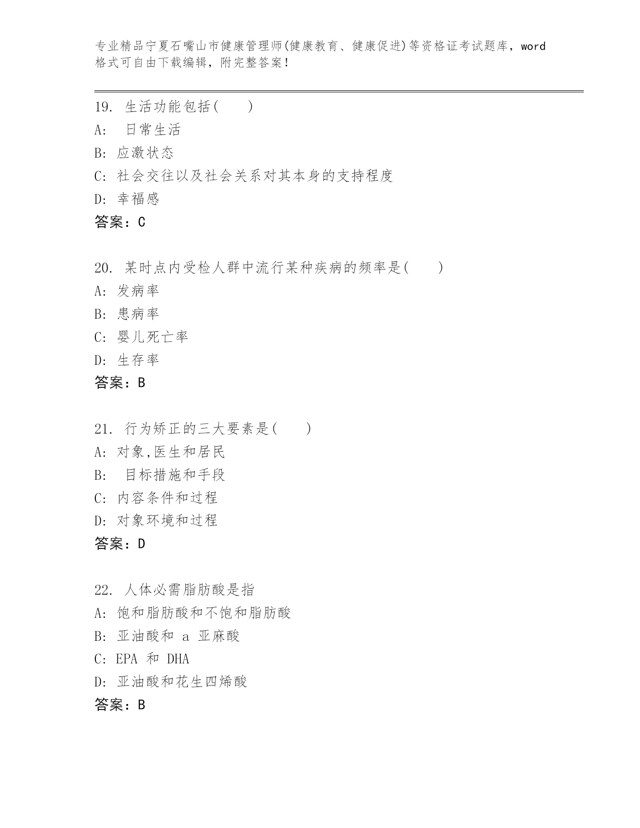 内部培训宁夏石嘴山市健康管理师(健康教育、健康促进)等资格证考试通关秘籍题库精选