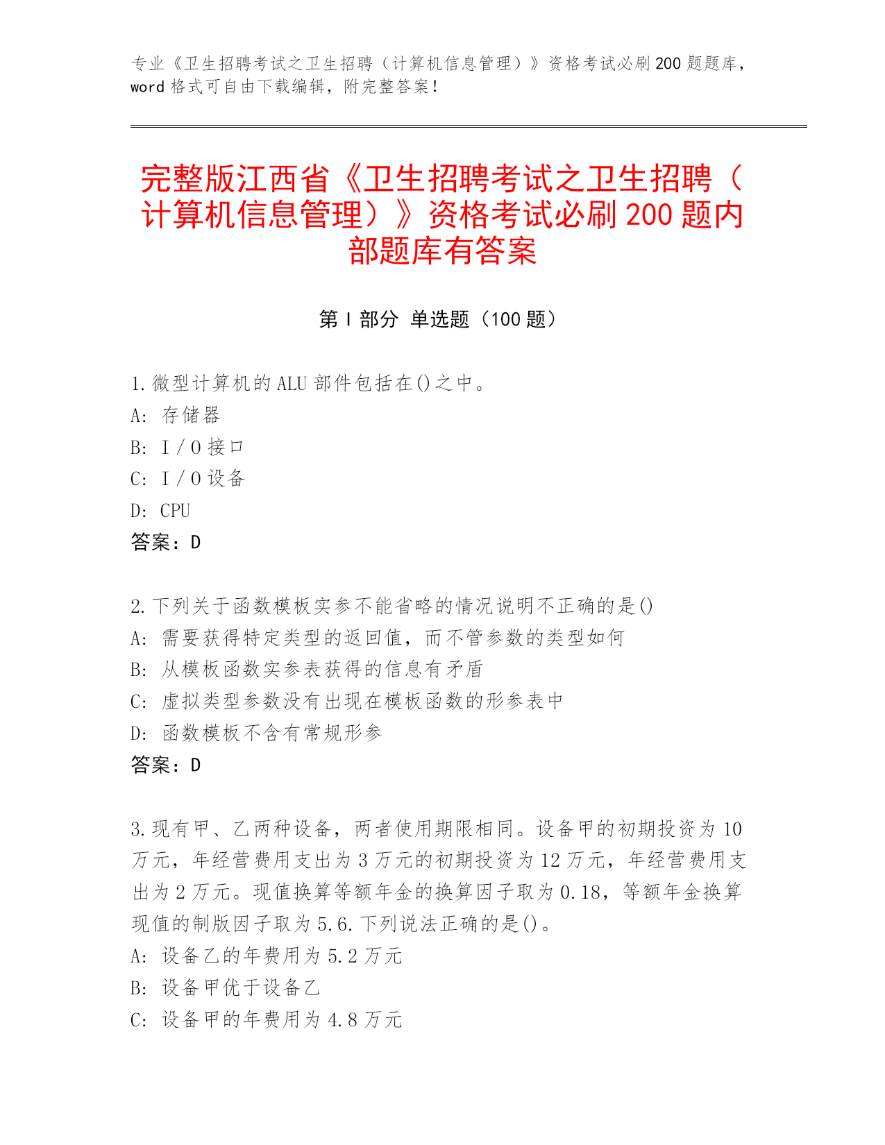 完整版江西省《卫生招聘考试之卫生招聘(计算机信息管理)》资格考试必刷200题内部题库有答案