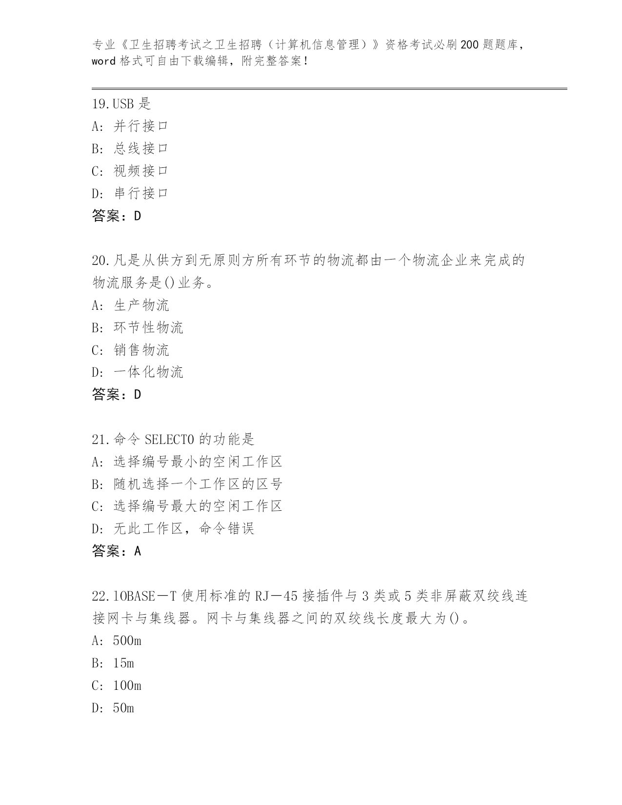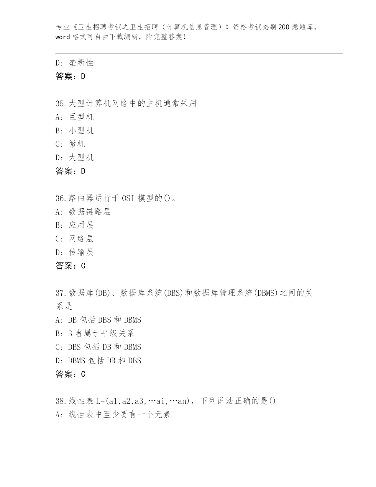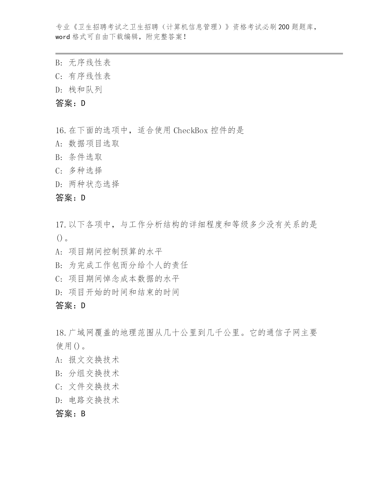 内部使用江西省青原区《卫生招聘考试之卫生招聘(计算机信息管理)》资格考试必背200题题库及答案(必刷)