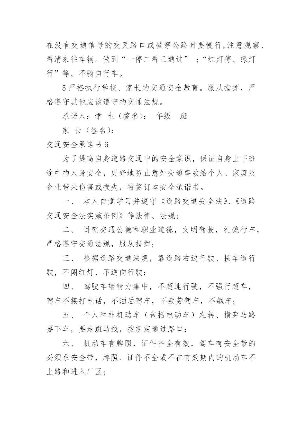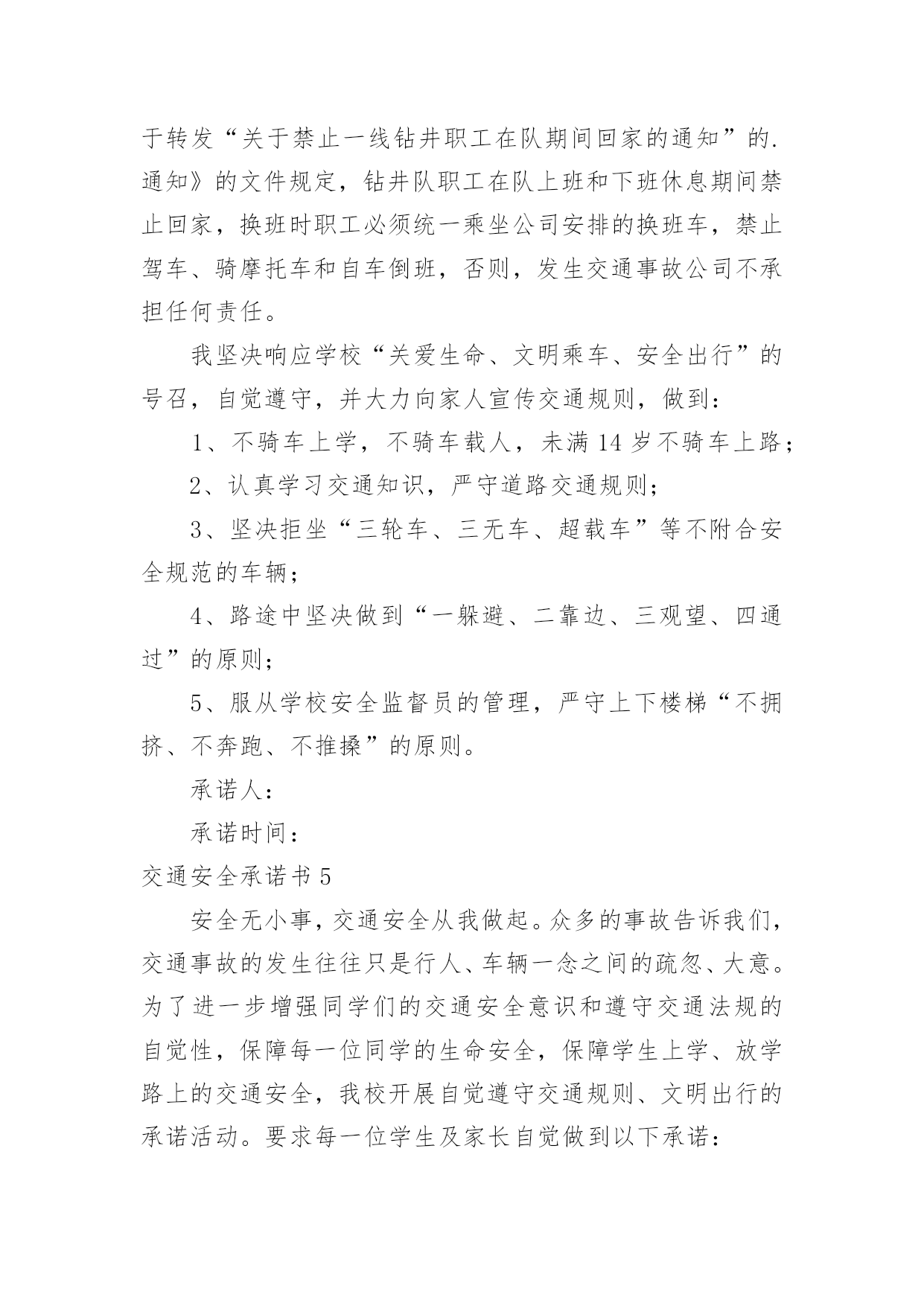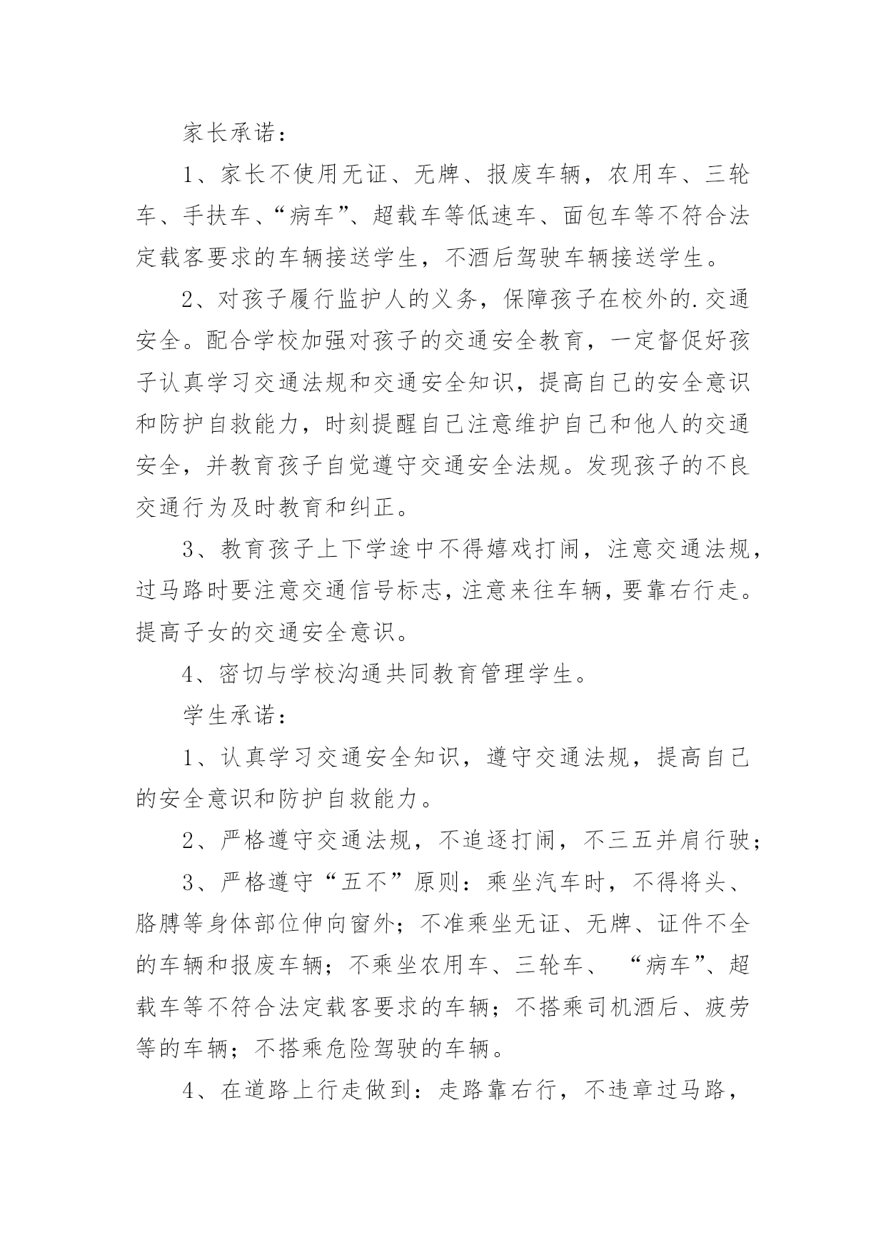 交通安全承诺书交通安全承诺书(15篇)在不断进步的时代,能够利用到承诺书的场合越来越多,承诺书必须由受要约人作出,只有受要约人才能取得承诺的权利,受要约人以外的第三人不享有承诺的权利。为了让您在写承诺书时更加简单方便,以下是小编为大家整理的交通安全承诺书,欢迎阅读与收藏。交通安全承诺书1为了进一步增强同学们的交通安全意识和遵守交通法规的自觉性,保障每一位同学的生命安全,保障学生上学、放学路上的交通安全,xx学校开展自觉遵守交通规则、文明出行的承诺活动。要求每一位学生及家长自觉做到以下承诺:家长承诺:1、对孩子履行监护人的义务,保障孩子在校外的交通安全。2、配合学校加强对孩子的交通安全教育,提高子女的交通安全意识。3、加强对孩子交通安全管理,发现孩子的不良交通行为及时教育和纠正。4、密切与学校沟通共同教育管理学生。学生承诺:1、认真学习交通安全知识,遵守交通法规,提高自己的安全意识和防护自救能力。2、在道路上行走做到:走路靠右行,不违章过马路,“一停二看三通过”;“红灯停、绿灯行”等。3、严格遵守“五不”原则:不搭乘证件不全的'车辆;不搭乘超载的车辆;不搭乘非客运车辆;不搭乘司机酒后、疲劳等的车辆;不搭乘危险驾驶的车辆。6、严格执行学校、家长的交通安全教育。学生签字:家长签字:xx年xx月xx日交通安全承诺书2为了积极构建平安上良、和谐上良、多彩上良、幸福上良,维护文明上良的良好形象,推动养成文明交通行为习惯和保障全省道路安全畅通,预防和减少交通事故,本人愿自觉遵守交通安全法律法规,抵制交通违法,摒弃交通陋习,努力争当文明驾驶人。在此,我郑重承诺:一、严格遵守《中华人民共和国道路交通安全法》、《甘肃省道路交通安全条例》等法律法规,自觉养成良好的交通职业习惯,摒弃交通陋习,抵制交通违法,坚决做到谨慎、安全、文明驾驶。二、牢记“安全第一、以人为本,预防事故、从我做起”的`理念,不超速行驶,不超员超载,不疲劳驾驶,不酒后驾驶,开车不接听手机。三、遵守交通信号,系好安全带,不违反交通标志标线规定。四、增强文明交通意识,做到按道行驶。自觉礼让行人,不争道抢行,不随意变更车道,不抢道猛拐,不向车外乱扔杂物。五、维护公共秩序,做到按位停车。确保停车有序,不违法停放车辆,不影响别人的正常通行。六、自觉消除无证驾驶、酒后驾驶、醉酒驾驶、违反规定客货混装,禁止“双超”和拖拉机货箱载人等道路交通安全违法行为。七、争当文明交通志愿者,积极参与文明交通宣传安全活动及交通安全公益事业,营造文明和谐的交通环境。承诺人(驾驶人)签名:xxx交通安全承诺书3为了维护道路交通安全秩序,预防和减少道路交通事故,确保生命及公司财产安全,本人自愿承诺:一、自觉遵守交通安全法规、制度,提高交通法制意识、安全意识和职业道德意识,主动维护道路良好交通秩序。二、保证按相关法规要求,定期进行体检,患有相关疾病,或者过度疲劳等影响安全驾驶的`,不驾驶机动车。三、认真做好车辆的预防性维护,确保车辆转向、制动系统合格,照明灯光齐全有效,安全性能良好,保证不驾驶未检验或检验不合格的车辆。四、保证做到:不酒后驾车,不带“病”出车,不疲劳驾车,不闯黄灯、红灯,不超速,不超载,不争道抢行,礼让行人,文明驾驶。五、保证不非法营运,不在上下班期间使用非营运车辆搭载公司员工进行经营行为。六、自觉接受公司的检查、监督,服从管理。我已熟知交通安全承诺书内容,愿意认真履行,如违反愿意承担相应责任,并依照公司管理规定接受处罚。交通安全承诺书4为了落实***校交通安全责任制,加强公车和私车的车辆管理,预防交通事故的发生。近日,**一中在校全体员工中签定交通安全保证书,要求全体员工要自觉遵守公司的各项交通管理制度,杜绝各类交通事故的发生,交通安全保证书签定率达到100%。一是学校对因学习需要外出办事的人员,实行统一派车制度,职工不得驾驶私有机动车办公事,不允许驾驶公车办私车,对违反规定者,发生交通事故由交通管理部门处理,公司不承担任何责任;二是公司专职驾驶员要认真学习《交通安全法》等法律法规。坚持出车前、行驶中、收车后的车辆检查,不开带病车,不酒后驾车,不无证驾车,不肇事逃逸,开文明车。自觉遵守单位的交通安全管理和日常管理;三是公司根据职工居住地区分布情况,配发了班车,因此,凡职工驾驶车辆、骑摩托车和自行车上下班者,属个人行为,如发生交通事故,公司不承担任何责任;四是根据钻二质安[20xx]4号和钻二[20xx]1号文《关于转发“关于禁止一线钻井职工在队期间回家的通知”的.通知》的文件规定,钻井队职工在队上班和下班休息期间禁止回家,换班时职工必须统一乘坐公司安排的换班车,禁止驾车、骑摩托车和自车倒班,否则,发生交通事故公司不承担任何责任。我坚决响应学校“关爱生命、文明乘车、安全出行”的号召,自觉遵守,并大力