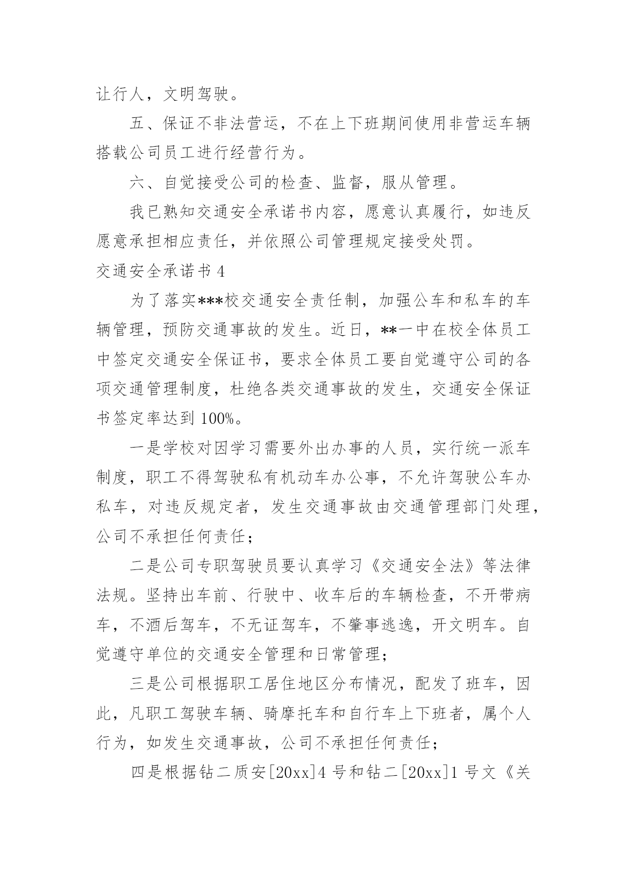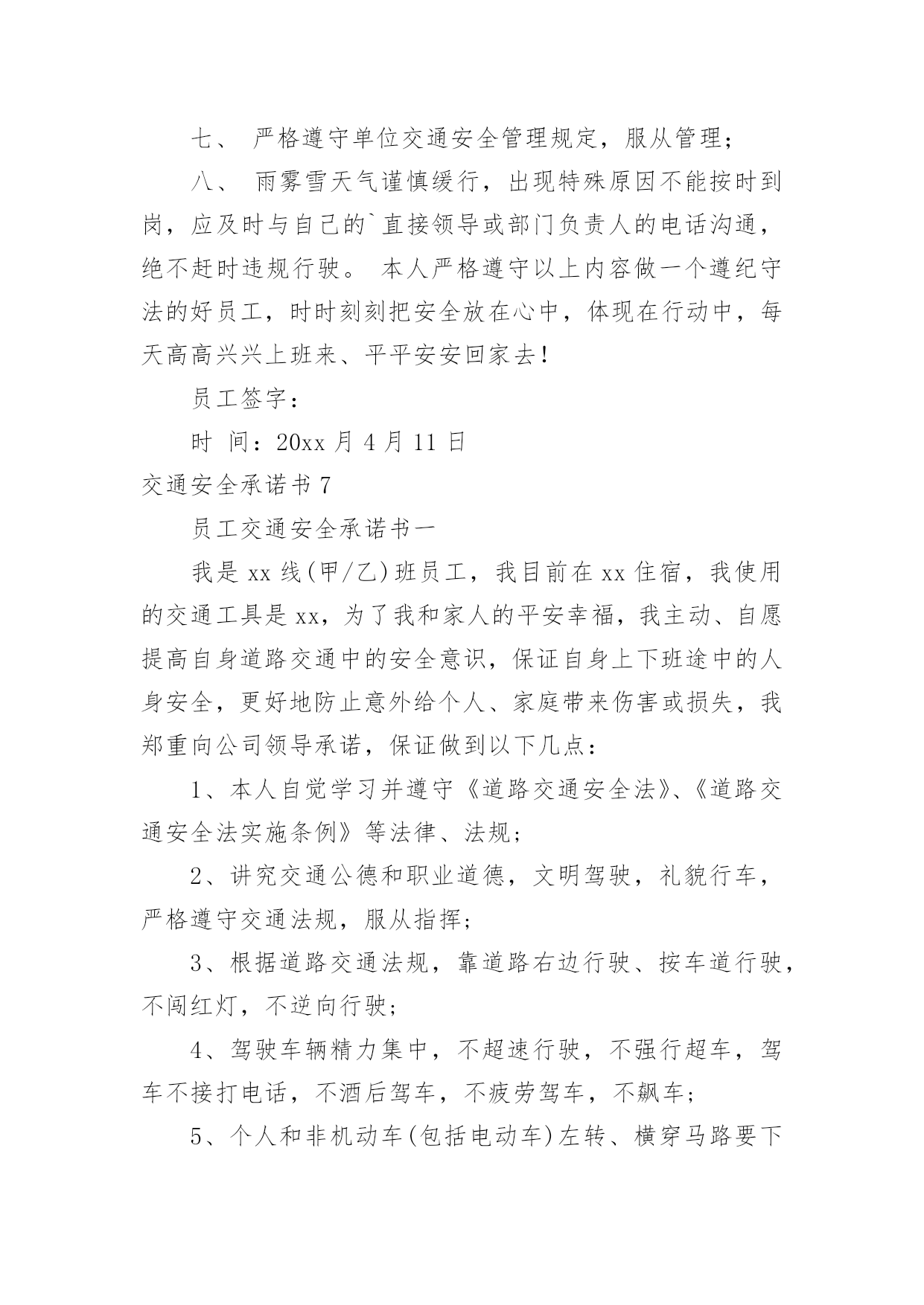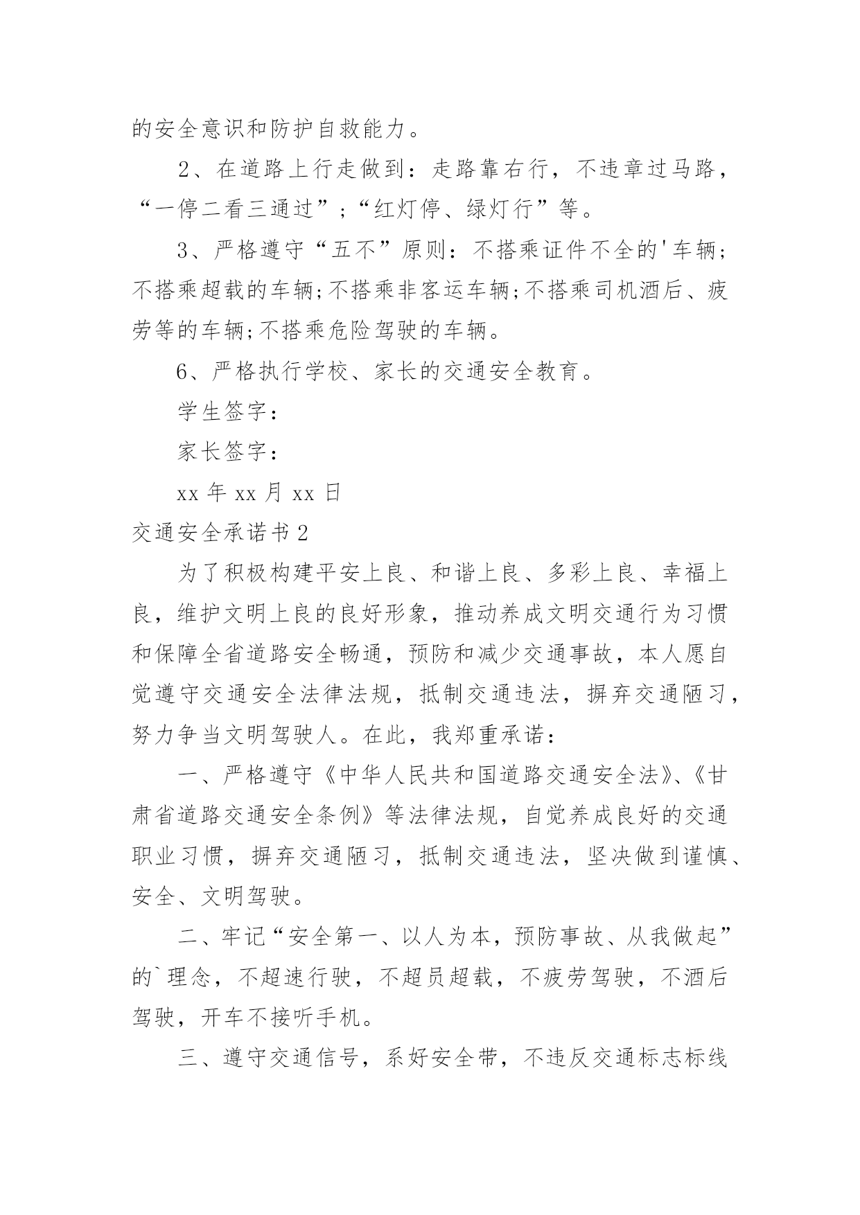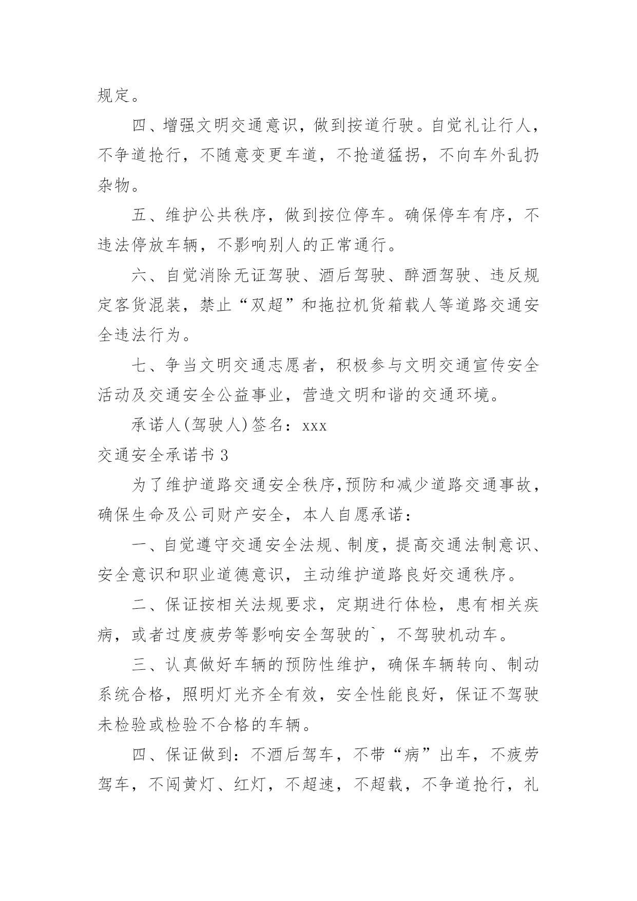 交通安全承诺书交通安全承诺书(15篇)在不断进步的时代,能够利用到承诺书的场合越来越多,承诺书必须由受要约人作出,只有受要约人才能取得承诺的权利,受要约人以外的第三人不享有承诺的权利。为了让您在写承诺书时更加简单方便,以下是小编为大家整理的交通安全承诺书,欢迎阅读与收藏。交通安全承诺书1为了进一步增强同学们的交通安全意识和遵守交通法规的自觉性,保障每一位同学的生命安全,保障学生上学、放学路上的交通安全,xx学校开展自觉遵守交通规则、文明出行的承诺活动。要求每一位学生及家长自觉做到以下承诺:家长承诺:1、对孩子履行监护人的义务,保障孩子在校外的交通安全。2、配合学校加强对孩子的交通安全教育,提高子女的交通安全意识。3、加强对孩子交通安全管理,发现孩子的不良交通行为及时教育和纠正。4、密切与学校沟通共同教育管理学生。学生承诺:1、认真学习交通安全知识,遵守交通法规,提高自己的安全意识和防护自救能力。2、在道路上行走做到:走路靠右行,不违章过马路,“一停二看三通过”;“红灯停、绿灯行”等。3、严格遵守“五不”原则:不搭乘证件不全的'车辆;不搭乘超载的车辆;不搭乘非客运车辆;不搭乘司机酒后、疲劳等的车辆;不搭乘危险驾驶的车辆。6、严格执行学校、家长的交通安全教育。学生签字:家长签字:xx年xx月xx日交通安全承诺书2为了积极构建平安上良、和谐上良、多彩上良、幸福上良,维护文明上良的良好形象,推动养成文明交通行为习惯和保障全省道路安全畅通,预防和减少交通事故,本人愿自觉遵守交通安全法律法规,抵制交通违法,摒弃交通陋习,努力争当文明驾驶人。在此,我郑重承诺:一、严格遵守《中华人民共和国道路交通安全法》、《甘肃省道路交通安全条例》等法律法规,自觉养成良好的交通职业习惯,摒弃交通陋习,抵制交通违法,坚决做到谨慎、安全、文明驾驶。二、牢记“安全第一、以人为本,预防事故、从我做起”的`理念,不超速行驶,不超员超载,不疲劳驾驶,不酒后驾驶,开车不接听手机。三、遵守交通信号,系好安全带,不违反交通标志标线规定。四、增强文明交通意识,做到按道行驶。自觉礼让行人,不争道抢行,不随意变更车道,不抢道猛拐,不向车外乱扔杂物。五、维护公共秩序,做到按位停车。确保停车有序,不违法停放车辆,不影响别人的正常通行。六、自觉消除无证驾驶、酒后驾驶、醉酒驾驶、违反规定客货混装,禁止“双超”和拖拉机货箱载人等道路交通安全违法行为。七、争当文明交通志愿者,积极参与文明交通宣传安全活动及交通安全公益事业,营造文明和谐的交通环境。承诺人(驾驶人)签名:xxx交通安全承诺书3为了维护道路交通安全秩序,预防和减少道路交通事故,确保生命及公司财产安全,本人自愿承诺:一、自觉遵守交通安全法规、制度,提高交通法制意识、安全意识和职业道德意识,主动维护道路良好交通秩序。二、保证按相关法规要求,定期进行体检,患有相关疾病,或者过度疲劳等影响安全驾驶的`,不驾驶机动车。三、认真做好车辆的预防性维护,确保车辆转向、制动系统合格,照明灯光齐全有效,安全性能良好,保证不驾驶未检验或检验不合格的车辆。四、保证做到:不酒后驾车,不带“病”出车,不疲劳驾车,不闯黄灯、红灯,不超速,不超载,不争道抢行,礼让行人,文明驾驶。五、保证不非法营运,不在上下班期间使用非营运车辆搭载公司员工进行经营行为。六、自觉接受公司的检查、监督,服从管理。我已熟知交通安全承诺书内容,愿意认真履行,如违反愿意承担相应责任,并依照公司管理规定接受处罚。交通安全承诺书4为了落实***校交通安全责任制,加强公车和私车的车辆管理,预防交通事故的发生。近日,**一中在校全体员工中签定交通安全保证书,要求全体员工要自觉遵守公司的各项交通管理制度,杜绝各类交通事故的发生,交通安全保证书签定率达到100%。一是学校对因学习需要外出办事的人员,实行统一派车制度,职工不得驾驶私有机动车办公事,不允许驾驶公车办私车,对违反规定者,发生交通事故由交通管理部门处理,公司不承担任何责任;二是公司专职驾驶员要认真学习《交通安全法》等法律法规。坚持出车前、行驶中、收车后的车辆检查,不开带病车,不酒后驾车,不无证驾车,不肇事逃逸,开文明车。自觉遵守单位的交通安全管理和日常管理;三是公司根据职工居住地区分布情况,配发了班车,因此,凡职工驾驶车辆、骑摩托车和自行车上下班者,属个人行为,如发生交通事故,公司不承担任何责任;四是根据钻二质安[20xx]4号和钻二[20xx]1号文《关于转发“关于禁止一线钻井职工在队期间回家的通知”的.通知》的文件规定,钻井队职工在队上班和下班休息期间禁止回家,换班时职工必须统一乘坐公司安排的换班车,禁止驾车、骑摩托车和自车倒班,否则,发生交通事故公司不承担任何责任。我坚决响应学校“关爱生命、文明乘车、安全出行”的号召,自觉遵守,并大力