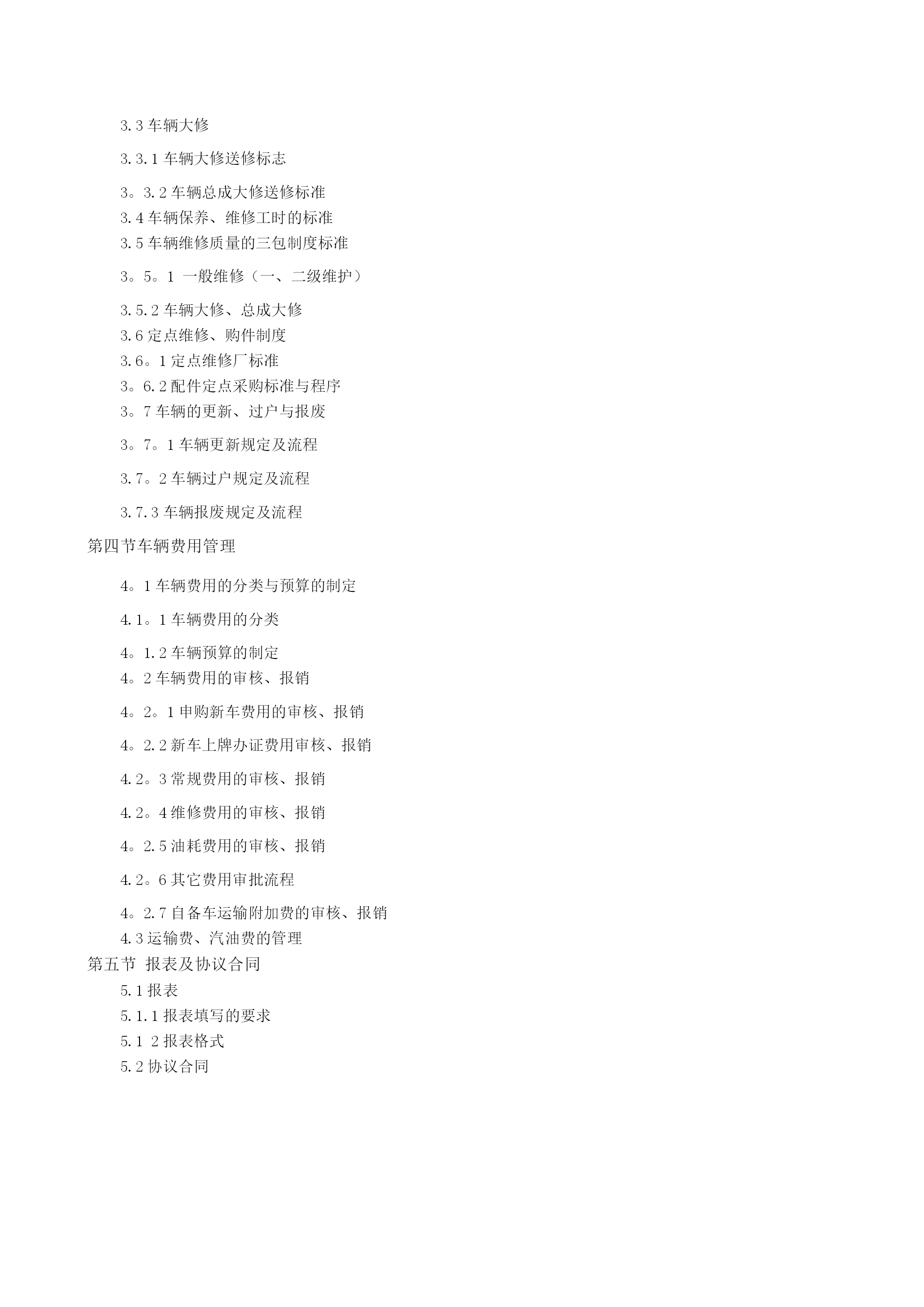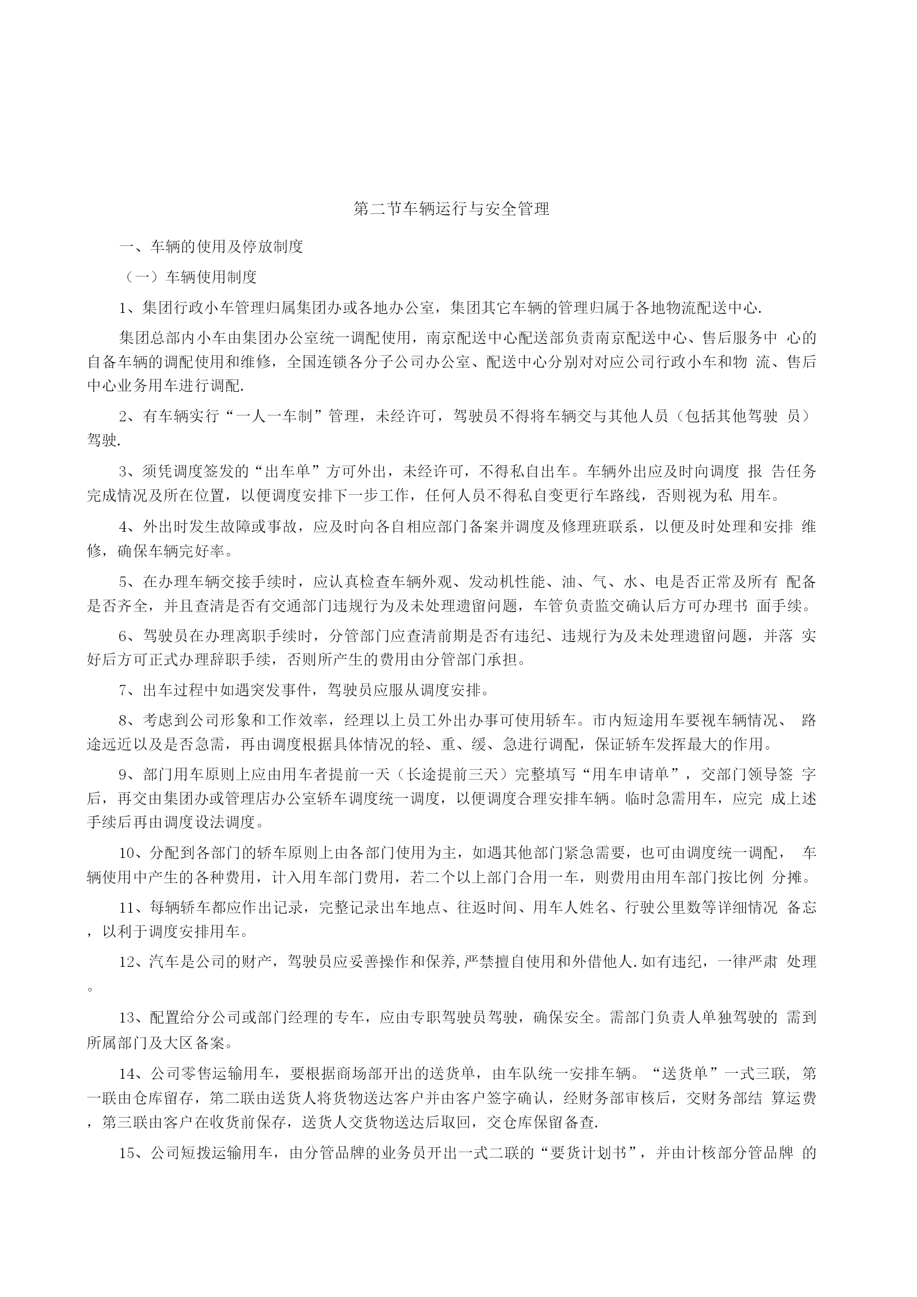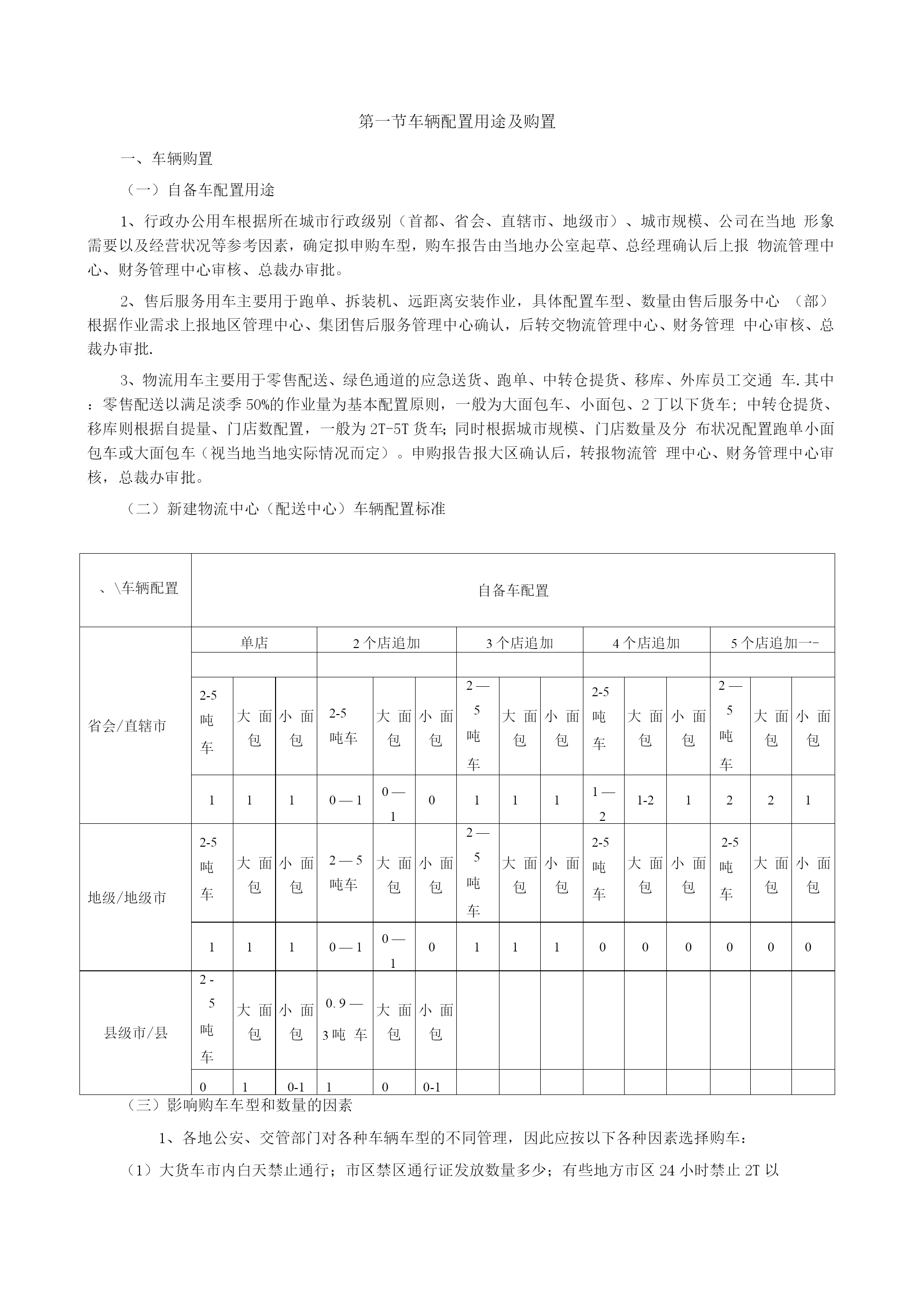 车辆管理操作手册目录第一节车辆配置用途及购置1.1车辆购置1。1.1自备车配置用途1.1.2新建物流中心(配送中心)车辆配置标准1。1。3影响购车车型和数量的因素2.1车辆定向采购制度第二节车辆运行与安全管理2.1车辆的使用及停放制度2.1.1车辆使用制度2。1。2车辆定点停放制度2.2车辆燃油管理1车辆燃油标准的制定2。2。2燃油消耗的考核标准2.3车辆保险管理2。3。1保险管理2。3.2保险险种2.3.3出险管理2。4安全行车管理2。4。1影响安全行车的因素2.4.2安全行车的规范2.4.3安全行车规定2.4。4安全行车处罚标准第三节车辆维修、更新、过户与报废3.1车辆维护、保养等级与周期3。1。1车辆维护、保养等级3.1.2车辆维护、保养周期3。2车辆维护、保养项目3。2。1日常维护项目3.2.2一级维护项目3。2.3二级维护项目3.3车辆大修3.3.1车辆大修送修标志3。3.2车辆总成大修送修标准3.4车辆保养、维修工时的标准3.5车辆维修质量的三包制度标准3。5。1一般维修(一、二级维护)3.5.2车辆大修、总成大修3.6定点维修、购件制度3.6。1定点维修厂标准3。6.2配件定点采购标准与程序3。7车辆的更新、过户与报废3。7。1车辆更新规定及流程3.7。2车辆过户规定及流程3.7.3车辆报废规定及流程第四节车辆费用管理4。1车辆费用的分类与预算的制定4.1。1车辆费用的分类4。1.2车辆预算的制定4。2车辆费用的审核、报销4。2。1申购新车费用的审核、报销4。2.2新车上牌办证费用审核、报销4.2。3常规费用的审核、报销4.2。4维修费用的审核、报销4。2.5油耗费用的审核、报销4.2。6其它费用审批流程4。2.7自备车运输附加费的审核、报销4.3运输费、汽油费的管理第五节报表及协议合同5.1报表5.1.1报表填写的要求5.12报表格式5.2协议合同第一节车辆配置用途及购置一、车辆购置(一)自备车配置用途1、行政办公用车根据所在城市行政级别(首都、省会、直辖市、地级市)、城市规模、公司在当地形象需要以及经营状况等参考因素,确定拟申购车型,购车报告由当地办公室起草、总经理确认后上报物流管理中心、财务管理中心审核、总裁办审批。2、售后服务用车主要用于跑单、拆装机、远距离安装作业,具体配置车型、数量由售后服务中心(部)根据作业需求上报地区管理中心、集团售后服务管理中心确认,后转交物流管理中心、财务管理中心审核、总裁办审批.3、物流用车主要用于零售配送、绿色通道的应急送货、跑单、中转仓提货、移库、外库员工交通车.其中:零售配送以满足淡季50%的作业量为基本配置原则,一般为大面包车、小面包、2丁以下货车;中转仓提货、移库则根据自提量、门店数配置,一般为2T-5T货车;同时根据城市规模、门店数量及分布状况配置跑单小面包车或大面包车(视当地当地实际情况而定)。申购报告报大区确认后,转报物流管理中心、财务管理中心审核,总裁办审批。(二)新建物流中心(配送中心)车辆配置标准、\车辆配置商场规模'\自备车配置省会/直辖市单店2个店追加3个店追加4个店追加5个店追加一-2-5吨车大面包小面包2-5吨车大面包小面包2—5吨车大面包小面包2-5吨车大面包小面包2—5吨车大面包小面包1110—10—101111—21-21221地级/地级市2-5吨车大面包小面包2—5吨车大面包小面包2—5吨车大面包小面包2-5吨车大面包小面包2-5吨车大面包小面包1110—10—10111000000县级市/县2-5吨车大面包小面包0.9—3吨车大面包小面包010-1100-1(三)影响购车车型和数量的因素1、各地公安、交管部门对各种车辆车型的不同管理,因此应按以下各种因素选择购车:(1)大货车市内白天禁止通行;市区禁区通行证发放数量多少;有些地方市区24小时禁止2T以上货车通行;是否允许厢式货车购置上牌、办证;大面包车既可送货,又可带人,用途广泛,不受市区道路限制;有些地方市区24小时禁止6座以上任何车辆通行(主要的商业繁华地段,步行街等);办理轿车、小客车牌证有无竞拍费用;购车有无控制指标;当地交通法规;当地环保部门的要求,比如排气量的限制等。2、各地子公司现有自备车辆数量不同、车型车况各异,因此应按以下各种因素选择增加或减少:原有自备车数量多少,业务配送量大小、配送商品品种的多少、配送商品范围;城市规模的大小、交通道路状况好坏,单车作业效率高低;中转仓自提与厂家送货的比例大小;商场、大库之间的距离远近,移、驳货途中时间的长短、单据