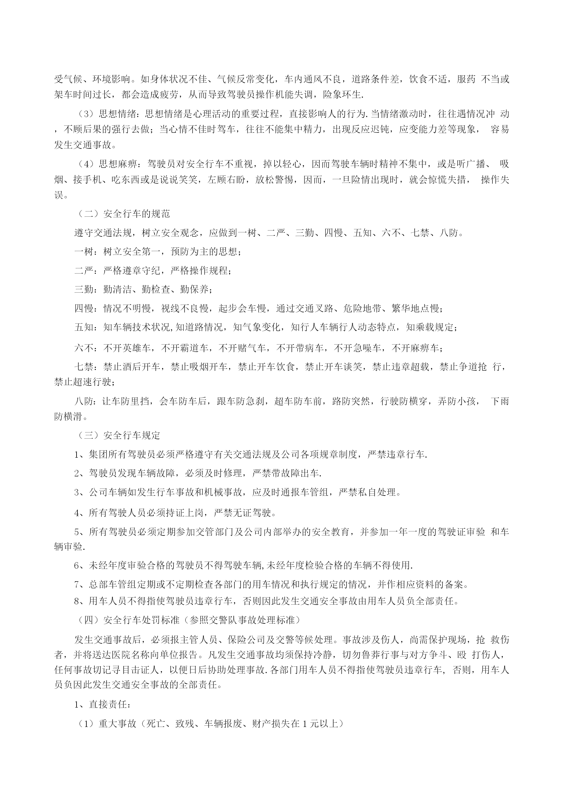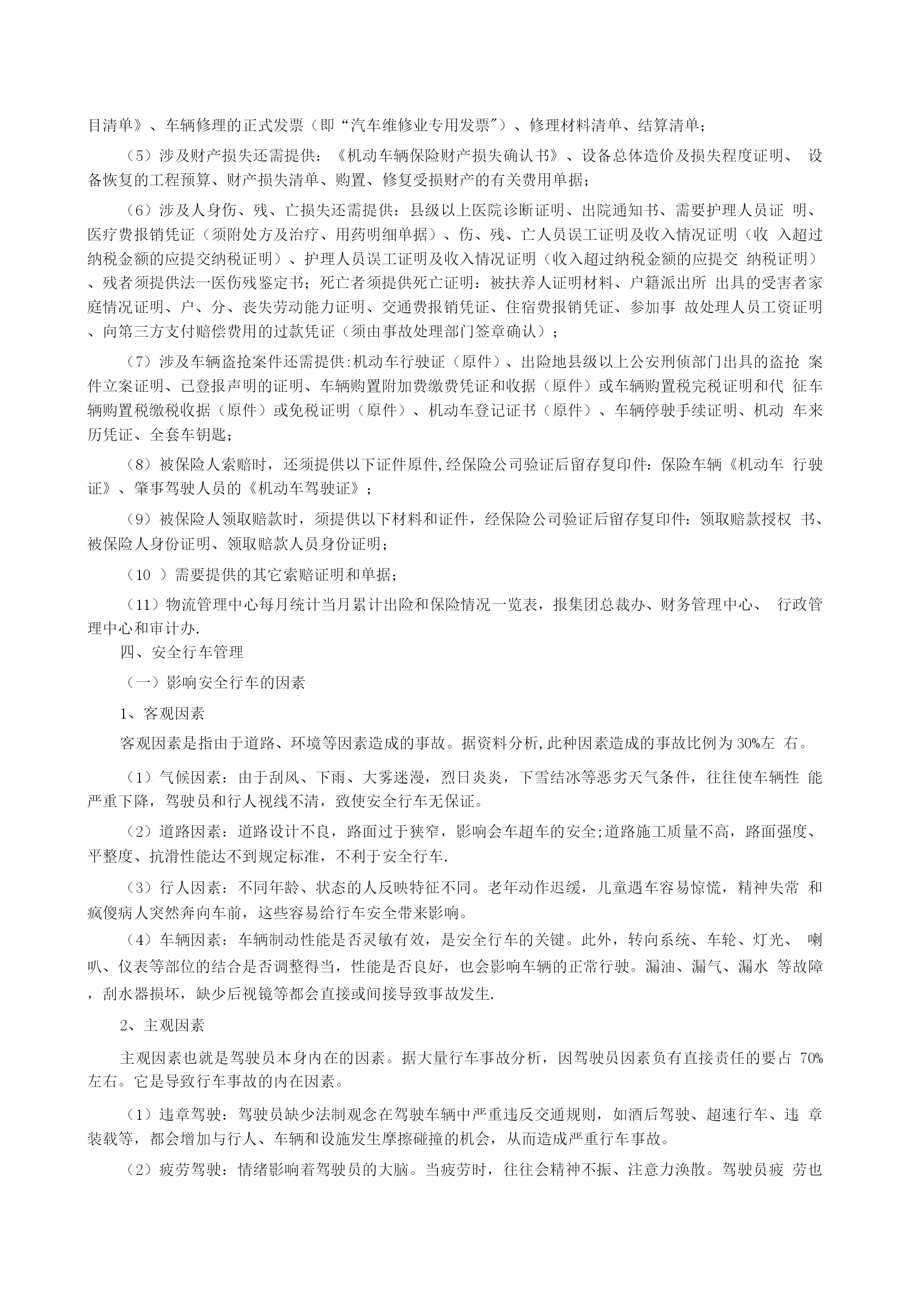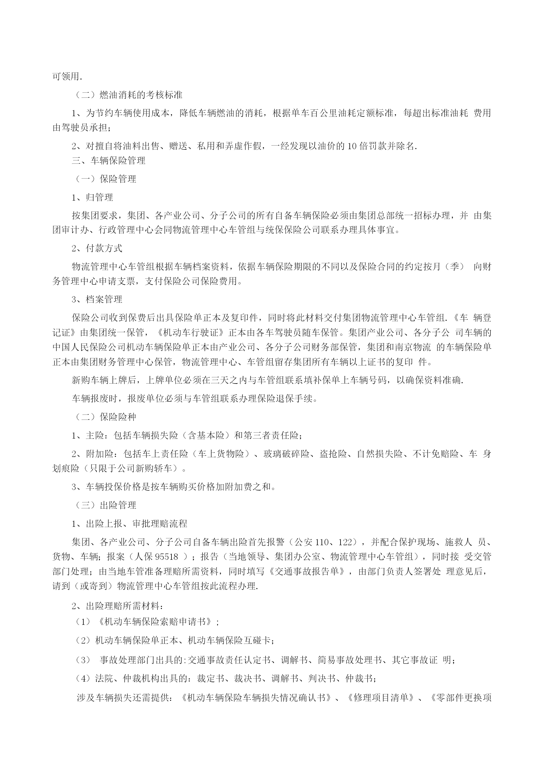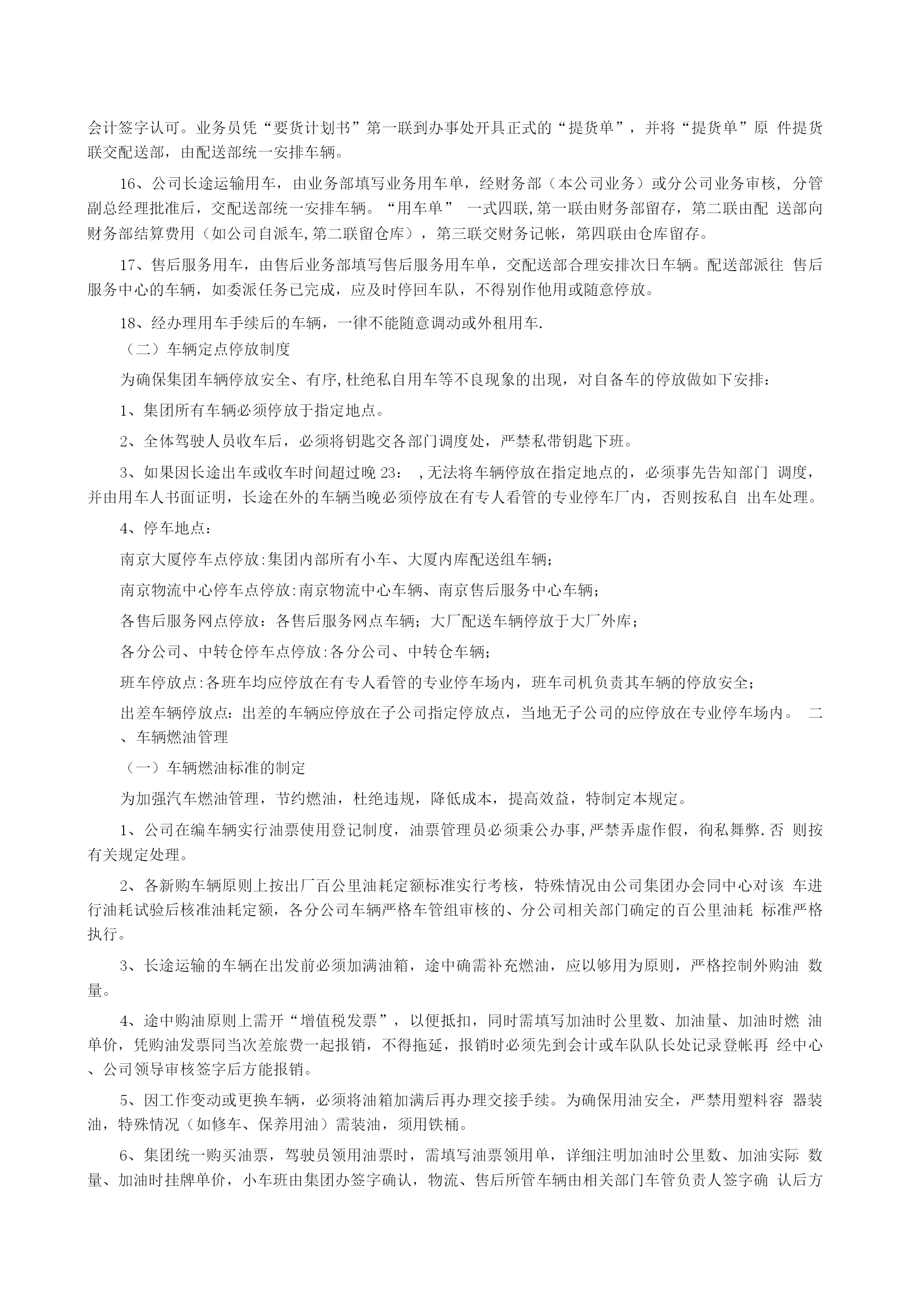 车辆管理操作手册目录第一节车辆配置用途及购置1.1车辆购置1。1.1自备车配置用途1.1.2新建物流中心(配送中心)车辆配置标准1。1。3影响购车车型和数量的因素2.1车辆定向采购制度第二节车辆运行与安全管理2.1车辆的使用及停放制度2.1.1车辆使用制度2。1。2车辆定点停放制度2.2车辆燃油管理1车辆燃油标准的制定2。2。2燃油消耗的考核标准2.3车辆保险管理2。3。1保险管理2。3.2保险险种2.3.3出险管理2。4安全行车管理2。4。1影响安全行车的因素2.4.2安全行车的规范2.4.3安全行车规定2.4。4安全行车处罚标准第三节车辆维修、更新、过户与报废3.1车辆维护、保养等级与周期3。1。1车辆维护、保养等级3.1.2车辆维护、保养周期3。2车辆维护、保养项目3。2。1日常维护项目3.2.2一级维护项目3。2.3二级维护项目3.3车辆大修3.3.1车辆大修送修标志3。3.2车辆总成大修送修标准3.4车辆保养、维修工时的标准3.5车辆维修质量的三包制度标准3。5。1一般维修(一、二级维护)3.5.2车辆大修、总成大修3.6定点维修、购件制度3.6。1定点维修厂标准3。6.2配件定点采购标准与程序3。7车辆的更新、过户与报废3。7。1车辆更新规定及流程3.7。2车辆过户规定及流程3.7.3车辆报废规定及流程第四节车辆费用管理4。1车辆费用的分类与预算的制定4.1。1车辆费用的分类4。1.2车辆预算的制定4。2车辆费用的审核、报销4。2。1申购新车费用的审核、报销4。2.2新车上牌办证费用审核、报销4.2。3常规费用的审核、报销4.2。4维修费用的审核、报销4。2.5油耗费用的审核、报销4.2。6其它费用审批流程4。2.7自备车运输附加费的审核、报销4.3运输费、汽油费的管理第五节报表及协议合同5.1报表5.1.1报表填写的要求5.12报表格式5.2协议合同第一节车辆配置用途及购置一、车辆购置(一)自备车配置用途1、行政办公用车根据所在城市行政级别(首都、省会、直辖市、地级市)、城市规模、公司在当地形象需要以及经营状况等参考因素,确定拟申购车型,购车报告由当地办公室起草、总经理确认后上报物流管理中心、财务管理中心审核、总裁办审批。2、售后服务用车主要用于跑单、拆装机、远距离安装作业,具体配置车型、数量由售后服务中心(部)根据作业需求上报地区管理中心、集团售后服务管理中心确认,后转交物流管理中心、财务管理中心审核、总裁办审批.3、物流用车主要用于零售配送、绿色通道的应急送货、跑单、中转仓提货、移库、外库员工交通车.其中:零售配送以满足淡季50%的作业量为基本配置原则,一般为大面包车、小面包、2丁以下货车;中转仓提货、移库则根据自提量、门店数配置,一般为2T-5T货车;同时根据城市规模、门店数量及分布状况配置跑单小面包车或大面包车(视当地当地实际情况而定)。申购报告报大区确认后,转报物流管理中心、财务管理中心审核,总裁办审批。(二)新建物流中心(配送中心)车辆配置标准、\车辆配置商场规模'\自备车配置省会/直辖市单店2个店追加3个店追加4个店追加5个店追加一-2-5吨车大面包小面包2-5吨车大面包小面包2—5吨车大面包小面包2-5吨车大面包小面包2—5吨车大面包小面包1110—10—101111—21-21221地级/地级市2-5吨车大面包小面包2—5吨车大面包小面包2—5吨车大面包小面包2-5吨车大面包小面包2-5吨车大面包小面包1110—10—10111000000县级市/县2-5吨车大面包小面包0.9—3吨车大面包小面包010-1100-1(三)影响购车车型和数量的因素1、各地公安、交管部门对各种车辆车型的不同管理,因此应按以下各种因素选择购车:(1)大货车市内白天禁止通行;市区禁区通行证发放数量多少;有些地方市区24小时禁止2T以上货车通行;是否允许厢式货车购置上牌、办证;大面包车既可送货,又可带人,用途广泛,不受市区道路限制;有些地方市区24小时禁止6座以上任何车辆通行(主要的商业繁华地段,步行街等);办理轿车、小客车牌证有无竞拍费用;购车有无控制指标;当地交通法规;当地环保部门的要求,比如排气量的限制等。2、各地子公司现有自备车辆数量不同、车型车况各异,因此应按以下各种因素选择增加或减少:原有自备车数量多少,业务配送量大小、配送商品品种的多少、配送商品范围;城市规模的大小、交通道路状况好坏,单车作业效率高低;中转仓自提与厂家送货的比例大小;商场、大库之间的距离远近,移、驳货途中时间的长短、单据