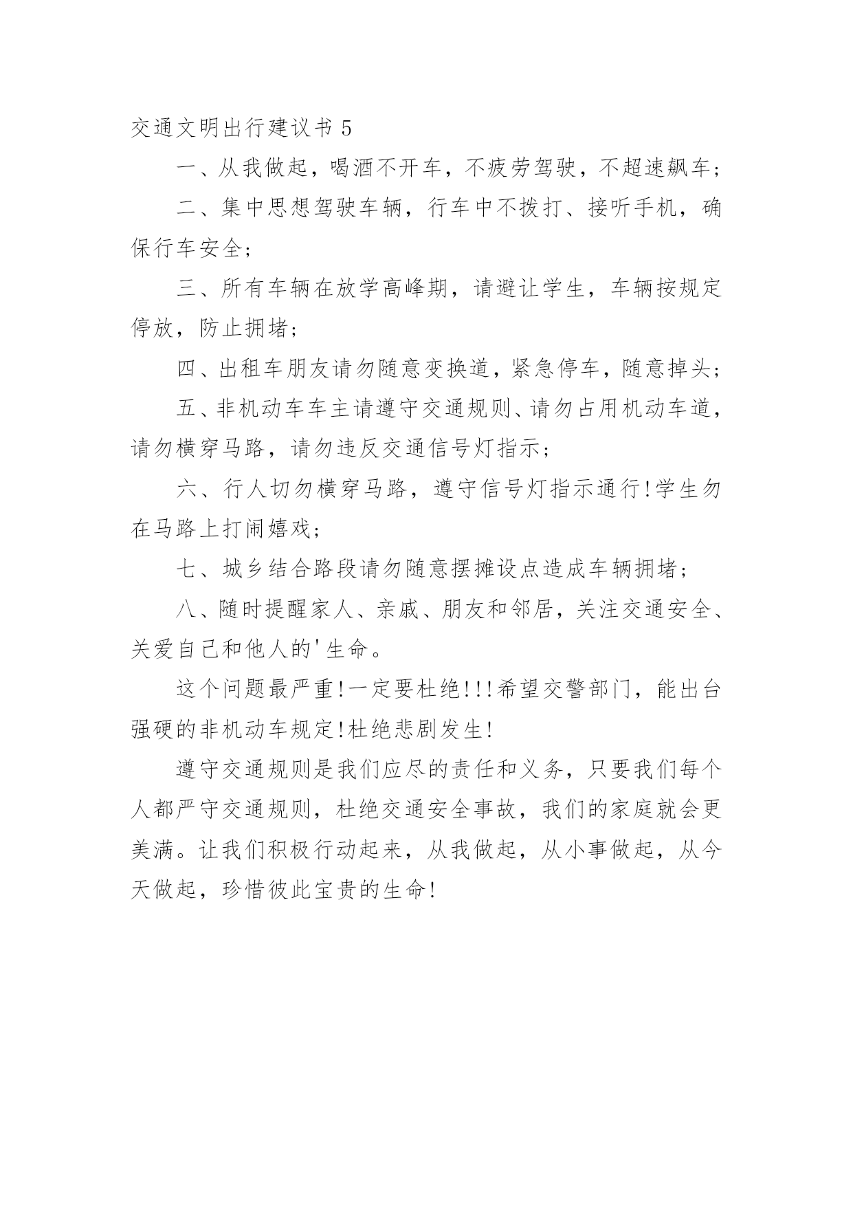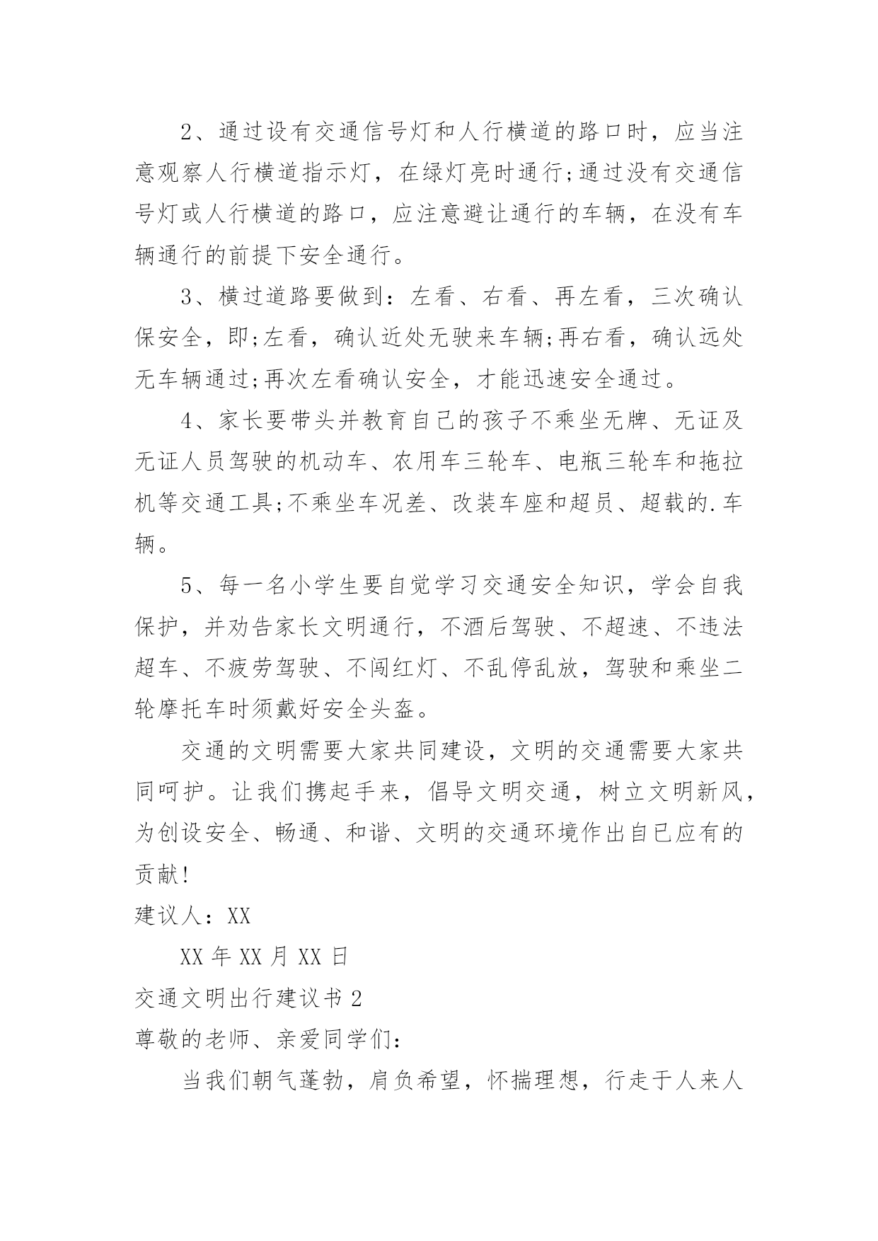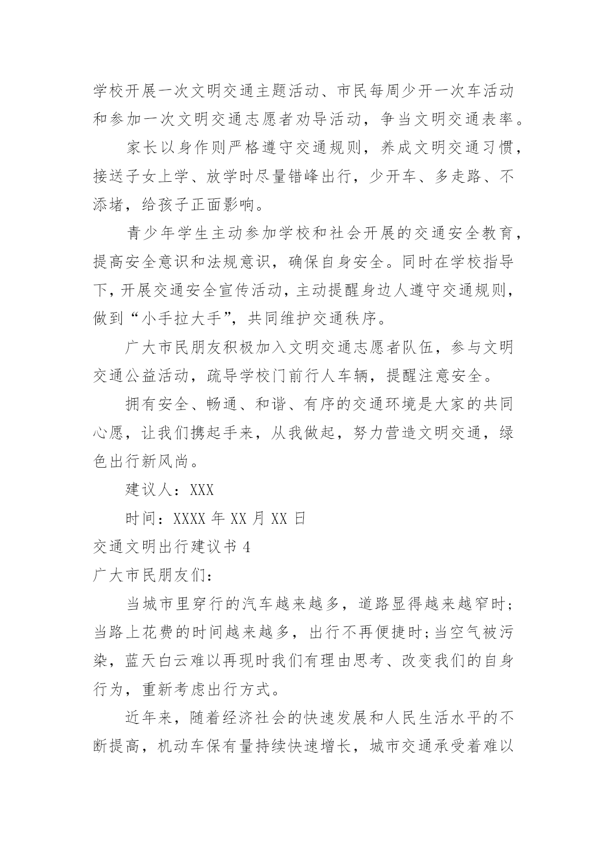 交通文明出行建议书交通文明出行建议书随着社会不断地进步,我们使用上建议书的情况与日俱增,建议书是就某项工作提出某种建议时使用的一种常用书信,要求具体明确,有针对性。你所见过的建议书是什么样的呢?下面是小编为大家收集的交通文明出行建议书,欢迎阅读,希望大家能够喜欢。交通文明出行建议书1尊敬的家长朋友、亲爱的同学们:大家好!为确保学生的出行安全,我校特开展了“文明交通绿色出行”的活动,因此我们建议同学们认真学习交通安全知识,提高交通安全意识和自我防护能力,同时希望家长朋友规范自己的交通行为,以自身的一言一行引导孩子养成良好的交通习惯。为此,我们建议全校师生及家长做到以下几点:1、在道路上行走时,要在人行道内行走或靠路边行走。不要在道路两侧嬉戏、追逐或长时间逗留,不要突然横过道路。横过道路时,必须从人行横道、天桥及其他行人过街设施通过;在通过人行横道时,也要注意观察来往车辆,加强自身安全防范。2、通过设有交通信号灯和人行横道的路口时,应当注意观察人行横道指示灯,在绿灯亮时通行;通过没有交通信号灯或人行横道的路口,应注意避让通行的车辆,在没有车辆通行的前提下安全通行。3、横过道路要做到:左看、右看、再左看,三次确认保安全,即;左看,确认近处无驶来车辆;再右看,确认远处无车辆通过;再次左看确认安全,才能迅速安全通过。4、家长要带头并教育自己的孩子不乘坐无牌、无证及无证人员驾驶的机动车、农用车三轮车、电瓶三轮车和拖拉机等交通工具;不乘坐车况差、改装车座和超员、超载的.车辆。5、每一名小学生要自觉学习交通安全知识,学会自我保护,并劝告家长文明通行,不酒后驾驶、不超速、不违法超车、不疲劳驾驶、不闯红灯、不乱停乱放,驾驶和乘坐二轮摩托车时须戴好安全头盔。交通的文明需要大家共同建设,文明的交通需要大家共同呵护。让我们携起手来,倡导文明交通,树立文明新风,为创设安全、畅通、和谐、文明的交通环境作出自已应有的贡献!建议人:XXXX年XX月XX日交通文明出行建议书2尊敬的老师、亲爱同学们:当我们朝气蓬勃,肩负希望,怀揣理想,行走于人来人往的宽阔街道时,是否注意到交通线上隐藏的危险呢?一组组惊人的数字、一幕幕惨不忍睹的画面、一个个载着锥心伤痛却又一去不返的年轻生命,这一切的矛头不约而同地指向了共同的事实;不遵守交通法规即是不珍爱自己的生命。我们拥有年轻的身躯、远大的志向,却往往会忽略交通安全这种“小事”。据统计,20xx年,全国发生交通事故23.9万起,造成67759人死亡,272125人受伤,平均每天死亡200多人。这一个个惊人的数字时时刻刻警示我们:对交通法规的忽视就是对安全的忽视、就是对生命的不负责任!亲爱的同学们,请珍爱生命,为自己,为家人,为爱我的人,为我爱的人,因为生命不仅仅属于自己!我们多么希望生活的每一天都五彩缤纷,每一天都能成为美好的记忆,为了你和家人的幸福,在此特向全体师生发出如下建议:一、崇尚守法的交通行为。自觉遵守交通法规,服从交警指挥和按照交通信号灯、交通标志标线行车、走路。二、崇尚礼让的交通行为。积极开展车让车、车让人、人让车、人让人的“四让”活动,自觉养成机动车、非机动车、行人相互礼让的良好习惯。三、崇尚文明的交通行为。坚持做到,行人走人行道,过马路走人行横道;乘坐公交车排队上车,不在车厢内随意丢弃杂物,不向车外乱扔杂物;主动为老弱病残孕乘客让座,最大限度地帮助他人,告别不文明交通行为。四、崇尚模范的'交通行为。行车走路,遵章守纪,争当遵守交通法规的模范,以自身良好的素质感染和带动其他交通参与者遵守信号、文明交通,在全社会营造“以遵纪守法为荣、以违法乱纪为耻”的良好氛围。五、崇尚安全的交通行为。树立“安全第一”的意识,不无证驾驶,不酒后驾车。遵守交通规则是我们所有人应尽的义务,是我们每个人不可推卸的责任。只要我们每个人都严守交通法规,我们的社会就会向着文明的彼岸又迈进一步。文明城市呼唤文明市民,文明市民争创文明城市,我们相信:人人文明一小步,社会前进一大步。让我们携起手来,从我做起,从小事做起,从今天做起,共同创造文明、平安、畅通、和谐的道路交通环境!建议人:XXX时间:XXXX年XX月XX日交通文明出行建议书3尊敬的各位家长、同学和市民朋友们:新学年即将开始,为了进一步增强全市中小学生和家长朋友的.文明交通意识和安全法规意识,增强参与文明交通的自觉性,缓解城市交通压力,消除学生出行安全隐患,营造未成年人成长的良好环境,进一步提升城市形象与市民生活品质,我们向全市家长、青少年学生和市民朋友们发出文明交通、绿色出行建议:倡导绿色出行、节能环保、低碳生活的健康理念,选择步行、骑车、公共交通等绿色出行方式。积极参加文明交通、绿色出行“五个一”活动,即:学生影响一位身边人文明出行活动、家长参加一次义务护学岗活动、学校开展一次文明