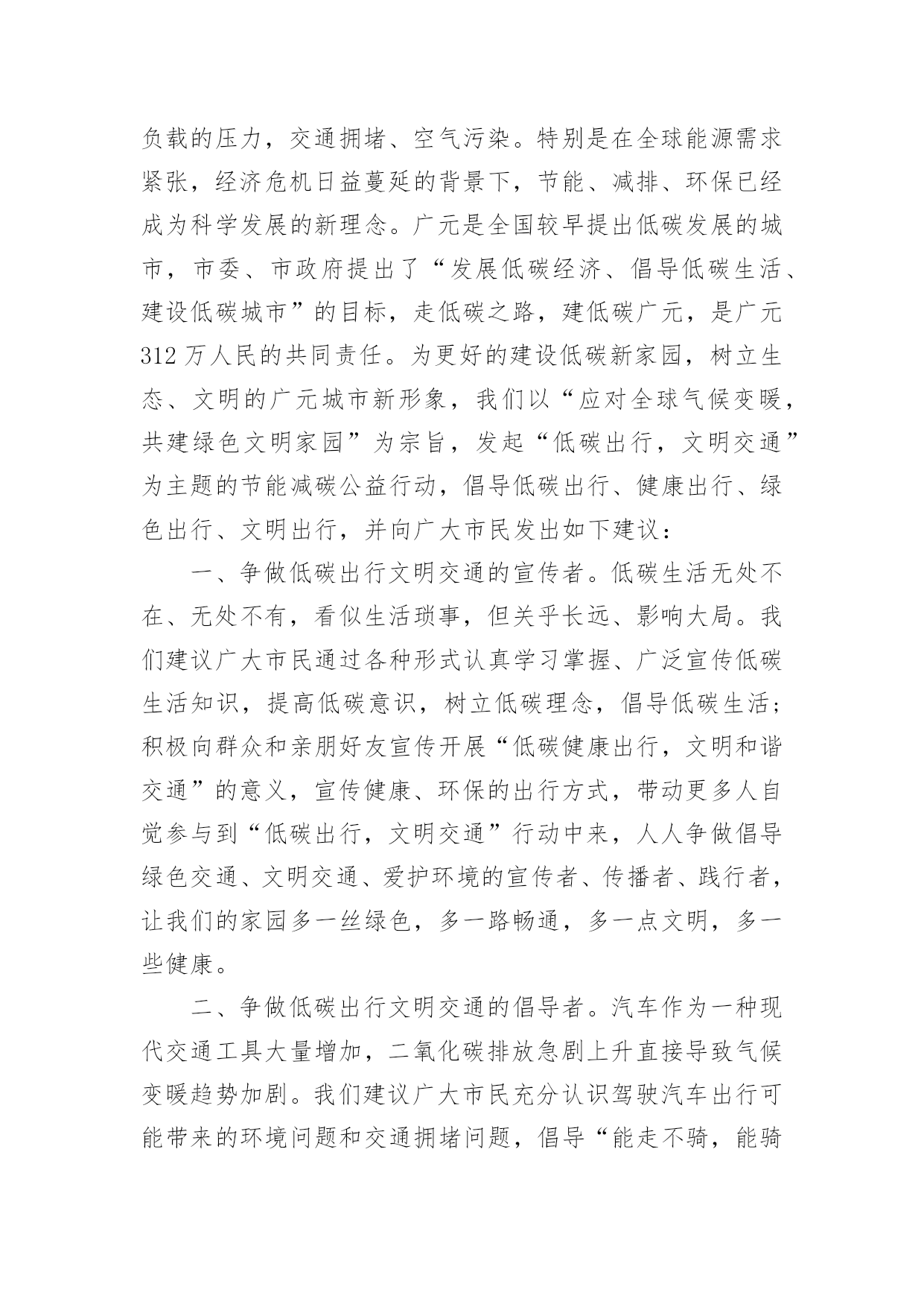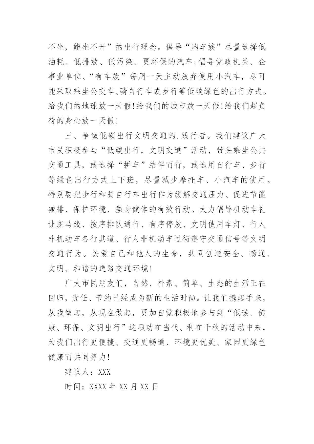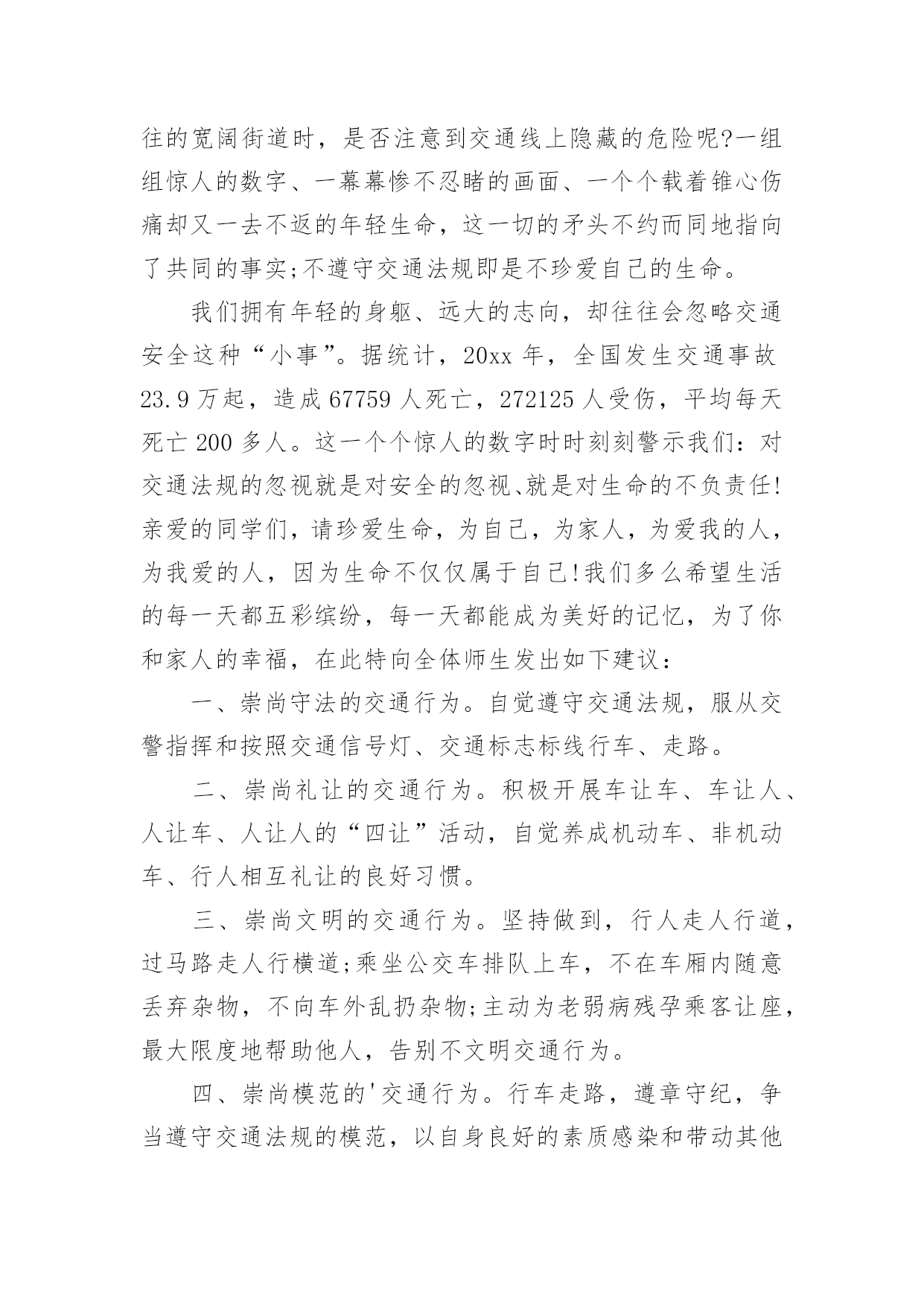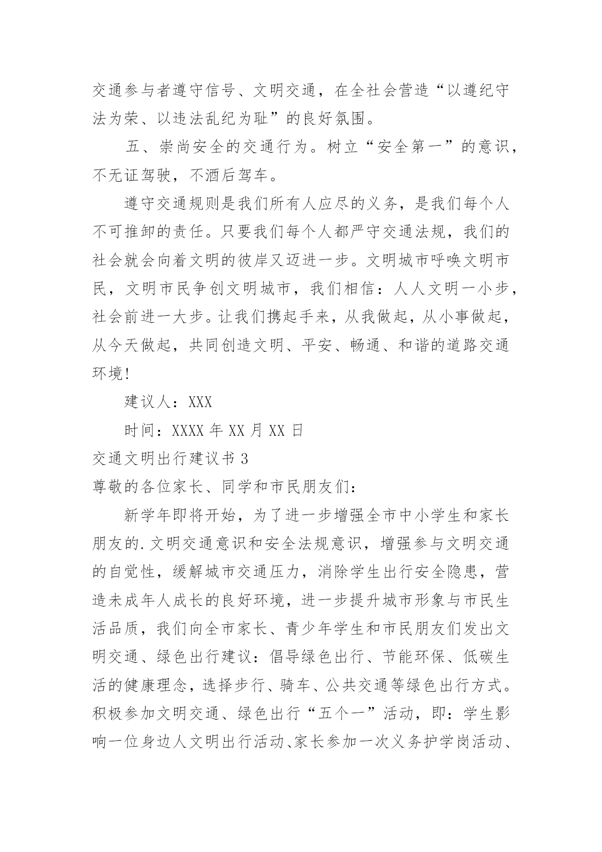 交通文明出行建议书交通文明出行建议书随着社会不断地进步,我们使用上建议书的情况与日俱增,建议书是就某项工作提出某种建议时使用的一种常用书信,要求具体明确,有针对性。你所见过的建议书是什么样的呢?下面是小编为大家收集的交通文明出行建议书,欢迎阅读,希望大家能够喜欢。交通文明出行建议书1尊敬的家长朋友、亲爱的同学们:大家好!为确保学生的出行安全,我校特开展了“文明交通绿色出行”的活动,因此我们建议同学们认真学习交通安全知识,提高交通安全意识和自我防护能力,同时希望家长朋友规范自己的交通行为,以自身的一言一行引导孩子养成良好的交通习惯。为此,我们建议全校师生及家长做到以下几点:1、在道路上行走时,要在人行道内行走或靠路边行走。不要在道路两侧嬉戏、追逐或长时间逗留,不要突然横过道路。横过道路时,必须从人行横道、天桥及其他行人过街设施通过;在通过人行横道时,也要注意观察来往车辆,加强自身安全防范。2、通过设有交通信号灯和人行横道的路口时,应当注意观察人行横道指示灯,在绿灯亮时通行;通过没有交通信号灯或人行横道的路口,应注意避让通行的车辆,在没有车辆通行的前提下安全通行。3、横过道路要做到:左看、右看、再左看,三次确认保安全,即;左看,确认近处无驶来车辆;再右看,确认远处无车辆通过;再次左看确认安全,才能迅速安全通过。4、家长要带头并教育自己的孩子不乘坐无牌、无证及无证人员驾驶的机动车、农用车三轮车、电瓶三轮车和拖拉机等交通工具;不乘坐车况差、改装车座和超员、超载的.车辆。5、每一名小学生要自觉学习交通安全知识,学会自我保护,并劝告家长文明通行,不酒后驾驶、不超速、不违法超车、不疲劳驾驶、不闯红灯、不乱停乱放,驾驶和乘坐二轮摩托车时须戴好安全头盔。交通的文明需要大家共同建设,文明的交通需要大家共同呵护。让我们携起手来,倡导文明交通,树立文明新风,为创设安全、畅通、和谐、文明的交通环境作出自已应有的贡献!建议人:XXXX年XX月XX日交通文明出行建议书2尊敬的老师、亲爱同学们:当我们朝气蓬勃,肩负希望,怀揣理想,行走于人来人往的宽阔街道时,是否注意到交通线上隐藏的危险呢?一组组惊人的数字、一幕幕惨不忍睹的画面、一个个载着锥心伤痛却又一去不返的年轻生命,这一切的矛头不约而同地指向了共同的事实;不遵守交通法规即是不珍爱自己的生命。我们拥有年轻的身躯、远大的志向,却往往会忽略交通安全这种“小事”。据统计,20xx年,全国发生交通事故23.9万起,造成67759人死亡,272125人受伤,平均每天死亡200多人。这一个个惊人的数字时时刻刻警示我们:对交通法规的忽视就是对安全的忽视、就是对生命的不负责任!亲爱的同学们,请珍爱生命,为自己,为家人,为爱我的人,为我爱的人,因为生命不仅仅属于自己!我们多么希望生活的每一天都五彩缤纷,每一天都能成为美好的记忆,为了你和家人的幸福,在此特向全体师生发出如下建议:一、崇尚守法的交通行为。自觉遵守交通法规,服从交警指挥和按照交通信号灯、交通标志标线行车、走路。二、崇尚礼让的交通行为。积极开展车让车、车让人、人让车、人让人的“四让”活动,自觉养成机动车、非机动车、行人相互礼让的良好习惯。三、崇尚文明的交通行为。坚持做到,行人走人行道,过马路走人行横道;乘坐公交车排队上车,不在车厢内随意丢弃杂物,不向车外乱扔杂物;主动为老弱病残孕乘客让座,最大限度地帮助他人,告别不文明交通行为。四、崇尚模范的'交通行为。行车走路,遵章守纪,争当遵守交通法规的模范,以自身良好的素质感染和带动其他交通参与者遵守信号、文明交通,在全社会营造“以遵纪守法为荣、以违法乱纪为耻”的良好氛围。五、崇尚安全的交通行为。树立“安全第一”的意识,不无证驾驶,不酒后驾车。遵守交通规则是我们所有人应尽的义务,是我们每个人不可推卸的责任。只要我们每个人都严守交通法规,我们的社会就会向着文明的彼岸又迈进一步。文明城市呼唤文明市民,文明市民争创文明城市,我们相信:人人文明一小步,社会前进一大步。让我们携起手来,从我做起,从小事做起,从今天做起,共同创造文明、平安、畅通、和谐的道路交通环境!建议人:XXX时间:XXXX年XX月XX日交通文明出行建议书3尊敬的各位家长、同学和市民朋友们:新学年即将开始,为了进一步增强全市中小学生和家长朋友的.文明交通意识和安全法规意识,增强参与文明交通的自觉性,缓解城市交通压力,消除学生出行安全隐患,营造未成年人成长的良好环境,进一步提升城市形象与市民生活品质,我们向全市家长、青少年学生和市民朋友们发出文明交通、绿色出行建议:倡导绿色出行、节能环保、低碳生活的健康理念,选择步行、骑车、公共交通等绿色出行方式。积极参加文明交通、绿色出行“五个一”活动,即:学生影响一位身边人文明出行活动、家长参加一次义务护学岗活动、学校开展一次文明