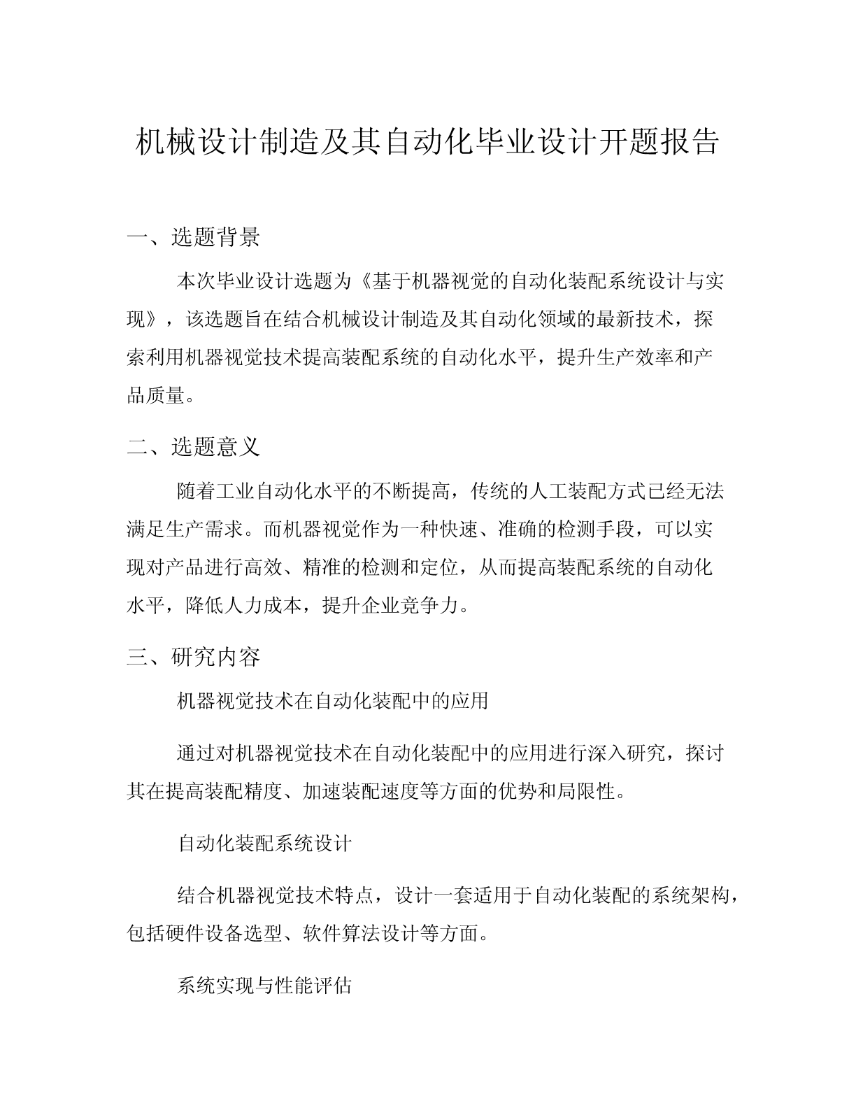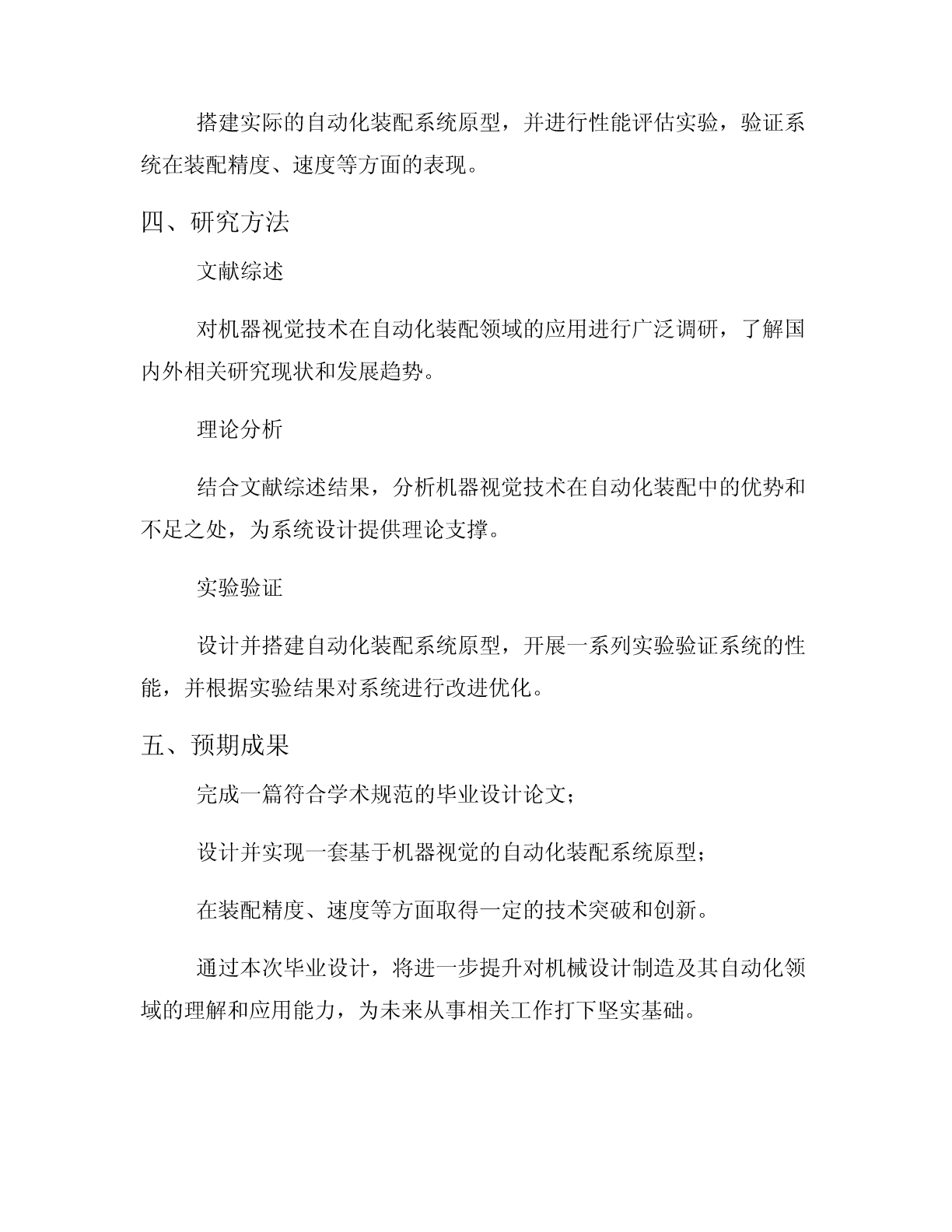 机械设计制造及其自动化毕业设计开题报告一、选题背景本次毕业设计选题为《基于机器视觉的自动化装配系统设计与实现》,该选题旨在结合机械设计制造及其自动化领域的最新技术,探索利用机器视觉技术提高装配系统的自动化水平,提升生产效率和产品质量。二、选题意义随着工业自动化水平的不断提高,传统的人工装配方式已经无法满足生产需求。而机器视觉作为一种快速、准确的检测手段,可以实现对产品进行高效、精准的检测和定位,从而提高装配系统的自动化水平,降低人力成本,提升企业竞争力。三、研究内容机器视觉技术在自动化装配中的应用通过对机器视觉技术在自动化装配中的应用进行深入研究,探讨其在提高装配精度、加速装配速度等方面的优势和局限性。自动化装配系统设计结合机器视觉技术特点,设计一套适用于自动化装配的系统架构,包括硬件设备选型、软件算法设计等方面。系统实现与性能评估搭建实际的自动化装配系统原型,并进行性能评估实验,验证系统在装配精度、速度等方面的表现。四、研究方法文献综述对机器视觉技术在自动化装配领域的应用进行广泛调研,了解国内外相关研究现状和发展趋势。理论分析结合文献综述结果,分析机器视觉技术在自动化装配中的优势和不足之处,为系统设计提供理论支撑。实验验证设计并搭建自动化装配系统原型,开展一系列实验验证系统的性能,并根据实验结果对系统进行改进优化。五、预期成果完成一篇符合学术规范的毕业设计论文;设计并实现一套基于机器视觉的自动化装配系统原型;在装配精度、速度等方面取得一定的技术突破和创新。通过本次毕业设计,将进一步提升对机械设计制造及其自动化领域的理解和应用能力,为未来从事相关工作打下坚实基础。