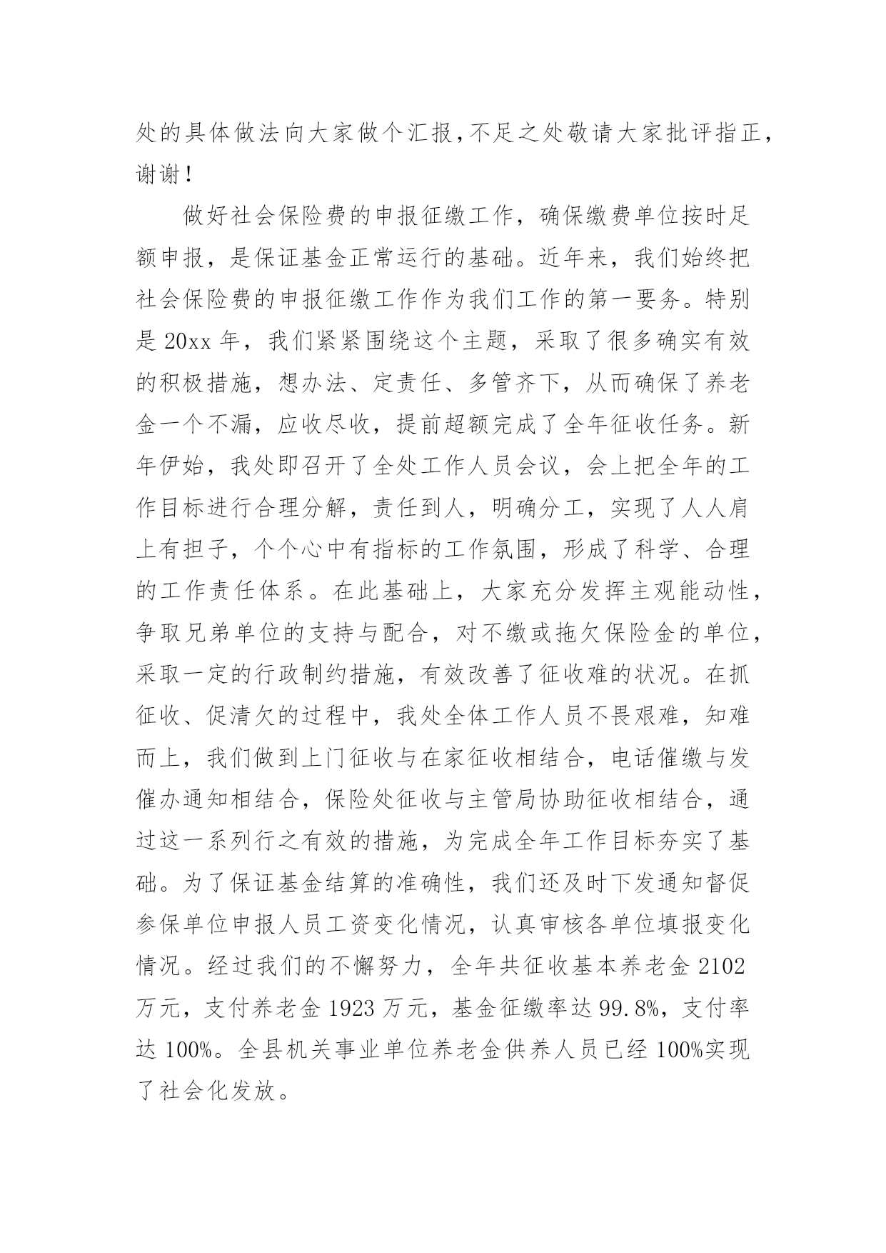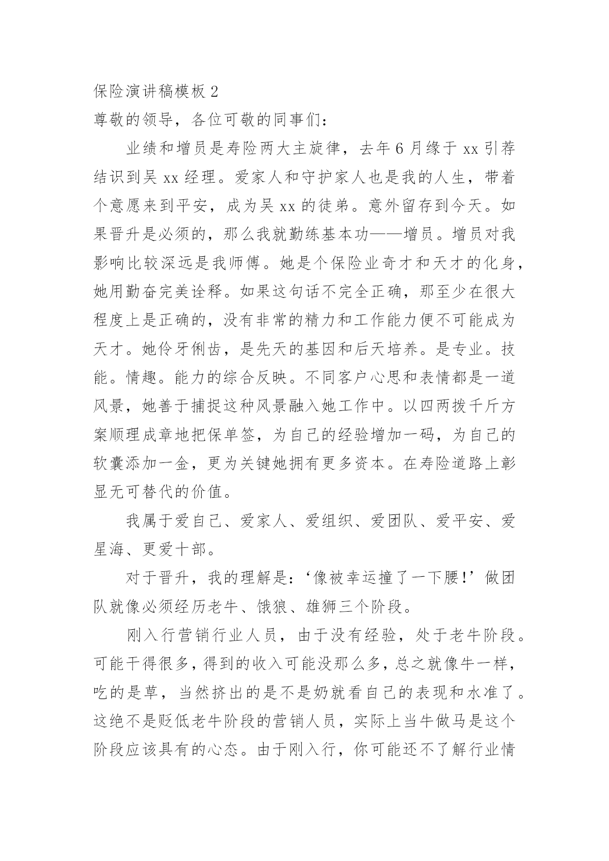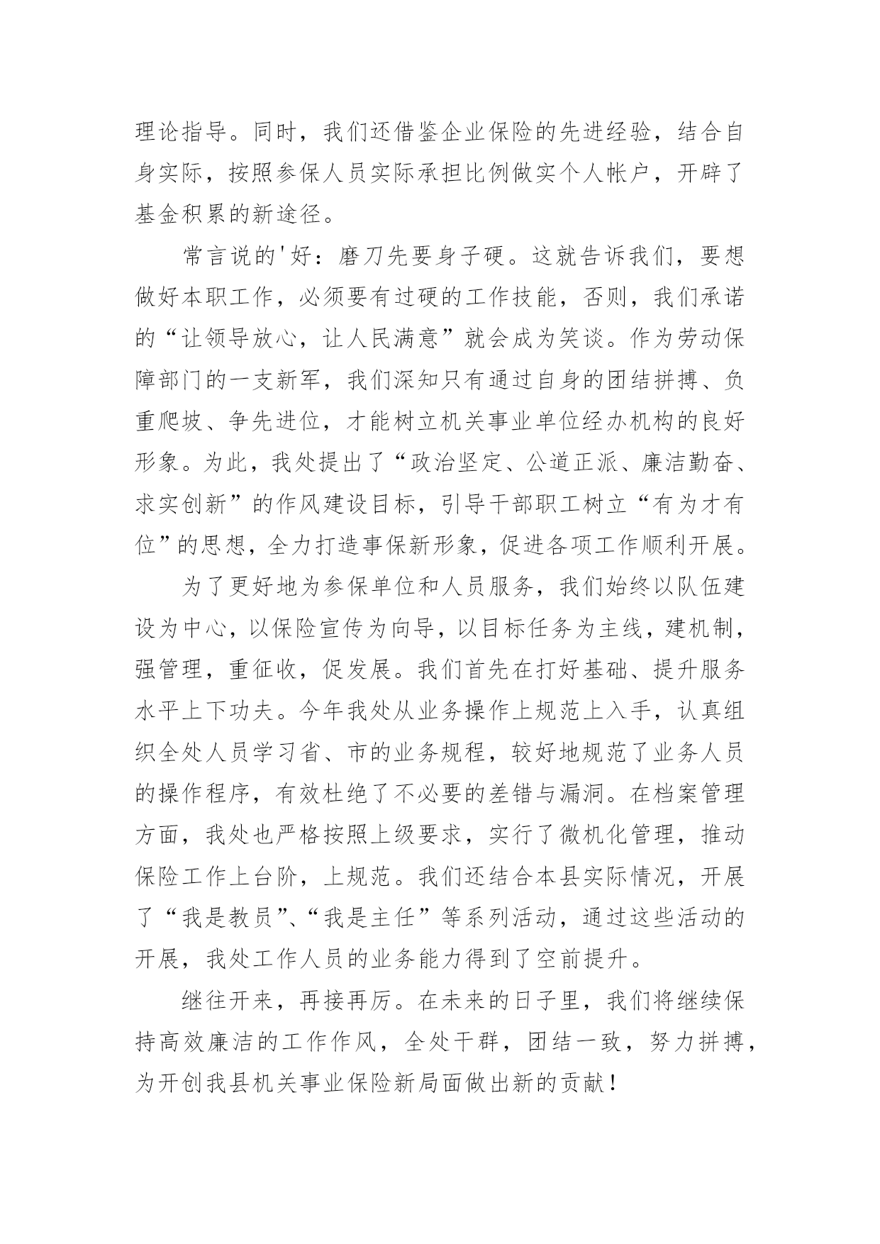 保险演讲稿保险演讲稿模板演讲稿具有逻辑严密,态度明确,观点鲜明的特点。在我们平凡的日常里,演讲稿在我们的视野里出现的频率越来越高,怎么写演讲稿才能避免踩雷呢?下面是小编整理的保险演讲稿模板,希望能够帮助到大家。保险演讲稿模板1尊敬的各位领导、同志们:大家好!谢谢大家给我这个机会,让我代表盱眙县机关事业保险处、荣幸地站在这个讲台上为大家演讲。我演讲的题目是《规范操作,稳步推进,努力开创机关事业保险新局面》。随着机关、的不断深入,社会各界对机关事业养老保险制度改革关心程度和要求也越来越高。如何在新形势下快速提高社保经办能力,确实做好养老金的征缴与发放,以及基金的保值增值等工作,是摆在我们机关事业保险处每位工作人员面前的现实问题。近年连来,我们机关事业养老保险处在市中心和县局领导的关心支持、正确领导下,全处工作人员大力发扬“创新、创新、创先”的精神,团结奋进、开拓进取、外树形象、内抓管理,使得我处各项工作都有了突破性进展。下面就把我处的具体做法向大家做个汇报,不足之处敬请大家批评指正,谢谢!做好社会保险费的申报征缴工作,确保缴费单位按时足额申报,是保证基金正常运行的基础。近年来,我们始终把社会保险费的申报征缴工作作为我们工作的第一要务。特别是20xx年,我们紧紧围绕这个主题,采取了很多确实有效的积极措施,想办法、定责任、多管齐下,从而确保了养老金一个不漏,应收尽收,提前超额完成了全年征收任务。新年伊始,我处即召开了全处工作人员会议,会上把全年的工作目标进行合理分解,责任到人,明确分工,实现了人人肩上有担子,个个心中有指标的工作氛围,形成了科学、合理的工作责任体系。在此基础上,大家充分发挥主观能动性,争取兄弟单位的支持与配合,对不缴或拖欠保险金的单位,采取一定的行政制约措施,有效改善了征收难的状况。在抓征收、促清欠的过程中,我处全体工作人员不畏艰难,知难而上,我们做到上门征收与在家征收相结合,电话催缴与发催办通知相结合,保险处征收与主管局协助征收相结合,通过这一系列行之有效的措施,为完成全年工作目标夯实了基础。为了保证基金结算的准确性,我们还及时下发通知督促参保单位申报人员工资变化情况,认真审核各单位填报变化情况。经过我们的不懈努力,全年共征收基本养老金2102万元,支付养老金1923万元,基金征缴率达99.8%,支付率达100%。全县机关事业单位养老金供养人员已经100%实现了社会化发放。在认真做好养老保险金征缴的基础上,我处还着力加强基金管理,确保基金安全,实现保值增值。我们始终坚持“专户存储,专款专用”制度,严格执行省厅规定的不炒股、不借贷、不担保的“三不”原则。在保证足够支付离退休人员养老金的基础上,我们及时会同财政部门将结余基金转存银行定期,形成基金的积累率、增值率和安全性的“三高”特点。在对基金的收缴、拨付、财务管理等方面,我们都有严格的内部审核制度,从而杜绝了人为因素造成的“跑冒滴漏”。针对虚报冒领养老金以及基金征收标准不足实的情况,我处严把稽核关,我们与人事局、民政局等单位紧密配合,对未缴齐养老金人员不予办理离退休手续,对机关事业单位已供养人员生存状况及时审核,使得上述现象得到有效遏制。全年实地稽核、日常稽核、离退休人员的生存稽核以及领取养老金稽核等工作,均在全市保持领先位置。面对新问题,接受新挑战。在“差额缴拨”改为“全额缴拨”过程中,我处结合县情,制定了一整套工作方案,确保了该项工作得以顺利开展。改革之初,我处即在全处工作会议上统一思想,加强认识,并与部分参保单位负责人与经办人员、离退休人员座谈,让他们正确认识“差改全”的意义,取得了他们的支持,使得该项改革得以稳妥推进。近年来,我们对全县234家单位实施改革试点,试点率高达75%,超额完成了市局下达的考核目标。我处还抽调专人针对机关事业保险工作特点和现状,就如何做实个人帐户进行认真调研,然后形成文字材料,为我们开展该项工作提供了科学的理论指导。同时,我们还借鉴企业保险的先进经验,结合自身实际,按照参保人员实际承担比例做实个人帐户,开辟了基金积累的新途径。常言说的'好:磨刀先要身子硬。这就告诉我们,要想做好本职工作,必须要有过硬的工作技能,否则,我们承诺的“让领导放心,让人民满意”就会成为笑谈。作为劳动保障部门的一支新军,我们深知只有通过自身的团结拼搏、负重爬坡、争先进位,才能树立机关事业单位经办机构的良好形象。为此,我处提出了“政治坚定、公道正派、廉洁勤奋、求实创新”的作风建设目标,引导干部职工树立“有为才有位”的思想,全力打造事保新形象,促进各项工作顺利开展。为了更好地为参保单位和人员服务,我们始终以队伍建设为中心,以保险宣传为向导,以目标任务为主线,建机制,强管理,重征收,促发展。我们首先在打好基础、提升服务水平上下功夫。今年我处从业务操作上规范上入手,认