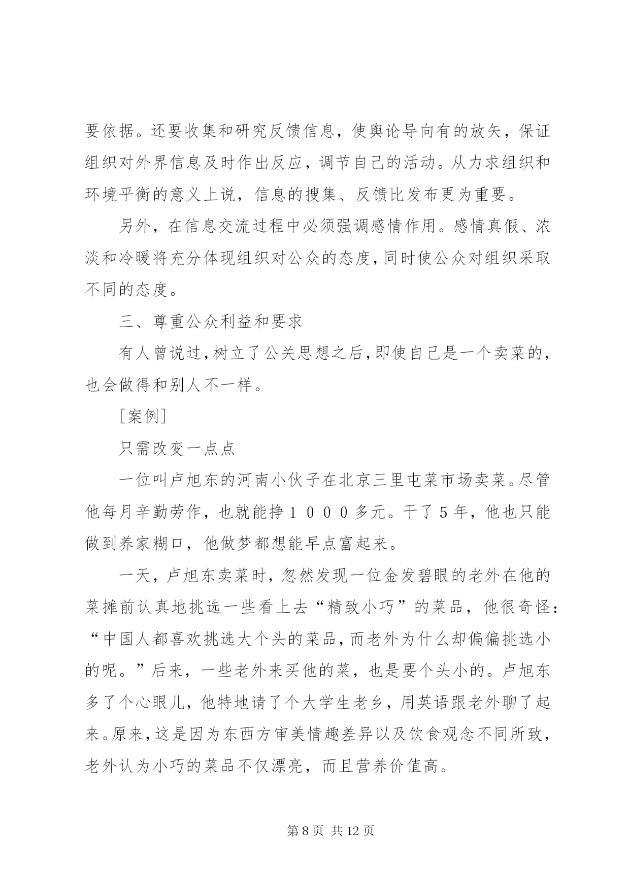 第PAGE\*Arabic\*MERGEFORMAT12页共NUMPAGES\*MERGEFORMAT12页公共关系工作的基本原则第三章公共关系的基本思想与基本原则第一节公共关系的基本思想越来越多的人已经意识到,个人与集体的发展都离不开一个和谐的社会关系。和谐的社会关系,既包括人与人的关系,人与社会集团的关系,也包括社会集团与社会集团的关系。人或社会集团的发展,也可以说是竞争,或是自我价值的实现,都离不开良好的人际关系。而各个组织有其各自不同的特点,但就现代组织管理的共同规律而言,一些基本的公共关系思想是所有的组织都必须遵循的。因此,在现代组织中,从最高领导到每一个普通成员,树立正确的公共关系思想是该组织取得成功的基础。一、珍视信誉、重视形象现在的大学生,形象推广意识都很强。其一,相当多的学生社团(时值新生入学,社团宣传活动很是热闹:街舞、剧社、跆拳道、轮滑、计算机学社等),特别是新成立的社团都拥有象征组织形象的徽记、章程、甚至口号、旗帜等;强调其个性化,突出其的与从不同;这在一定程度上已经和企业的组织识别系统有效的联系并运用起来;另外,部分社团还自制问卷进行舆论调查或民意测验,以提高该组织在广大同学中的知名度、美誉度,不断完善自我的公众形象。其二:即个人形象,原有的传统伦理教育模式遵循的“心灵美”为主导的大众审美观已经在悄悄改变,每年高校都有一批学子要走向社会,为了更好的推销自己,他们除了通过书面材料强调自己的能力水平和知识结构、完成知我形象的公关策划以外;更注重了自己的形象推广,仪表装饰;这是对社会开放的一种适应,更重要的是适应了社会的发展。[案例]顾客争座时,肯德基怎么办。2000年8月,江西第一家肯德基餐厅落户南昌,开张数周,一直人如蜂拥,非常火爆。不想一月未到,即有顾客因争座被殴打而向报社投诉肯德基,造成一场不小的风波。事件经过大致如下:一位女顾客用所携带物品占座位后去排队购买套餐时,座位被一位男顾客坐住而发生争执。先是两位顾客因争座发生口角,尽管已引起其他顾客的注意,但都未太在意,此时餐厅的员工未能及时平息两人的争端。接着两人争吵上升到大声争吵,店内所有顾客则都开始关注事态,邻座的顾客则停止用餐,离座回避,带小孩的家长担心事态危险和小孩受到粗话影响,开始领着小孩离店。最后二人争吵上升到斗殴,男顾客大打出手,殴伤女顾客后离店,别的顾客也纷纷离座外逃和远远地看热闹。女顾客非常气愤,当即要求肯德基餐厅对此事负责,并加以赔偿。到此时,其影响面还局限于人际范围,如果餐厅经理能满足顾客的要求,女顾客就不至于向报社投诉。但餐厅经理表示“这是顾客之间的事情,肯德基不应该负责”,拒绝了女顾客的要求。女顾客马上打电话向《南昌晚报》和《江南都市报》两报投诉。两报立即派出记者到场采访。女顾客陈述了事件的经过并坚持自己的要求,而餐厅经理在接受采访时对女顾客被殴表示同情和遗憾,但是认为餐厅没有责任,不能做出道歉和赔偿。两报很快对此事作了报道,结果引起众多市民的议论和有关法律专家的关注。事后,根据消费者权益保护法,肯德基被认为对此事负有部分责任,向女顾客公开道歉,并赔偿了部分医药费,两报对此也都作了后续报道。[案例评解]培养员工的公关思想(意识)十分重要。目前不少公司的员工宁可输掉公司的形象也不愿输理,因小失大,就源于公关意识的薄弱,看不到形象作为无形资产对于公司的巨大价值。公关不只是公关部的责任,进行员工素质培养,推选全员公关,是各种社会组织不应忽视的。在这个案例中“肯德基”是作为一个组织形象存在的,所谓“组织形象”,指的是社会公众对该组织以完整的要求和标准衡量所得的总体印象和评价。公关的组织形象管理:就是公关人员通过信息的有效传播和关系的协调,积极引导社会舆论,让自己所服务的组织的内外公众接受、认同这一组织各种感性行为,从而在公众面前树立组织的良好形象,以获得公众的好评的过程。既然每个人都代表组织形象,那么全体成员都必须具备公共关系意识,每个人都要注重组织形象和信誉,全体成员都应该参与公共关系工作,并按照公共关系的要求进行工作。对员工来说,一方面努力使自己的形象符合组织要求,另一方面也要以自己的努力为组织良好形象的树立添砖加瓦。北京申奥期间有一个著名的出租车司机,就就以自己的行动为北京在来访的国际奥委会委员心中树立了良好形象。[案例]申奥期间著名的出租车司机孟景山【中国2001年申奥成功】2000年7月18日晚上9时30分,被美国记者称为“世界上最聪明司机”的中国北京出租汽车司机孟景山终于被我们找到了。美国的亚特兰大曾经成功地举办了1996年的奥运会,前不久,当地最大的报纸《政宪报》的专栏作家凯斯·格雷汉姆专程来到我国,对我国申办奥运的情况进行了为期一周的采访。回国后,凯斯先生写了3篇文章,在文章中提到了一个名叫孟