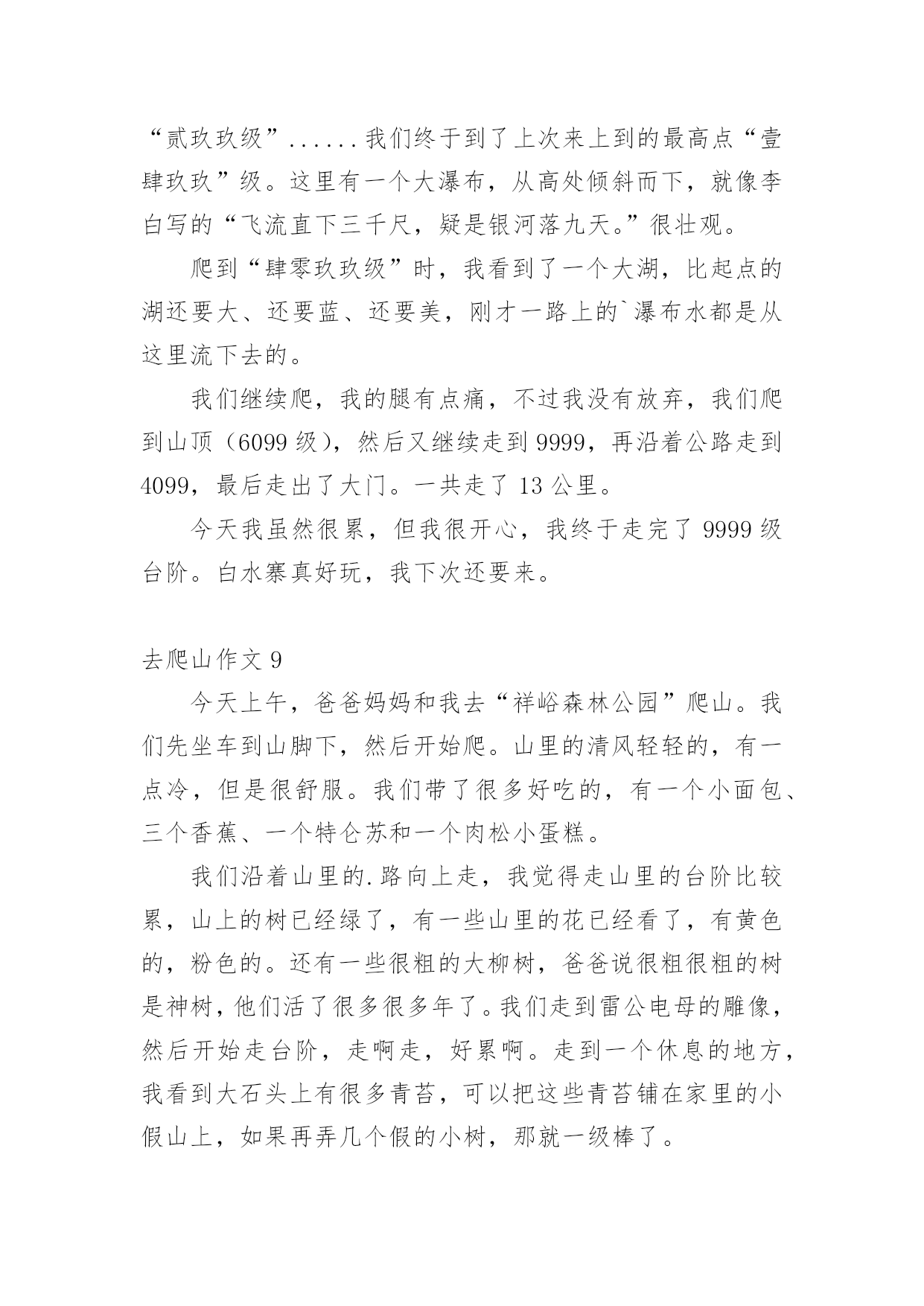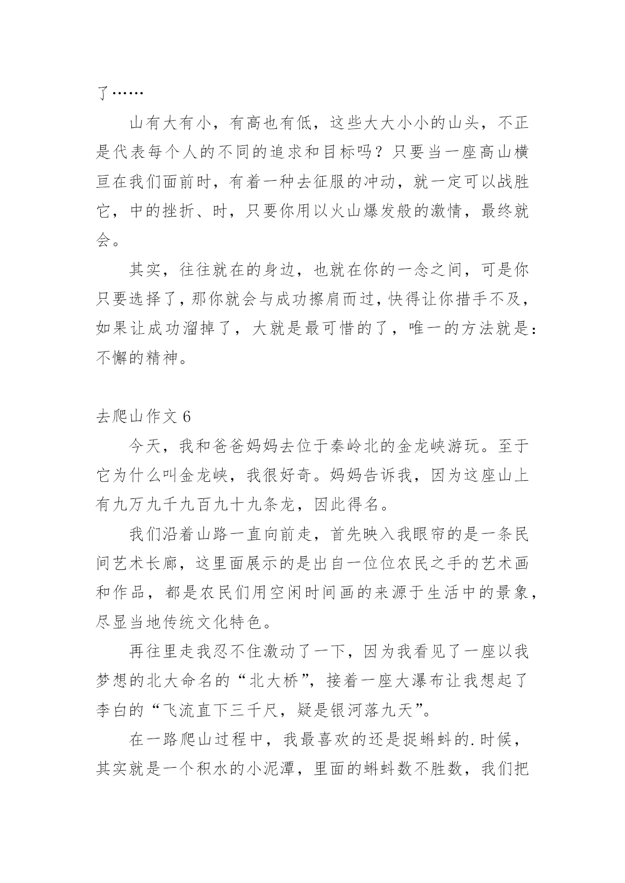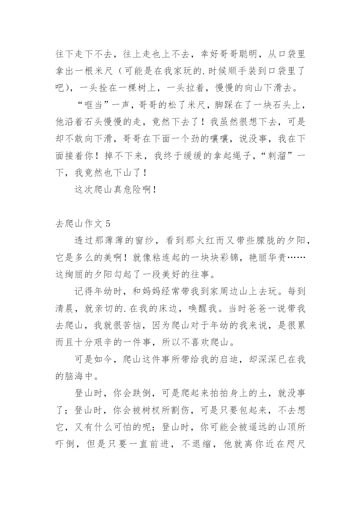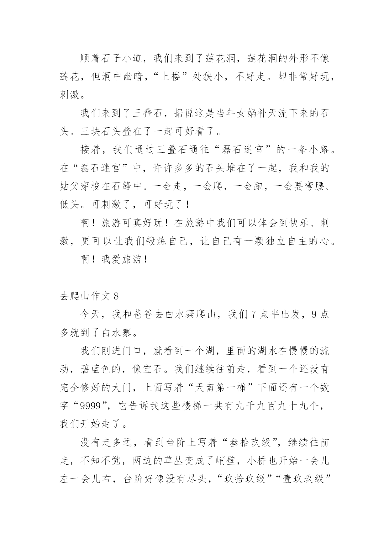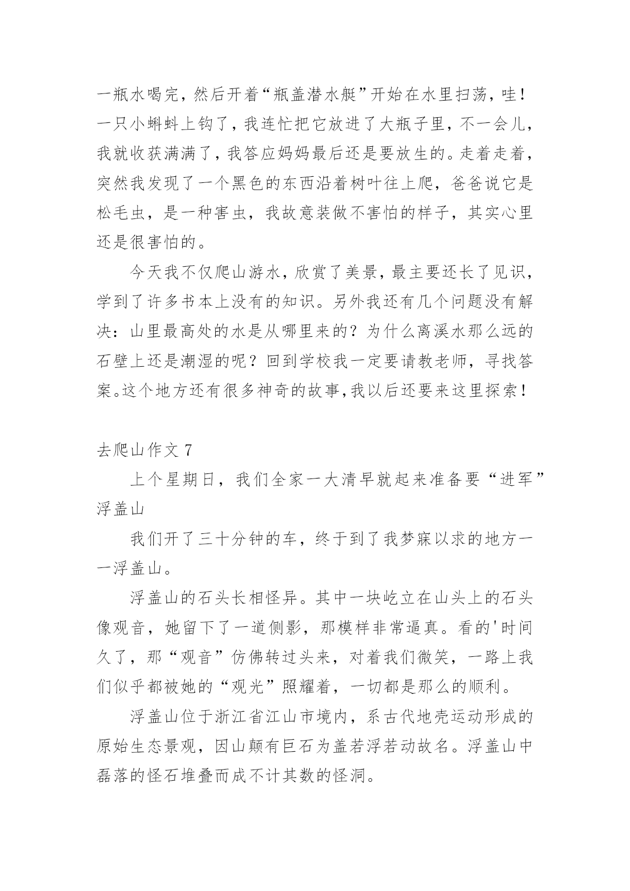 去爬山作文去爬山作文15篇(通用)在平日的学习、工作和生活里,大家或多或少都会接触过作文吧,借助作文可以宣泄心中的情感,调节自己的心情。那么你知道一篇好的作文该怎么写吗?以下是小编帮大家整理的去爬山作文,希望对大家有所帮助。去爬山作文1星期六的早上阳光灿烂,我和爸爸一起去元美公园爬山。一踏进元美公园,远处就飘来一阵阵扑鼻而来的花香,小鸟在树上吱吱渣渣像唱着美丽动人的歌声,来欢迎我们到来。远处看见石子铺的小路上,脚底高低不平,好像是在踩鹅卵石似的。我们来到山脚下,抬头向上看,那从山脚一直蔓延到台顶的台阶,台阶上三三两两的人群正兴致勃勃地向上爬,我已经迫不及待了,不等爸爸就迈开了脚步,向上爬,一阶,二阶,三阶……。不一会儿,我就爬到了半腰,感受着习习而来的微风,密密麻麻的树像给我们遮太阳,一阵悦耳的`鸟鸣声在我耳旁飞过,这时爸爸还在山脚呢,我心里暗自高兴。渐渐的,我的体力有些不支脚上似乎绑了块大石头,变得越来越沉重,这时,我看见前方不远有一张石凳,爬到石凳前,就马上坐在石凳上,微风吹来,使人精神气爽,我再也不想站起来了。爸爸赶上来了,拉着我让我接着爬,我跟爸爸说想放弃,爬不动了。爸爸鼓励对我说:“坚持就是胜利”我一鼓作气着站起来,拼命向上爬。不知不觉中,汗水流满了我的额头。亲近大自然,感受果然不一样,这次爬山,让我觉得大自然很可爱,以后要多来这座小山走走。去爬山作文2我爱我的爸爸,他在大柳塔工程项目部工作,星期一至星期五都不能回家,只有星期放和星期天才可以陪我,正因为这样所以我总是在星期五下放学后一口气把家庭作业全部写完,爸爸便会和我一起登山,一起到公园玩……上个星期的星期天,我和爸爸一起去爬山,我们在星期六晚上就把第二天要用的东西都准备好了。爸爸平时陪我到处玩,爬二郎山还是第一次,我多少有些兴奋不已,同时也在担心,二郎山那么高,我能爬上去吗?就这样,我想着想着就睡着了。第二天七点过了三十分,我和爸爸简单梳洗了一下,便近不及待地出发了。我们一路上走走停停欣赏美丽的景色。到了山顶,我渴好渴,爸爸从身上搜了搜,“没带水。”爸爸无奈地说,“不过我得继续,要坚持哦!”说完领着我又开始了我们的游玩程。“哦!终于到终点了!可是怎么下山呀!?”我欢呼着,但是目光很快又暗淡下来,“要是有一对翅膀该多好啊!”“别灰心,只要坚持就是一对翅膀”。爸爸的.这句话,仿佛帮我把心里的重担一下子都扔去了,使我轻松无比。下山了,我心里想,真得感谢爸爸,是他使我坚持走到山顶,又下了山,要不,我这次爬山就半途而废了。每个假期,只要爸爸一有时间就会陪着我玩,因为只要我过得开心,就是爸爸最大的幸福。去爬山作文3今天早上,在淡蓝色的天空下,湿气笼罩着金顶山,显得安宁又祥和,她仿佛是一位老人在洞察人世的一切。我和妈妈来到山脚下看着这高大而又俊朗的'山峰,我想站在山顶上看,会不会看见整个片区的容貌,说干就干,我就带着疑问开始了我们的征程。妈妈一声令下:“开始!”我就像离弦的箭一样,一路狂奔,像一只灵巧的小猴,在林中穿梭着,把气喘虚虚的妈妈远远地甩在了后面,我们继续爬着,慢慢地,我有些力不从心了,妈妈渐渐地赶了上来。妈妈说:“这是锻炼毅力的好时机。”我自言自语地说:“不到长城非好汉,不到山顶非英雄。”我屏着气,咬着牙,坚持着。汗水湿透了我的全身,迈着沉重的步伐,我继续向上攀登,功夫不负有心人,我终于看到了山顶,我惊喜地对妈妈说:“到了,到了。”我飞快地跑到草地上,仰面倒了下来,凉风吹来,太爽了!太爽了!我突然想起我的疑问,我跑到山顶边往下一看,果然不出我所料,整个片区尽收眼底。太美了!不经历风雨怎见彩虹,不虚此行啊!在大自然中我感到无比的振奋,竹笋告诉我要好奇探索,小草告诉我要努力向上,花儿告诉我要珍惜春光,大树告诉我要脚踏实地,大海告诉我要心胸宽广,小鸟告诉我要学好本领,展翅高飞。我爱我的家乡贵阳,我爱我家门前的金顶山。去爬山作文4小时候,有一次,我和哥哥去天香公园爬山。爬山算不上什么难的,我和哥哥先从一条宽敞平坦的路爬到山顶上,然后又下来,重复了几次,哥哥觉得没意思,就领着我找了一条很狭窄的陡路,慢慢的往上爬。刚开始还好,我还能凑合着爬一会,可是慢慢的,我越怕越不带劲,山也越来越陡了,我望着那些枯枝烂叶,每踩一脚都咔嚓一声响,我害怕了,站在原地不敢往上爬,哥哥虽然也有点害怕,可还是吹嘘自己:“这算什么!小菜一碟,跟我来!”我只好慢悠悠的往上爬。爬到大概三分之一处的时候吧,危险来临了,我踩得一块石头松了,一脚踏了空,一下就往山下滑去,幸好哥哥及时抓住了我的手,我才没溜下去。越往上越难爬,爬到快到半山腰的时候,没路可走了,前面全都是枯枝烂叶,这可怎么办啊!我都急的快哭出来了,往下走下不去,往上走也上不去,幸好哥哥聪明,从口袋里拿出一根米尺(可能是在我家玩的.时候顺手装到口袋
