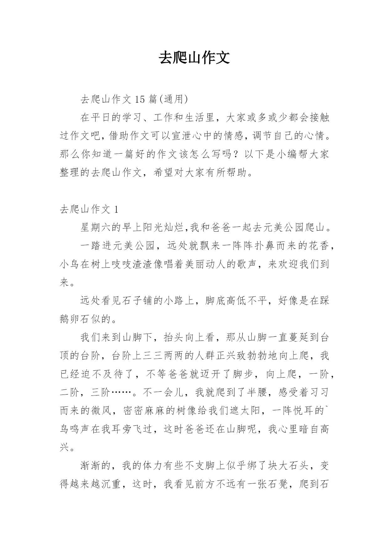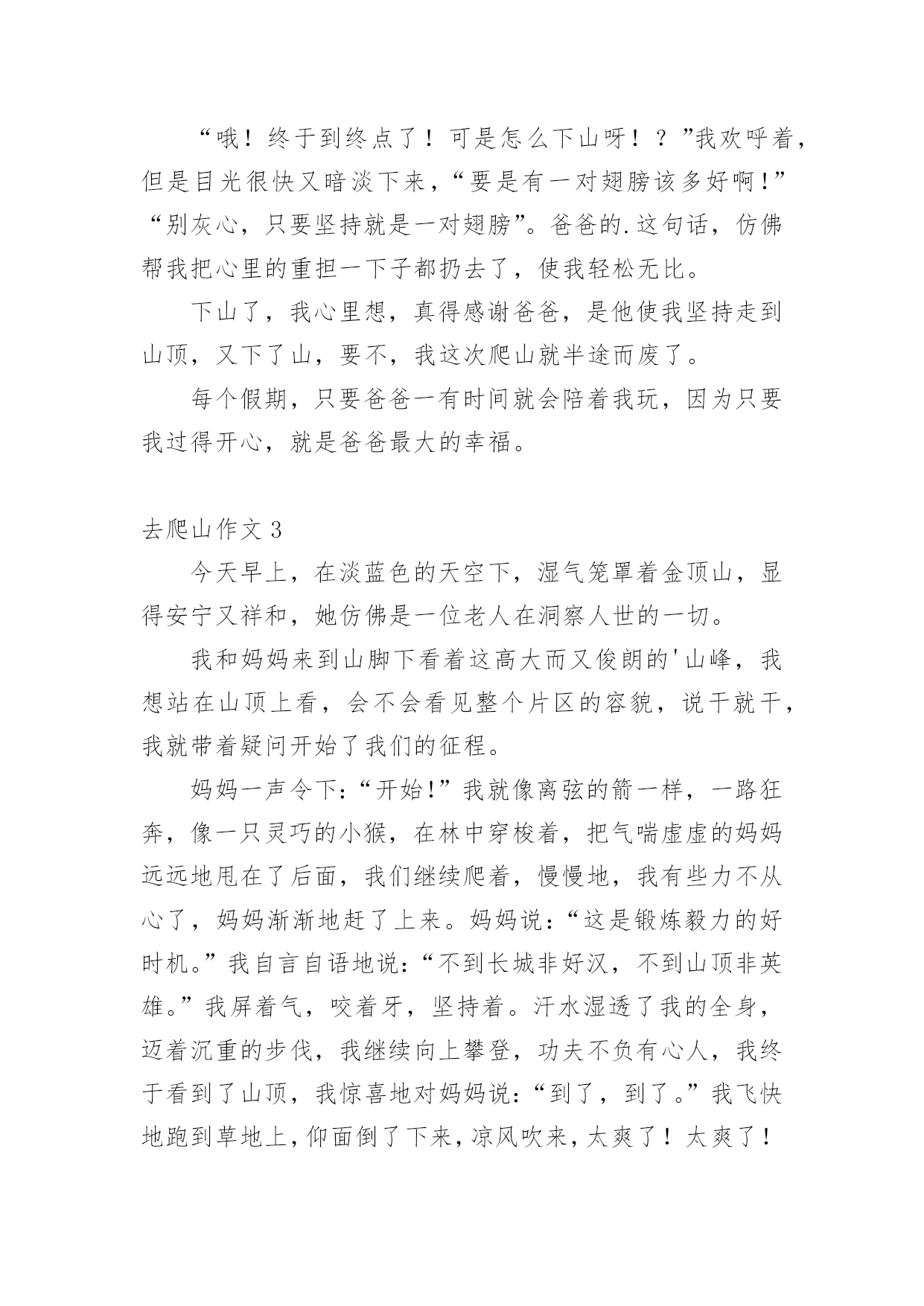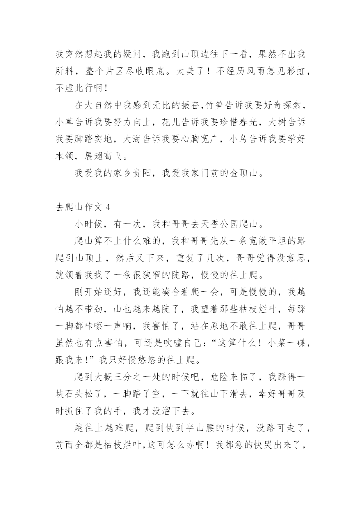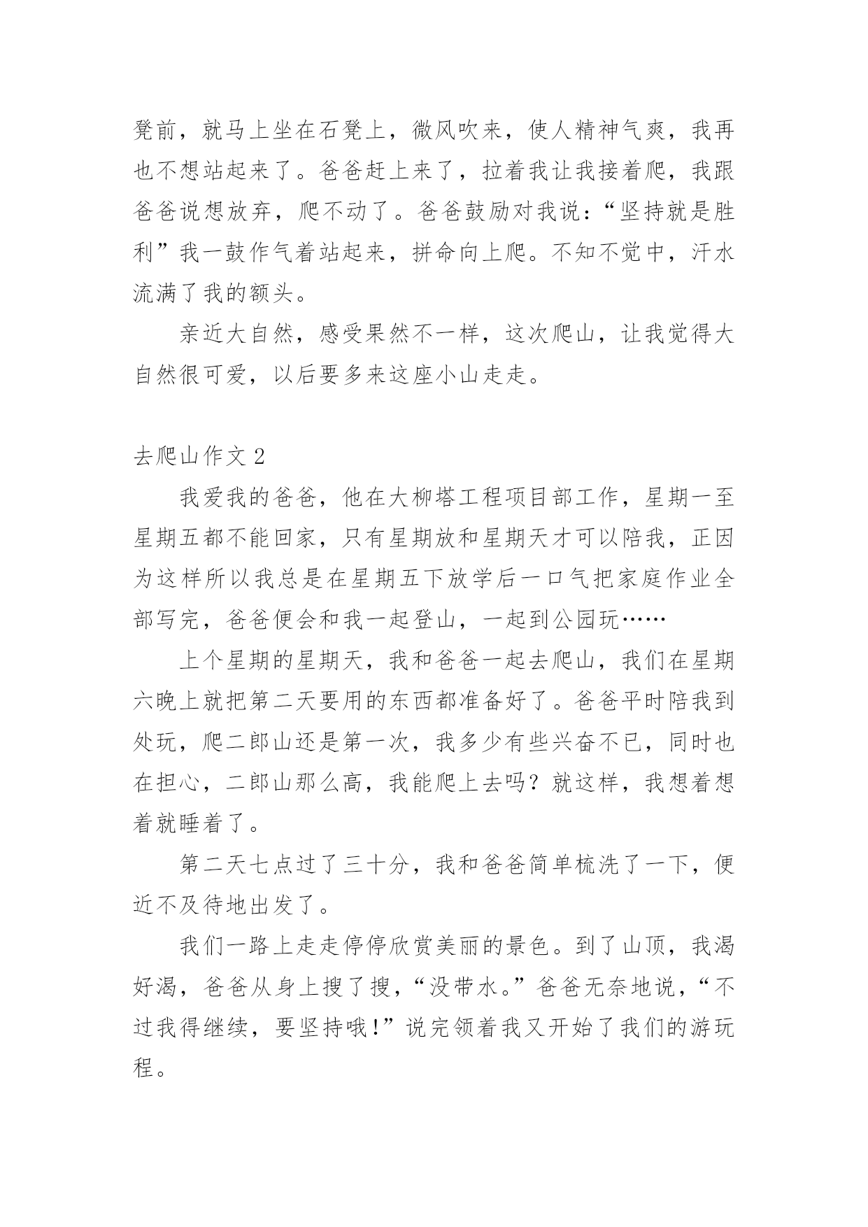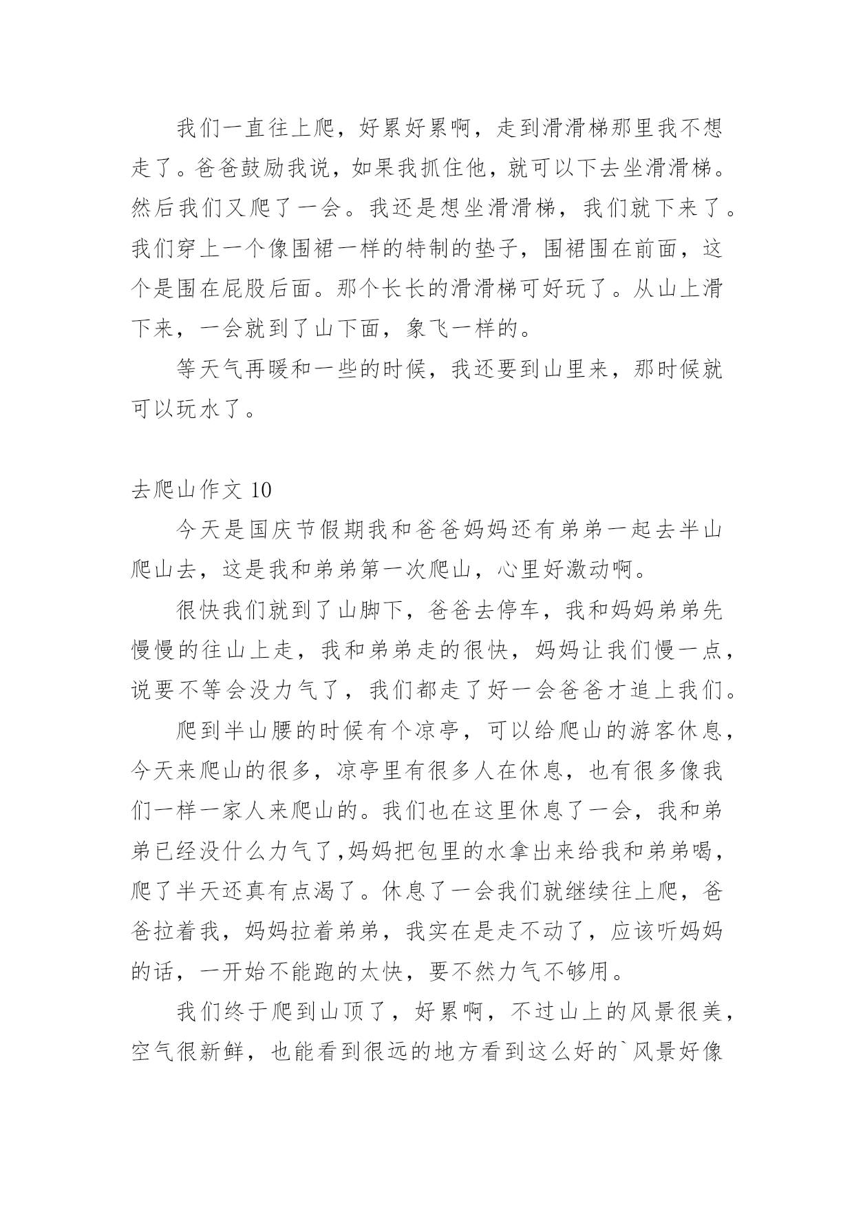 去爬山作文去爬山作文15篇(通用)在平日的学习、工作和生活里,大家或多或少都会接触过作文吧,借助作文可以宣泄心中的情感,调节自己的心情。那么你知道一篇好的作文该怎么写吗?以下是小编帮大家整理的去爬山作文,希望对大家有所帮助。去爬山作文1星期六的早上阳光灿烂,我和爸爸一起去元美公园爬山。一踏进元美公园,远处就飘来一阵阵扑鼻而来的花香,小鸟在树上吱吱渣渣像唱着美丽动人的歌声,来欢迎我们到来。远处看见石子铺的小路上,脚底高低不平,好像是在踩鹅卵石似的。我们来到山脚下,抬头向上看,那从山脚一直蔓延到台顶的台阶,台阶上三三两两的人群正兴致勃勃地向上爬,我已经迫不及待了,不等爸爸就迈开了脚步,向上爬,一阶,二阶,三阶……。不一会儿,我就爬到了半腰,感受着习习而来的微风,密密麻麻的树像给我们遮太阳,一阵悦耳的`鸟鸣声在我耳旁飞过,这时爸爸还在山脚呢,我心里暗自高兴。渐渐的,我的体力有些不支脚上似乎绑了块大石头,变得越来越沉重,这时,我看见前方不远有一张石凳,爬到石凳前,就马上坐在石凳上,微风吹来,使人精神气爽,我再也不想站起来了。爸爸赶上来了,拉着我让我接着爬,我跟爸爸说想放弃,爬不动了。爸爸鼓励对我说:“坚持就是胜利”我一鼓作气着站起来,拼命向上爬。不知不觉中,汗水流满了我的额头。亲近大自然,感受果然不一样,这次爬山,让我觉得大自然很可爱,以后要多来这座小山走走。去爬山作文2我爱我的爸爸,他在大柳塔工程项目部工作,星期一至星期五都不能回家,只有星期放和星期天才可以陪我,正因为这样所以我总是在星期五下放学后一口气把家庭作业全部写完,爸爸便会和我一起登山,一起到公园玩……上个星期的星期天,我和爸爸一起去爬山,我们在星期六晚上就把第二天要用的东西都准备好了。爸爸平时陪我到处玩,爬二郎山还是第一次,我多少有些兴奋不已,同时也在担心,二郎山那么高,我能爬上去吗?就这样,我想着想着就睡着了。第二天七点过了三十分,我和爸爸简单梳洗了一下,便近不及待地出发了。我们一路上走走停停欣赏美丽的景色。到了山顶,我渴好渴,爸爸从身上搜了搜,“没带水。”爸爸无奈地说,“不过我得继续,要坚持哦!”说完领着我又开始了我们的游玩程。“哦!终于到终点了!可是怎么下山呀!?”我欢呼着,但是目光很快又暗淡下来,“要是有一对翅膀该多好啊!”“别灰心,只要坚持就是一对翅膀”。爸爸的.这句话,仿佛帮我把心里的重担一下子都扔去了,使我轻松无比。下山了,我心里想,真得感谢爸爸,是他使我坚持走到山顶,又下了山,要不,我这次爬山就半途而废了。每个假期,只要爸爸一有时间就会陪着我玩,因为只要我过得开心,就是爸爸最大的幸福。去爬山作文3今天早上,在淡蓝色的天空下,湿气笼罩着金顶山,显得安宁又祥和,她仿佛是一位老人在洞察人世的一切。我和妈妈来到山脚下看着这高大而又俊朗的'山峰,我想站在山顶上看,会不会看见整个片区的容貌,说干就干,我就带着疑问开始了我们的征程。妈妈一声令下:“开始!”我就像离弦的箭一样,一路狂奔,像一只灵巧的小猴,在林中穿梭着,把气喘虚虚的妈妈远远地甩在了后面,我们继续爬着,慢慢地,我有些力不从心了,妈妈渐渐地赶了上来。妈妈说:“这是锻炼毅力的好时机。”我自言自语地说:“不到长城非好汉,不到山顶非英雄。”我屏着气,咬着牙,坚持着。汗水湿透了我的全身,迈着沉重的步伐,我继续向上攀登,功夫不负有心人,我终于看到了山顶,我惊喜地对妈妈说:“到了,到了。”我飞快地跑到草地上,仰面倒了下来,凉风吹来,太爽了!太爽了!我突然想起我的疑问,我跑到山顶边往下一看,果然不出我所料,整个片区尽收眼底。太美了!不经历风雨怎见彩虹,不虚此行啊!在大自然中我感到无比的振奋,竹笋告诉我要好奇探索,小草告诉我要努力向上,花儿告诉我要珍惜春光,大树告诉我要脚踏实地,大海告诉我要心胸宽广,小鸟告诉我要学好本领,展翅高飞。我爱我的家乡贵阳,我爱我家门前的金顶山。去爬山作文4小时候,有一次,我和哥哥去天香公园爬山。爬山算不上什么难的,我和哥哥先从一条宽敞平坦的路爬到山顶上,然后又下来,重复了几次,哥哥觉得没意思,就领着我找了一条很狭窄的陡路,慢慢的往上爬。刚开始还好,我还能凑合着爬一会,可是慢慢的,我越怕越不带劲,山也越来越陡了,我望着那些枯枝烂叶,每踩一脚都咔嚓一声响,我害怕了,站在原地不敢往上爬,哥哥虽然也有点害怕,可还是吹嘘自己:“这算什么!小菜一碟,跟我来!”我只好慢悠悠的往上爬。爬到大概三分之一处的时候吧,危险来临了,我踩得一块石头松了,一脚踏了空,一下就往山下滑去,幸好哥哥及时抓住了我的手,我才没溜下去。越往上越难爬,爬到快到半山腰的时候,没路可走了,前面全都是枯枝烂叶,这可怎么办啊!我都急的快哭出来了,往下走下不去,往上走也上不去,幸好哥哥聪明,从口袋里拿出一根米尺(可能是在我家玩的.时候顺手装到口袋