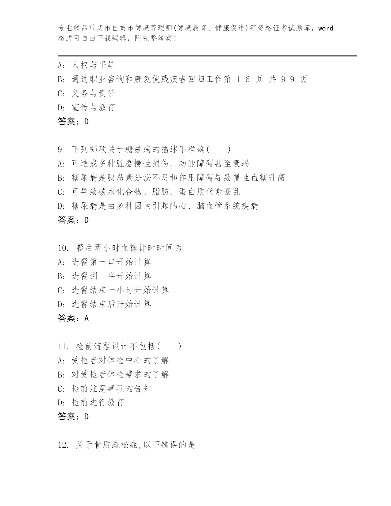 精编重庆市自贡市健康管理师(健康教育、健康促进)等资格证考试大全精品(基础题)