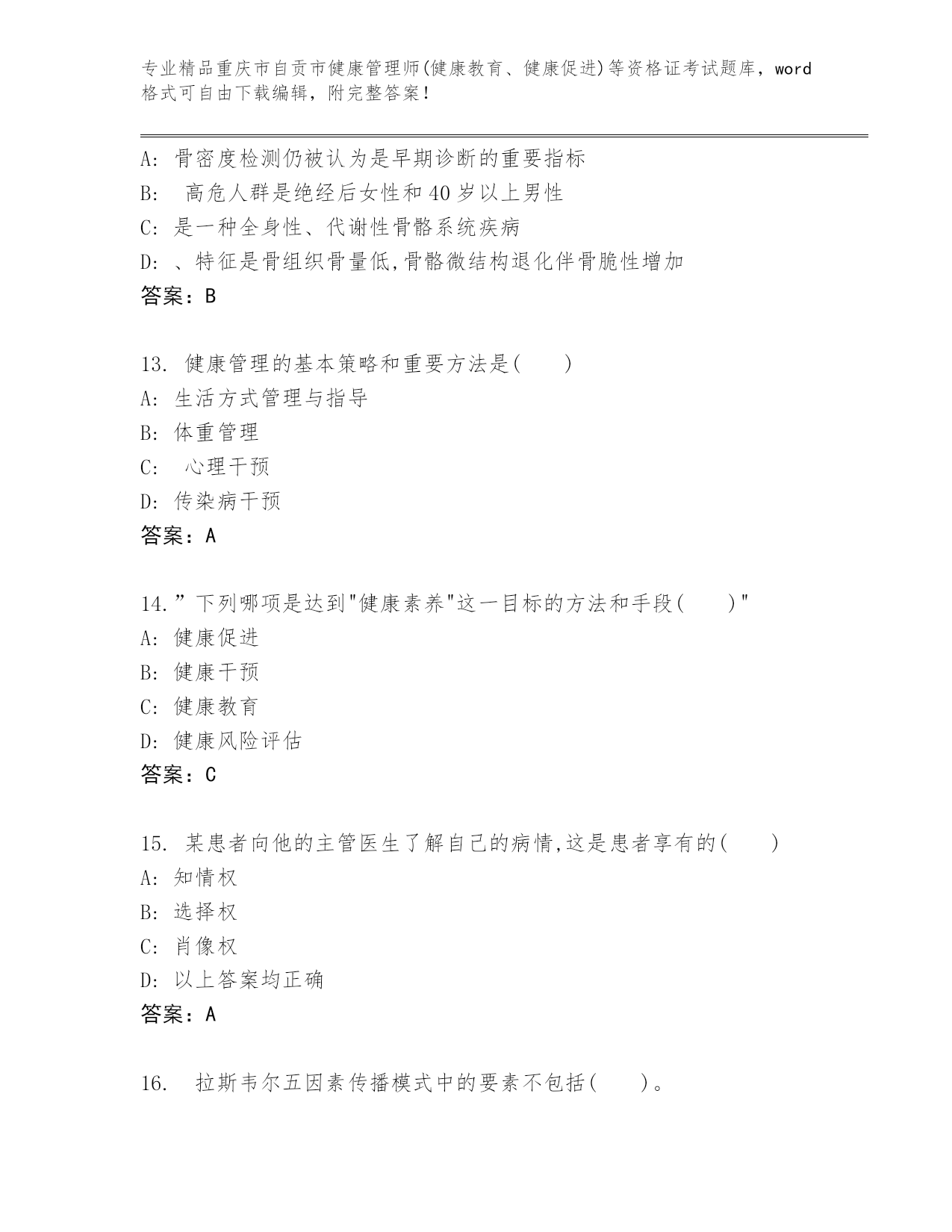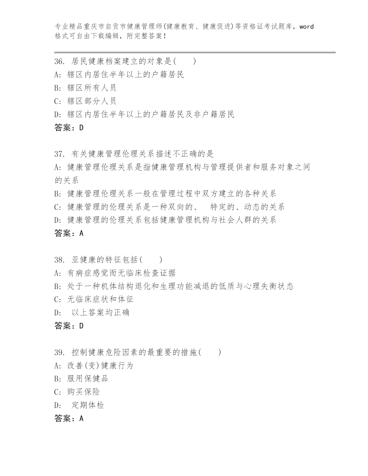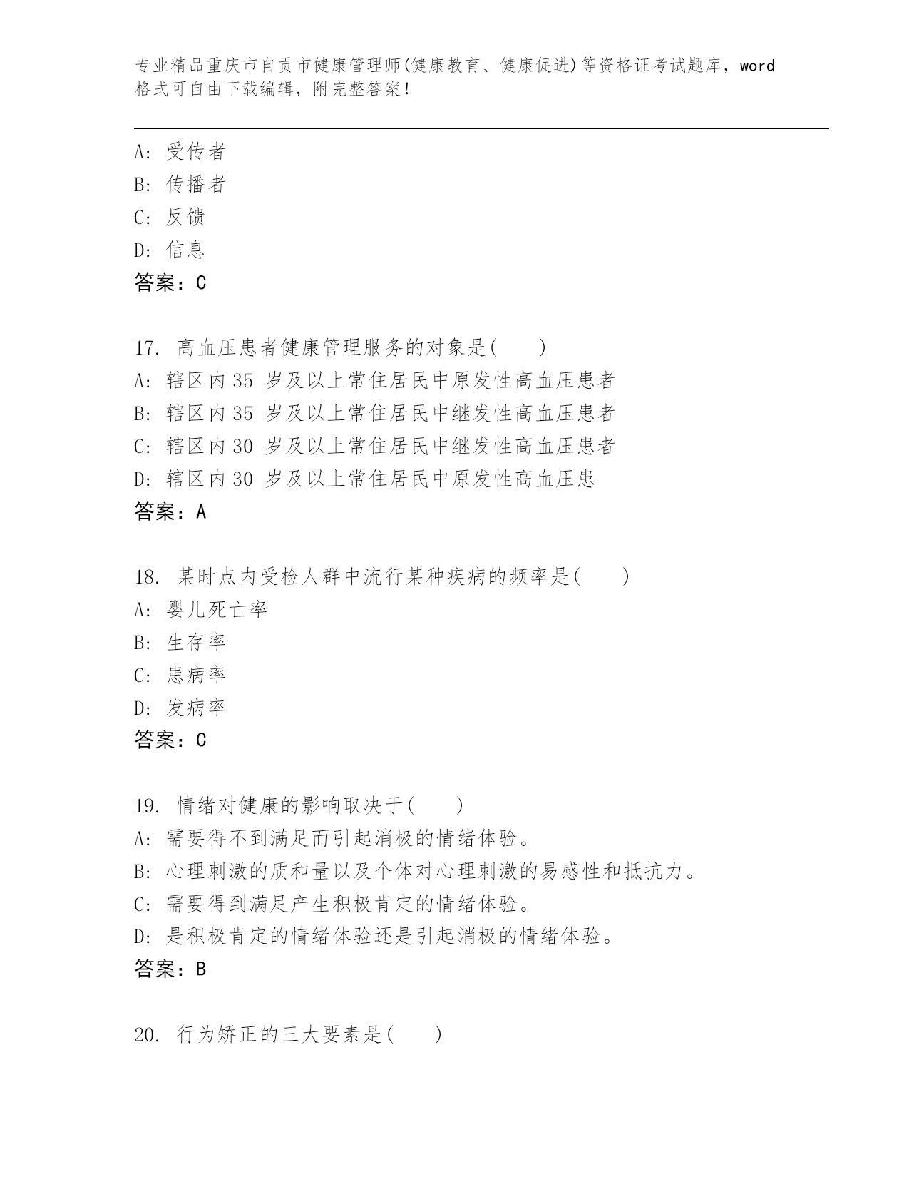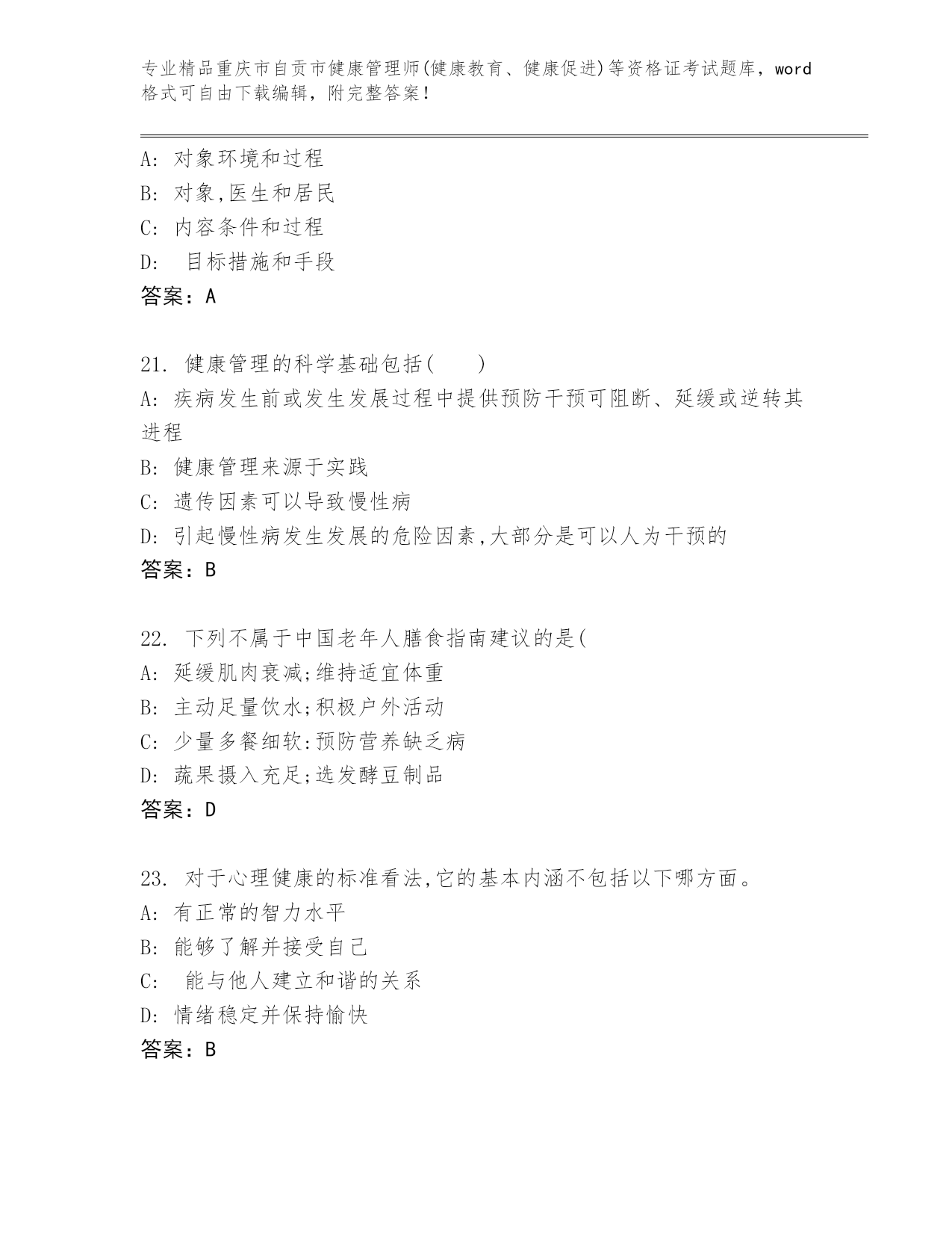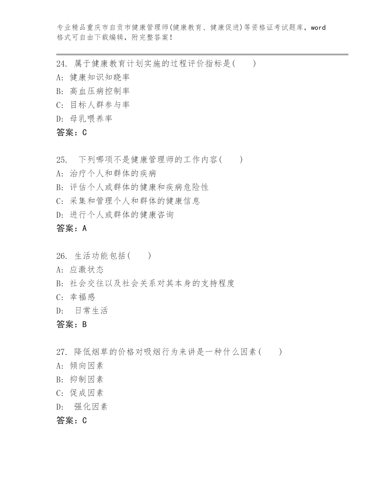 精编重庆市自贡市健康管理师(健康教育、健康促进)等资格证考试大全精品(基础题).docx