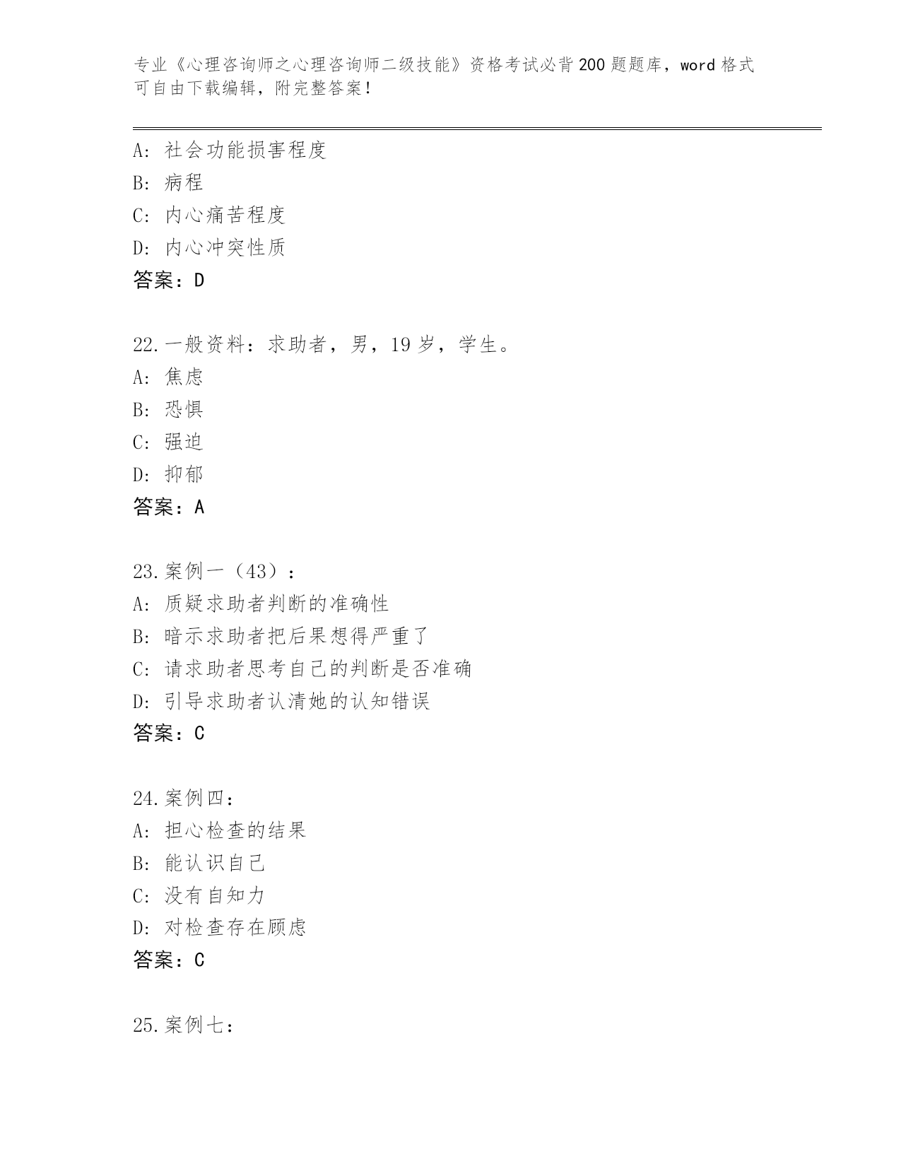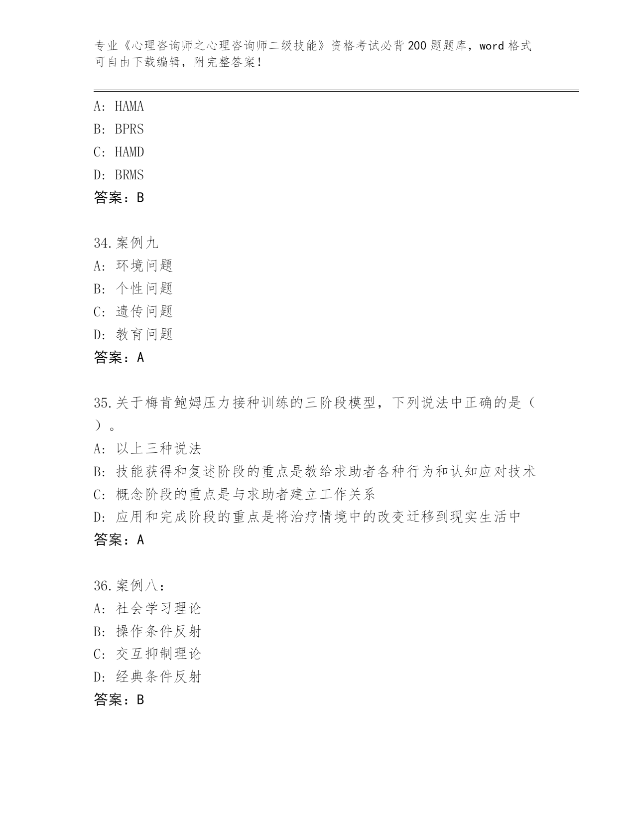2024年山西省《心理咨询师之心理咨询师二级技能》资格考试必背200题王牌题库含答案(夺分金卷)