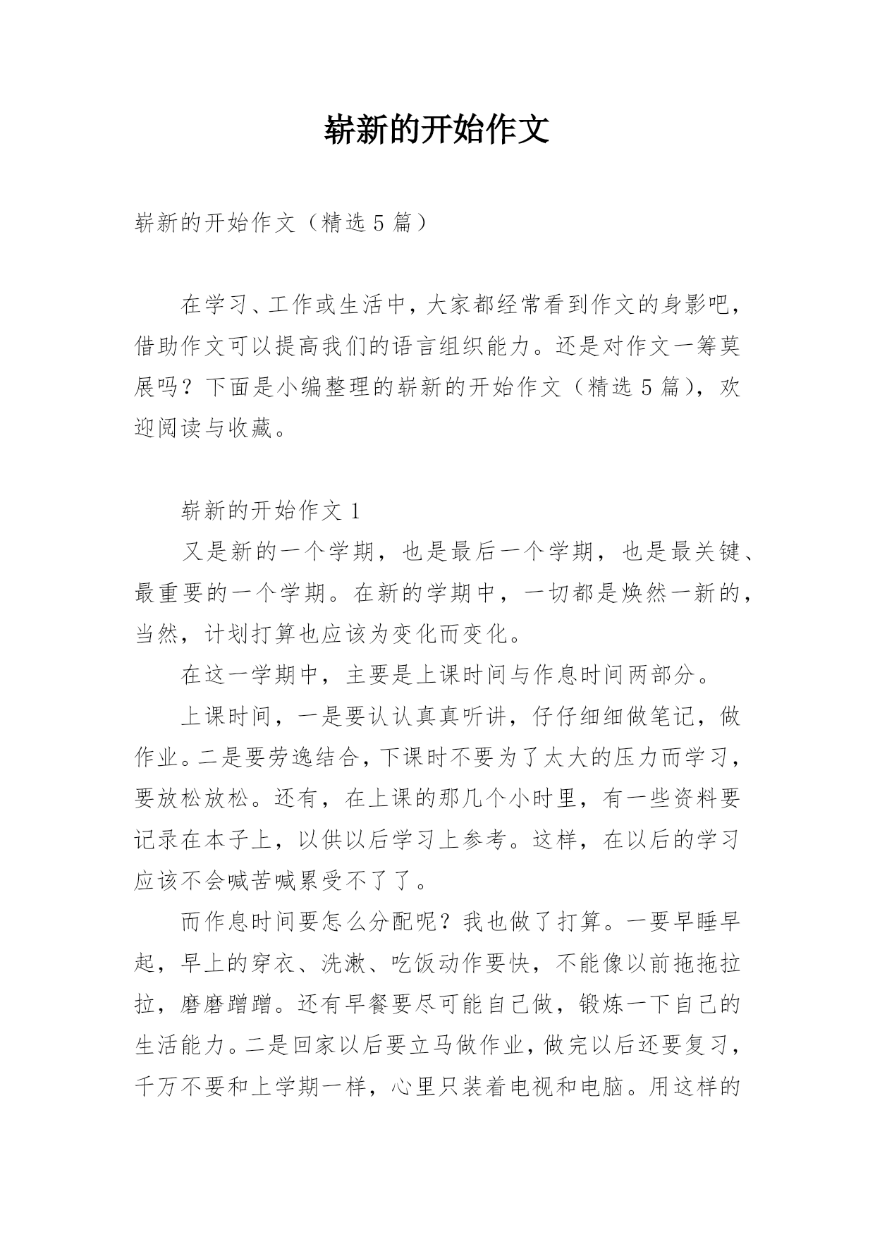 崭新的开始作文崭新的开始作文(精选5篇)在学习、工作或生活中,大家都经常看到作文的身影吧,借助作文可以提高我们的语言组织能力。还是对作文一筹莫展吗?下面是小编整理的崭新的开始作文(精选5篇),欢迎阅读与收藏。崭新的开始作文1又是新的一个学期,也是最后一个学期,也是最关键、最重要的一个学期。在新的学期中,一切都是焕然一新的,当然,计划打算也应该为变化而变化。在这一学期中,主要是上课时间与作息时间两部分。上课时间,一是要认认真真听讲,仔仔细细做笔记,做作业。二是要劳逸结合,下课时不要为了太大的压力而学习,要放松放松。还有,在上课的那几个小时里,有一些资料要记录在本子上,以供以后学习上参考。这样,在以后的学习应该不会喊苦喊累受不了了。而作息时间要怎么分配呢?我也做了打算。一要早睡早起,早上的穿衣、洗漱、吃饭动作要快,不能像以前拖拖拉拉,磨磨蹭蹭。还有早餐要尽可能自己做,锻炼一下自己的生活能力。二是回家以后要立马做作业,做完以后还要复习,千万不要和上学期一样,心里只装着电视和电脑。用这样的作息时间和上课配合,考上好学校应该不成问题。这两大部分做好了却问题还在——能不能坚持到期末那一天?的确,要一下子改变确实不易,而且是彻彻底底更不可能。可是,有什么办法呢?这人生来就活在对立的世界里,要么约束自己,认真对待生活与学习;要么放任自己,任由自己往堕落的深渊下沉。所有的事都是这样,都是先苦才后甜。所以呢!我一定会解决这个问题,只不过会和时间一样一点一点地改变,让它成为习惯,自然也就不觉得别扭了。在新学期里,所有的`都是新的,不管以前取得了多好的成绩,不管自己以前得到了多少受人赞扬的荣誉。从现在开始,一切归零,一切从头开始。我想看看这一学期我能给自己打多少分,我想看看我能得多少分。新的学期,新的打算,新的挑战,新的未来!就从现在起步,这是一个崭新的开始!崭新的开始作文2记得还在初一的时候,就常听学长学姐们说初三的压力有多大了,每天晚上都有大量作业要写,书本中要背的东西也数不胜数,每个学期都有几次联考。也许是因为我还在初所以觉得他们的话太过夸张,并未意识到这其实是初三党的真实情况。刚开学一那会,家庭作业量并不是很多,与初二时的情况差不了多少连下课的氛围也依旧打打闹闹。可过几天后发现,原来不知不觉中,自己写作业的时间变长了。两个小时左右才能完成作业,更不要说作业完成之后还要看书,背书了。更重要的是,初三新加了化学这项课程,老师说,和数理比起来,化学简单多了。我也就信了,可深入其中发现,难点也随之增加了。于是便制定了一系列的.学习计划好让自己学到更多。就好像老师曾对我们全体九年级说的一番话。明明我们这届九年级是四五年里来,基础最好的,各方面也比较强,为什么不再努力下呢,发挥出自己的光彩,我们的能力还不足以和他人比,可是不到最后关头,谁也不知道会有怎样的结局,所以你们呢,要成为黑马吗?冲上来吧,前面的路很是丰富多彩。老师说的没错,可是初三的成长过程,貌似并不那么好过,它不似初一那么欢快,不似初二那么平庸,它有的只是紧张又繁忙的学习。已经上高中的表姐告诉我,挺过去了就好了,挺不过去就有点糟糕了。它是我们人生中的第一个转折点,虽不是唯一的出路,但父母还是寄托很多的希望,希望我们能有好的结果。有人说初三是一个大战场,而好的高中,便是我们想要征服的城池。我们奋力拼搏,勇敢向前,只为取得的成绩不让自己后悔。现在,初三终于完全融合入我的生活,我将开始我新的旅程。崭新的开始作文3光阴似箭、日月如梭,一个月的寒假转瞬即逝,我们迎来了新的学期,也迎来了温暖明媚的春天。今天是开学第一天,我背上心爱的书包、迎着清晨的第一缕阳光,迈着欢快的脚步、怀着激动喜悦的心情去学校。路两旁,绿油油的小草探出小脑袋东张西望,一阵春风拂过,小草儿跳起了欢快的芭蕾舞,连茁壮的大树也被春姑娘吹弯了腰……我兴高采烈地一路疾飞,一会儿就来到了盼望已久的校园,踏入久违的教室,见到了久违的同学。大家三个一群,五个一伙,热火朝天地叽叽喳喳,七嘴八舌地说个不停,"这个寒假你干什么了“”我还去滑雪了““你好像长胖了”同桌仰着红扑扑的小脸骄傲地说:“我看了五颜六色的花灯,它们把油城装扮得像火龙一样,还参观了文化馆,油田人真了不起!“我不甘示弱地说:“是啊,今年的新年太热闹了,我还参加了游园活动,扎飞镖、套金鱼……最令我激动的是收到1200元压岁钱哩!”同桌点着我的鼻子俏皮地说:“你还是个贪财迷呀!”同学们又说又笑、你一言我一语地,处处扬溢着亲切喜悦、兴奋激动的热烈气氛。下课了,我们像一群快乐的小鸟争先恐后跑出教室,来到宽阔的`操场,红绿相间的塑胶跑道把校园映衬得格外清爽美丽,高大葱郁的水杉依然像士兵一样挺拔,鸟儿在枝头唱着悦耳动听的歌儿,好像在迎接我们的回校,蓝天绿地下,我们欢喜雀跃、奔跑嬉闹,有的踢足球,
