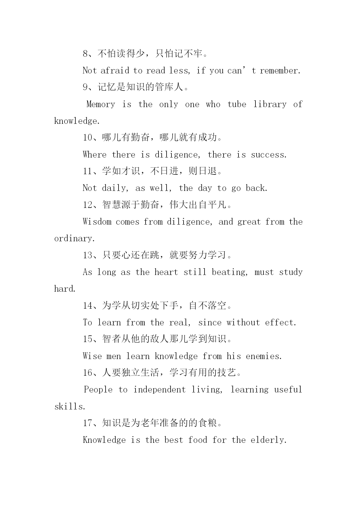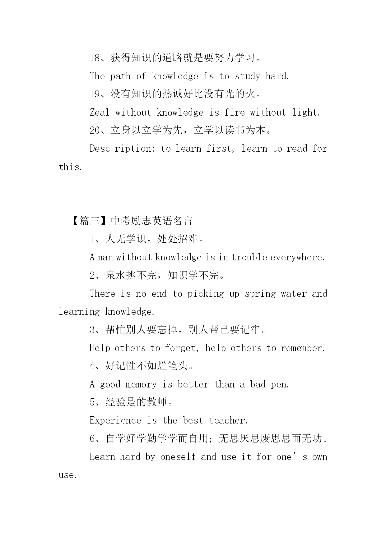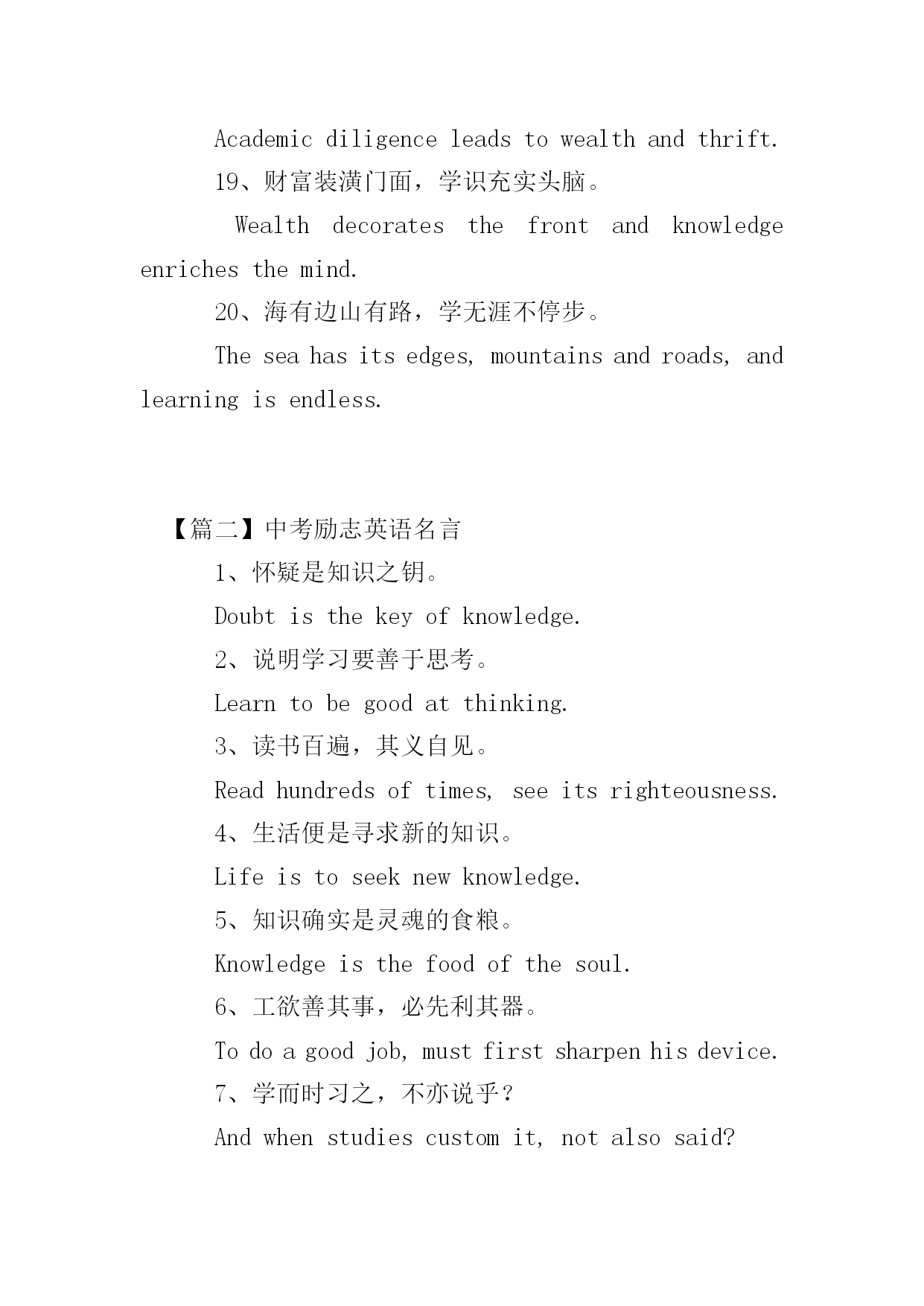 中考励志英语名言三篇【篇一】中考励志英语名言1、读不尽的书,走不完的路。Anendlessbook,anendlessroad.2、拳不离手,曲不离口。Fistdoesnotleavethehand,songdoesnotleavethemouth.3、刀不磨要生锈,人不学要落后。Knivesmustrustwithoutgrinding,andpeopleshouldnotlagbehind.4、常说嘴里顺,常写手不笨。Oftensaysmoothmouth,oftenwritenotstupid.5、温固而知新,可以为师已。Ifyouknowsomethingnewthroughwarmth,youcanlearnfromothers.6、创新钻研,贵在眼前。Innovationandresearchareathand.7、百艺通,不如一艺精。BaiyitongisbetterthanYijie.8、读书有三到:心到、眼到、口到。Therearethreewaystoread:heart,eyeandmouth.9、刀钝石上磨,人笨勤奋学。Knivesandbluntstonesarepolished,andpeoplearestupidanddiligent.10、胸有千秋业,腹有万卷书。Therearethousandsofbooksinthebellyandthousandsofbooksinthechest.11、不怕学问浅,就怕志气短。Ifyouarenotafraidofshallowlearning,youareafraidofshortambition.12、黑发不知勤学早,白首方悔读书迟。Blackhairdoesnotknowhowtostudyearly,whiteheadregretstostudylate.13、蜂采百花酿甜蜜,人读群书明真理。Beesgatherflowerstomakesweetness,andpeoplereadthetruth.14、莫道君行早,更有早行人。MoDaojuntravelsearly,moreearlypedestrians.15、逆水行舟,不进则退。Ifyousailagainstthecurrent,ifyoudon’tadvance,youwillretreat.16、细想出智慧,细嚼出滋味。Thinkofwisdom,chewtaste.17、聪明靠努力学习,学识靠平时积累。Intelligencedependsonhardwork,andknowledgeontheaccumulationofpeacetime.18、学问勤中得,富裕俭中来。Academicdiligenceleadstowealthandthrift.19、财富装潢门面,学识充实头脑。Wealthdecoratesthefrontandknowledgeenrichesthemind.20、海有边山有路,学无涯不停步。Theseahasitsedges,mountainsandroads,andlearningisendless.【篇二】中考励志英语名言1、怀疑是知识之钥。Doubtisthekeyofknowledge.2、说明学习要善于思考。Learntobegoodatthinking.3、读书百遍,其义自见。Readhundredsoftimes,seeitsrighteousness.4、生活便是寻求新的知识。Lifeistoseeknewknowledge.5、知识确实是灵魂的食粮。Knowledgeisthefoodofthesoul.6、工欲善其事,必先利其器。Todoagoodjob,mustfirstsharpenhisdevice.7、学而时习之,不亦说乎?Andwhenstudiescustomit,notalsosaid?8、不怕读得少,只怕记不牢。Notafraidtoreadless,ifyoucan’tremember.9、记忆是知识的管库人。Memoryistheonlyonewhotubelibraryofknowledge.10、哪儿有勤奋,哪儿就有成功。Wherethereisdiligence,thereissuccess.11、学如才识,不日进,则日退。Notdaily,aswell,thedaytogoback.12、智慧源于勤奋,伟大出自平凡。Wisdomcomes