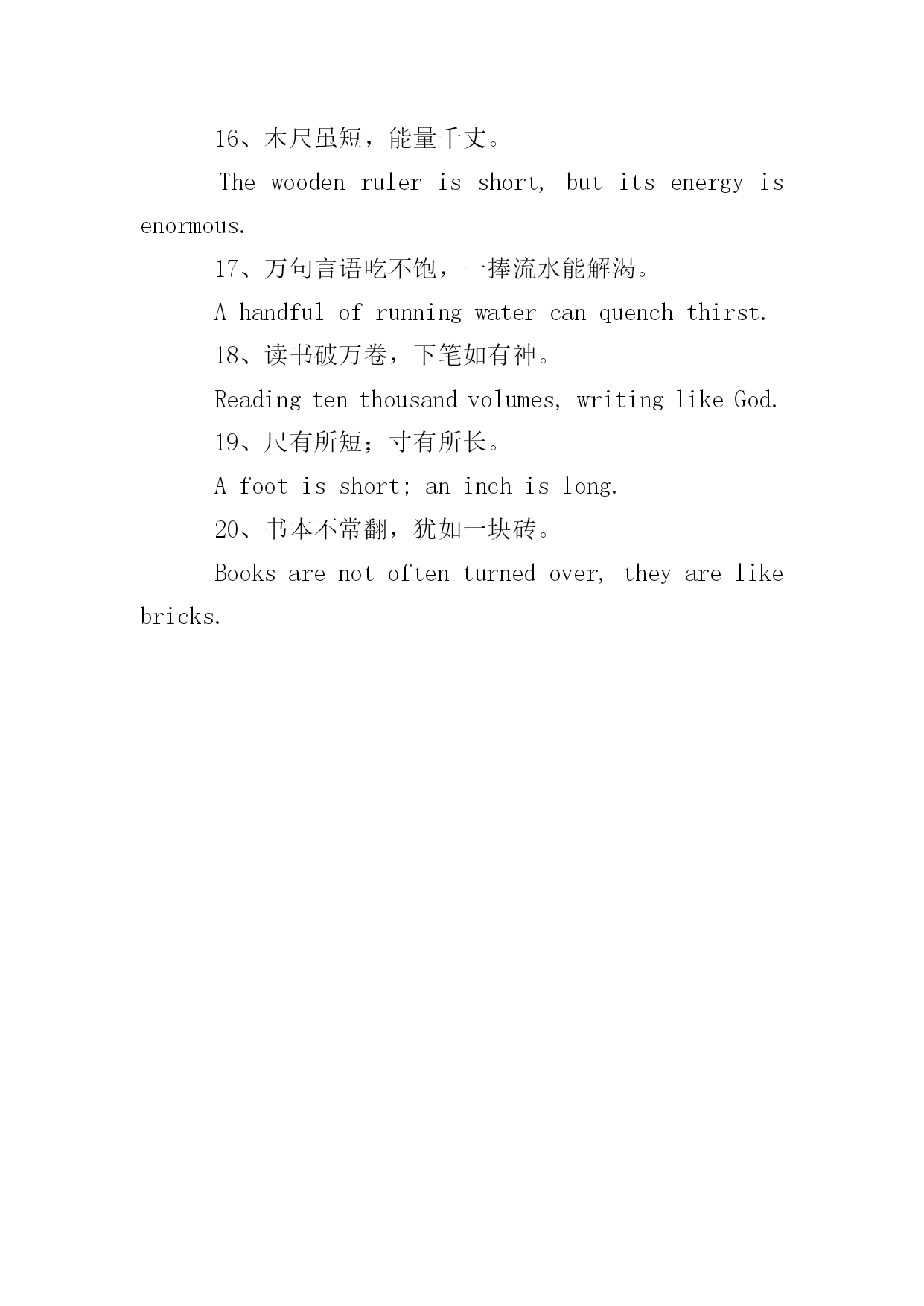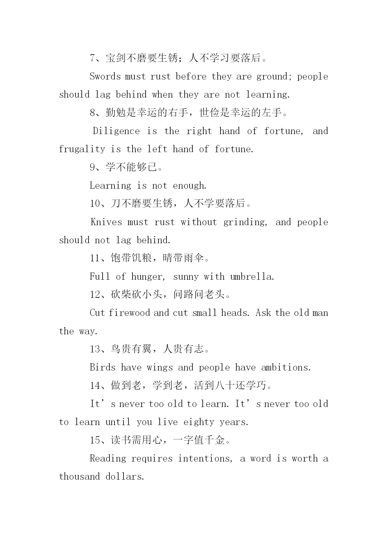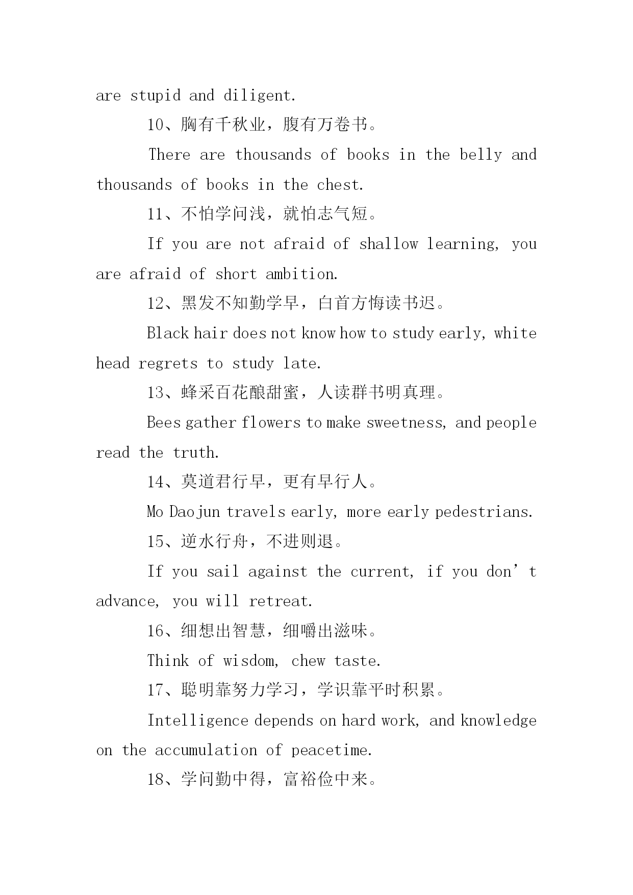中考励志英语名言三篇【篇一】中考励志英语名言1、读不尽的书,走不完的路。Anendlessbook,anendlessroad.2、拳不离手,曲不离口。Fistdoesnotleavethehand,songdoesnotleavethemouth.3、刀不磨要生锈,人不学要落后。Knivesmustrustwithoutgrinding,andpeopleshouldnotlagbehind.4、常说嘴里顺,常写手不笨。Oftensaysmoothmouth,oftenwritenotstupid.5、温固而知新,可以为师已。Ifyouknowsomethingnewthroughwarmth,youcanlearnfromothers.6、创新钻研,贵在眼前。Innovationandresearchareathand.7、百艺通,不如一艺精。BaiyitongisbetterthanYijie.8、读书有三到:心到、眼到、口到。Therearethreewaystoread:heart,eyeandmouth.9、刀钝石上磨,人笨勤奋学。Knivesandbluntstonesarepolished,andpeoplearestupidanddiligent.10、胸有千秋业,腹有万卷书。Therearethousandsofbooksinthebellyandthousandsofbooksinthechest.11、不怕学问浅,就怕志气短。Ifyouarenotafraidofshallowlearning,youareafraidofshortambition.12、黑发不知勤学早,白首方悔读书迟。Blackhairdoesnotknowhowtostudyearly,whiteheadregretstostudylate.13、蜂采百花酿甜蜜,人读群书明真理。Beesgatherflowerstomakesweetness,andpeoplereadthetruth.14、莫道君行早,更有早行人。MoDaojuntravelsearly,moreearlypedestrians.15、逆水行舟,不进则退。Ifyousailagainstthecurrent,ifyoudon’tadvance,youwillretreat.16、细想出智慧,细嚼出滋味。Thinkofwisdom,chewtaste.17、聪明靠努力学习,学识靠平时积累。Intelligencedependsonhardwork,andknowledgeontheaccumulationofpeacetime.18、学问勤中得,富裕俭中来。Academicdiligenceleadstowealthandthrift.19、财富装潢门面,学识充实头脑。Wealthdecoratesthefrontandknowledgeenrichesthemind.20、海有边山有路,学无涯不停步。Theseahasitsedges,mountainsandroads,andlearningisendless.【篇二】中考励志英语名言1、怀疑是知识之钥。Doubtisthekeyofknowledge.2、说明学习要善于思考。Learntobegoodatthinking.3、读书百遍,其义自见。Readhundredsoftimes,seeitsrighteousness.4、生活便是寻求新的知识。Lifeistoseeknewknowledge.5、知识确实是灵魂的食粮。Knowledgeisthefoodofthesoul.6、工欲善其事,必先利其器。Todoagoodjob,mustfirstsharpenhisdevice.7、学而时习之,不亦说乎?Andwhenstudiescustomit,notalsosaid?8、不怕读得少,只怕记不牢。Notafraidtoreadless,ifyoucan’tremember.9、记忆是知识的管库人。Memoryistheonlyonewhotubelibraryofknowledge.10、哪儿有勤奋,哪儿就有成功。Wherethereisdiligence,thereissuccess.11、学如才识,不日进,则日退。Notdaily,aswell,thedaytogoback.12、智慧源于勤奋,伟大出自平凡。Wisdomcomes