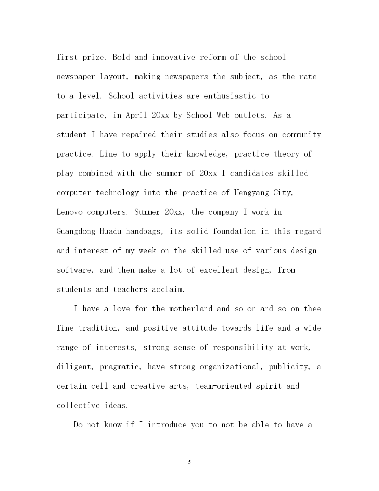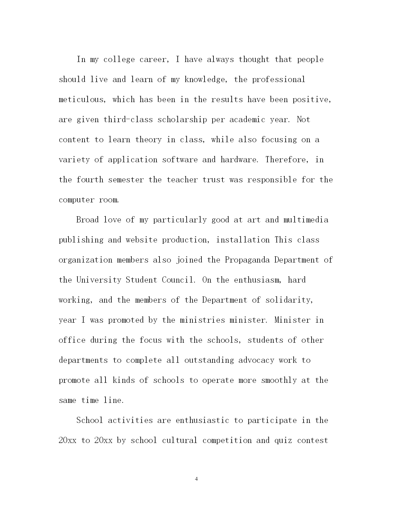 此资料由网络收集而来,如有侵权请告知上传者立即删除。资料共分享,我们负责传递知识。PAGEPAGE6研究生新生入学自我介绍研究生新生入学自我介绍去一个新环境首先要给别人留一个深刻并好的印象,做为研究生新生的你入学自我介绍准备好了吗?下面是小编收集整理的研究生新生入学自我介绍,欢迎阅读借鉴,更多资讯请继续关注自我介绍栏目。研究生新生入学自我介绍1同学们大家好,我叫****,今年**岁。我的本科就读于*****大学**专业。我从踏入大学门槛的那天起,经过良师的精心指导以及自己的奋力拼搏、自强不息,我逐渐成为了一个能适应社会要求的新时代大学生,并为做一个知识型的社会主义建设者打下坚实的基矗。在大学期间,我始终以提高自身的综合素质为目的,以个人的全面发展为奋斗方向,树立正确的人生观、价值观和世界观。为适应社会发展的需求,我认真学习专业知识,发挥自己的`特长;挖掘自身的潜力,结合暑期社会实践,从而提高了自己的学习能力和分析处理问题能力。“学而知不足”是我学习、工作的动力,除了必修课外,还自学Office、Flash、FrontPage2000、Photoshop、DreamweaverMX等软件。学习之余,我坚持参加各种体育活动与社交活动。在思想行为方面,我作风优良、待人诚恳,能较好处理人际关际,处事冷静稳健,能合理地统筹安排生活中的事务。作为一名研究新生,我所拥有的是年青和知识。年轻也许意味着欠缺经验,但是年轻也意味着热情和活力,我自信能凭自己的能力和学识克服各种困难实现自我的人生价值。我也希望在今后的学习生活中,我能和大家成为学习上的良友与生活中的知己,谢谢!研究生新生入学自我介绍2同学们大家好,我是***,来自***,*岁。在我的大学生涯中,我一直都认为人应该是活到老学到老的我对知识、对本专业一丝不苟,因而在成绩上一直都得到肯定,每学年都获得三等奖学金。在不满足于学好理论课的同时也注重于对各种应用软件和硬件的研究。因此在第四学期开始就被老师信任为计算机房的负责人。有广泛爱好的我特别擅长于排版及网页美工和多媒体的制作,就任本班组织委员的同时也加入了入党申请书校学生会宣传部。对工作热情、任劳任怨,和部内成员团结一致,一年间我由部委升为部长。在任部长期间注重配合学校、学生会其它部门,出色的完成各项宣传工作,促使学校的各种运作更顺利的同时行。学校的各种活动都热情的参加,在2003年至2004年间获校文娱比赛及知识问答比赛等一等奖。大胆创新对校报版面进行改革,使得校报的受视率提高到一个层次。学校的各种活动都热情的参加,在2005年4月获校网页比赛三等奖。身为学生的我在修好学业的同时也注重于对社会的实践。本着学以致用,实践结合理论发挥2002年暑假我以熟练的计算机技术应聘入衡阳联想电脑城实习。本人具有热爱等祖国等的优良传统,积极向上的生活态度和广泛的兴趣爱好,对工作责任心强、勤恳踏实,有较强的组织、宣传能力,有一定的艺术细胞和创意,注重团队合作精神和集体观念。研究生新生入学自我介绍3Helloeverybody,Iam***from***,*years.Inmycollegecareer,Ihavealwaysthoughtthatpeopleshouldliveandlearnofmyknowledge,theprofessionalmeticulous,whichhasbeenintheresultshavebeenpositive,aregiventhird-classscholarshipperacademicyear.Notcontenttolearntheoryinclass,whilealsofocusingonavarietyofapplicationsoftwareandhardware.Therefore,inthefourthsemestertheteachertrustwasresponsibleforthecomputerroom.Broadloveofmyparticularlygoodatartandmultimediapublishingandwebsiteproduction,installationThisclassorganizationmembersalsojoinedthePropagandaDepartmentoftheUniversityStudentCouncil.Ontheenthusiasm,hardworking,andthemembersoftheDepartmentofsolidarity,yearIwaspromotedbytheministriesminister.Ministerinofficeduringthefoc