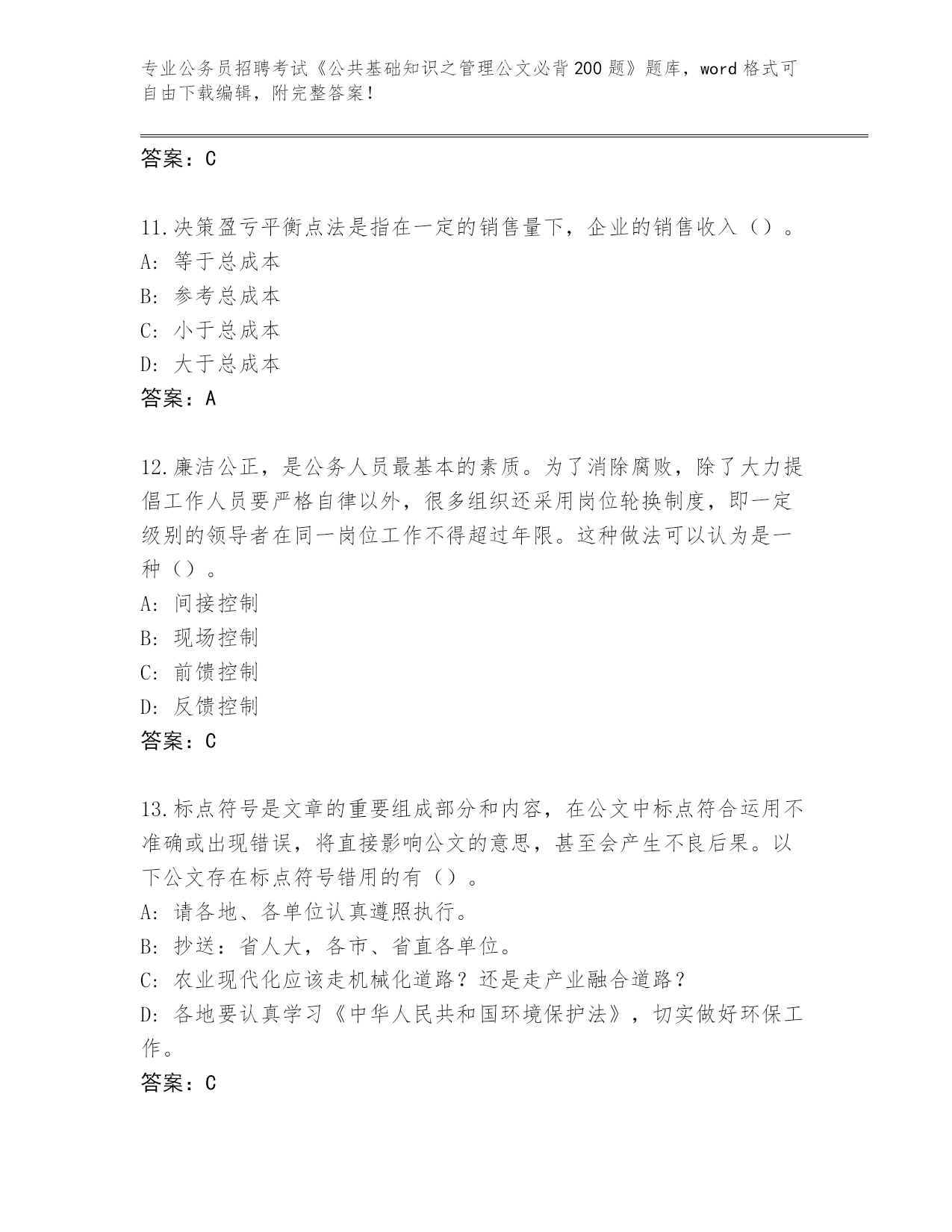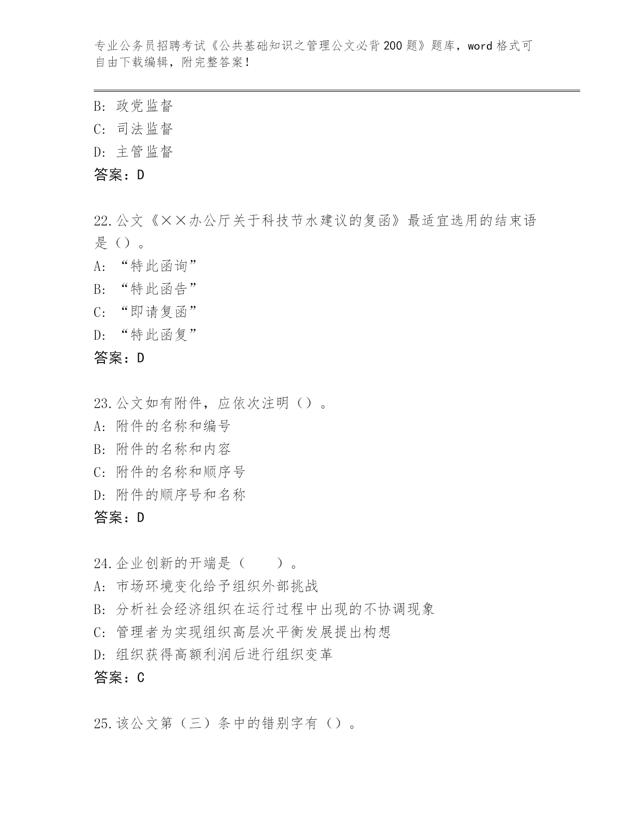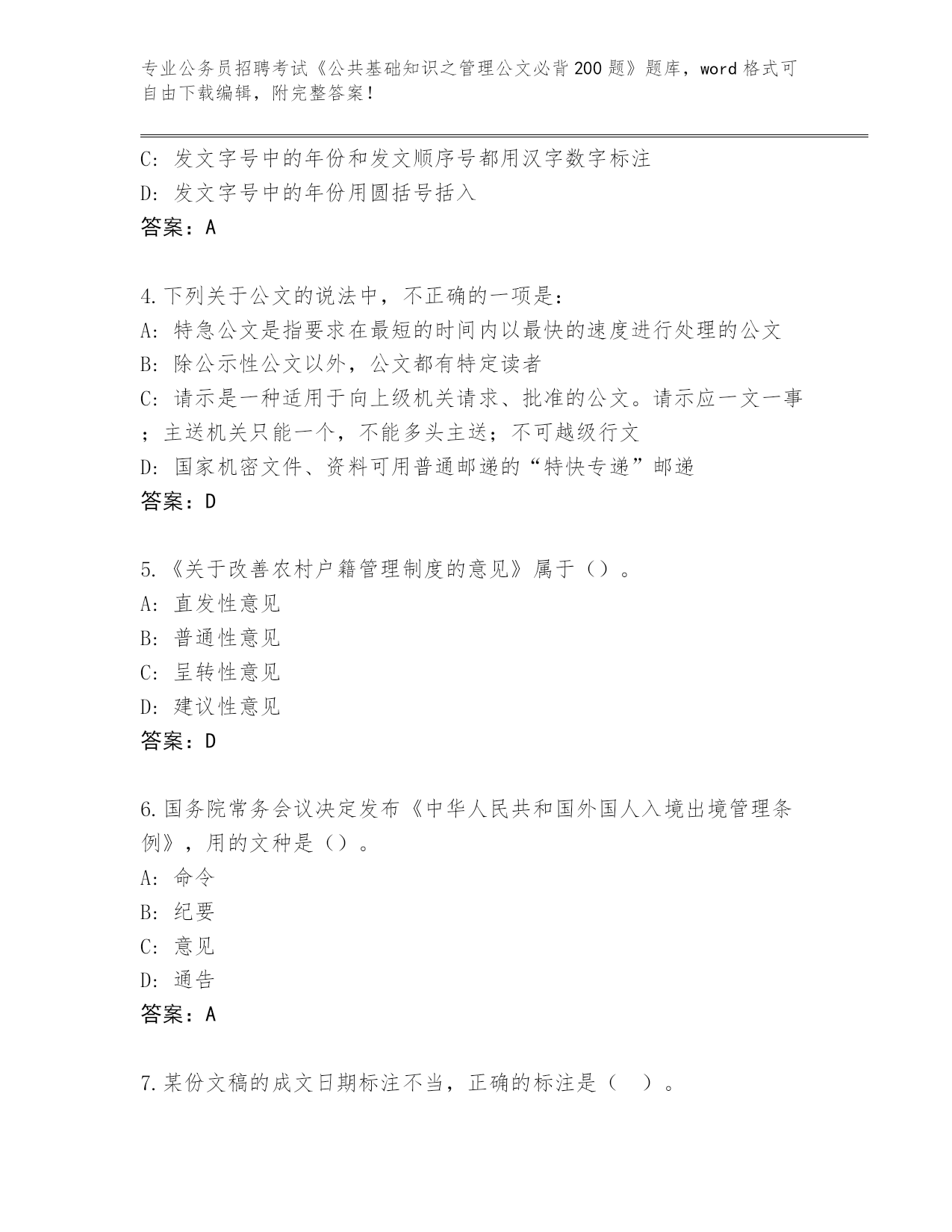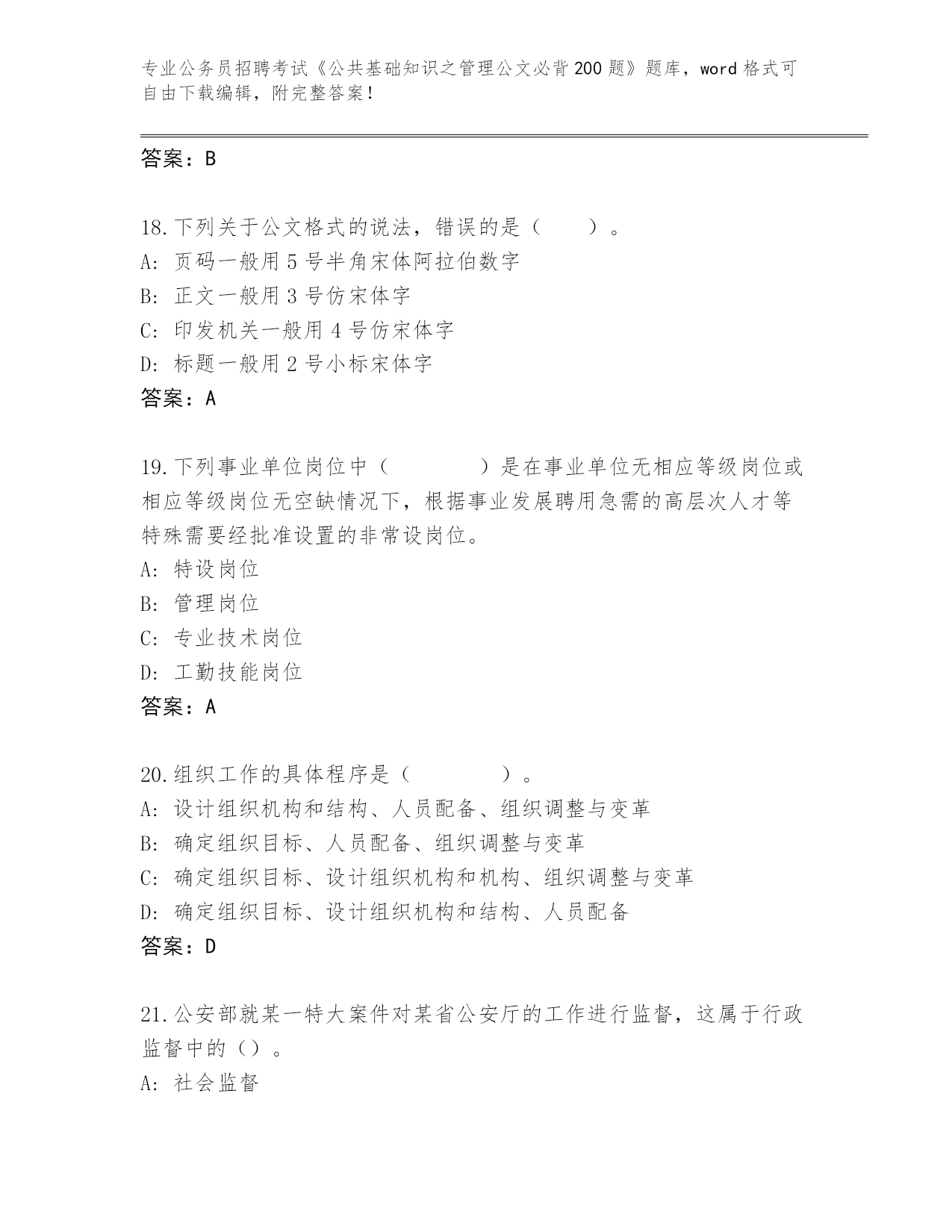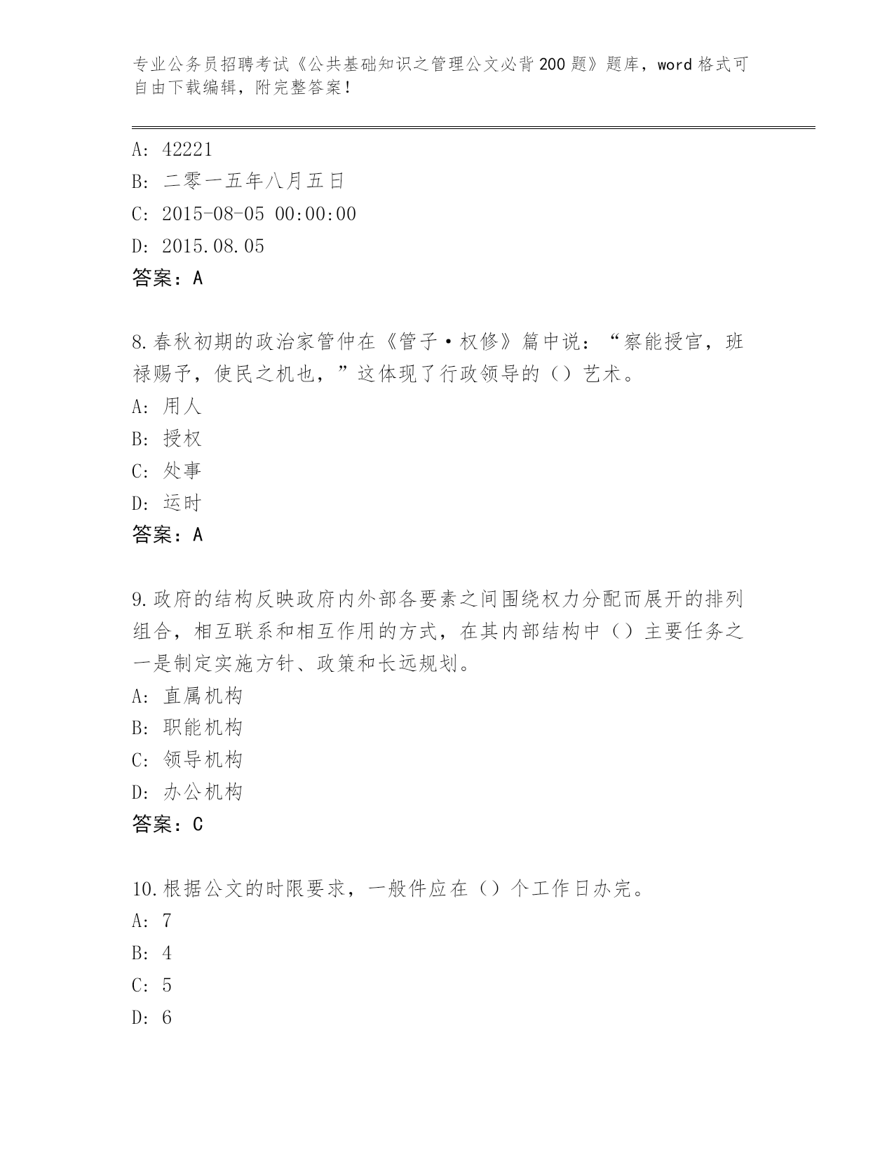 云南省历年公务员招聘考试《公共基础知识之管理公文必背200题》王牌题库【A卷】