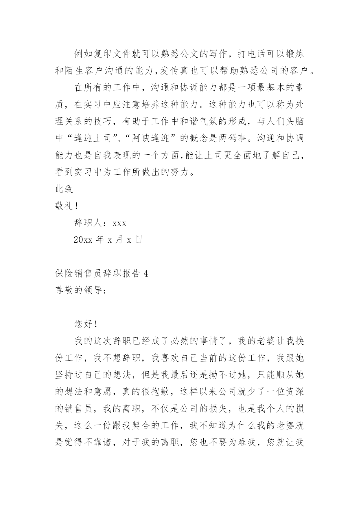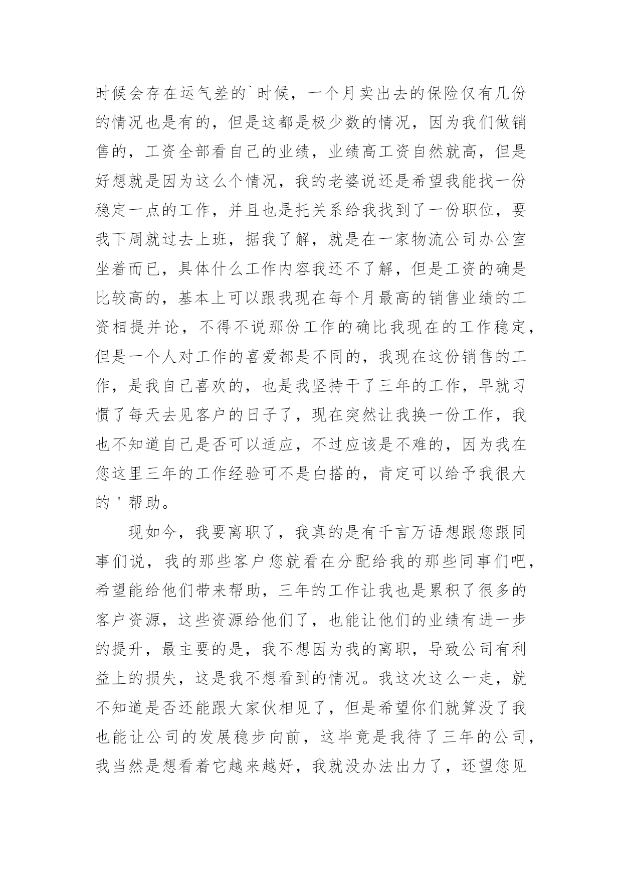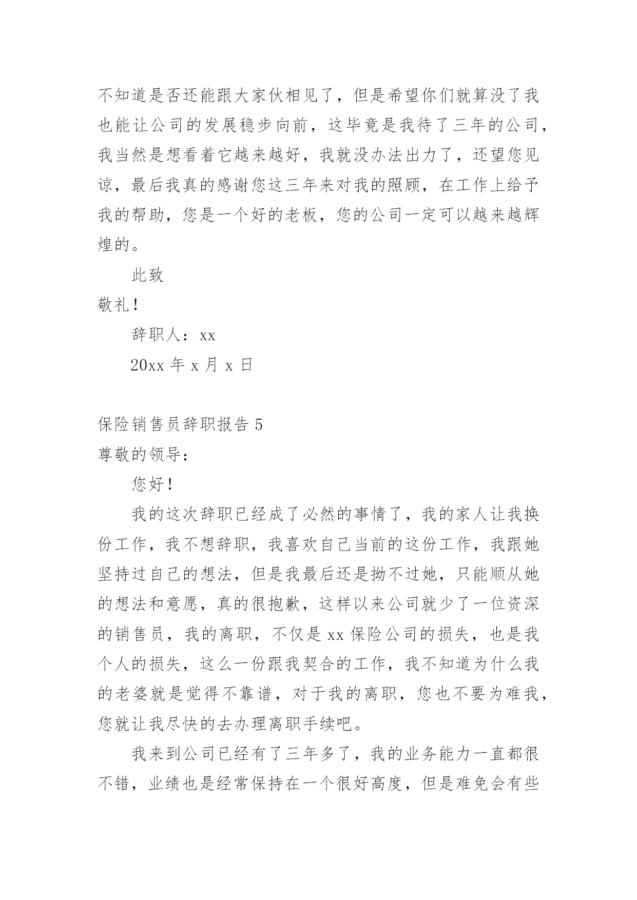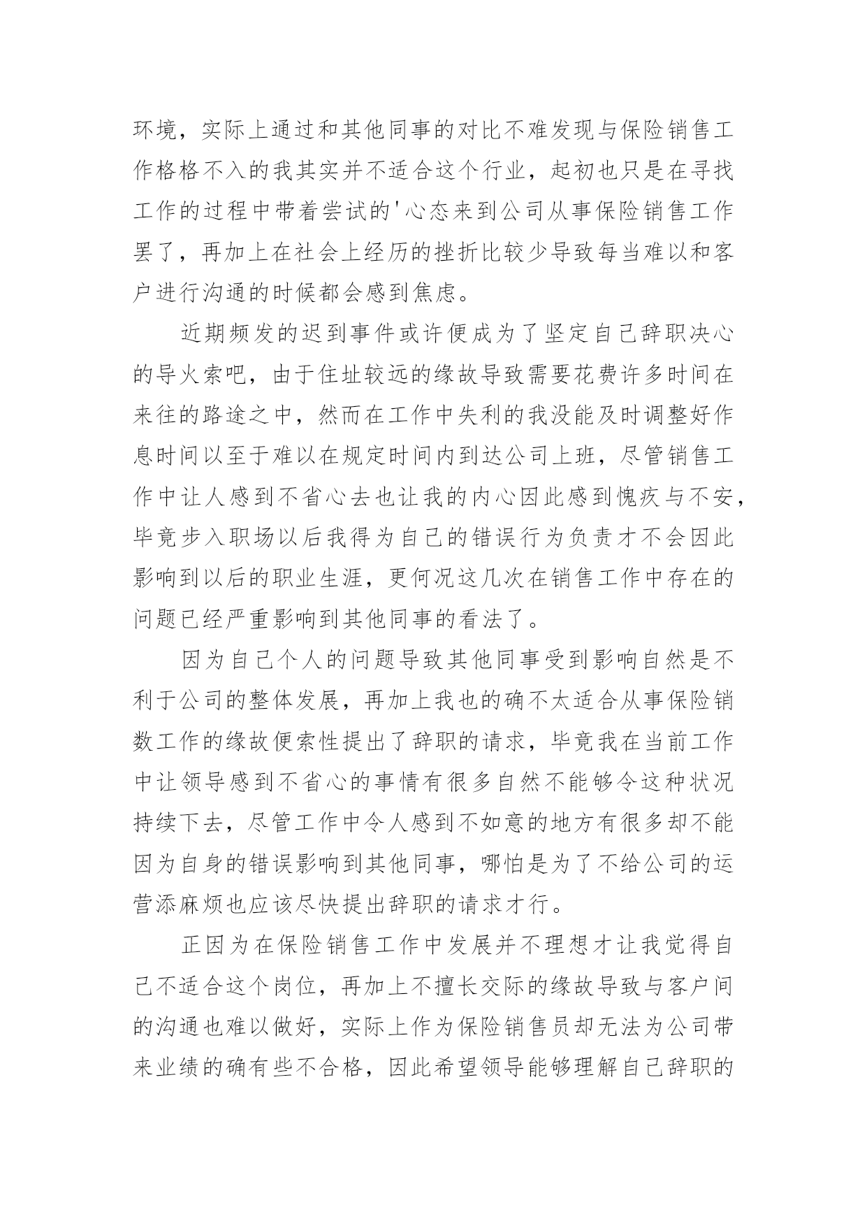 保险销售员辞职报告保险销售员辞职报告5篇在不断进步的时代,报告的使用频率呈上升趋势,写报告的时候要注意内容的完整。为了让您不再为写报告头疼,下面是小编精心整理的保险销售员辞职报告,欢迎大家借鉴与参考,希望对大家有所帮助。保险销售员辞职报告1尊敬的领导:您好!由于近期在保险销售工作中出现了数次上班迟到的状况令我的内心感到十分沮丧,实际上由于目前的住址距离公司较远的缘故导致每天都需要花费大量的时间在行程中,若是对时间规划不合理的话很容易因为堵车等因素导致自己上班睡觉,再加上这种状况的确给公司的同事造成了不良的影响不禁令我反思自己是否适合保险销售工作,因此在我确定自身并不适合从事保险销售工作以后写下了这份辞职报告并希望得到领导的认可。其实由于自己入职时间不长的缘故导致对保险销售的职责并没有想象中那般清晰,或者说是对公司的认同感不强导致难以承受销售工作带来的压力,尽管领导在以往的销售工作中为自己提供了许多指导却难以让我适应当前的工作环境,实际上通过和其他同事的对比不难发现与保险销售工作格格不入的我其实并不适合这个行业,起初也只是在寻找工作的过程中带着尝试的'心态来到公司从事保险销售工作罢了,再加上在社会上经历的挫折比较少导致每当难以和客户进行沟通的时候都会感到焦虑。近期频发的迟到事件或许便成为了坚定自己辞职决心的导火索吧,由于住址较远的缘故导致需要花费许多时间在来往的路途之中,然而在工作中失利的我没能及时调整好作息时间以至于难以在规定时间内到达公司上班,尽管销售工作中让人感到不省心去也让我的内心因此感到愧疚与不安,毕竟步入职场以后我得为自己的错误行为负责才不会因此影响到以后的职业生涯,更何况这几次在销售工作中存在的问题已经严重影响到其他同事的看法了。因为自己个人的问题导致其他同事受到影响自然是不利于公司的整体发展,再加上我也的确不太适合从事保险销数工作的缘故便索性提出了辞职的请求,毕竟我在当前工作中让领导感到不省心的事情有很多自然不能够令这种状况持续下去,尽管工作中令人感到不如意的地方有很多却不能因为自身的错误影响到其他同事,哪怕是为了不给公司的运营添麻烦也应该尽快提出辞职的请求才行。正因为在保险销售工作中发展并不理想才让我觉得自己不适合这个岗位,再加上不擅长交际的缘故导致与客户间的沟通也难以做好,实际上作为保险销售员却无法为公司带来业绩的确有些不合格,因此希望领导能够理解自己辞职的原因从而对这份报告进行批复。此致敬礼!辞职人:xxx20xx年x月x日保险销售员辞职报告2敬爱的公司领导:您好!因个人职业选择的原因,我现在请求辞去在人xx公司的职位。公司的企业文化感化了我,我对公司是深有感情的。来到人保公司两年了,正是在这里我开始踏上了社会,完成了自己从一个学生到社会人的转变。公司平等的人际关系和开明的工作作风,一度让我有着找到了依靠的感觉,在这里我能开心的工作,开心的学习。我要感谢xx公司两年来对我的培养,从试用到转正,公司给予了我成长的'机会和学习发展的平台,各级领导和同事对我的指导、关心和帮助,将使我受益终身。在工作中我不断得到了x经理、x经理以及各位部门经理的的教导与点拨、指点与帮助;在参加监护人责任险、学幼险承保时,团队合作中得到同事的帮助与协同;在进行疑案调查、xxx公司出庭应诉处理保险诉讼案件过程中的收获,都使我受益匪浅。而工作之余同事之间亲密友好的关系,则使我终身难忘。我从xx年进入公司,正是xx公司经营最困难的时候,我亲身经历了公司摆脱被动不利局面、走上发展的正轨的全过程,同时我也为能在这样一个英明果断的领导班子和团结协作的同事之中工作过而骄傲。我清楚xx公司接纳我们这批新人的决策眼光,公司正值用人之际,我很遗憾自己在这个时候向公司正式提出辞职。xx公司美好的发展前景及良好的合作氛围让我在即将离去之际仍感不舍,但今因个人原因,我已决定离开公司,希望我的离去不会给公司带来任何不便;对分公司各位领导、x经理的赏识与信任,我将终抱感激之情。今后,无论我将怎样生活,我都会永远感激人保公司对我的培养,在我困难的时候,工作中不成熟的时候给我的帮助和宽容。是xx公司给了我现在拥有的一切。我保证并宣誓:一、遵守法律法规、遵守保险职业道德规范。二、保守xx公司商业秘密及各项管理。请接受我的辞职请求。此致敬礼!辞职人:xxx20xx年x月x日保险销售员辞职报告3尊敬的领导:您好!首先向您说声对不起,我辜负了您对我的期望,我是怀着十分复杂的心情写这份申请书的,今天我要向您报告一件事情,那就是我的离职。工作这件事,不是能随随便便拿来开玩笑的。我也是经过深思才决定离职的我希望您能够认真的读完,也希望您能感受到我辞职的理由,以及我的诚意。在xx做一名销售工作的这段时间里,我有幸得到了公司领导及同事们的倾心指导及热情帮助。工作上,我学到了许多宝