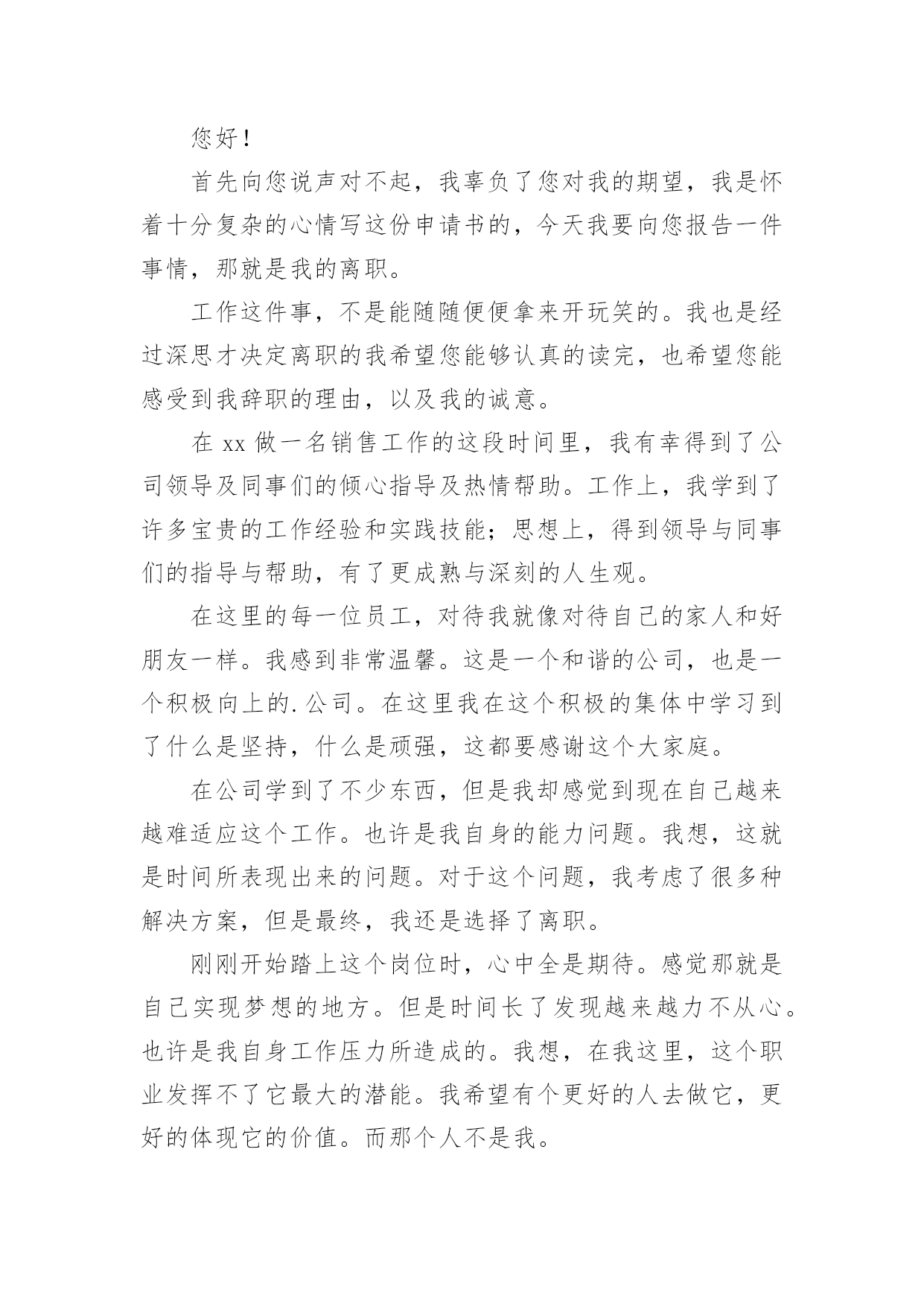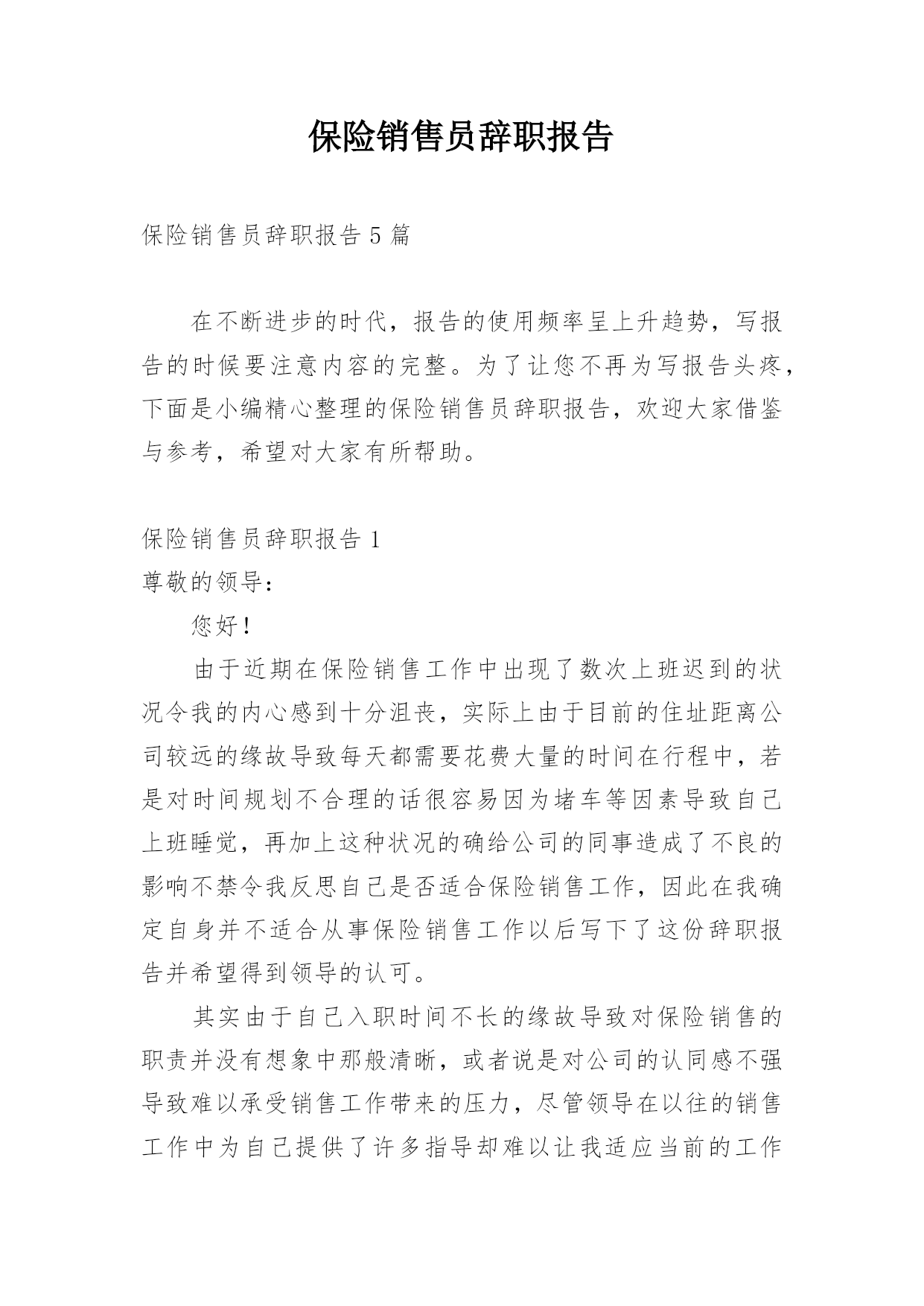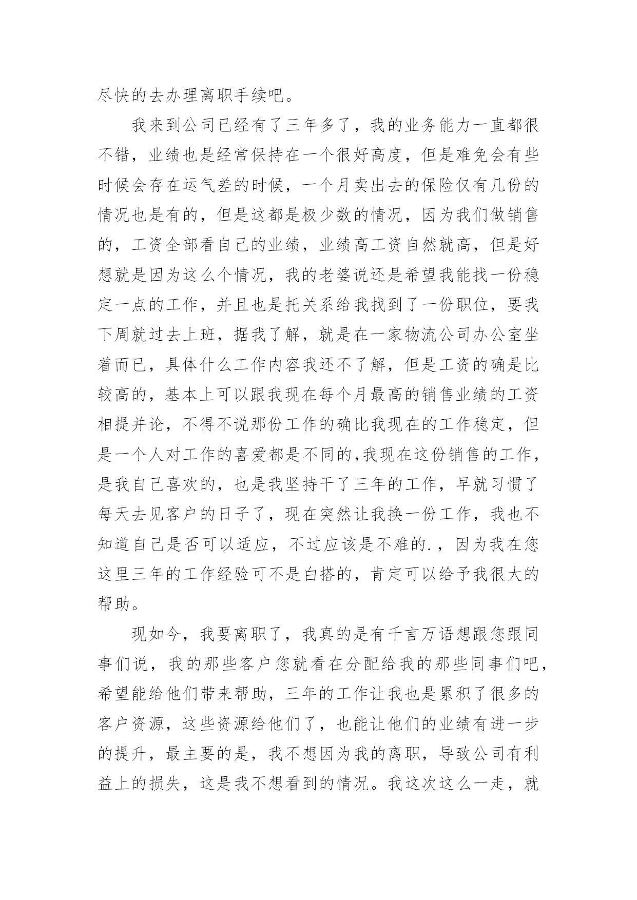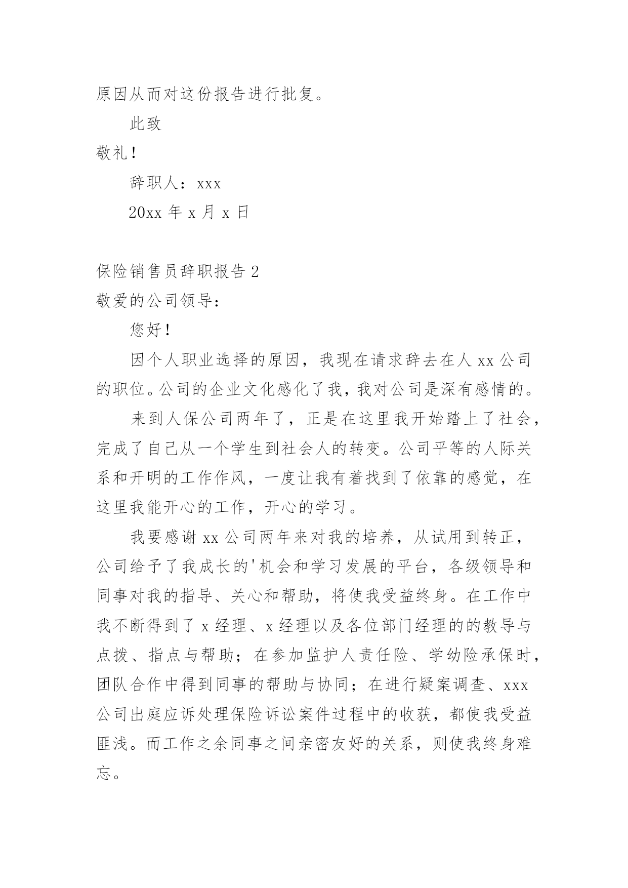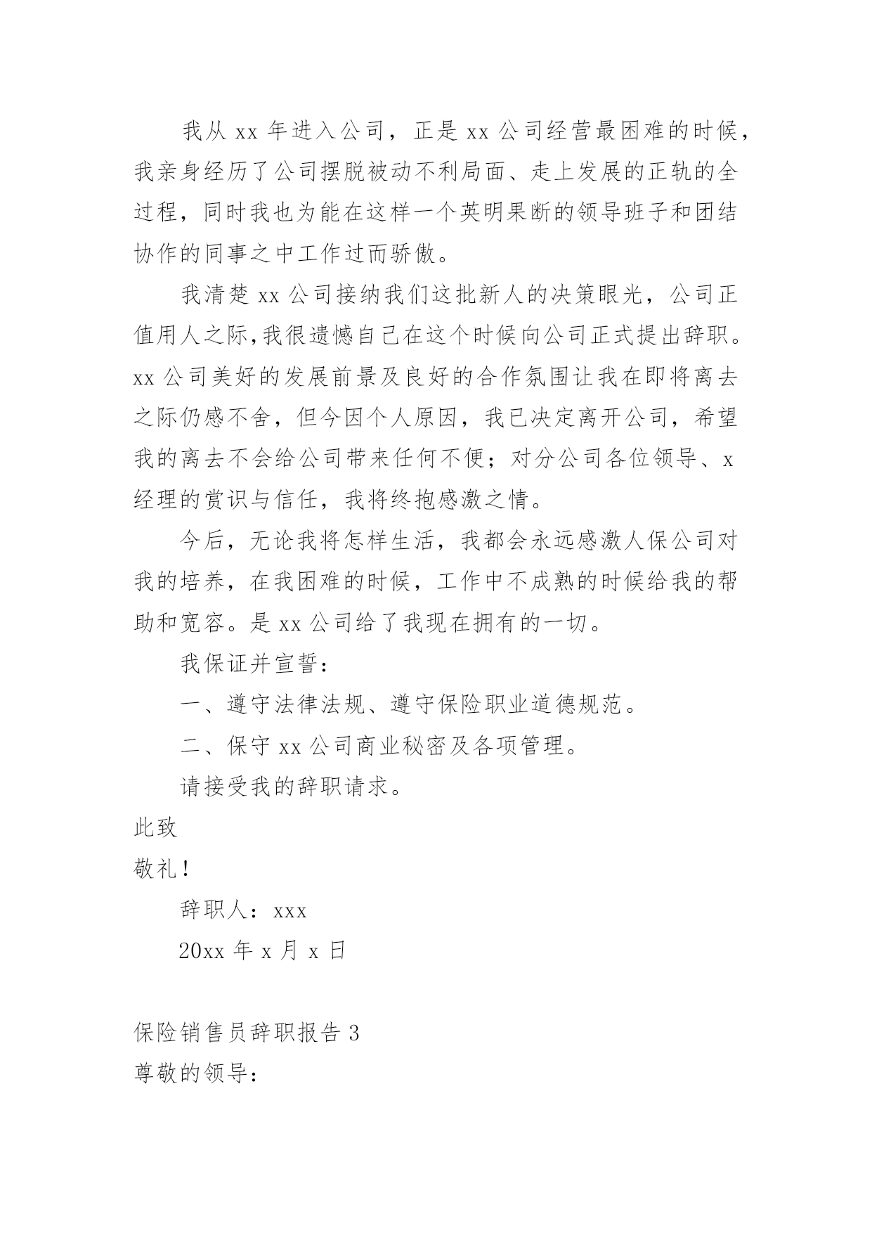 保险销售员辞职报告保险销售员辞职报告5篇在不断进步的时代,报告的使用频率呈上升趋势,写报告的时候要注意内容的完整。为了让您不再为写报告头疼,下面是小编精心整理的保险销售员辞职报告,欢迎大家借鉴与参考,希望对大家有所帮助。保险销售员辞职报告1尊敬的领导:您好!由于近期在保险销售工作中出现了数次上班迟到的状况令我的内心感到十分沮丧,实际上由于目前的住址距离公司较远的缘故导致每天都需要花费大量的时间在行程中,若是对时间规划不合理的话很容易因为堵车等因素导致自己上班睡觉,再加上这种状况的确给公司的同事造成了不良的影响不禁令我反思自己是否适合保险销售工作,因此在我确定自身并不适合从事保险销售工作以后写下了这份辞职报告并希望得到领导的认可。其实由于自己入职时间不长的缘故导致对保险销售的职责并没有想象中那般清晰,或者说是对公司的认同感不强导致难以承受销售工作带来的压力,尽管领导在以往的销售工作中为自己提供了许多指导却难以让我适应当前的工作环境,实际上通过和其他同事的对比不难发现与保险销售工作格格不入的我其实并不适合这个行业,起初也只是在寻找工作的过程中带着尝试的'心态来到公司从事保险销售工作罢了,再加上在社会上经历的挫折比较少导致每当难以和客户进行沟通的时候都会感到焦虑。近期频发的迟到事件或许便成为了坚定自己辞职决心的导火索吧,由于住址较远的缘故导致需要花费许多时间在来往的路途之中,然而在工作中失利的我没能及时调整好作息时间以至于难以在规定时间内到达公司上班,尽管销售工作中让人感到不省心去也让我的内心因此感到愧疚与不安,毕竟步入职场以后我得为自己的错误行为负责才不会因此影响到以后的职业生涯,更何况这几次在销售工作中存在的问题已经严重影响到其他同事的看法了。因为自己个人的问题导致其他同事受到影响自然是不利于公司的整体发展,再加上我也的确不太适合从事保险销数工作的缘故便索性提出了辞职的请求,毕竟我在当前工作中让领导感到不省心的事情有很多自然不能够令这种状况持续下去,尽管工作中令人感到不如意的地方有很多却不能因为自身的错误影响到其他同事,哪怕是为了不给公司的运营添麻烦也应该尽快提出辞职的请求才行。正因为在保险销售工作中发展并不理想才让我觉得自己不适合这个岗位,再加上不擅长交际的缘故导致与客户间的沟通也难以做好,实际上作为保险销售员却无法为公司带来业绩的确有些不合格,因此希望领导能够理解自己辞职的原因从而对这份报告进行批复。此致敬礼!辞职人:xxx20xx年x月x日保险销售员辞职报告2敬爱的公司领导:您好!因个人职业选择的原因,我现在请求辞去在人xx公司的职位。公司的企业文化感化了我,我对公司是深有感情的。来到人保公司两年了,正是在这里我开始踏上了社会,完成了自己从一个学生到社会人的转变。公司平等的人际关系和开明的工作作风,一度让我有着找到了依靠的感觉,在这里我能开心的工作,开心的学习。我要感谢xx公司两年来对我的培养,从试用到转正,公司给予了我成长的'机会和学习发展的平台,各级领导和同事对我的指导、关心和帮助,将使我受益终身。在工作中我不断得到了x经理、x经理以及各位部门经理的的教导与点拨、指点与帮助;在参加监护人责任险、学幼险承保时,团队合作中得到同事的帮助与协同;在进行疑案调查、xxx公司出庭应诉处理保险诉讼案件过程中的收获,都使我受益匪浅。而工作之余同事之间亲密友好的关系,则使我终身难忘。我从xx年进入公司,正是xx公司经营最困难的时候,我亲身经历了公司摆脱被动不利局面、走上发展的正轨的全过程,同时我也为能在这样一个英明果断的领导班子和团结协作的同事之中工作过而骄傲。我清楚xx公司接纳我们这批新人的决策眼光,公司正值用人之际,我很遗憾自己在这个时候向公司正式提出辞职。xx公司美好的发展前景及良好的合作氛围让我在即将离去之际仍感不舍,但今因个人原因,我已决定离开公司,希望我的离去不会给公司带来任何不便;对分公司各位领导、x经理的赏识与信任,我将终抱感激之情。今后,无论我将怎样生活,我都会永远感激人保公司对我的培养,在我困难的时候,工作中不成熟的时候给我的帮助和宽容。是xx公司给了我现在拥有的一切。我保证并宣誓:一、遵守法律法规、遵守保险职业道德规范。二、保守xx公司商业秘密及各项管理。请接受我的辞职请求。此致敬礼!辞职人:xxx20xx年x月x日保险销售员辞职报告3尊敬的领导:您好!首先向您说声对不起,我辜负了您对我的期望,我是怀着十分复杂的心情写这份申请书的,今天我要向您报告一件事情,那就是我的离职。工作这件事,不是能随随便便拿来开玩笑的。我也是经过深思才决定离职的我希望您能够认真的读完,也希望您能感受到我辞职的理由,以及我的诚意。在xx做一名销售工作的这段时间里,我有幸得到了公司领导及同事们的倾心指导及热情帮助。工作上,我学到了许多宝