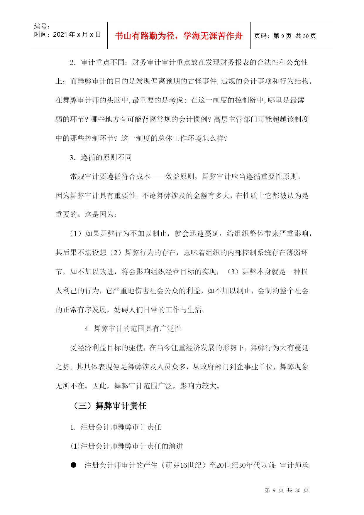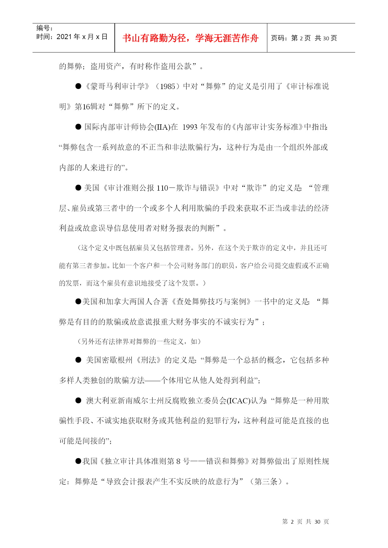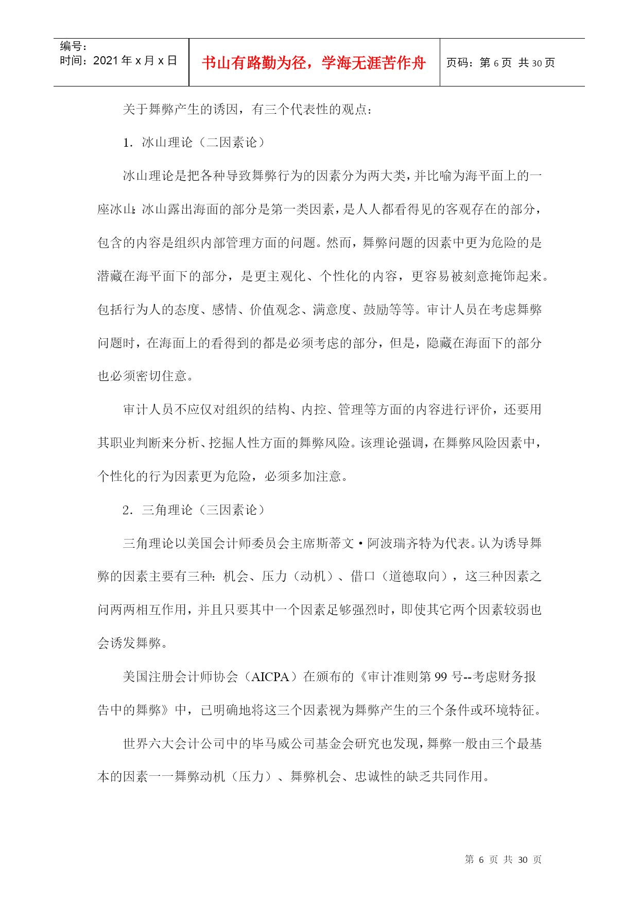 编号:时间:2021年x月x日书山有路勤为径,学海无涯苦作舟页码:第PAGE30页共NUMPAGES30页第PAGE\*MERGEFORMAT30页共NUMPAGES\*MERGEFORMAT30页舞弊审计一、舞弊(一)定义(有关舞弊的定义有多种,职业界、法律界对舞弊都有不同的认识。)●国际审计准则ISA240(旧的或修订2004.2)对“舞弊”的定义是:“舞弊是指管理当局、董事、雇员或第三方中的一人或多人利用欺骗的手段来获取不正当的或非法的经济利益的故意行为”。并指出了与审计师有关的两种类型的舞弊,“即非法侵占资产的错报和虚饰财务报表的错报”;管理当局、董事中的一人或多人的舞弊被称为“管理人员舞弊”,仅仅是被审计单位中的雇员的舞弊被称为“雇员舞弊”。●美国《国家审计准则第82号通知》对“舞弊”的定义是:“为了得到他人的信任,故意歪曲事实真相;并且明知是违法的或者是错误的行为,舞弊者因此行为获得利益,同时对第三者因此行为造成损失”。(2002年10月,美国注册会计师协会(AICPA)在综合理论界、实务界众多建议的基础上,颁布了《审计准则第99号--考虑财务报告中的舞弊》取代了原有反舞弊审计准则SASNo.82)●美国注册会计师协会(AICPA)在2002年发布的第99号《审计准则第99号——考虑财务报告中的舞弊》中对舞弊的定义没有发生变化。(此条定义可以说是目前在美国最高的、最具权威性的定义。)●1977年美国公证会计师协会颁发的《审计标准说明》第16辑对“舞弊”所下的定义:“是指故意造假的财务报表,如管理人员蓄意虚报,有时指管理人员的舞弊;盗用资产,有时称作盗用公款”。●《蒙哥马利审计学》(1985)中对“舞弊”的定义是引用了《审计标准说明》第16辑对“舞弊”所下的定义。●国际内部审计师协会(IIA)在1993年发布的《内部审计实务标准》中指出:“舞弊包含一系列故意的不正当和非法欺骗行为,这种行为是由一个组织外部或内部的人来进行的”。●美国《审计准则公报110-欺诈与错误》中对“欺诈”的定义是:“管理层、雇员或第三者中的一个或多个人利用欺骗的手段来获取不正当或非法的经济利益或故意误导信息使用者对财务报表的判断”。(这个定义中既包括雇员又包括管理者。另外,在这个关于欺诈的定义中,并且还可能有第三者参加。比如一个客户和一个公司财务部门的职员,客户给公司提交虚假或不正确的发票,而这个雇员有意识地接受了这个发票。)●美国和加拿大两国人合著《查处舞弊技巧与案例》一书中的定义是:“舞弊是有目的的欺骗或故意谎报重大财务事实的不诚实行为”;(另外还有法律界对舞弊的一些定义,如)●美国密歇根州《刑法》的定义是:“舞弊是一个总括的概念,它包括多种多样人类独创的欺骗方法——个体用它从他人处得到利益”;●澳大利亚新南威尔士州反腐败独立委员会(ICAC)认为:“舞弊是一种用欺骗性手段、不诚实地获取财务或其他利益的犯罪行为,这种利益可能是直接的也可能是间接的”;●我国《独立审计具体准则第8号——错误和舞弊》对舞弊做出了原则性规定:舞弊是“导致会计报表产生不实反映的故意行为”(第三条)。(上面的定义有的是比较广义的,有的是比较狭义的,比如有的比较宽泛,有的比较具体一些,专指财务报表,但)从实质上看:舞弊至少包括以下几方面含义:其一,舞弊的特征是有预谋、故意的行为;其二,舞弊的手段具有欺骗性;其三,舞弊行为表现为违法违规;其四,舞弊的目的是为了获得一定的利益。因此,综合以上定义可以认为:舞弊是集团整体或个人在进行财务活动或从事高尚行政生涯时有预谋、故意地通过种种欺骗性的手段和违法违规行为来获取一定的利益。与审计师有关的舞弊是指蓄意对财务报表之金额或披露作不实表达,包括虚饰财务报告及挪用或侵占资产。(二)舞弊与错误(备注:也包括了舞弊的内容)●两者的根本区别在于“故意的”和“非故意的”国际审计准则ISA240中阐述,财务报表错报可能来源于舞弊和错误。两者的根本区别在与“故意的”和“非故意的”区别,即舞弊是“故意的”行为,而错误是“非故意的”行为。●两者所包括的内容不同◆国际审计准则ISA240中阐述舞弊主要包括:(1)操纵、伪造、变造记录或凭证(注意:旧的ISA240中这一条是:诸如操纵、伪造、变造记录或凭证的欺诈行为,新的是直接写出的);(2)侵占资产;(3)在财务报告中误报或删除交易、事项或其他重要信息;(4)蓄意使用不当的会计政策。错误主要包括:(1)收集和处理会计数据的错误;(2)由于对事实的疏忽和误解从而造成不恰当的会计估计;(3)对会计政策的误用。(注意:新旧ISA240除了舞弊的第一条有变化外,其它的都一样)◆我国审计准则《独立审计具体准则第8号——错误