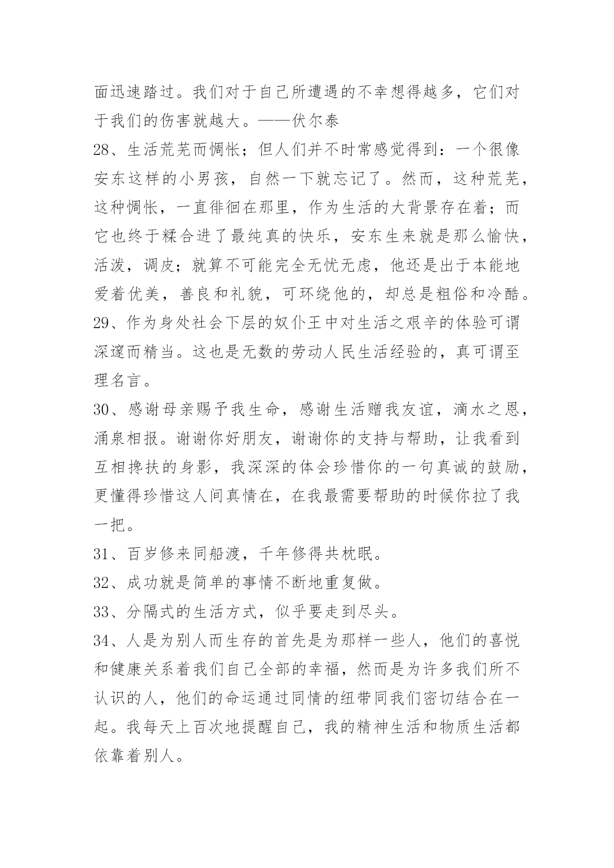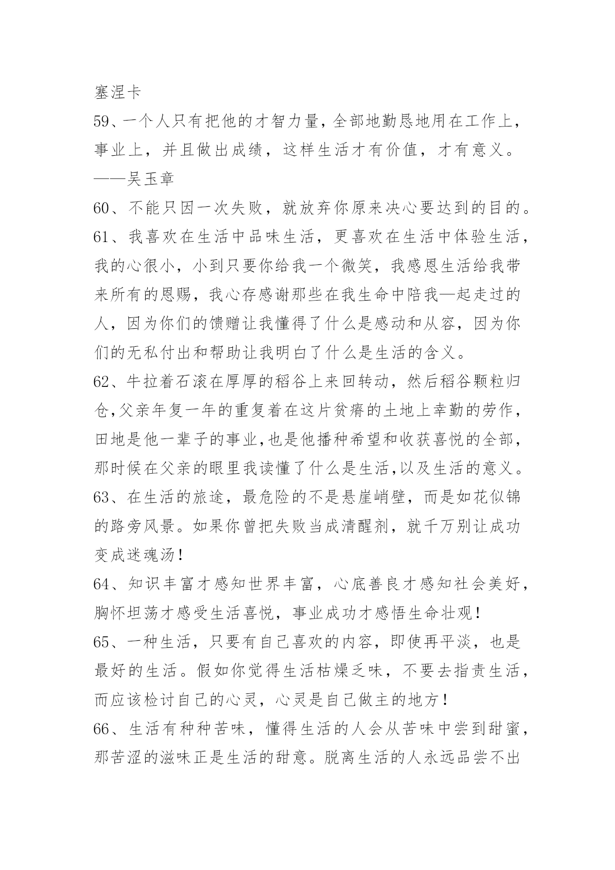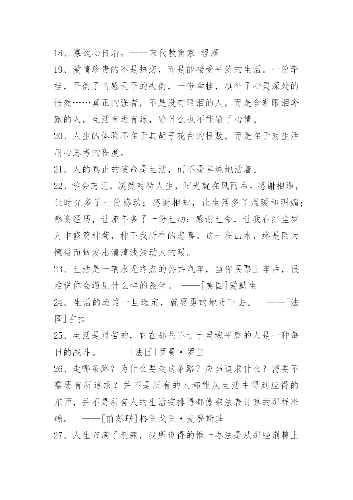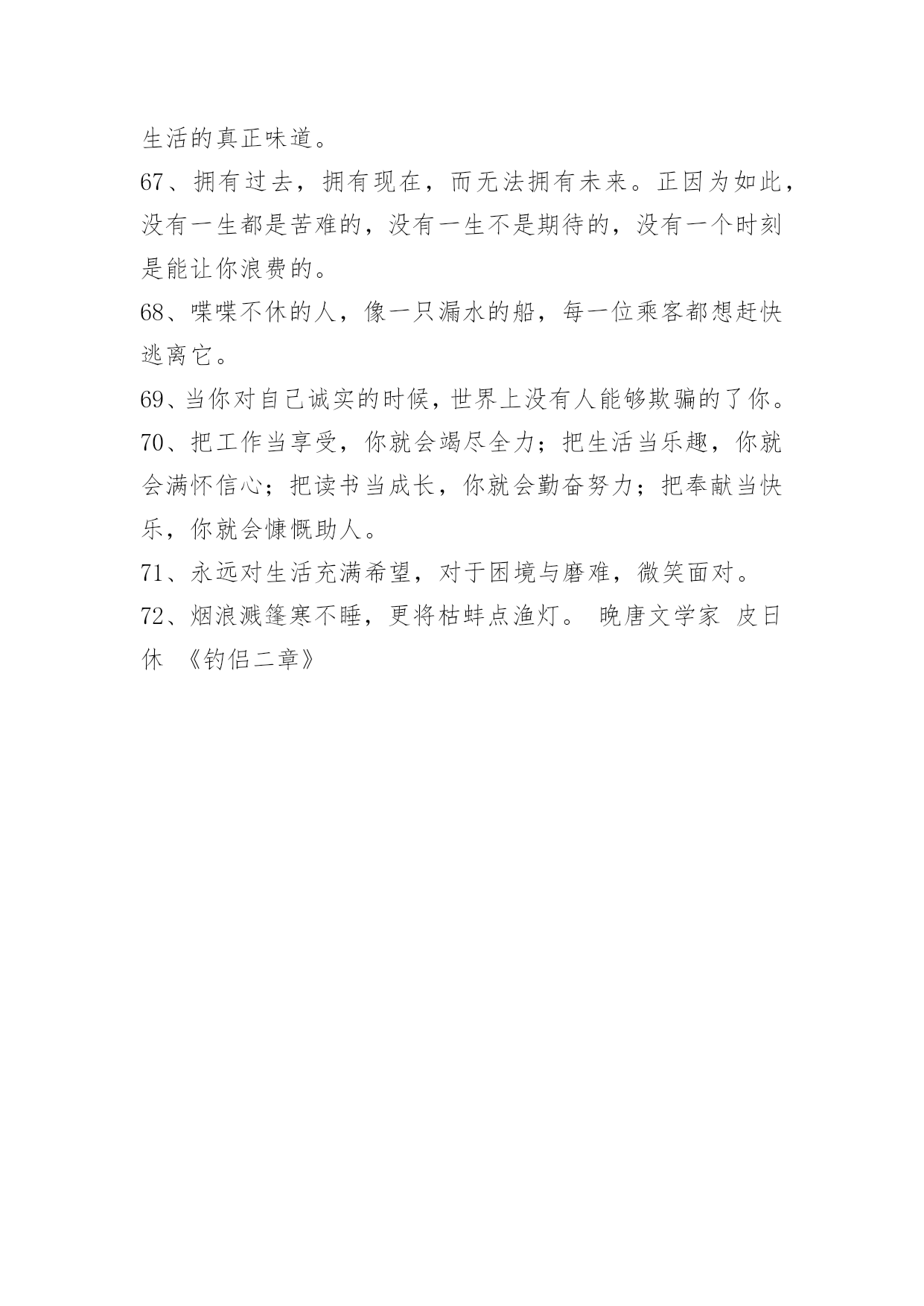生活感悟格言2024年有关生活感悟格言集锦72句与其在别人的生活里跑龙套,不如精彩做自己。以下是小编为大家推荐的生活感悟格言72句,欢迎大家阅读。1、只有明确了人生目标,才有方向感。2、快乐是最好的天气。使人成熟的是经历,而不是岁月。让我们感谢过去吧,它会带给我们一个更好的未来。生活从来都是波澜起伏的,命运从来都是峰回路转的,因为有了曲折和故事,我们的生命才会精彩。有时候,哭泣,不是屈服;后退,不是认输;放手,不是放弃;沉默,不是无话可说。3、无节制的生活在一瞬间往往会觉得有诗意,然而它给生命带来的却是疲萎和痛苦。生活只有赠予,才是舒心的享受,人生只有服务,才是踏实的生活。4、生活的航行给了每个人一把橹,但不同的航道决定了不同的归宿。应该怎样理智地生活?每一次的出发都是严肃的考验!5、今天做的一切挣扎都是在为明天积蓄力量,所以别放弃。青春,注定了要颠簸,要有眼泪和汗水,有委屈、不甘和失败。小时候画在手上的表没有动,却带走了我们最好的时光。6、别跟自己过不去,不要在乎别人的评价,用心做自己的事情,每个人都有自己的活法,最重要的是今天的心情,自己感觉幸福才是真幸福。7、人生的价值不在于你度过了多少时间,而是你生活的深度。8、生活中如果只有幸福、快乐,没有苦难、悲伤,这样的生活至少不是人的生活。企图只去选择享乐和满足的生活,只能带来愚昧和野蛮。9、俭朴的生活,不但可使精神愉快,而且可以培养革命品质。10、如果有来世,要做一棵树,站成永恒,没有悲欢的姿势。一半在土里安详,一半在风里飞扬,一半洒落阴凉,一半沐浴阳光,非常沉默非常骄傲,从不依靠从不寻找。11、我为什么要觉得可怜,这就是我的生活。我甚至要感谢它,它让我在任何情况下都必须往前走。我没有退路,我只能不停地努力向前走。我为什么不能做到?12、我们的生活所需的思想,也许在三千年前就思维殆尽。我们只需要在老柴上加新火就行了。——芥川龙之介13、幸福对每个人的含意和标准都是不同的,对我来说,能和自己心爱的人生活在一起,便是莫大的幸福。14、生活,就是知道自己的价值、自己所能做到的与自己所应该做到的。生活,就是理智。15、生活,这是一切书籍中第一本重要的书。——罗曼·罗兰《母与子》16、多余的财富只能换取奢靡者的生活,而心灵的必需品是无需用钱购买的。梭洛17、你被人谈到的机会越多,你就越希望被人谈到。——伯特兰·罗素18、寡欲心自清。——宋代教育家程颢19、爱情珍贵的不是热恋,而是能接受平淡的生活。一份牵挂,平衡了情感天平的失衡,一份牵挂,填补了心灵深处的怅然……真正的强者,不是没有眼泪的人,而是含着眼泪奔跑的人。生活有进有退,输什么也不能输了心情。20、人生的体验不在于其胡子花白的根数,而是在于对生活用心思考的程度。21、人的真正的使命是生活,而不是单纯地活着。22、学会忘记,淡然对待人生,阳光就在风雨后。感谢相遇,让时光多了一份感动;感谢相知,让生活多了温暖和明媚;感谢经历,让流年多了一份生动;感谢生命,让我在红尘岁月中修篱种菊,种下我所有的悲喜。这一程山水,终是因为懂得而散发出清清浅浅动人的暖。23、生活是一辆永无终点的公共汽车,当你买票上车后,很难说你会遇见什么样的旅伴。——[美国]爱默生24、生活的道路一旦选定,就要勇敢地走下去。——[法国]左拉25、生活是艰苦的,它在那些不甘于灵魂平庸的人是一种每日的战斗。——[法国]罗曼·罗兰26、走哪条路?为什么要走这条路?应当追求什么?需要不需要有所追求?并不是所有的人都能从生活中得到应得的东西,并不是所有人的生活安排得都像乘法表计算的那样准确。——[前苏联]格里戈里·麦登斯基27、人生布满了荆棘,我所晓得的惟一办法是从那些荆棘上面迅速踏过。我们对于自己所遭遇的不幸想得越多,它们对于我们的伤害就越大。——伏尔泰28、生活荒芜而惆怅;但人们并不时常感觉得到:一个很像安东这样的小男孩,自然一下就忘记了。然而,这种荒芜,这种惆怅,一直徘徊在那里,作为生活的大背景存在着;而它也终于糅合进了最纯真的快乐,安东生来就是那么愉快,活泼,调皮;就算不可能完全无忧无虑,他还是出于本能地爱着优美,善良和礼貌,可环绕他的,却总是粗俗和冷酷。29、作为身处社会下层的奴仆王中对生活之艰辛的体验可谓深邃而精当。这也是无数的劳动人民生活经验的,真可谓至理名言。30、感谢母亲赐予我生命,感谢生活赠我友谊,滴水之恩,涌泉相报。谢谢你好朋友,谢谢你的支持与帮助,让我看到互相搀扶的身影,我深深的体会珍惜你的一句真诚的鼓励,更懂得珍惜这人间真情在,在我最需要帮助的时候你拉了我一把。31、百岁修来同船渡,千年修得共枕眠。32、成功就是简单的事情不断地重复做。33、分隔式的生活方式,似乎要走到尽头。34、人是为别人而生存的首先是为那样一些人,他们的喜悦和健康关系着我们自己全部