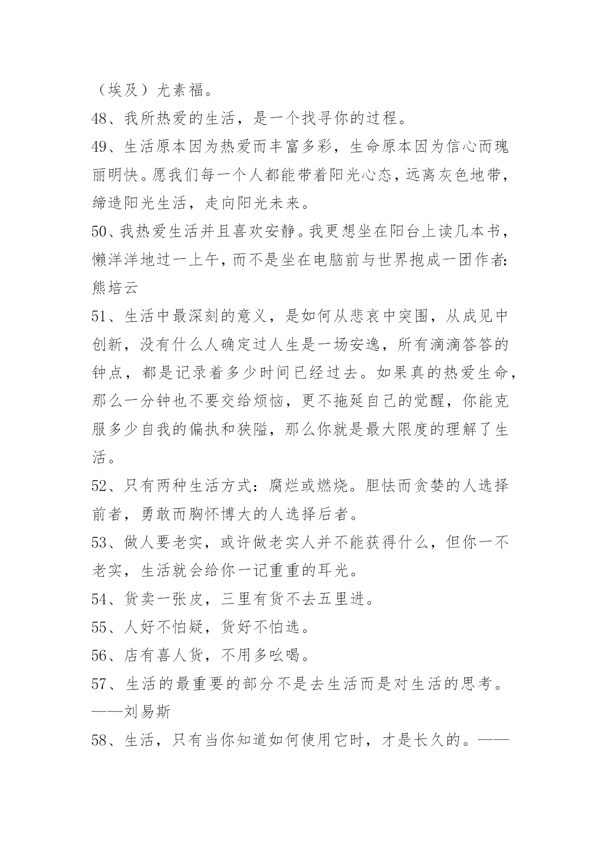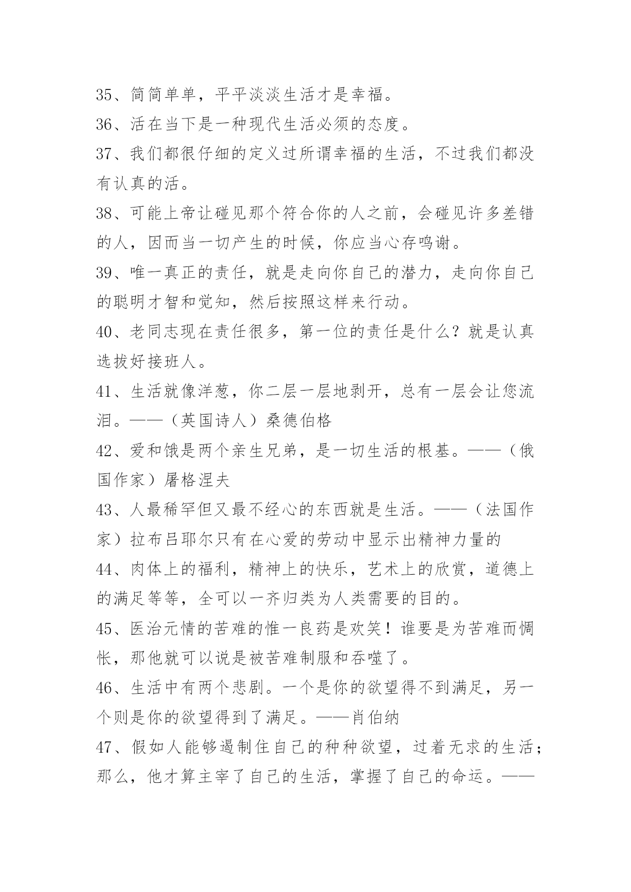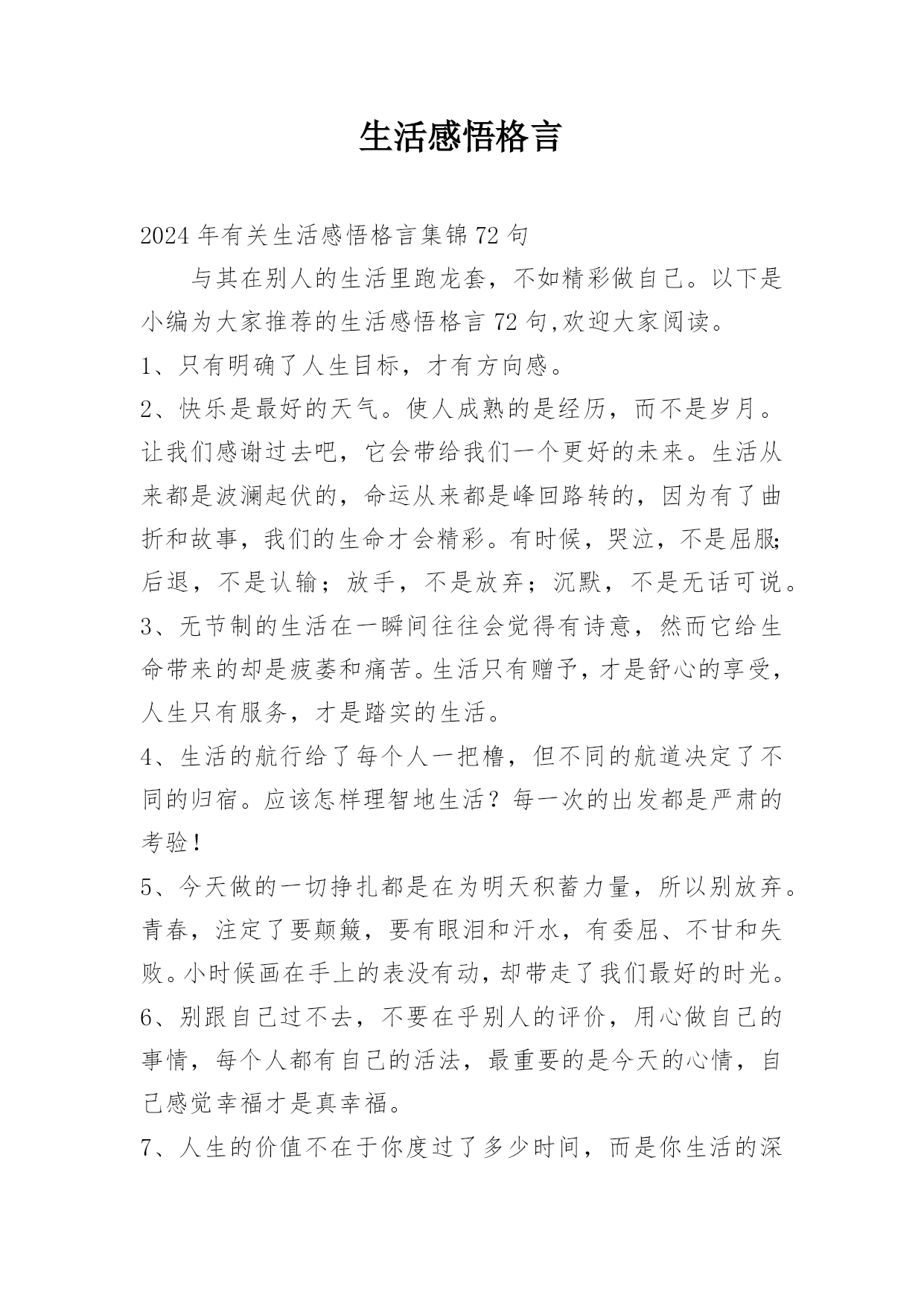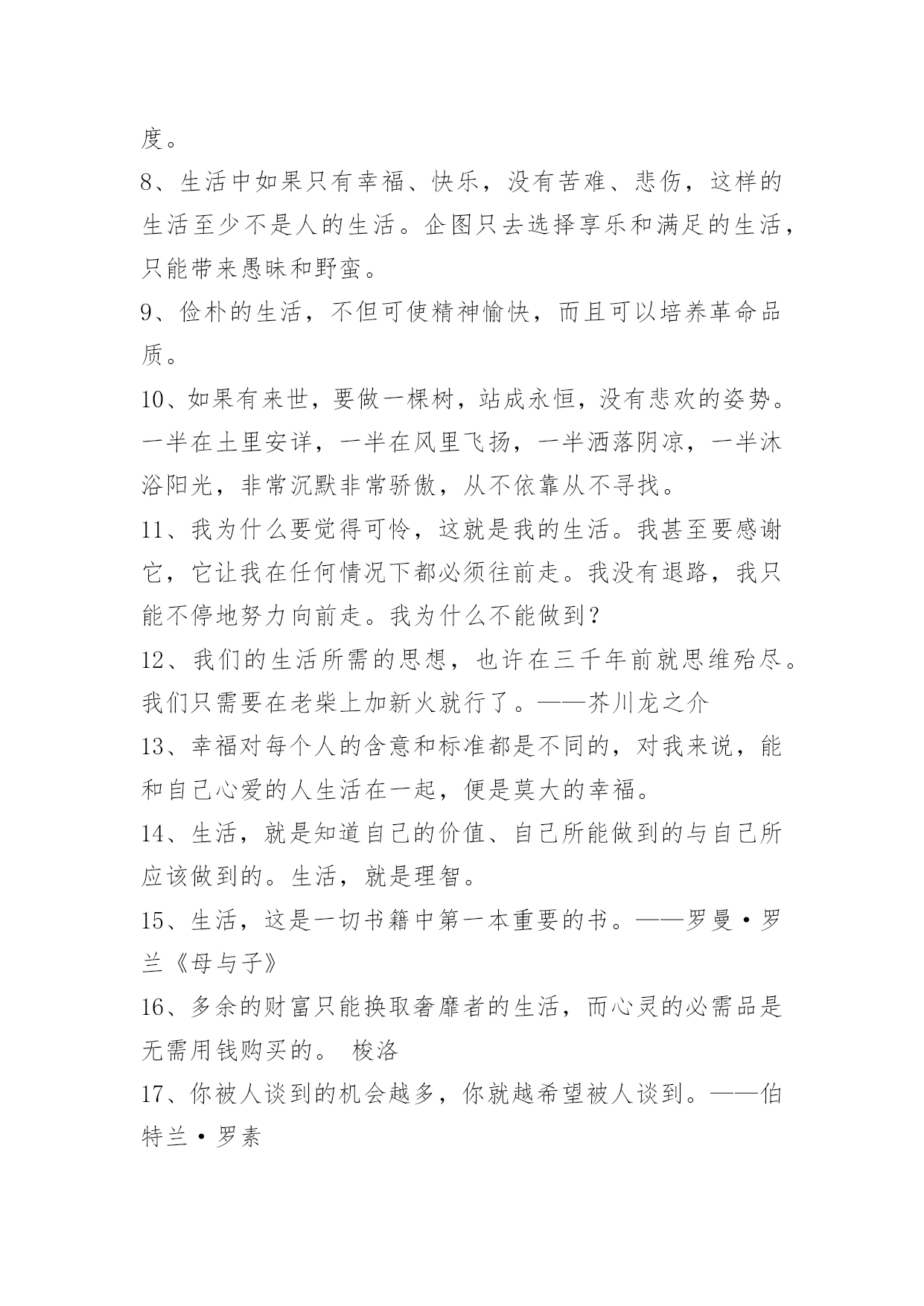 生活感悟格言2024年有关生活感悟格言集锦72句与其在别人的生活里跑龙套,不如精彩做自己。以下是小编为大家推荐的生活感悟格言72句,欢迎大家阅读。1、只有明确了人生目标,才有方向感。2、快乐是最好的天气。使人成熟的是经历,而不是岁月。让我们感谢过去吧,它会带给我们一个更好的未来。生活从来都是波澜起伏的,命运从来都是峰回路转的,因为有了曲折和故事,我们的生命才会精彩。有时候,哭泣,不是屈服;后退,不是认输;放手,不是放弃;沉默,不是无话可说。3、无节制的生活在一瞬间往往会觉得有诗意,然而它给生命带来的却是疲萎和痛苦。生活只有赠予,才是舒心的享受,人生只有服务,才是踏实的生活。4、生活的航行给了每个人一把橹,但不同的航道决定了不同的归宿。应该怎样理智地生活?每一次的出发都是严肃的考验!5、今天做的一切挣扎都是在为明天积蓄力量,所以别放弃。青春,注定了要颠簸,要有眼泪和汗水,有委屈、不甘和失败。小时候画在手上的表没有动,却带走了我们最好的时光。6、别跟自己过不去,不要在乎别人的评价,用心做自己的事情,每个人都有自己的活法,最重要的是今天的心情,自己感觉幸福才是真幸福。7、人生的价值不在于你度过了多少时间,而是你生活的深度。8、生活中如果只有幸福、快乐,没有苦难、悲伤,这样的生活至少不是人的生活。企图只去选择享乐和满足的生活,只能带来愚昧和野蛮。9、俭朴的生活,不但可使精神愉快,而且可以培养革命品质。10、如果有来世,要做一棵树,站成永恒,没有悲欢的姿势。一半在土里安详,一半在风里飞扬,一半洒落阴凉,一半沐浴阳光,非常沉默非常骄傲,从不依靠从不寻找。11、我为什么要觉得可怜,这就是我的生活。我甚至要感谢它,它让我在任何情况下都必须往前走。我没有退路,我只能不停地努力向前走。我为什么不能做到?12、我们的生活所需的思想,也许在三千年前就思维殆尽。我们只需要在老柴上加新火就行了。——芥川龙之介13、幸福对每个人的含意和标准都是不同的,对我来说,能和自己心爱的人生活在一起,便是莫大的幸福。14、生活,就是知道自己的价值、自己所能做到的与自己所应该做到的。生活,就是理智。15、生活,这是一切书籍中第一本重要的书。——罗曼·罗兰《母与子》16、多余的财富只能换取奢靡者的生活,而心灵的必需品是无需用钱购买的。梭洛17、你被人谈到的机会越多,你就越希望被人谈到。——伯特兰·罗素18、寡欲心自清。——宋代教育家程颢19、爱情珍贵的不是热恋,而是能接受平淡的生活。一份牵挂,平衡了情感天平的失衡,一份牵挂,填补了心灵深处的怅然……真正的强者,不是没有眼泪的人,而是含着眼泪奔跑的人。生活有进有退,输什么也不能输了心情。20、人生的体验不在于其胡子花白的根数,而是在于对生活用心思考的程度。21、人的真正的使命是生活,而不是单纯地活着。22、学会忘记,淡然对待人生,阳光就在风雨后。感谢相遇,让时光多了一份感动;感谢相知,让生活多了温暖和明媚;感谢经历,让流年多了一份生动;感谢生命,让我在红尘岁月中修篱种菊,种下我所有的悲喜。这一程山水,终是因为懂得而散发出清清浅浅动人的暖。23、生活是一辆永无终点的公共汽车,当你买票上车后,很难说你会遇见什么样的旅伴。——[美国]爱默生24、生活的道路一旦选定,就要勇敢地走下去。——[法国]左拉25、生活是艰苦的,它在那些不甘于灵魂平庸的人是一种每日的战斗。——[法国]罗曼·罗兰26、走哪条路?为什么要走这条路?应当追求什么?需要不需要有所追求?并不是所有的人都能从生活中得到应得的东西,并不是所有人的生活安排得都像乘法表计算的那样准确。——[前苏联]格里戈里·麦登斯基27、人生布满了荆棘,我所晓得的惟一办法是从那些荆棘上面迅速踏过。我们对于自己所遭遇的不幸想得越多,它们对于我们的伤害就越大。——伏尔泰28、生活荒芜而惆怅;但人们并不时常感觉得到:一个很像安东这样的小男孩,自然一下就忘记了。然而,这种荒芜,这种惆怅,一直徘徊在那里,作为生活的大背景存在着;而它也终于糅合进了最纯真的快乐,安东生来就是那么愉快,活泼,调皮;就算不可能完全无忧无虑,他还是出于本能地爱着优美,善良和礼貌,可环绕他的,却总是粗俗和冷酷。29、作为身处社会下层的奴仆王中对生活之艰辛的体验可谓深邃而精当。这也是无数的劳动人民生活经验的,真可谓至理名言。30、感谢母亲赐予我生命,感谢生活赠我友谊,滴水之恩,涌泉相报。谢谢你好朋友,谢谢你的支持与帮助,让我看到互相搀扶的身影,我深深的体会珍惜你的一句真诚的鼓励,更懂得珍惜这人间真情在,在我最需要帮助的时候你拉了我一把。31、百岁修来同船渡,千年修得共枕眠。32、成功就是简单的事情不断地重复做。33、分隔式的生活方式,似乎要走到尽头。34、人是为别人而生存的首先是为那样一些人,他们的喜悦和健康关系着我们自己全部