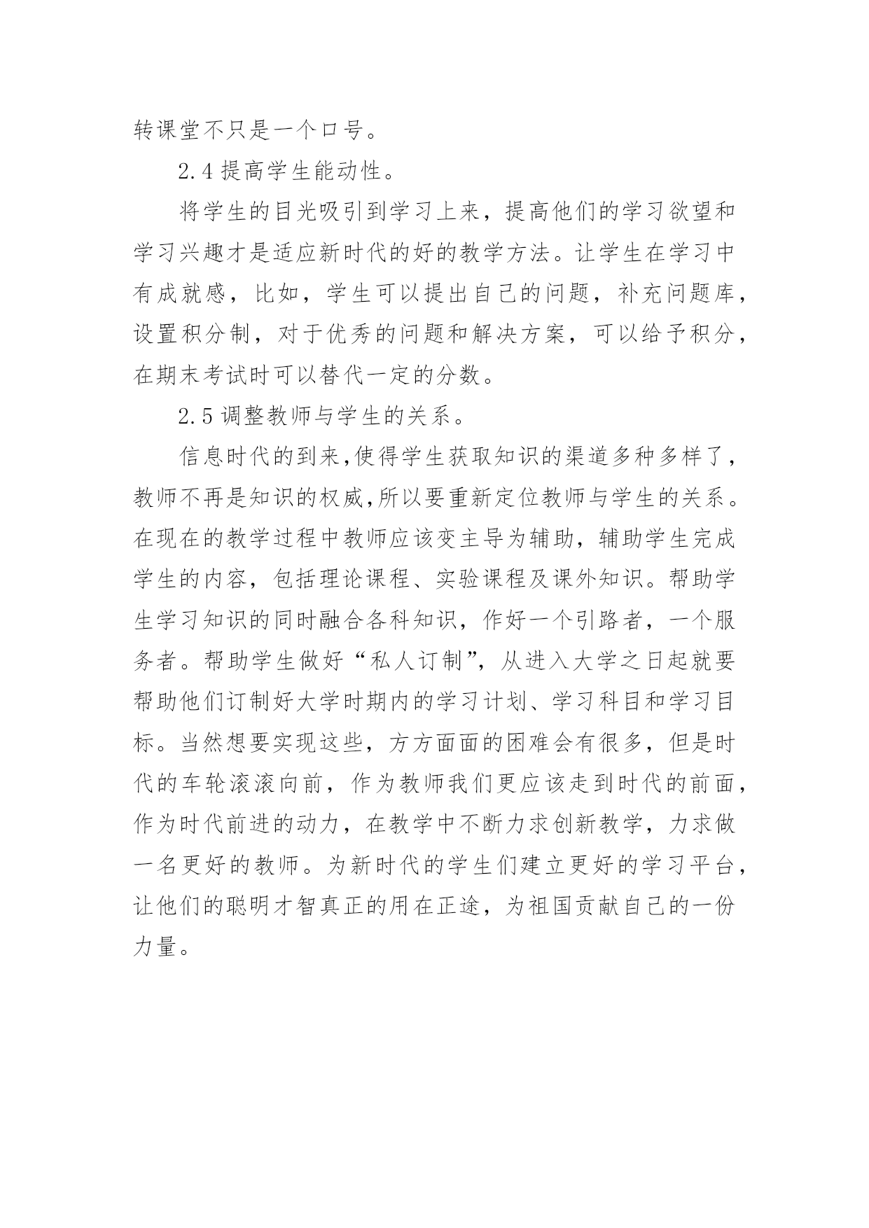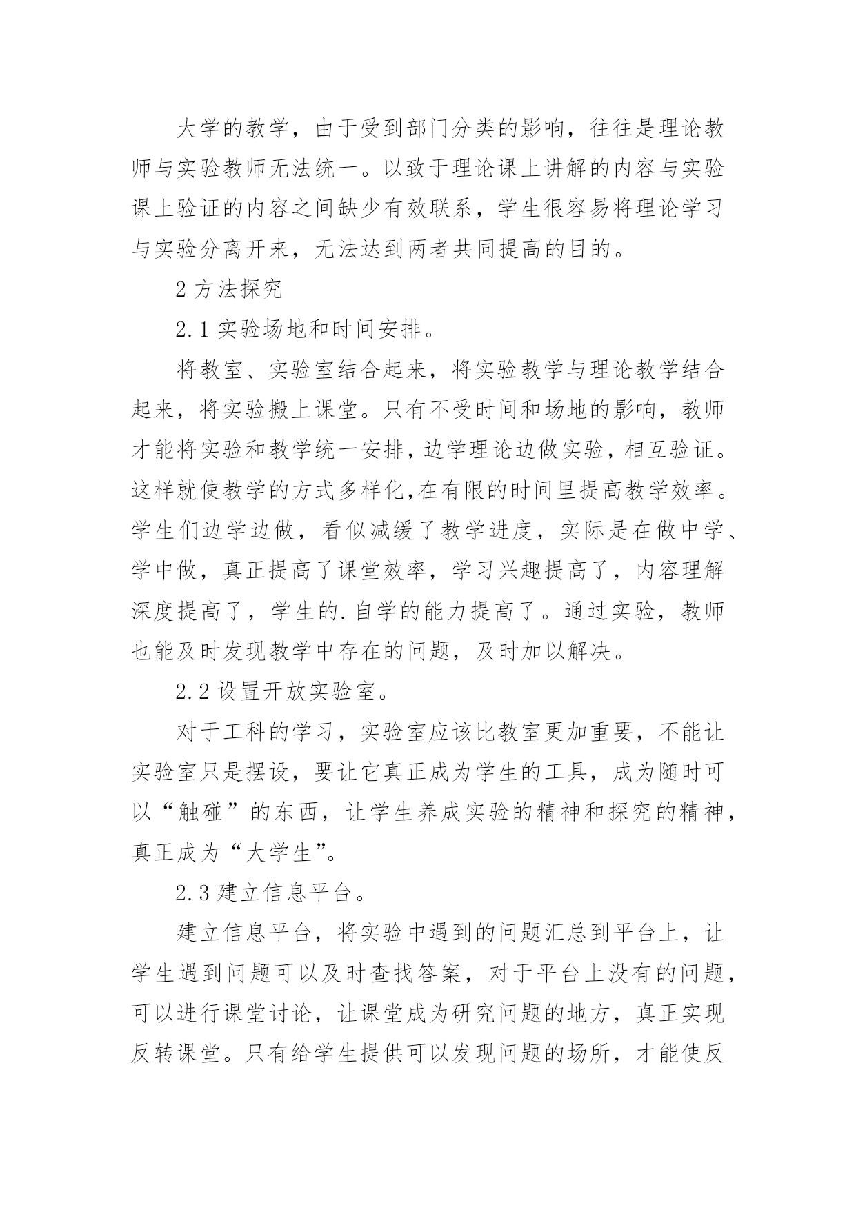 实验教学与理论教学相结合的探究论文1实验教学与理论教学现状1.1科目教学。在现在的大学教学中,尤其是工科的学习,理论教学内容多,进度快,而且概念性的抽象知识占知识体系的比例相当高。所以导致学生学习畏难情绪严重,疲于应付考试,最终没有真正理解所学科目,更没有真正学会如何使用所学内容。有一部分学生甚至在中途就放弃了学习。1.2学生学习现状。在高中,教师对于知识的讲解一般是重复性的灌输式教学,而到了大学往往是科目多、内容多、时间紧凑,课堂主要是以教师引导性学习为主的自主学习方式,学生需要用大量的时间对课程内容进行深入的理解和学习。这就造成了学生学习上的不适应性。另外在高中学生有高考的压力,有学校老师24小时全方位的管理,而到了大学,主要是自我管理,压力小了,表面的“空闲时间”多了,外面的诱惑大了等等,使得学生的注意力无法集中在学习上,学习效果差。对于实验课程更是不重视,认真程度不够。1.3实验课程安排。很多大学对于实验课仍然是传统的安排,尤其是实验课程受到场地、容量等各方面的影响,很难与理论教学同步,往往比较滞后,时间上又比较固定,无法满足学生的需要。1.4教学内容。大学的教学,由于受到部门分类的影响,往往是理论教师与实验教师无法统一。以致于理论课上讲解的内容与实验课上验证的内容之间缺少有效联系,学生很容易将理论学习与实验分离开来,无法达到两者共同提高的目的。2方法探究2.1实验场地和时间安排。将教室、实验室结合起来,将实验教学与理论教学结合起来,将实验搬上课堂。只有不受时间和场地的影响,教师才能将实验和教学统一安排,边学理论边做实验,相互验证。这样就使教学的方式多样化,在有限的时间里提高教学效率。学生们边学边做,看似减缓了教学进度,实际是在做中学、学中做,真正提高了课堂效率,学习兴趣提高了,内容理解深度提高了,学生的.自学的能力提高了。通过实验,教师也能及时发现教学中存在的问题,及时加以解决。2.2设置开放实验室。对于工科的学习,实验室应该比教室更加重要,不能让实验室只是摆设,要让它真正成为学生的工具,成为随时可以“触碰”的东西,让学生养成实验的精神和探究的精神,真正成为“大学生”。2.3建立信息平台。建立信息平台,将实验中遇到的问题汇总到平台上,让学生遇到问题可以及时查找答案,对于平台上没有的问题,可以进行课堂讨论,让课堂成为研究问题的地方,真正实现反转课堂。只有给学生提供可以发现问题的场所,才能使反转课堂不只是一个口号。2.4提高学生能动性。将学生的目光吸引到学习上来,提高他们的学习欲望和学习兴趣才是适应新时代的好的教学方法。让学生在学习中有成就感,比如,学生可以提出自己的问题,补充问题库,设置积分制,对于优秀的问题和解决方案,可以给予积分,在期末考试时可以替代一定的分数。2.5调整教师与学生的关系。信息时代的到来,使得学生获取知识的渠道多种多样了,教师不再是知识的权威,所以要重新定位教师与学生的关系。在现在的教学过程中教师应该变主导为辅助,辅助学生完成学生的内容,包括理论课程、实验课程及课外知识。帮助学生学习知识的同时融合各科知识,作好一个引路者,一个服务者。帮助学生做好“私人订制”,从进入大学之日起就要帮助他们订制好大学时期内的学习计划、学习科目和学习目标。当然想要实现这些,方方面面的困难会有很多,但是时代的车轮滚滚向前,作为教师我们更应该走到时代的前面,作为时代前进的动力,在教学中不断力求创新教学,力求做一名更好的教师。为新时代的学生们建立更好的学习平台,让他们的聪明才智真正的用在正途,为祖国贡献自己的一份力量。