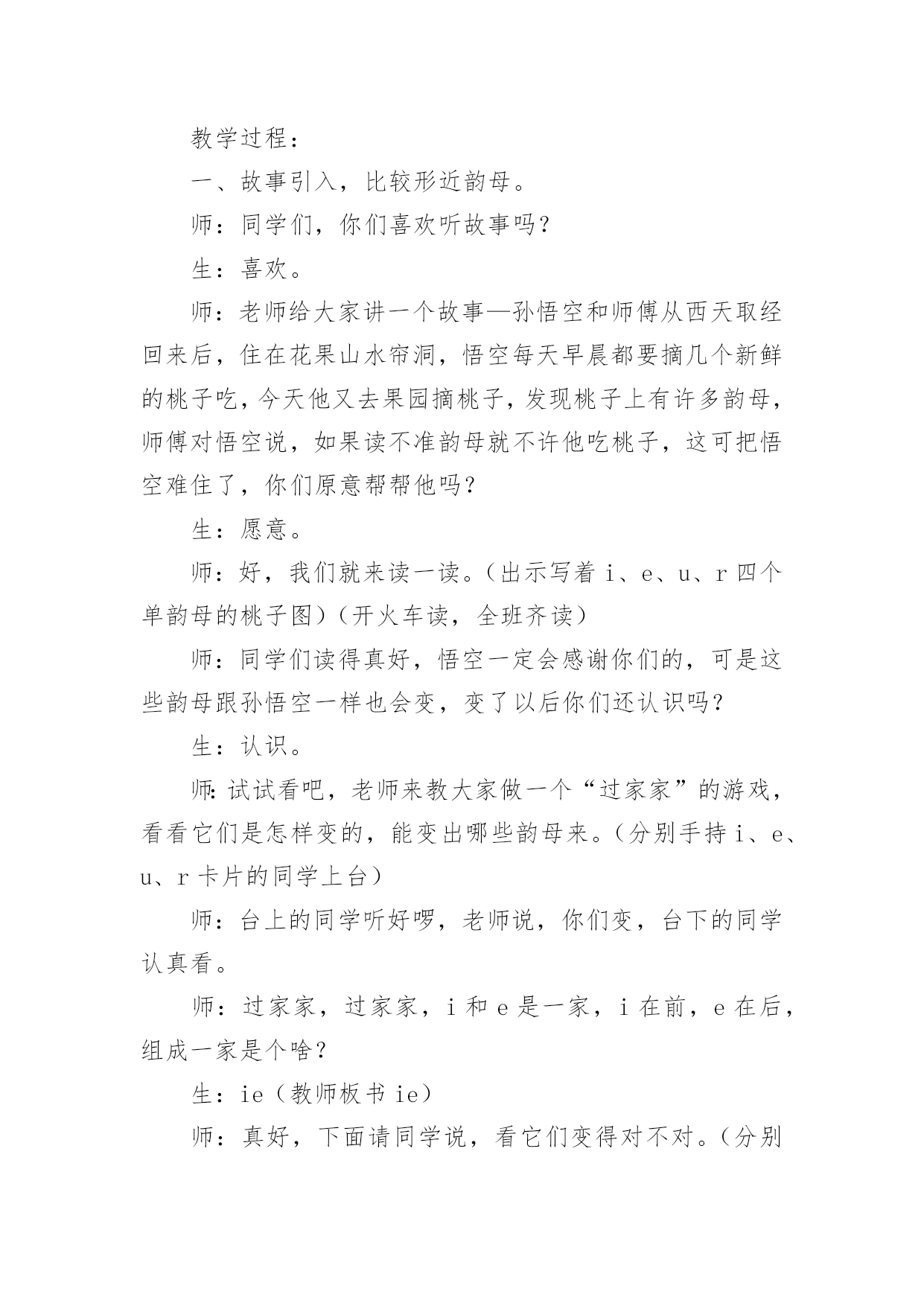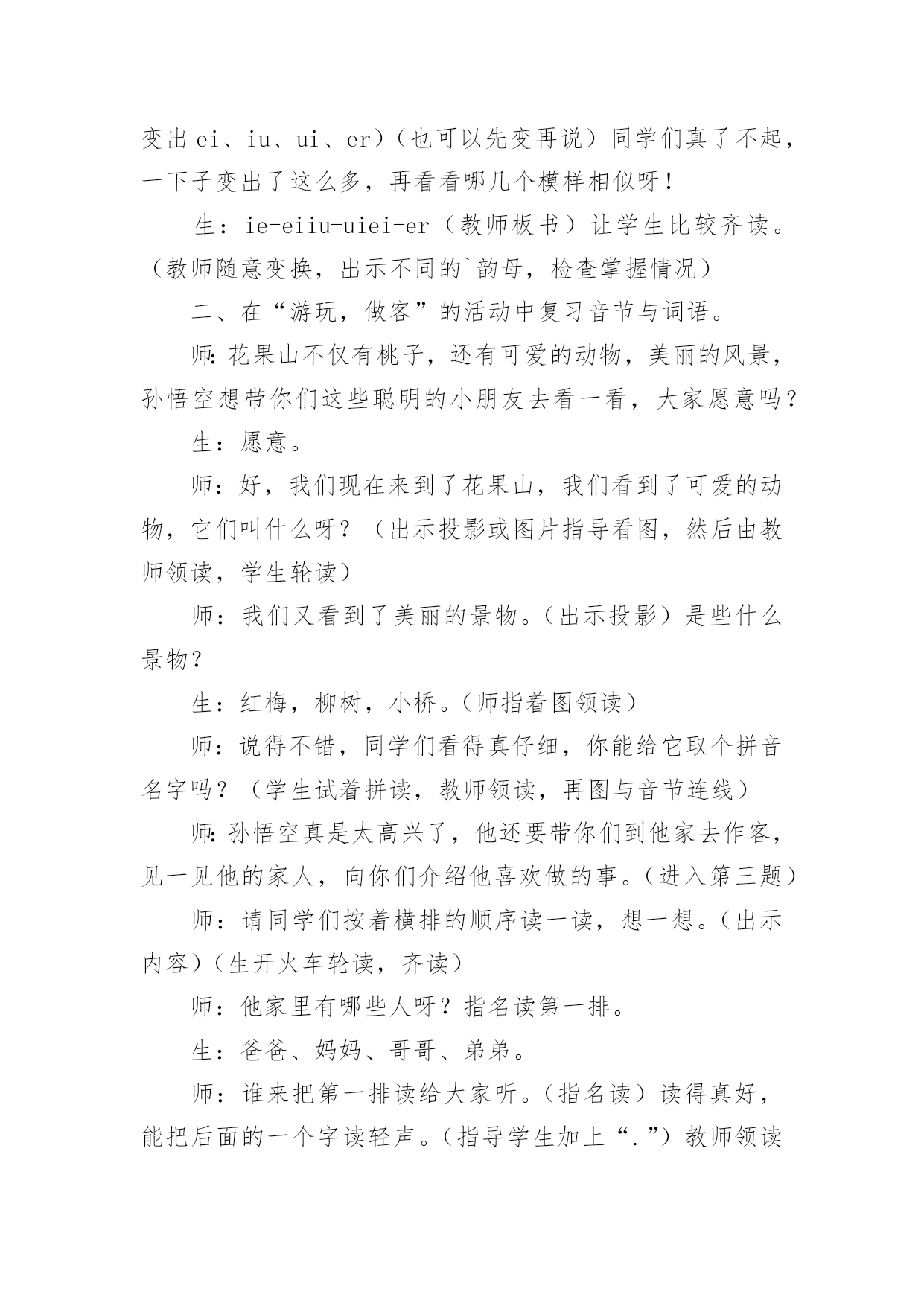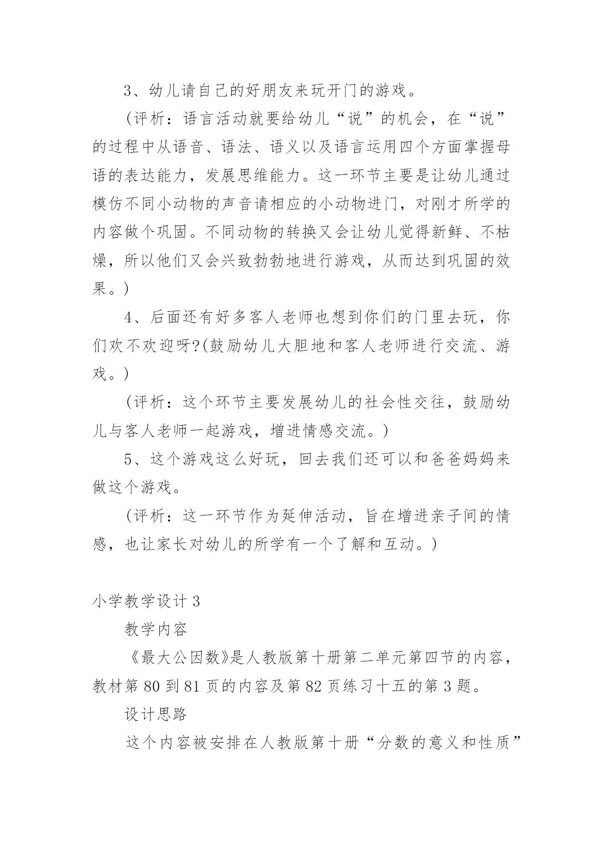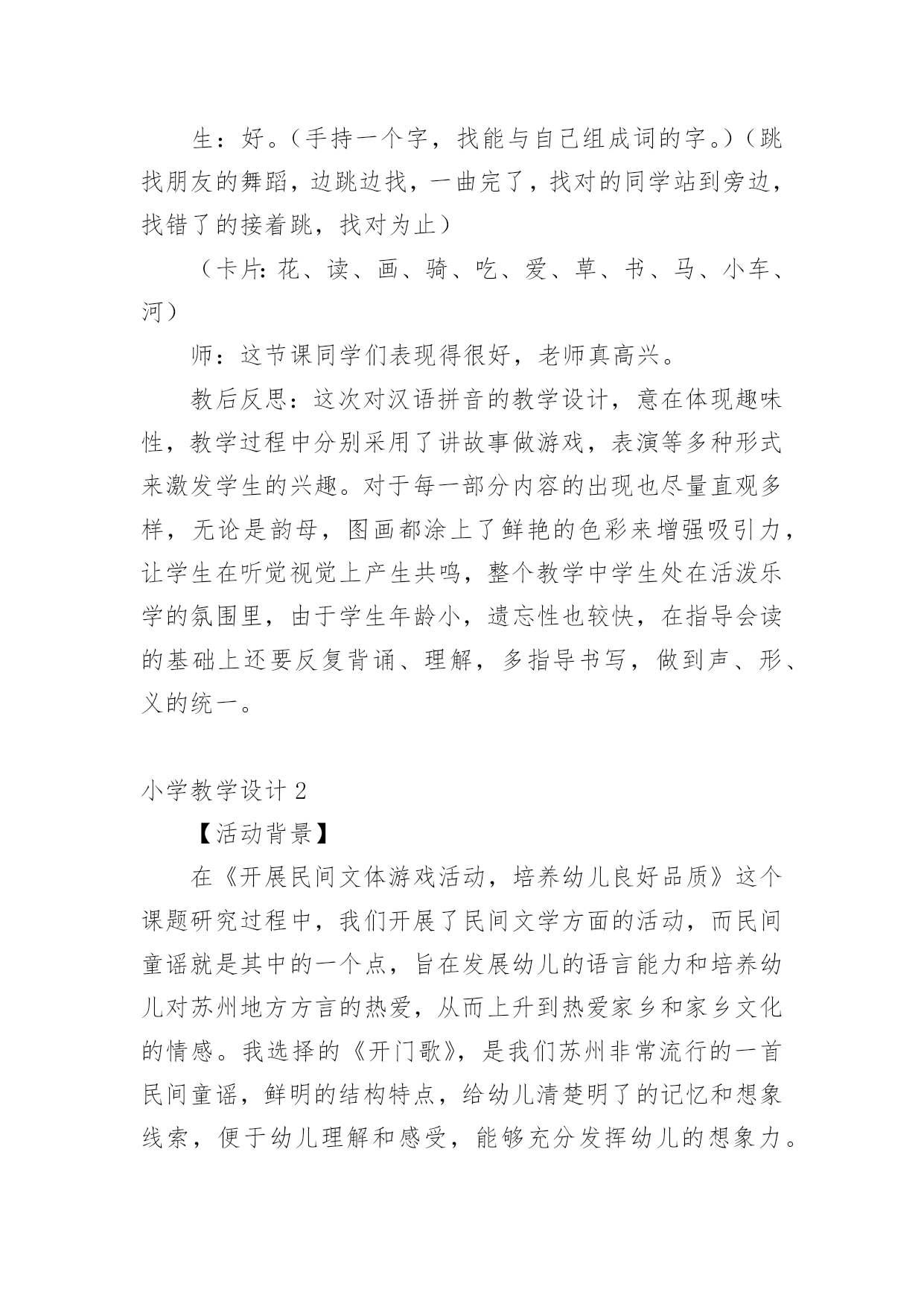 小学教学设计小学教学设计(15篇)作为一名专为他人授业解惑的人民教师,常常要根据教学需要编写教学设计,教学设计是把教学原理转化为教学材料和教学活动的计划。那么写教学设计需要注意哪些问题呢?以下是小编精心整理的小学教学设计,欢迎大家分享。小学教学设计1教材分析:本次复习包括四项内容,一是比较形近韵母;二是拼读音节,并恰当地和图连接起来;三是认读词语;四是读儿歌并动手拼一拼图形。学情分析:由于学生年龄小,刚进校不久,学习汉语拼音是比较抽象和枯燥无味的,为此在设计时要尽量贴近生活,增强趣味性,让学生爱学乐学。教学目标:1、能区分形近的韵母ie-ei,iu-ui,ei和er。2、能把图和音节连接起来,培养学生的观察能力。3、利用儿歌拼图形,培养动手能力。设计理念:《语文课标》明确指出,“汉语拼音教学尽可能有趣味性,宜以活动和游戏为主”,本次设计旨在把活动与游戏带入课堂,寓教于乐,增强趣味性。教具学具准备:图片、卡片、投影等。教学过程:一、故事引入,比较形近韵母。师:同学们,你们喜欢听故事吗?生:喜欢。师:老师给大家讲一个故事—孙悟空和师傅从西天取经回来后,住在花果山水帘洞,悟空每天早晨都要摘几个新鲜的桃子吃,今天他又去果园摘桃子,发现桃子上有许多韵母,师傅对悟空说,如果读不准韵母就不许他吃桃子,这可把悟空难住了,你们原意帮帮他吗?生:愿意。师:好,我们就来读一读。(出示写着i、e、u、r四个单韵母的桃子图)(开火车读,全班齐读)师:同学们读得真好,悟空一定会感谢你们的,可是这些韵母跟孙悟空一样也会变,变了以后你们还认识吗?生:认识。师:试试看吧,老师来教大家做一个“过家家”的游戏,看看它们是怎样变的,能变出哪些韵母来。(分别手持i、e、u、r卡片的同学上台)师:台上的同学听好啰,老师说,你们变,台下的同学认真看。师:过家家,过家家,i和e是一家,i在前,e在后,组成一家是个啥?生:ie(教师板书ie)师:真好,下面请同学说,看它们变得对不对。(分别变出ei、iu、ui、er)(也可以先变再说)同学们真了不起,一下子变出了这么多,再看看哪几个模样相似呀!生:ie-eiiu-uiei-er(教师板书)让学生比较齐读。(教师随意变换,出示不同的`韵母,检查掌握情况)二、在“游玩,做客”的活动中复习音节与词语。师:花果山不仅有桃子,还有可爱的动物,美丽的风景,孙悟空想带你们这些聪明的小朋友去看一看,大家愿意吗?生:愿意。师:好,我们现在来到了花果山,我们看到了可爱的动物,它们叫什么呀?(出示投影或图片指导看图,然后由教师领读,学生轮读)师:我们又看到了美丽的景物。(出示投影)是些什么景物?生:红梅,柳树,小桥。(师指着图领读)师:说得不错,同学们看得真仔细,你能给它取个拼音名字吗?(学生试着拼读,教师领读,再图与音节连线)师:孙悟空真是太高兴了,他还要带你们到他家去作客,见一见他的家人,向你们介绍他喜欢做的事。(进入第三题)师:请同学们按着横排的顺序读一读,想一想。(出示内容)(生开火车轮读,齐读)师:他家里有哪些人呀?指名读第一排。生:爸爸、妈妈、哥哥、弟弟。师:谁来把第一排读给大家听。(指名读)读得真好,能把后面的一个字读轻声。(指导学生加上“.”)教师领读后,指名读,大家一起齐读。师:“谁来当小老师领着同学们读”(指名领读)再读一读第二排,想一想说了些什么呀?生:说了“小鸡、小鱼、河马、水牛”。(反复读)师:为什么说这些?生:孙悟空喜欢这些动物。师:孙悟空在家里最喜欢做什么事情呢?(读第三排)你们会做吗?生:会。师:谁能给我们表演一下?生:读书是这个样子的。(边说边做动作,依次读词语,表演)师:好,我们来一排一排地读一读,看看谁读得最好?(生归纳)指名读,开火车读。三、读儿歌,拼图形,培养想象力。师:看来孙悟空做的事情,大家都会,孙悟空还会读儿歌,拼图形,同学们和他比一比,看看谁最聪明。师:跟着老师读儿歌。(老师领读)(反复读)小兔、小鸭长得什么样儿?生:小鸭嘴巴扁,小兔尾巴短。师:你会拼图吗?试试看。(老师示范)(分组让学生动手摆一摆,看一看,象什么?)师:我们的小朋友跟孙悟空一样聪明,让我们来做一个“找朋友”的游戏,庆祝我们取得的成绩吧。生:好。(手持一个字,找能与自己组成词的字。)(跳找朋友的舞蹈,边跳边找,一曲完了,找对的同学站到旁边,找错了的接着跳,找对为止)(卡片:花、读、画、骑、吃、爱、草、书、马、小车、河)师:这节课同学们表现得很好,老师真高兴。教后反思:这次对汉语拼音的教学设计,意在体现趣味性,教学过程中分别采用了讲故事做游戏,表演等多种形式来激发学生的兴趣。对于每一部分内容的出现也尽量直观多样,无论是韵母,图画都涂上了鲜艳的色彩来增强吸引力,让学生在听觉视觉上产生共鸣,整个教学中学生处在活泼乐学的氛围里,由于学生