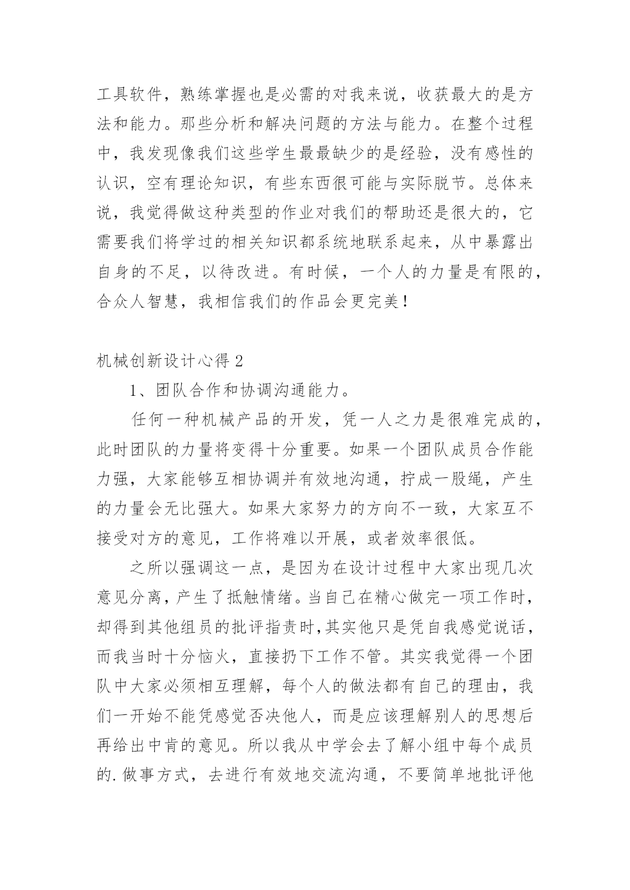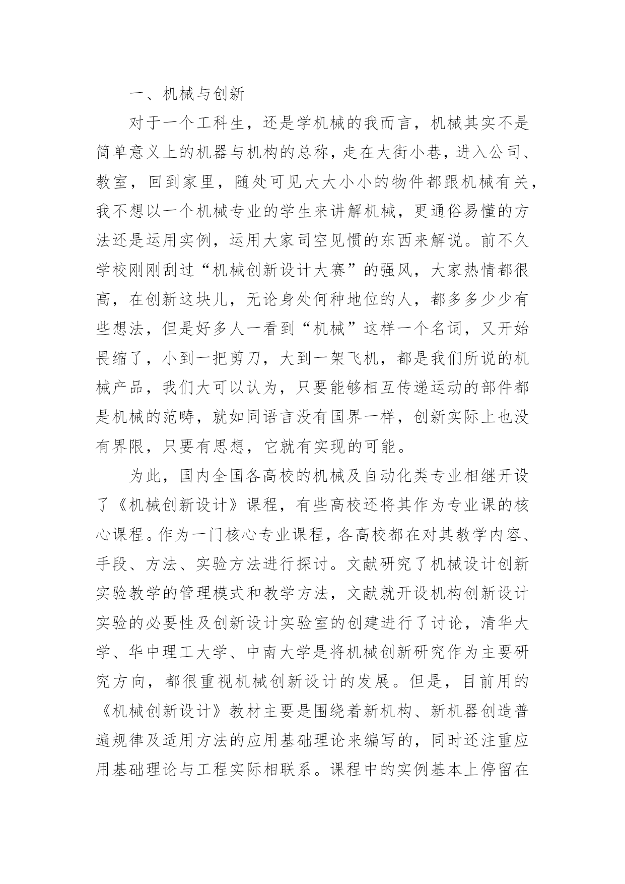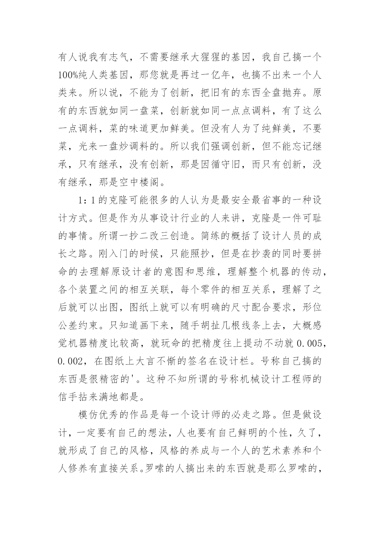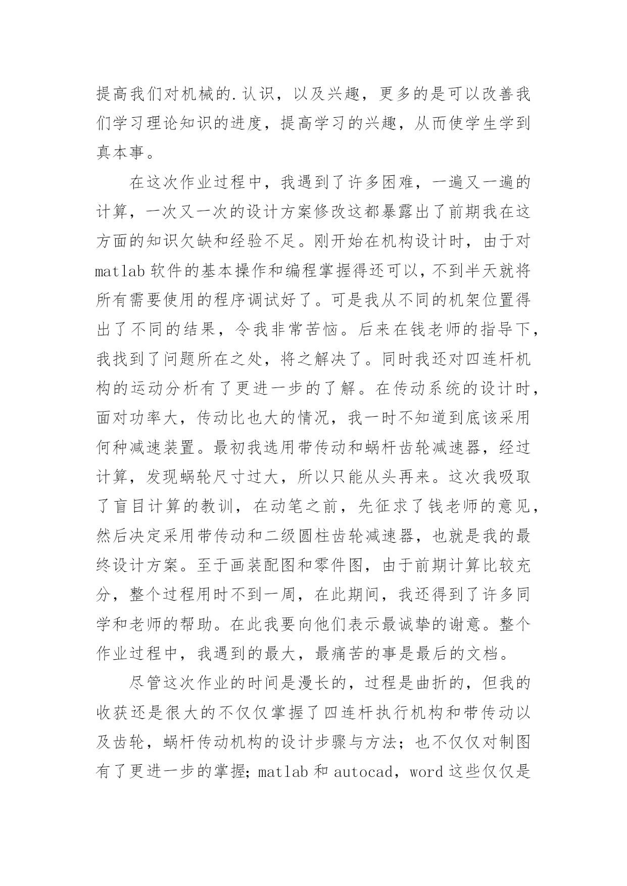 机械创新设计心得当我们对人生或者事物有了新的思考时,可以记录在心得体会中,这样能够给人努力向前的动力。那么心得体会怎么写才能感染读者呢?下面是小编帮大家整理的机械创新设计心得,仅供参考,大家一起来看看吧。机械创新设计心得1机械创新设计——机构创新设计实验心得体会可说我们设计的机构经过两天的努力便圆满的完成了,剩下的工作便是向老师介绍我们设计好的机构的具体的情况。因为经历两天我们设计好的机构总体看来还是比较简单,而且运动也不复杂。所以作介绍的话也比较简单。细心去听完每一组介绍自己设计的机构。我也认真总结了自己陈述用语,先介绍我们组员设计的具体思路,最主要的是设计的目的,要实现什么样的运动。还有就是我们创新在什么地方,随后指出优点及缺点,需要改进的地方有哪些?按照自己的思路一一说明本次实验课对我们学机械类的学生来说是至关重要,因为本次实验给我们提供了实际操作的平台,以及机构创新的平台,这胜于我们大学四年学习机械类的课程,也可以说是一个校验过程,认识,总结的过程。在一定的基础上提高我了我们对机械的认识,完全是亲自接触,由此我们自己也有了较深的体会。我非常的希望这样的实验课程学校里面可以多提供一些机会,这样不仅可以提高我们对机械的.认识,以及兴趣,更多的是可以改善我们学习理论知识的进度,提高学习的兴趣,从而使学生学到真本事。在这次作业过程中,我遇到了许多困难,一遍又一遍的计算,一次又一次的设计方案修改这都暴露出了前期我在这方面的知识欠缺和经验不足。刚开始在机构设计时,由于对matlab软件的基本操作和编程掌握得还可以,不到半天就将所有需要使用的程序调试好了。可是我从不同的机架位置得出了不同的结果,令我非常苦恼。后来在钱老师的指导下,我找到了问题所在之处,将之解决了。同时我还对四连杆机构的运动分析有了更进一步的了解。在传动系统的设计时,面对功率大,传动比也大的情况,我一时不知道到底该采用何种减速装置。最初我选用带传动和蜗杆齿轮减速器,经过计算,发现蜗轮尺寸过大,所以只能从头再来。这次我吸取了盲目计算的教训,在动笔之前,先征求了钱老师的意见,然后决定采用带传动和二级圆柱齿轮减速器,也就是我的最终设计方案。至于画装配图和零件图,由于前期计算比较充分,整个过程用时不到一周,在此期间,我还得到了许多同学和老师的帮助。在此我要向他们表示最诚挚的谢意。整个作业过程中,我遇到的最大,最痛苦的事是最后的文档。尽管这次作业的时间是漫长的,过程是曲折的,但我的收获还是很大的不仅仅掌握了四连杆执行机构和带传动以及齿轮,蜗杆传动机构的设计步骤与方法;也不仅仅对制图有了更进一步的掌握;matlab和autocad,word这些仅仅是工具软件,熟练掌握也是必需的对我来说,收获最大的是方法和能力。那些分析和解决问题的方法与能力。在整个过程中,我发现像我们这些学生最最缺少的是经验,没有感性的认识,空有理论知识,有些东西很可能与实际脱节。总体来说,我觉得做这种类型的作业对我们的帮助还是很大的,它需要我们将学过的相关知识都系统地联系起来,从中暴露出自身的不足,以待改进。有时候,一个人的力量是有限的,合众人智慧,我相信我们的作品会更完美!机械创新设计心得21、团队合作和协调沟通能力。任何一种机械产品的开发,凭一人之力是很难完成的,此时团队的力量将变得十分重要。如果一个团队成员合作能力强,大家能够互相协调并有效地沟通,拧成一股绳,产生的力量会无比强大。如果大家努力的方向不一致,大家互不接受对方的意见,工作将难以开展,或者效率很低。之所以强调这一点,是因为在设计过程中大家出现几次意见分离,产生了抵触情绪。当自己在精心做完一项工作时,却得到其他组员的批评指责时,其实他只是凭自我感觉说话,而我当时十分恼火,直接扔下工作不管。其实我觉得一个团队中大家必须相互理解,每个人的做法都有自己的理由,我们一开始不能凭感觉否决他人,而是应该理解别人的思想后再给出中肯的意见。所以我从中学会去了解小组中每个成员的.做事方式,去进行有效地交流沟通,不要简单地批评他人的构思,而是学会倾听,然后积极讨论,为一个共同的目标努力。2、从这次机械创新设计大赛中我也知道了自己眼高手低的不良态度,其实这也是大学生普遍存在的问题。因为在学校了我们只能通过课本去了解知识,很多机械知识获取只是通过做习题来掌握。殊不知机械学科是一门长期实践的学科,很所结构在纸上画起来十分简单,用鼠标随便点点画画就行了,殊不知很多学得东西无法运用到生活中去,造成知识与生活脱节,纸上建模简单,但真正投入到实际加工中,我们就会对自己的设计十分担心,因为实际加工影响因素多,自己考虑问题不全面,产生一系列问题。另外我感觉自己以前可能对机械结构观察不深入,接触的机械产品太少,具体到设计过程中时,大脑中浮现的机械结构太少,只能根据产品功能去查阅书籍