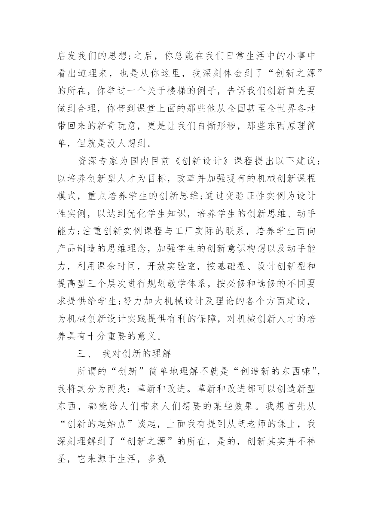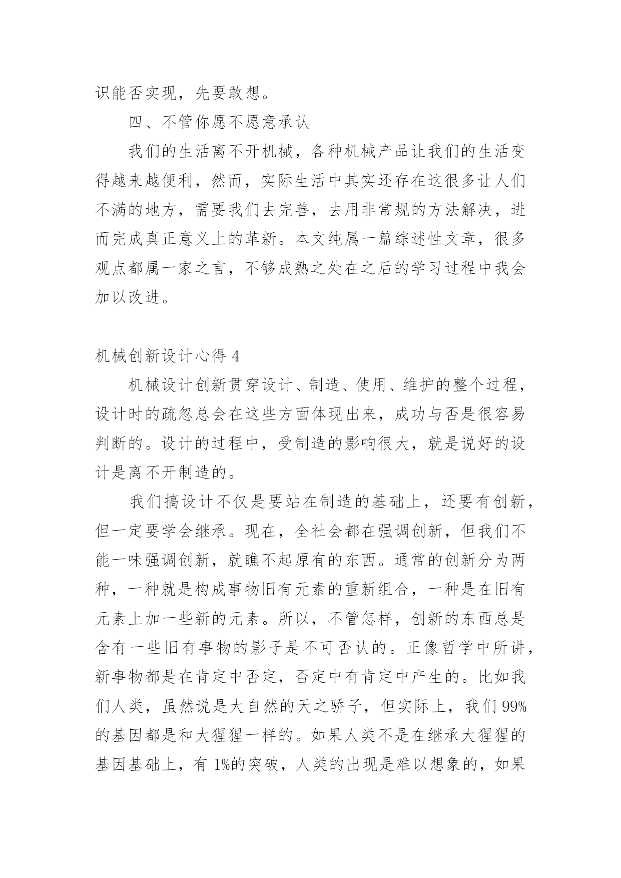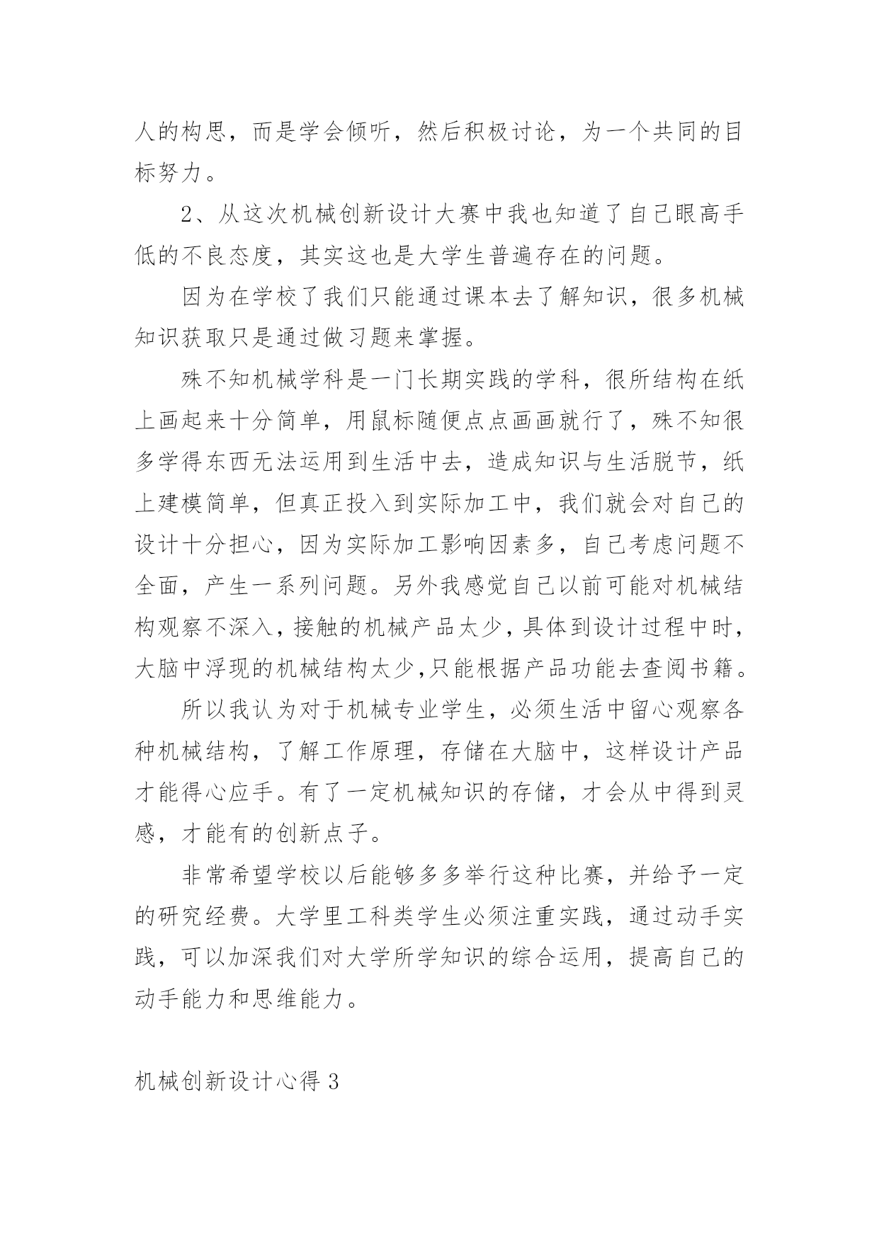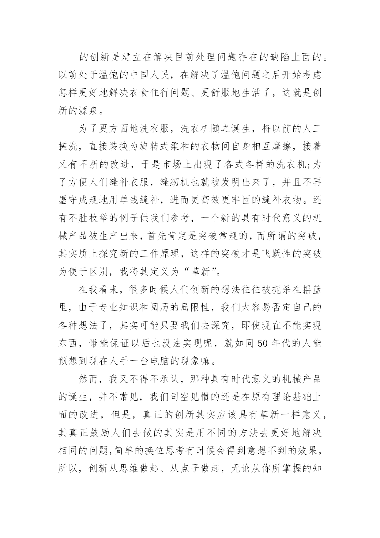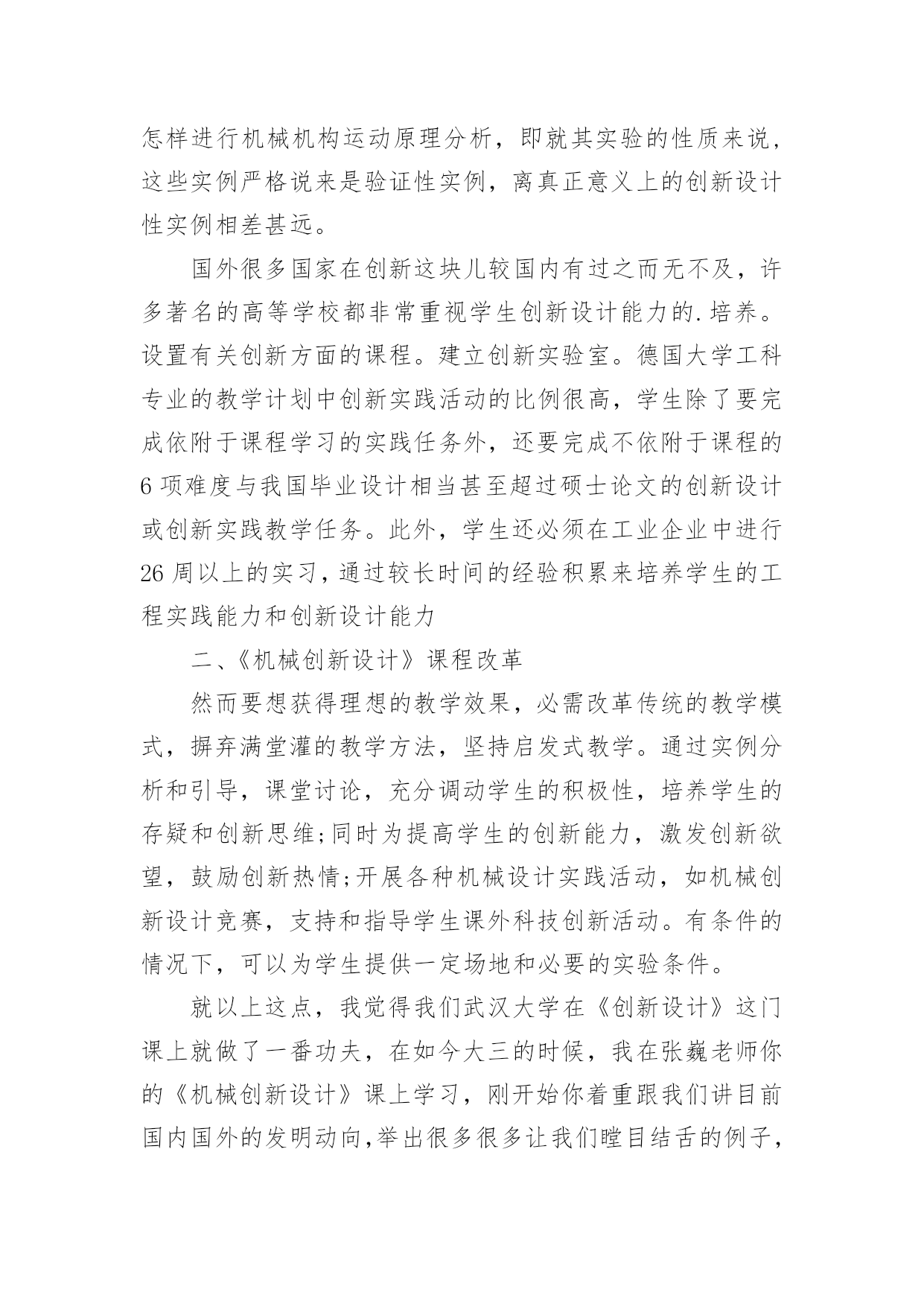 机械创新设计心得当我们对人生或者事物有了新的思考时,可以记录在心得体会中,这样能够给人努力向前的动力。那么心得体会怎么写才能感染读者呢?下面是小编帮大家整理的机械创新设计心得,仅供参考,大家一起来看看吧。机械创新设计心得1机械创新设计——机构创新设计实验心得体会可说我们设计的机构经过两天的努力便圆满的完成了,剩下的工作便是向老师介绍我们设计好的机构的具体的情况。因为经历两天我们设计好的机构总体看来还是比较简单,而且运动也不复杂。所以作介绍的话也比较简单。细心去听完每一组介绍自己设计的机构。我也认真总结了自己陈述用语,先介绍我们组员设计的具体思路,最主要的是设计的目的,要实现什么样的运动。还有就是我们创新在什么地方,随后指出优点及缺点,需要改进的地方有哪些?按照自己的思路一一说明本次实验课对我们学机械类的学生来说是至关重要,因为本次实验给我们提供了实际操作的平台,以及机构创新的平台,这胜于我们大学四年学习机械类的课程,也可以说是一个校验过程,认识,总结的过程。在一定的基础上提高我了我们对机械的认识,完全是亲自接触,由此我们自己也有了较深的体会。我非常的希望这样的实验课程学校里面可以多提供一些机会,这样不仅可以提高我们对机械的.认识,以及兴趣,更多的是可以改善我们学习理论知识的进度,提高学习的兴趣,从而使学生学到真本事。在这次作业过程中,我遇到了许多困难,一遍又一遍的计算,一次又一次的设计方案修改这都暴露出了前期我在这方面的知识欠缺和经验不足。刚开始在机构设计时,由于对matlab软件的基本操作和编程掌握得还可以,不到半天就将所有需要使用的程序调试好了。可是我从不同的机架位置得出了不同的结果,令我非常苦恼。后来在钱老师的指导下,我找到了问题所在之处,将之解决了。同时我还对四连杆机构的运动分析有了更进一步的了解。在传动系统的设计时,面对功率大,传动比也大的情况,我一时不知道到底该采用何种减速装置。最初我选用带传动和蜗杆齿轮减速器,经过计算,发现蜗轮尺寸过大,所以只能从头再来。这次我吸取了盲目计算的教训,在动笔之前,先征求了钱老师的意见,然后决定采用带传动和二级圆柱齿轮减速器,也就是我的最终设计方案。至于画装配图和零件图,由于前期计算比较充分,整个过程用时不到一周,在此期间,我还得到了许多同学和老师的帮助。在此我要向他们表示最诚挚的谢意。整个作业过程中,我遇到的最大,最痛苦的事是最后的文档。尽管这次作业的时间是漫长的,过程是曲折的,但我的收获还是很大的不仅仅掌握了四连杆执行机构和带传动以及齿轮,蜗杆传动机构的设计步骤与方法;也不仅仅对制图有了更进一步的掌握;matlab和autocad,word这些仅仅是工具软件,熟练掌握也是必需的对我来说,收获最大的是方法和能力。那些分析和解决问题的方法与能力。在整个过程中,我发现像我们这些学生最最缺少的是经验,没有感性的认识,空有理论知识,有些东西很可能与实际脱节。总体来说,我觉得做这种类型的作业对我们的帮助还是很大的,它需要我们将学过的相关知识都系统地联系起来,从中暴露出自身的不足,以待改进。有时候,一个人的力量是有限的,合众人智慧,我相信我们的作品会更完美!机械创新设计心得21、团队合作和协调沟通能力。任何一种机械产品的开发,凭一人之力是很难完成的,此时团队的力量将变得十分重要。如果一个团队成员合作能力强,大家能够互相协调并有效地沟通,拧成一股绳,产生的力量会无比强大。如果大家努力的方向不一致,大家互不接受对方的意见,工作将难以开展,或者效率很低。之所以强调这一点,是因为在设计过程中大家出现几次意见分离,产生了抵触情绪。当自己在精心做完一项工作时,却得到其他组员的批评指责时,其实他只是凭自我感觉说话,而我当时十分恼火,直接扔下工作不管。其实我觉得一个团队中大家必须相互理解,每个人的做法都有自己的理由,我们一开始不能凭感觉否决他人,而是应该理解别人的思想后再给出中肯的意见。所以我从中学会去了解小组中每个成员的.做事方式,去进行有效地交流沟通,不要简单地批评他人的构思,而是学会倾听,然后积极讨论,为一个共同的目标努力。2、从这次机械创新设计大赛中我也知道了自己眼高手低的不良态度,其实这也是大学生普遍存在的问题。因为在学校了我们只能通过课本去了解知识,很多机械知识获取只是通过做习题来掌握。殊不知机械学科是一门长期实践的学科,很所结构在纸上画起来十分简单,用鼠标随便点点画画就行了,殊不知很多学得东西无法运用到生活中去,造成知识与生活脱节,纸上建模简单,但真正投入到实际加工中,我们就会对自己的设计十分担心,因为实际加工影响因素多,自己考虑问题不全面,产生一系列问题。另外我感觉自己以前可能对机械结构观察不深入,接触的机械产品太少,具体到设计过程中时,大脑中浮现的机械结构太少,只能根据产品功能去查阅书籍