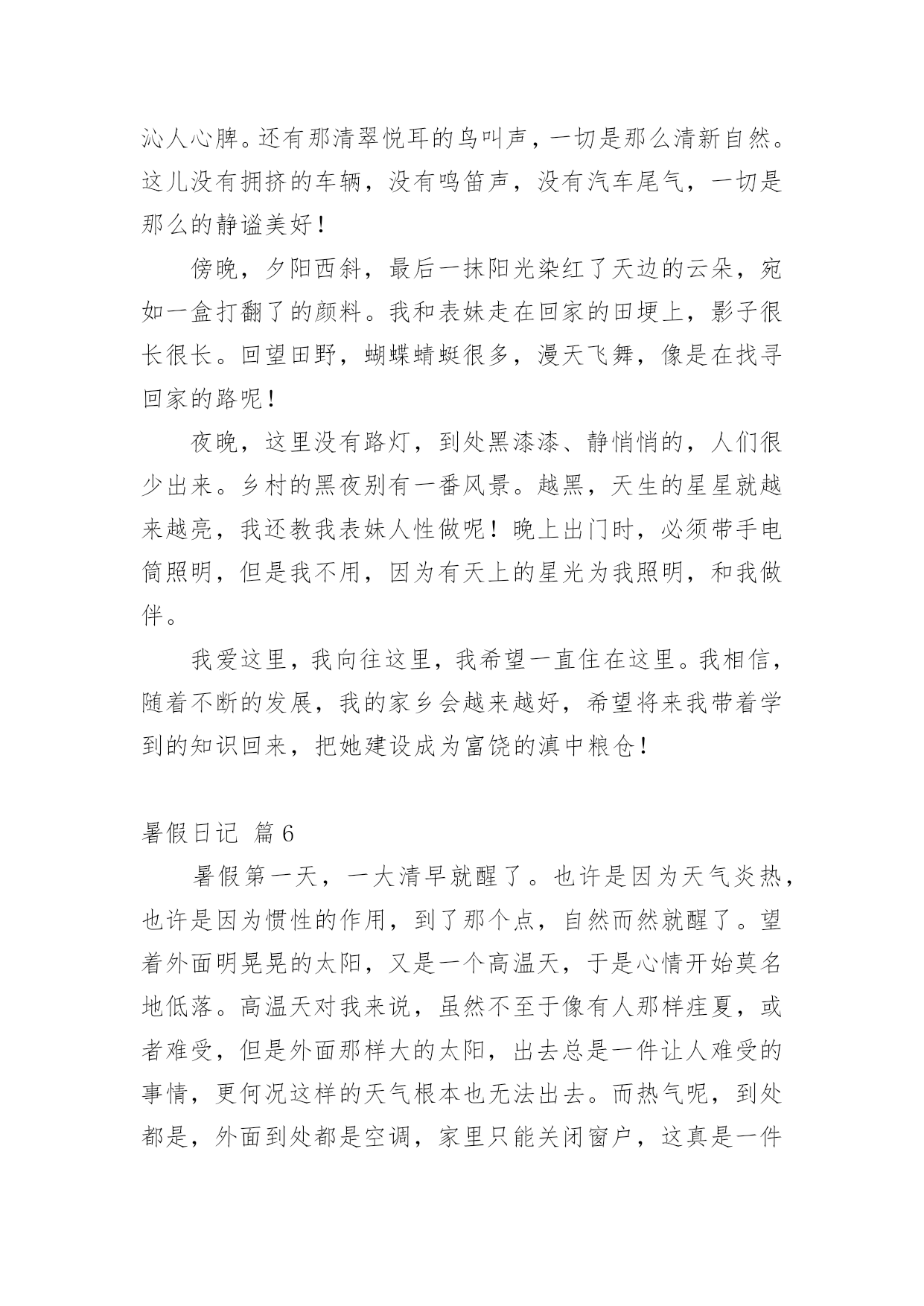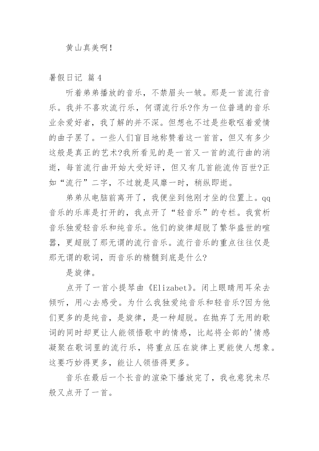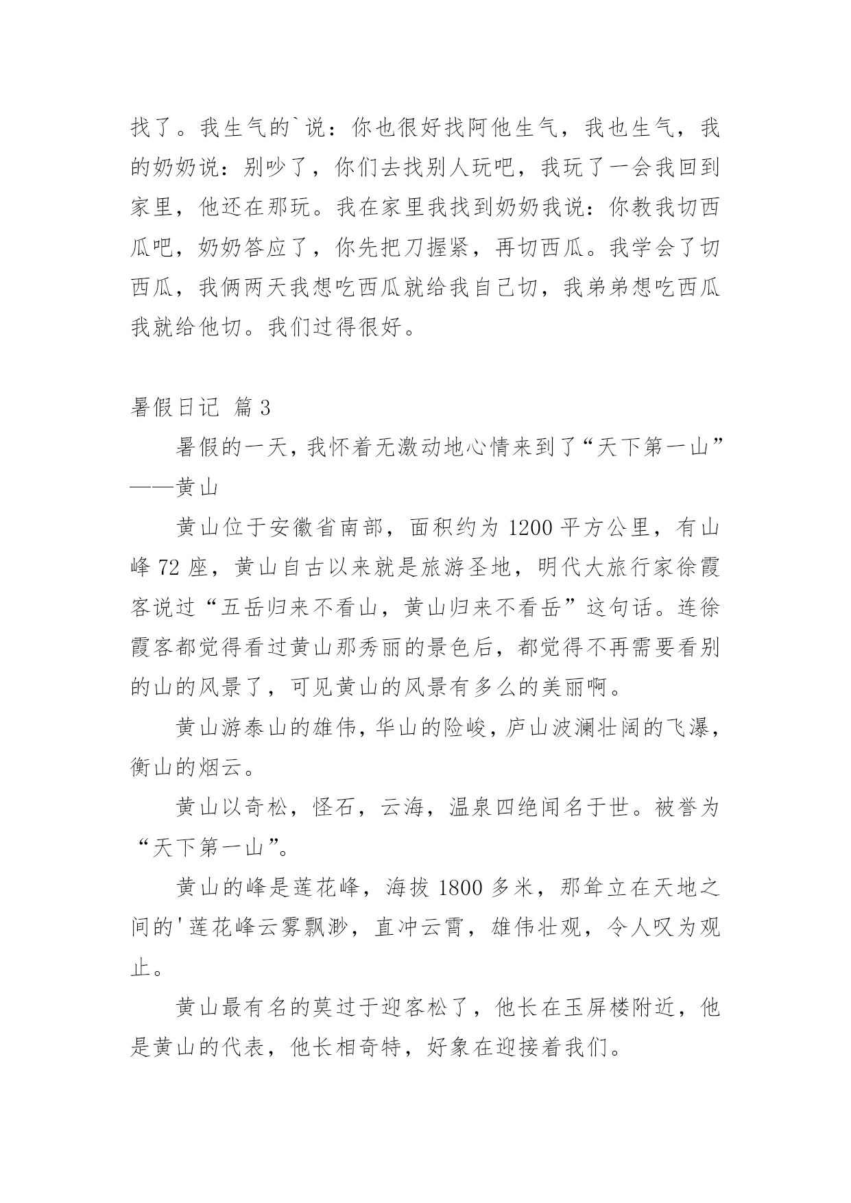 暑假日记即将要到一天的结尾了,心中一定有不少感想,是时候认真地写好日记了。日记怎么写才合适呢?下面是小编为大家整理的暑假日记9篇,供大家参考借鉴,希望可以帮助到有需要的朋友。暑假日记篇1年幼无知,年少莽撞题记当我们的假日渐渐少时,今年的暑假旅游就此泡汤了,没有桂林山水的风景,也木有北海银滩的风光,唯有眼前这堆教科书,这叠作业本,这份厌倦的心,代替了暑假学校的老革命还没有改革,没有解放,只有二十四小时的补课基本路线“读书—吃饭—睡觉—再读书—再吃饭—再再读书”当然这一切没人反对,不是没人不知道,也不是没权利反对,而是他们太过于重视学习,所以无所谓。谁的父母不盼望自己儿女有一份满意录取通知书;谁的老师不期待一份份美好的成绩单;哪家的`学校不期望重点上线率高些,归根到底,还是为了明年,拿青春赌一次明天,输的是今天的青春,没人在乎!没人理解!更没人懂!大人留言“小屁孩,你懂什么?”但你可否知道,每天作业堆积如山,愚公精神抄也抄不完,谈何做?一题更比一题难,那些数理化公式看着都头疼,那些语英政史读着心都累,上课梦见周公,下课梦见老师,作业总是拖拖拉拉、迟迟不交,拖掉昨日,再拖过今日,至于明日?“明日之事明日论”从小到大,没变的就是那颗不想读书的心。上周,“尤特”来临,经过广东,吹向广西,学校停止了补课,放了两日假,可时间就是小气,晃悠一下便过去了。那天,本想找个借口推迟几天假期,说什么学校那个不好,这个不好,吃不消,住不惯。可当我刚走到妈妈房间门口,里面就传来了对话声“哇!那么多,妈你干嘛用的?”这声音应该是姐姐说的。妈妈是这样回答“留给你弟读大学用的…每天攒几块,到那时……”姐姐接着说:“妈!你偏心,弟弟初中还没毕业,不至于这么快吧?”……后来我没有进去,似乎一下子懂了什么,至于那些借口吞了回去。当我们的假日渐渐少时,并非坏事,起码让我懂的中考将近,也是放手一拼的时候,童鞋们学校补课也是情势所迫,情非得已,情不自禁,今日不努力读书,明日努力找工作,这事想必大家都不想,如果能这么一想,又何必在此烦心,将鸭梨往冰箱一堆,一放,时间久了,冻梨不就有了吗?沉舟侧畔千帆过,大把青春拼明天,再拿青春赌一次明天,成也风云,败也风云,毕竟我们有努力过。当我们的假日渐渐少时。暑假日记篇2今天,我在老家我和我弟弟玩。一会奶奶给我们切西瓜我们一起跑过去,去吃西阿阿。我吃了2块,我弟弟也吃2块。吃完西瓜,我们就玩起捉迷藏的游戏了,他说:你太好找了。我生气的`说:你也很好找阿他生气,我也生气,我的奶奶说:别吵了,你们去找别人玩吧,我玩了一会我回到家里,他还在那玩。我在家里我找到奶奶我说:你教我切西瓜吧,奶奶答应了,你先把刀握紧,再切西瓜。我学会了切西瓜,我俩两天我想吃西瓜就给我自己切,我弟弟想吃西瓜我就给他切。我们过得很好。暑假日记篇3暑假的一天,我怀着无激动地心情来到了“天下第一山”——黄山黄山位于安徽省南部,面积约为1200平方公里,有山峰72座,黄山自古以来就是旅游圣地,明代大旅行家徐霞客说过“五岳归来不看山,黄山归来不看岳”这句话。连徐霞客都觉得看过黄山那秀丽的景色后,都觉得不再需要看别的山的风景了,可见黄山的风景有多么的美丽啊。黄山游泰山的雄伟,华山的险峻,庐山波澜壮阔的飞瀑,衡山的烟云。黄山以奇松,怪石,云海,温泉四绝闻名于世。被誉为“天下第一山”。黄山的峰是莲花峰,海拔1800多米,那耸立在天地之间的'莲花峰云雾飘渺,直冲云霄,雄伟壮观,令人叹为观止。黄山最有名的莫过于迎客松了,他长在玉屏楼附近,他是黄山的代表,他长相奇特,好象在迎接着我们。黄山真美啊!暑假日记篇4听着弟弟播放的音乐,不禁眉头一皱。那是一首流行音乐。我并不喜欢流行乐,何谓流行乐?作为一位普通的音乐业余爱好者,我了解的并不深。但想也不过是些歌呕着爱情的曲子罢了。一些人们盲目地称赞着这一首首,但又有多少这般是真正的艺术?我所看见的是一首又一首的流行曲的消逝,每首流行曲开始大受好评,但又有几首能流传百世?正如“流行”二字,不过就是风靡一时,稍纵即逝。弟弟从电脑前离开了,我便坐到他刚才坐的位置上。qq音乐的乐库是打开的,我点开了“轻音乐”的专栏。我赏析音乐独爱轻音乐和纯音乐。他们的旋律超脱了繁华盛世的喧嚣,更超脱了那无谓的流行音乐。流行音乐的重点往往仅是那无谓的歌词,而音乐的精髓到底是什么?是旋律。点开了一首小提琴曲《Elizabet》。闭上眼睛用耳朵去倾听,用心去感受。为什么我独爱纯音乐和轻音乐?因为他们更多的是纯音,是旋律,是一种超脱。在抛弃了无用的歌词的同时却更让人能领悟歌中的情感,比起将全部的'情感凝聚在歌词里的流行乐,将重点压在旋律上更能使人想象。这要巧妙得更多,能让人领悟得更多。音乐在最后一个长音的渲染下播放完了,我也意犹未尽般又点开了一首。眼睛默默的闭上,心也跟随那旋律