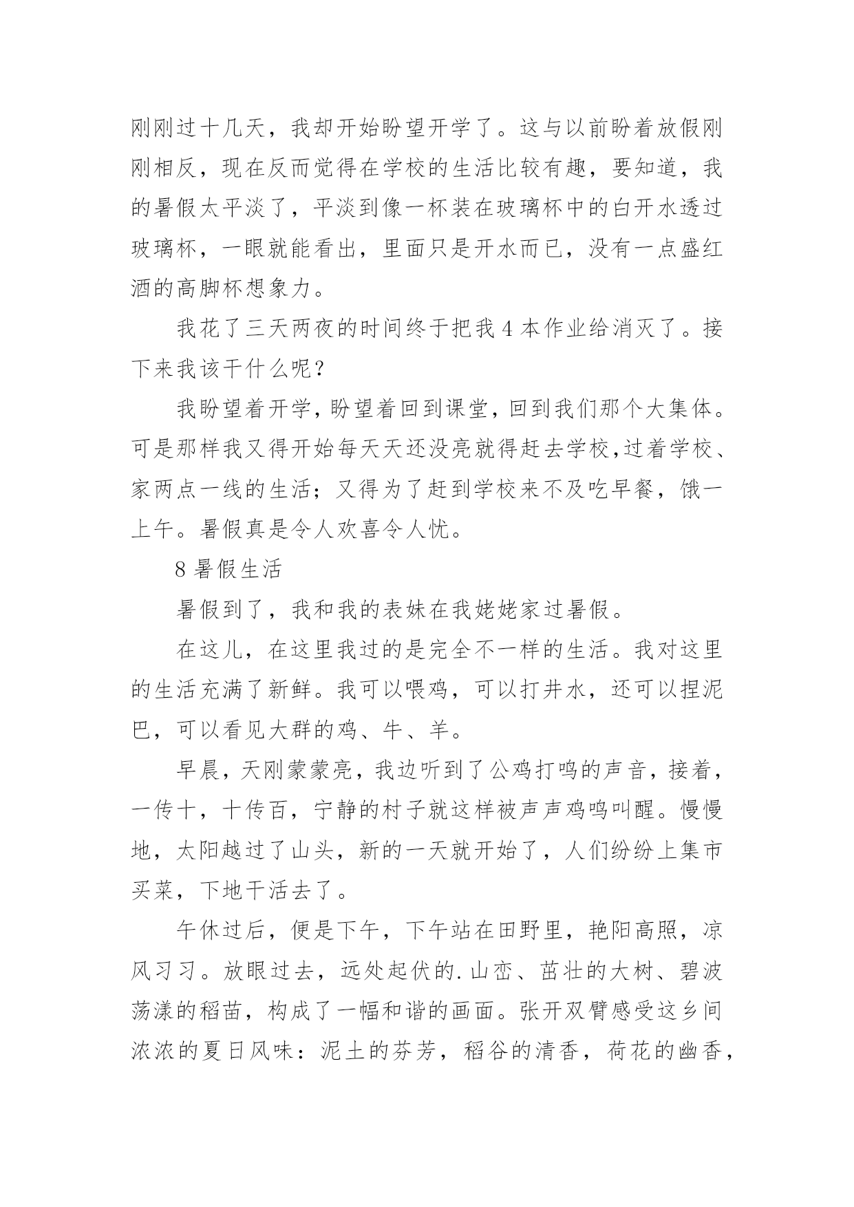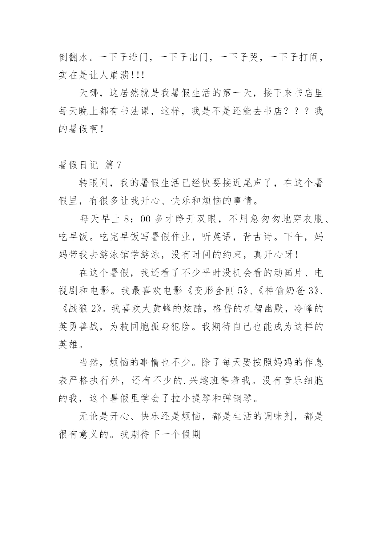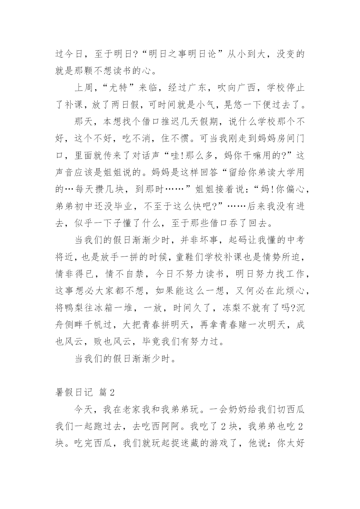 暑假日记即将要到一天的结尾了,心中一定有不少感想,是时候认真地写好日记了。日记怎么写才合适呢?下面是小编为大家整理的暑假日记9篇,供大家参考借鉴,希望可以帮助到有需要的朋友。暑假日记篇1年幼无知,年少莽撞题记当我们的假日渐渐少时,今年的暑假旅游就此泡汤了,没有桂林山水的风景,也木有北海银滩的风光,唯有眼前这堆教科书,这叠作业本,这份厌倦的心,代替了暑假学校的老革命还没有改革,没有解放,只有二十四小时的补课基本路线“读书—吃饭—睡觉—再读书—再吃饭—再再读书”当然这一切没人反对,不是没人不知道,也不是没权利反对,而是他们太过于重视学习,所以无所谓。谁的父母不盼望自己儿女有一份满意录取通知书;谁的老师不期待一份份美好的成绩单;哪家的`学校不期望重点上线率高些,归根到底,还是为了明年,拿青春赌一次明天,输的是今天的青春,没人在乎!没人理解!更没人懂!大人留言“小屁孩,你懂什么?”但你可否知道,每天作业堆积如山,愚公精神抄也抄不完,谈何做?一题更比一题难,那些数理化公式看着都头疼,那些语英政史读着心都累,上课梦见周公,下课梦见老师,作业总是拖拖拉拉、迟迟不交,拖掉昨日,再拖过今日,至于明日?“明日之事明日论”从小到大,没变的就是那颗不想读书的心。上周,“尤特”来临,经过广东,吹向广西,学校停止了补课,放了两日假,可时间就是小气,晃悠一下便过去了。那天,本想找个借口推迟几天假期,说什么学校那个不好,这个不好,吃不消,住不惯。可当我刚走到妈妈房间门口,里面就传来了对话声“哇!那么多,妈你干嘛用的?”这声音应该是姐姐说的。妈妈是这样回答“留给你弟读大学用的…每天攒几块,到那时……”姐姐接着说:“妈!你偏心,弟弟初中还没毕业,不至于这么快吧?”……后来我没有进去,似乎一下子懂了什么,至于那些借口吞了回去。当我们的假日渐渐少时,并非坏事,起码让我懂的中考将近,也是放手一拼的时候,童鞋们学校补课也是情势所迫,情非得已,情不自禁,今日不努力读书,明日努力找工作,这事想必大家都不想,如果能这么一想,又何必在此烦心,将鸭梨往冰箱一堆,一放,时间久了,冻梨不就有了吗?沉舟侧畔千帆过,大把青春拼明天,再拿青春赌一次明天,成也风云,败也风云,毕竟我们有努力过。当我们的假日渐渐少时。暑假日记篇2今天,我在老家我和我弟弟玩。一会奶奶给我们切西瓜我们一起跑过去,去吃西阿阿。我吃了2块,我弟弟也吃2块。吃完西瓜,我们就玩起捉迷藏的游戏了,他说:你太好找了。我生气的`说:你也很好找阿他生气,我也生气,我的奶奶说:别吵了,你们去找别人玩吧,我玩了一会我回到家里,他还在那玩。我在家里我找到奶奶我说:你教我切西瓜吧,奶奶答应了,你先把刀握紧,再切西瓜。我学会了切西瓜,我俩两天我想吃西瓜就给我自己切,我弟弟想吃西瓜我就给他切。我们过得很好。暑假日记篇3暑假的一天,我怀着无激动地心情来到了“天下第一山”——黄山黄山位于安徽省南部,面积约为1200平方公里,有山峰72座,黄山自古以来就是旅游圣地,明代大旅行家徐霞客说过“五岳归来不看山,黄山归来不看岳”这句话。连徐霞客都觉得看过黄山那秀丽的景色后,都觉得不再需要看别的山的风景了,可见黄山的风景有多么的美丽啊。黄山游泰山的雄伟,华山的险峻,庐山波澜壮阔的飞瀑,衡山的烟云。黄山以奇松,怪石,云海,温泉四绝闻名于世。被誉为“天下第一山”。黄山的峰是莲花峰,海拔1800多米,那耸立在天地之间的'莲花峰云雾飘渺,直冲云霄,雄伟壮观,令人叹为观止。黄山最有名的莫过于迎客松了,他长在玉屏楼附近,他是黄山的代表,他长相奇特,好象在迎接着我们。黄山真美啊!暑假日记篇4听着弟弟播放的音乐,不禁眉头一皱。那是一首流行音乐。我并不喜欢流行乐,何谓流行乐?作为一位普通的音乐业余爱好者,我了解的并不深。但想也不过是些歌呕着爱情的曲子罢了。一些人们盲目地称赞着这一首首,但又有多少这般是真正的艺术?我所看见的是一首又一首的流行曲的消逝,每首流行曲开始大受好评,但又有几首能流传百世?正如“流行”二字,不过就是风靡一时,稍纵即逝。弟弟从电脑前离开了,我便坐到他刚才坐的位置上。qq音乐的乐库是打开的,我点开了“轻音乐”的专栏。我赏析音乐独爱轻音乐和纯音乐。他们的旋律超脱了繁华盛世的喧嚣,更超脱了那无谓的流行音乐。流行音乐的重点往往仅是那无谓的歌词,而音乐的精髓到底是什么?是旋律。点开了一首小提琴曲《Elizabet》。闭上眼睛用耳朵去倾听,用心去感受。为什么我独爱纯音乐和轻音乐?因为他们更多的是纯音,是旋律,是一种超脱。在抛弃了无用的歌词的同时却更让人能领悟歌中的情感,比起将全部的'情感凝聚在歌词里的流行乐,将重点压在旋律上更能使人想象。这要巧妙得更多,能让人领悟得更多。音乐在最后一个长音的渲染下播放完了,我也意犹未尽般又点开了一首。眼睛默默的闭上,心也跟随那旋律