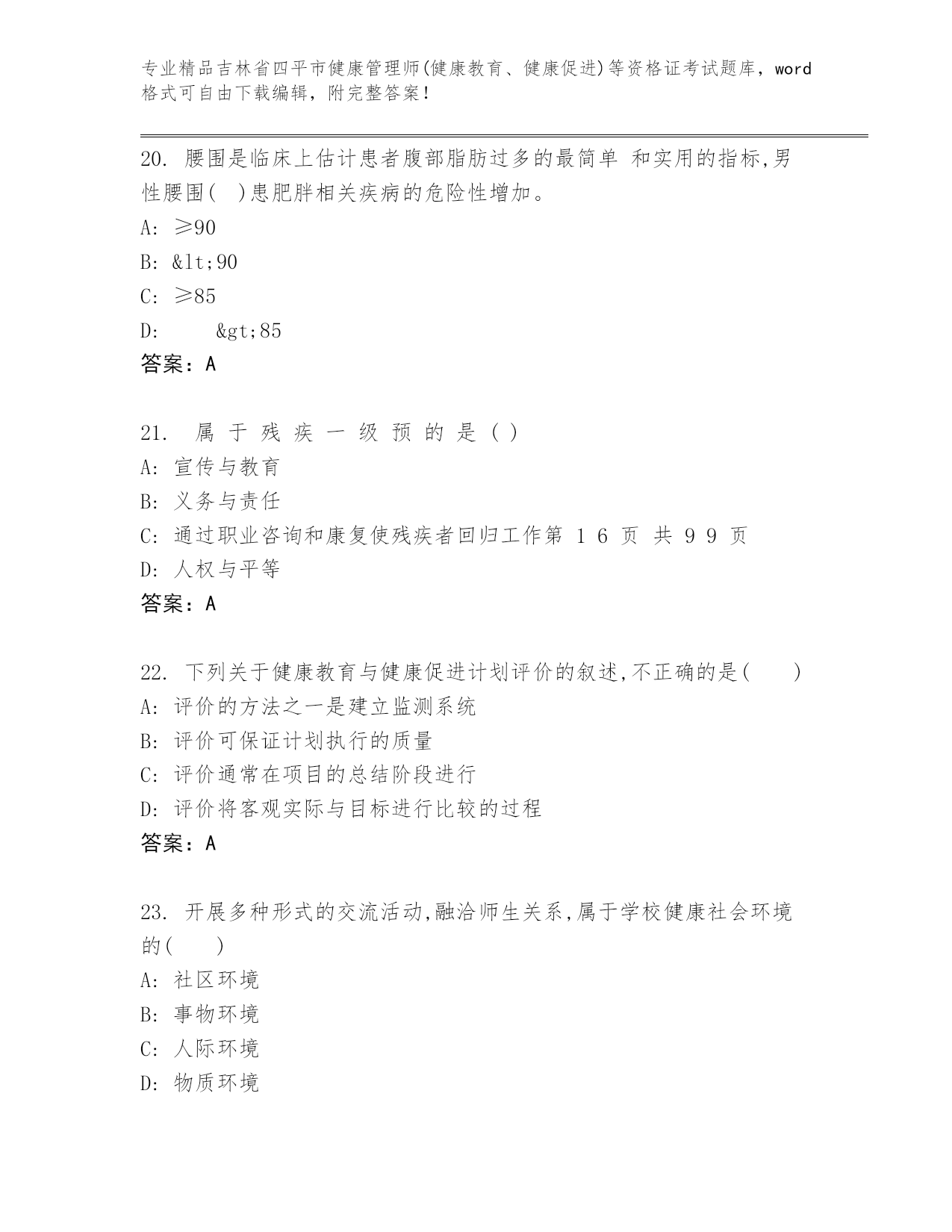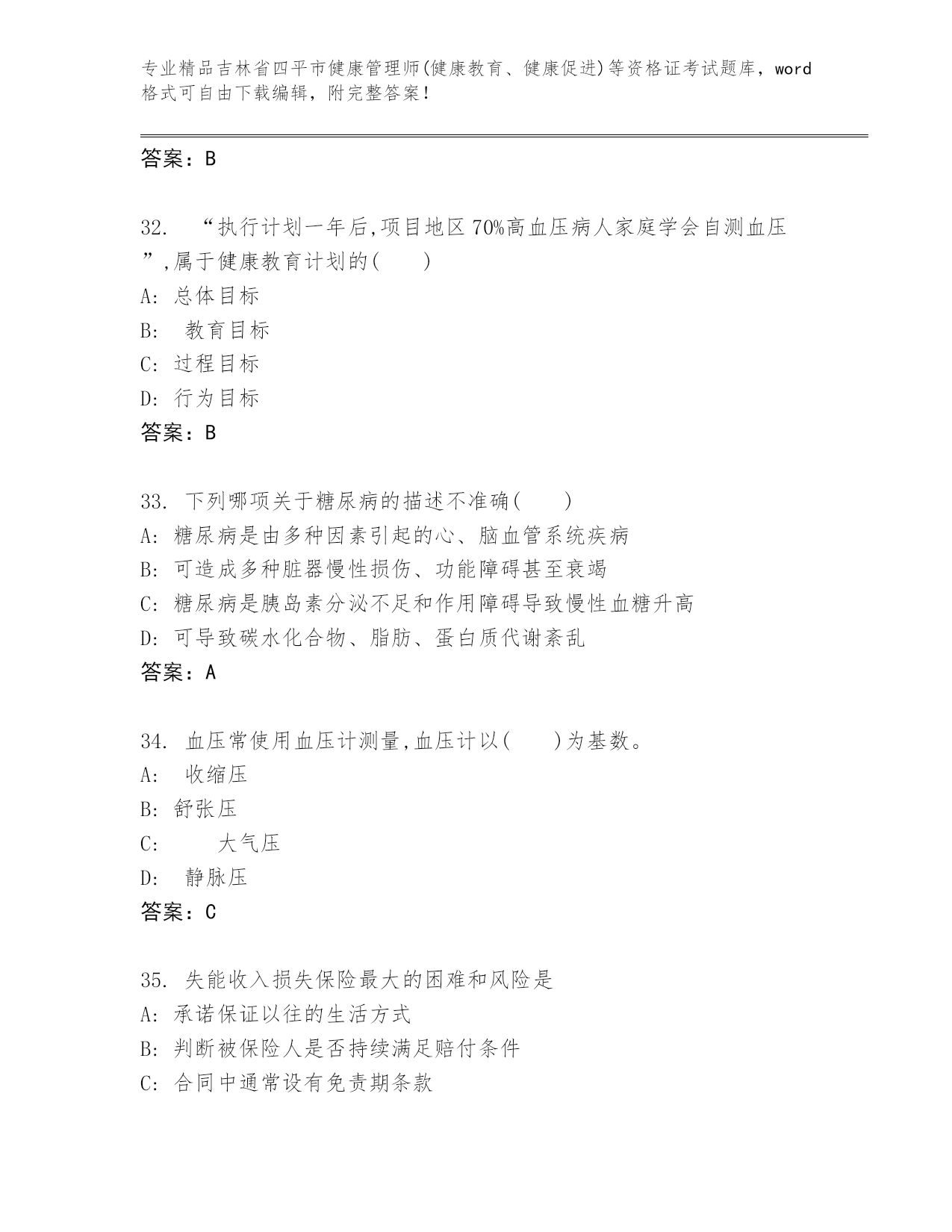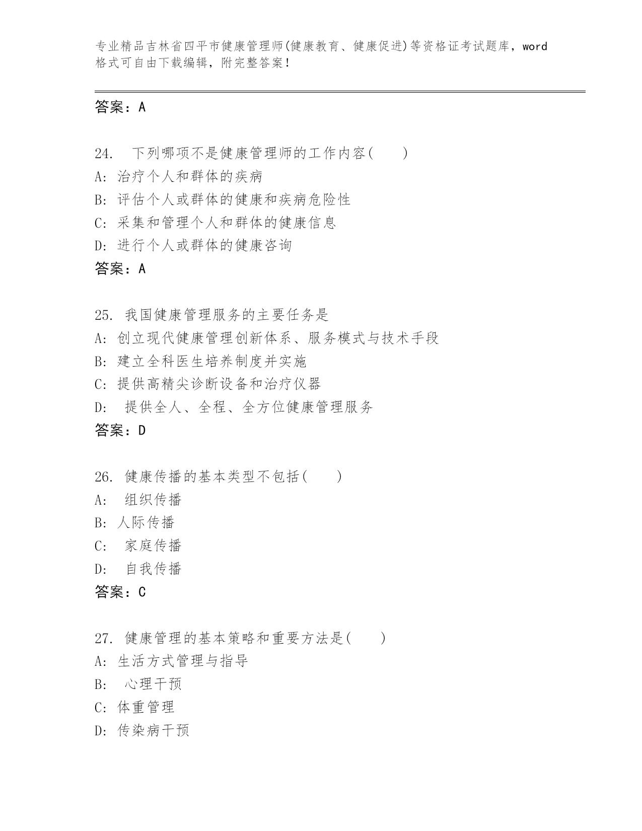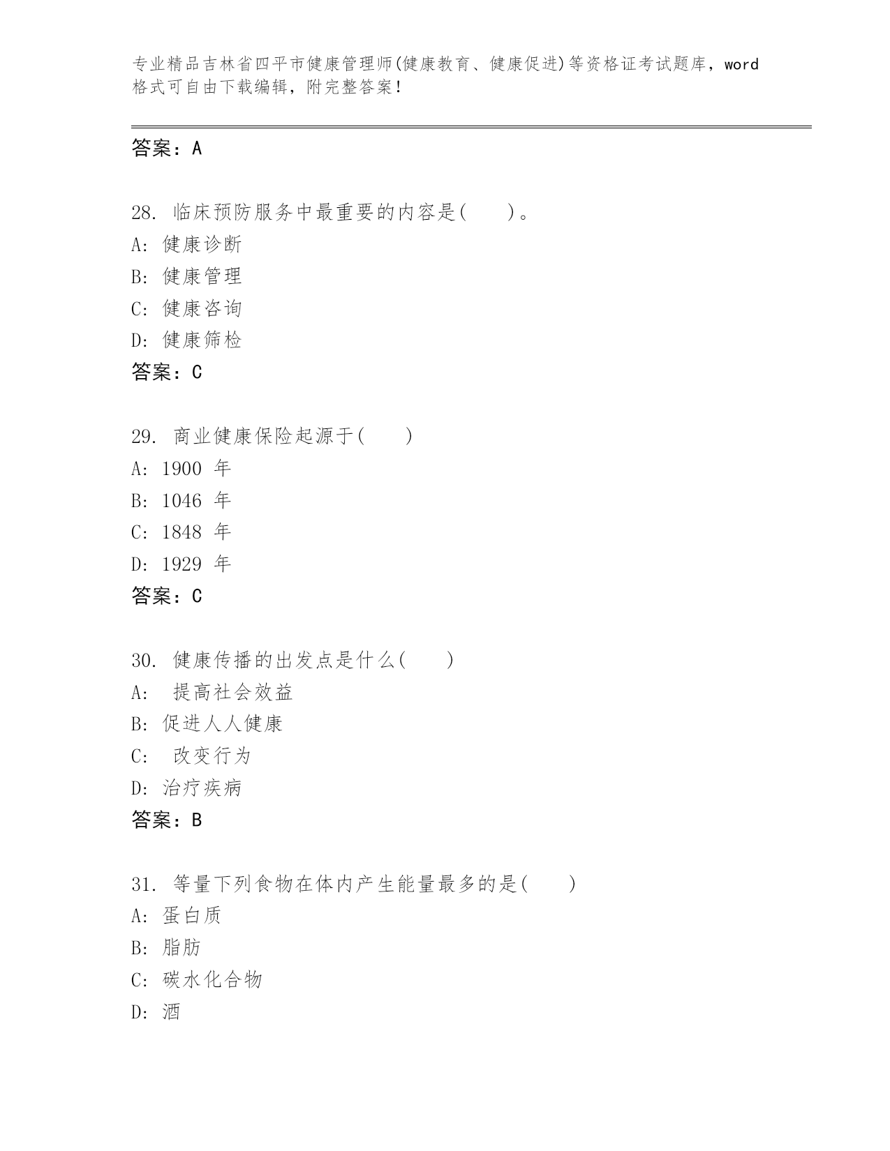 吉林省四平市健康管理师(健康教育、健康促进)等资格证考试及免费下载答案